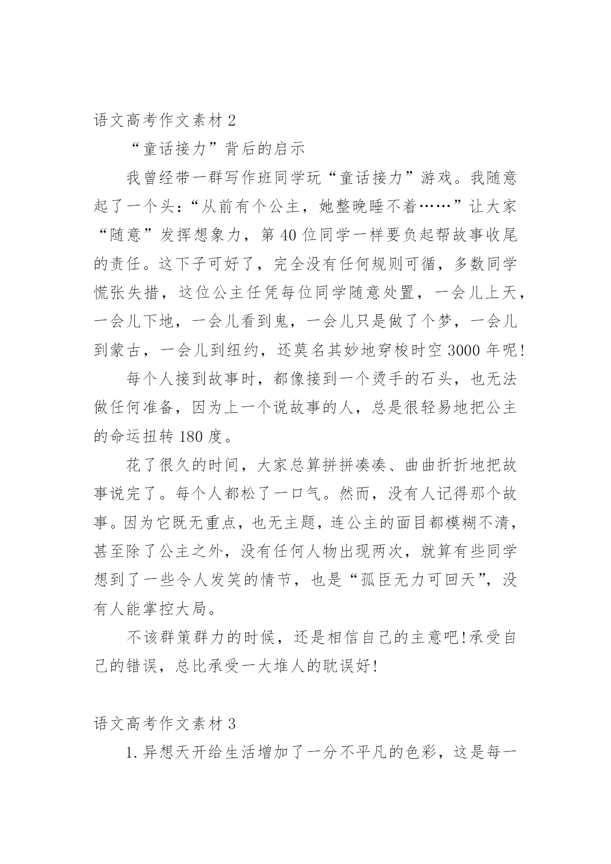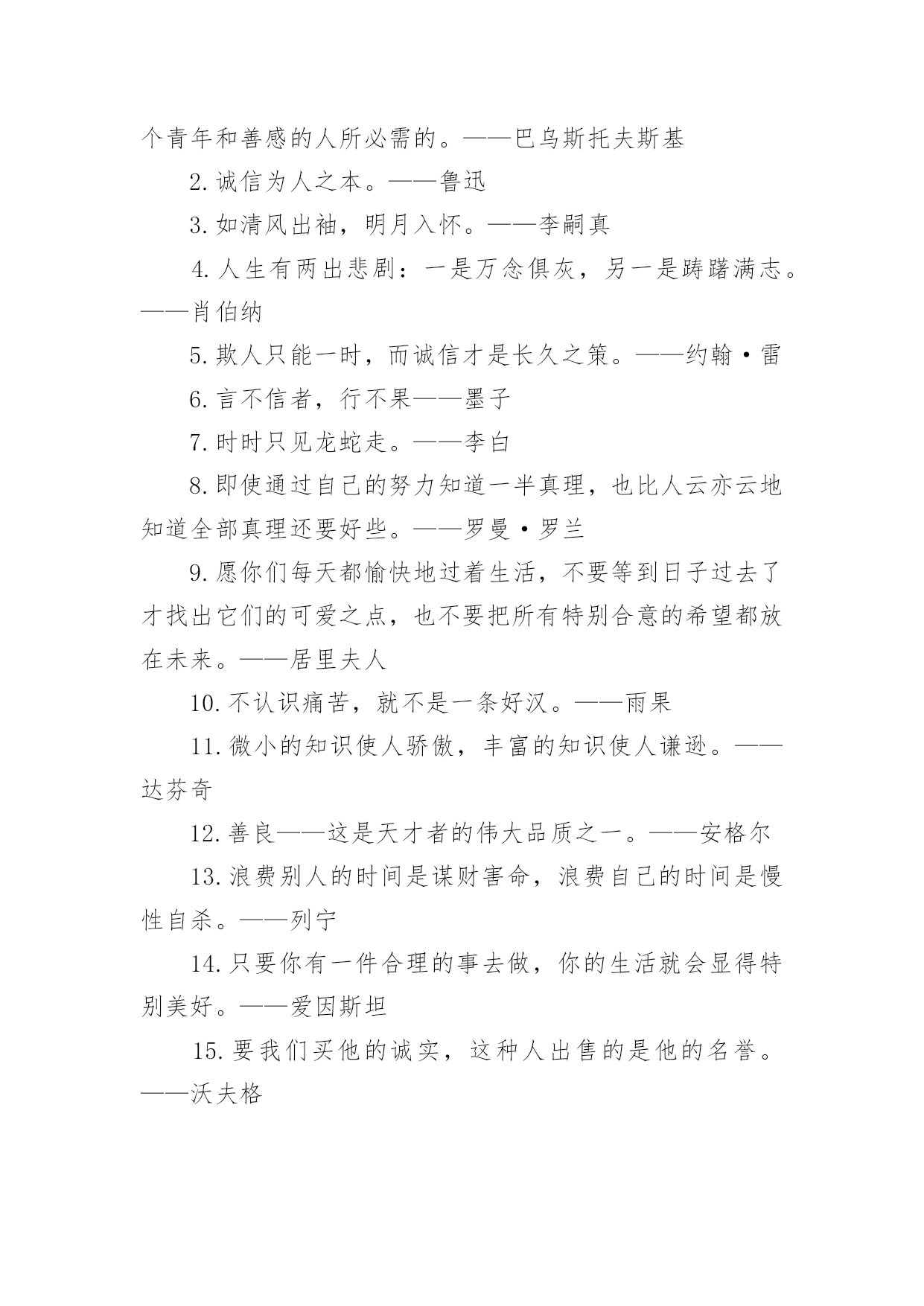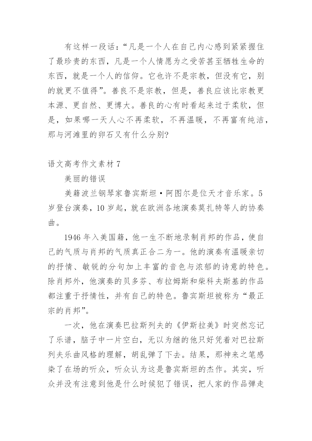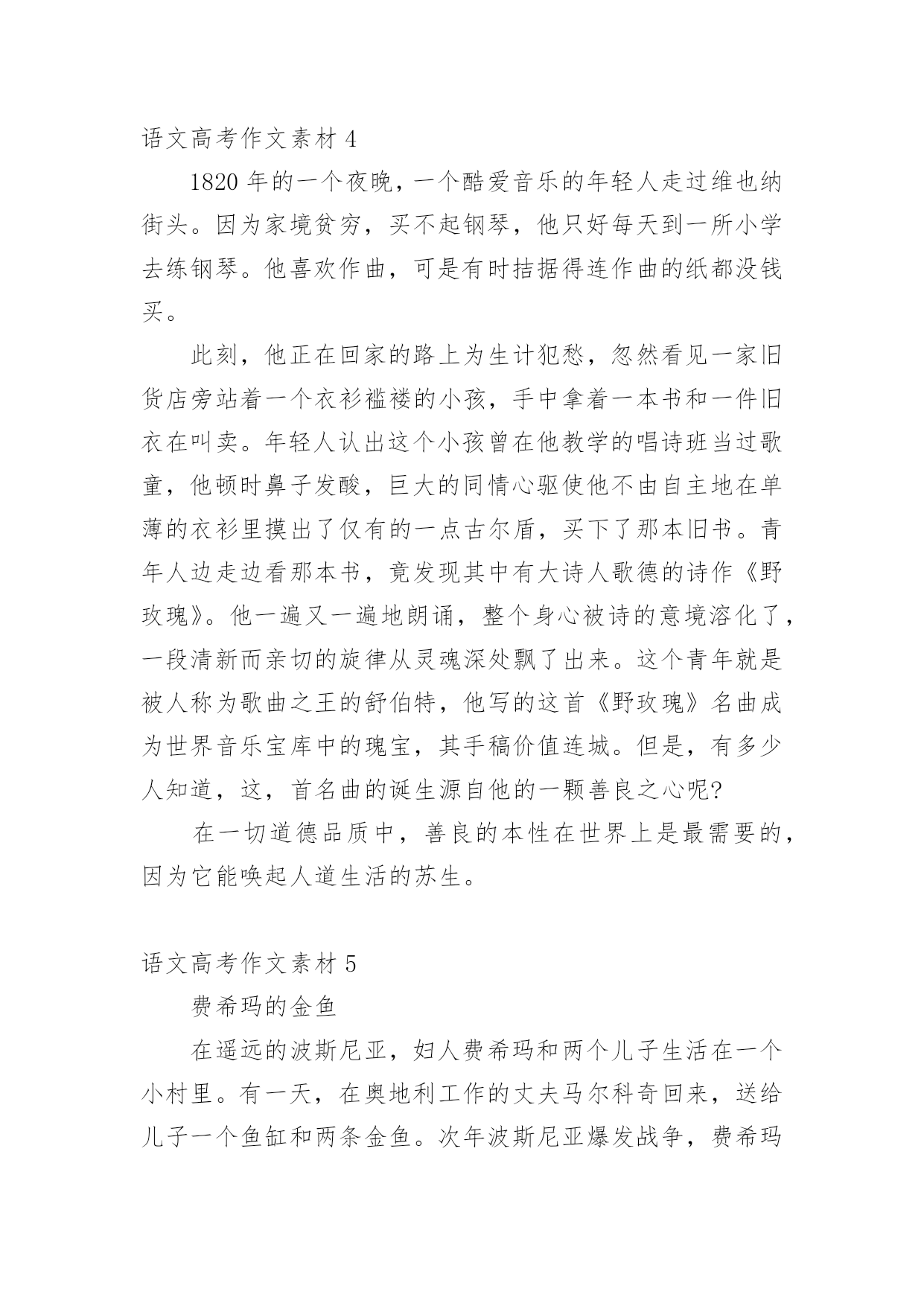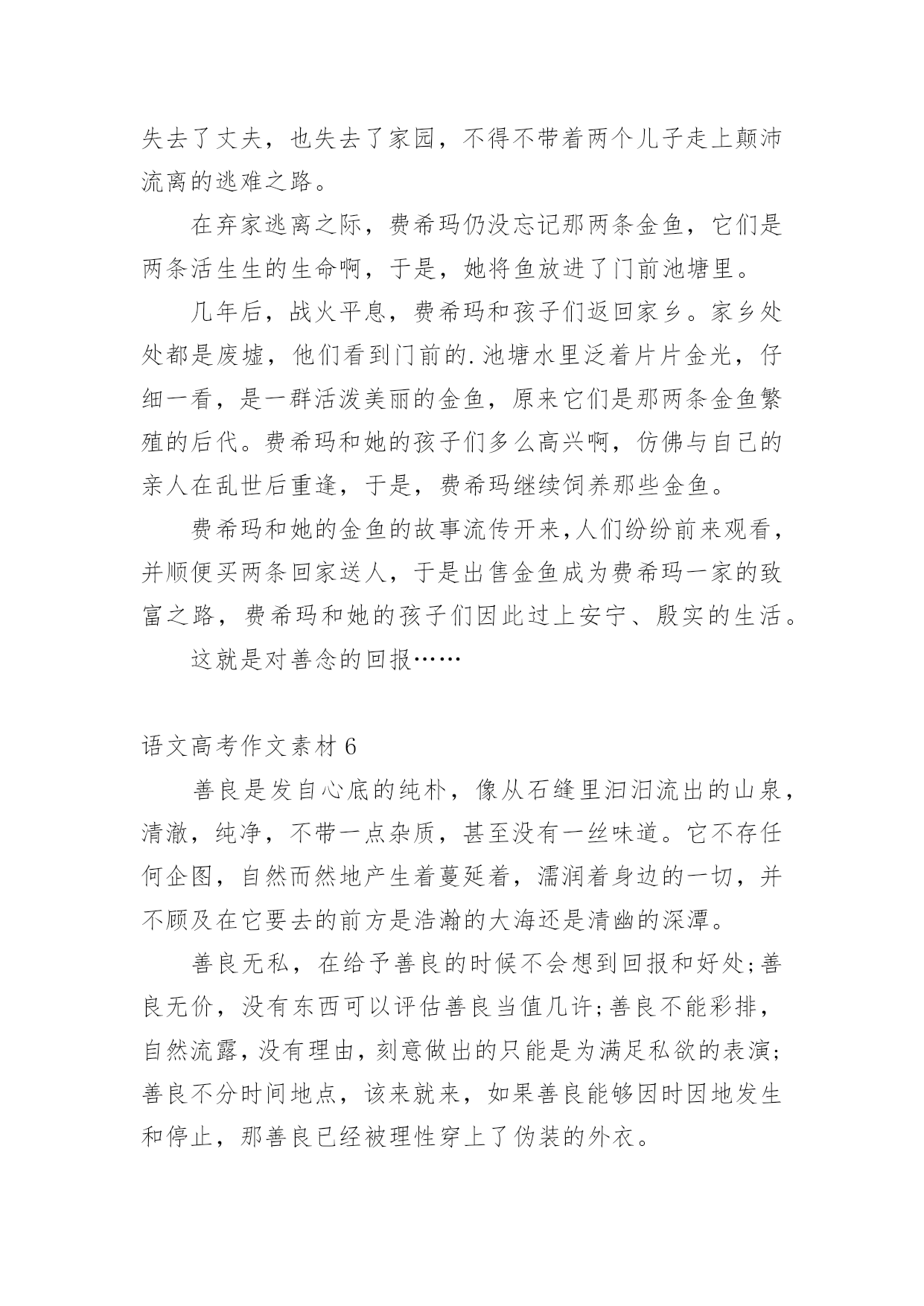 语文高考作文素材在学习、工作乃至生活中,许多人都有过写作文的经历,对作文都不陌生吧,作文是由文字组成,经过人的思想考虑,通过语言组织来表达一个主题意义的文体。那么你知道一篇好的作文该怎么写吗?以下是小编为大家收集的语文高考作文素材,希望能够帮助到大家。语文高考作文素材1金钱价值在于使用方法汽车大王福特不是一个吝啬的人,但他却很少捐款。他顽固地认为,金钱的价值并不在于多寡,而在于使用方法。他最担心的就是捐款经常会落到不善于运用它们的人手里。有一次,乔治亚州的马沙?贝蒂校长为了扩建学校来请求福特捐款,福特拒绝了她。她就说:那么就请捐给我一袋花生种子吧。于是福特买了一袋花生种子送给了她。福特后来就忘了这件事情。没想到一年以后,贝蒂女士又上门了,交给了他600美元。原来学生们播种了当初的那一袋子花生种子,这就是一年的收获。福特什么都没说,立即拿出了600万美元交给了贝蒂。福特的担心绝不是多余的,太轻易得来的金钱往往很难让受施者感受到金钱后面潜隐着的苦与智;我更赞赏贝蒂对点滴施与的至高的尊重,她带领孩子们撒播下的其实是足以证明他们有能力领受他人恩惠的资格。语文高考作文素材2“童话接力”背后的启示我曾经带一群写作班同学玩“童话接力”游戏。我随意起了一个头:“从前有个公主,她整晚睡不着……”让大家“随意”发挥想象力,第40位同学一样要负起帮故事收尾的责任。这下子可好了,完全没有任何规则可循,多数同学慌张失措,这位公主任凭每位同学随意处置,一会儿上天,一会儿下地,一会儿看到鬼,一会儿只是做了个梦,一会儿到蒙古,一会儿到纽约,还莫名其妙地穿梭时空3000年呢!每个人接到故事时,都像接到一个烫手的石头,也无法做任何准备,因为上一个说故事的人,总是很轻易地把公主的命运扭转180度。花了很久的时间,大家总算拼拼凑凑、曲曲折折地把故事说完了。每个人都松了一口气。然而,没有人记得那个故事。因为它既无重点,也无主题,连公主的面目都模糊不清,甚至除了公主之外,没有任何人物出现两次,就算有些同学想到了一些令人发笑的情节,也是“孤臣无力可回天”,没有人能掌控大局。不该群策群力的时候,还是相信自己的主意吧!承受自己的错误,总比承受一大堆人的耽误好!语文高考作文素材31.异想天开给生活增加了一分不平凡的色彩,这是每一个青年和善感的人所必需的。——巴乌斯托夫斯基2.诚信为人之本。——鲁迅3.如清风出袖,明月入怀。——李嗣真4.人生有两出悲剧:一是万念俱灰,另一是踌躇满志。——肖伯纳5.欺人只能一时,而诚信才是长久之策。——约翰·雷6.言不信者,行不果——墨子7.时时只见龙蛇走。——李白8.即使通过自己的努力知道一半真理,也比人云亦云地知道全部真理还要好些。——罗曼·罗兰9.愿你们每天都愉快地过着生活,不要等到日子过去了才找出它们的可爱之点,也不要把所有特别合意的希望都放在未来。——居里夫人10.不认识痛苦,就不是一条好汉。——雨果11.微小的知识使人骄傲,丰富的知识使人谦逊。——达芬奇12.善良——这是天才者的伟大品质之一。——安格尔13.浪费别人的时间是谋财害命,浪费自己的时间是慢性自杀。——列宁14.只要你有一件合理的事去做,你的生活就会显得特别美好。——爱因斯坦15.要我们买他的诚实,这种人出售的是他的名誉。——沃夫格语文高考作文素材41820年的一个夜晚,一个酷爱音乐的年轻人走过维也纳街头。因为家境贫穷,买不起钢琴,他只好每天到一所小学去练钢琴。他喜欢作曲,可是有时拮据得连作曲的纸都没钱买。此刻,他正在回家的路上为生计犯愁,忽然看见一家旧货店旁站着一个衣衫褴褛的小孩,手中拿着一本书和一件旧衣在叫卖。年轻人认出这个小孩曾在他教学的唱诗班当过歌童,他顿时鼻子发酸,巨大的同情心驱使他不由自主地在单薄的衣衫里摸出了仅有的一点古尔盾,买下了那本旧书。青年人边走边看那本书,竟发现其中有大诗人歌德的诗作《野玫瑰》。他一遍又一遍地朗诵,整个身心被诗的意境溶化了,一段清新而亲切的旋律从灵魂深处飘了出来。这个青年就是被人称为歌曲之王的舒伯特,他写的这首《野玫瑰》名曲成为世界音乐宝库中的瑰宝,其手稿价值连城。但是,有多少人知道,这,首名曲的诞生源自他的一颗善良之心呢?在一切道德品质中,善良的本性在世界上是最需要的,因为它能唤起人道生活的苏生。语文高考作文素材5费希玛的金鱼在遥远的波斯尼亚,妇人费希玛和两个儿子生活在一个小村里。有一天,在奥地利工作的丈夫马尔科奇回来,送给儿子一个鱼缸和两条金鱼。次年波斯尼亚爆发战争,费希玛失去了丈夫,也失去了家园,不得不带着两个儿子走上颠沛流离的逃难之路。在弃家逃离之际,费希玛仍没忘记那两条金鱼,它们是两条活生生的生命啊,于是,她将鱼放进了门前池塘里。几年后,战火平息,费希玛和孩子们返回家乡。家乡处处都是废墟,他们看到门前的.池塘水里泛着片片金光