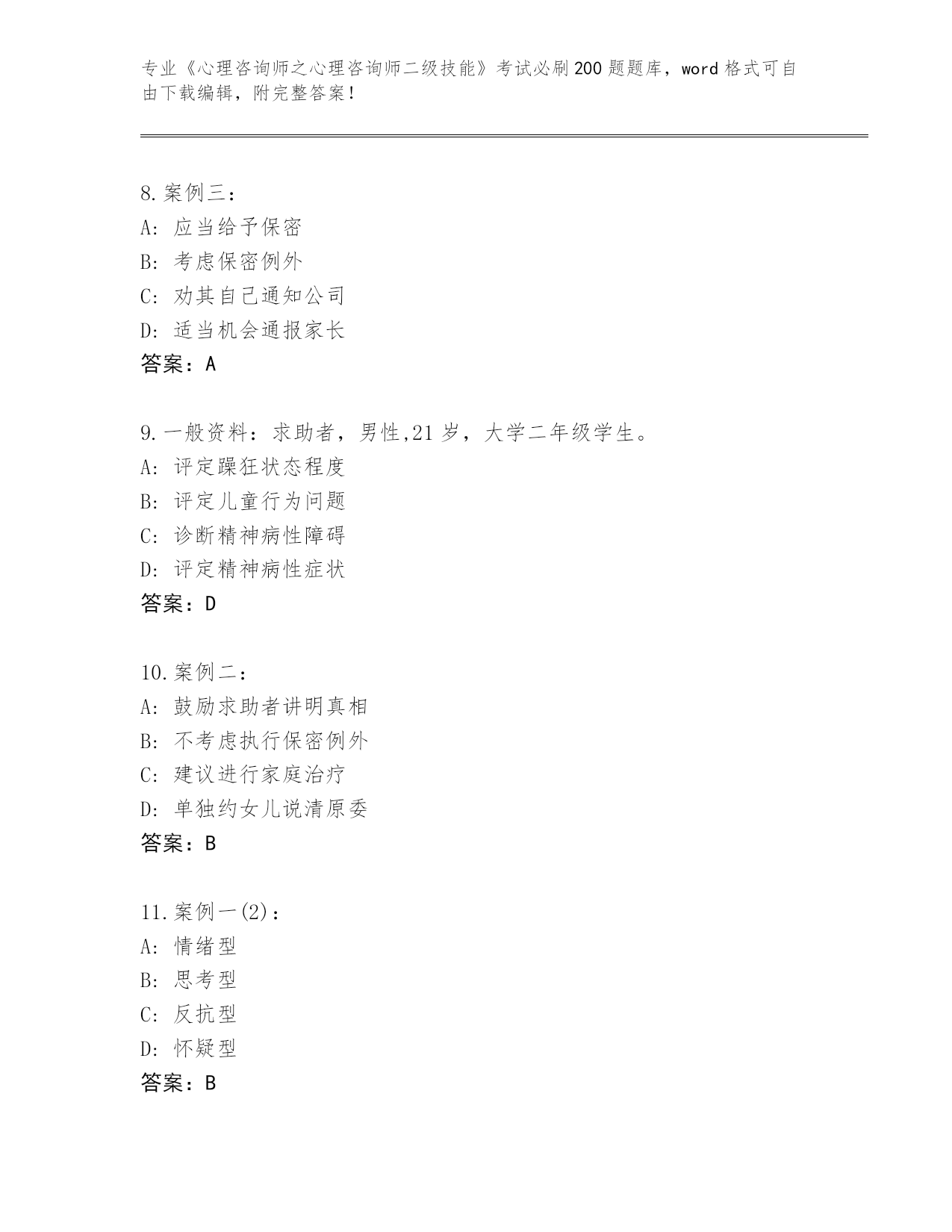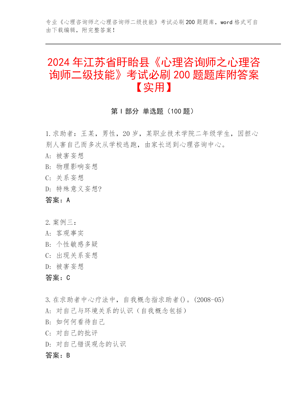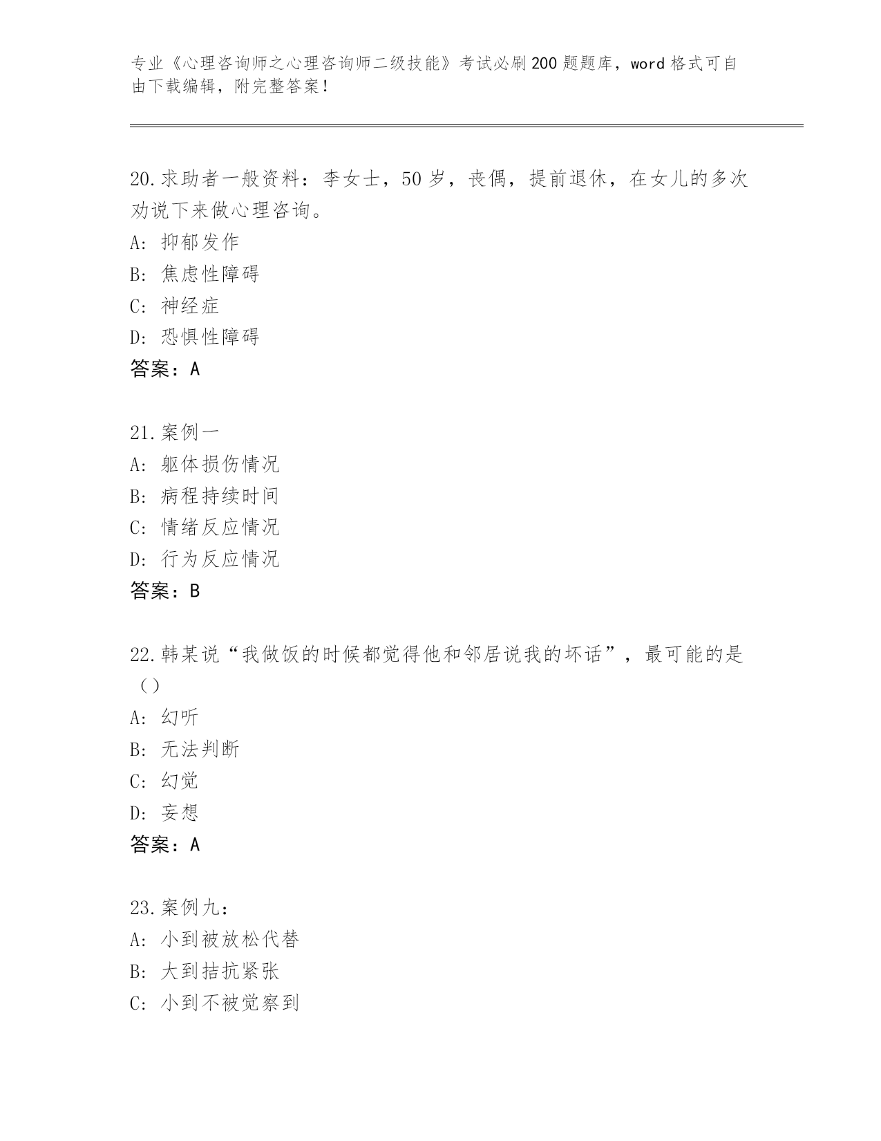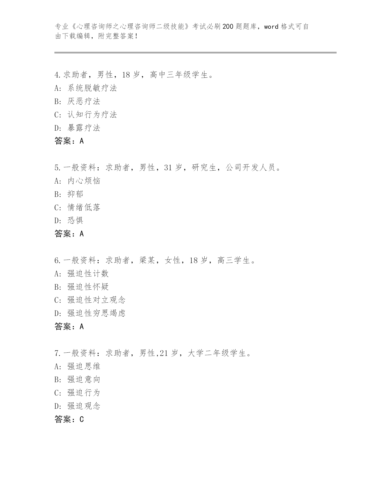江苏省盱眙县内部使用《心理咨询师之心理咨询师二级技能》资格考试必刷200题题库及答案下载