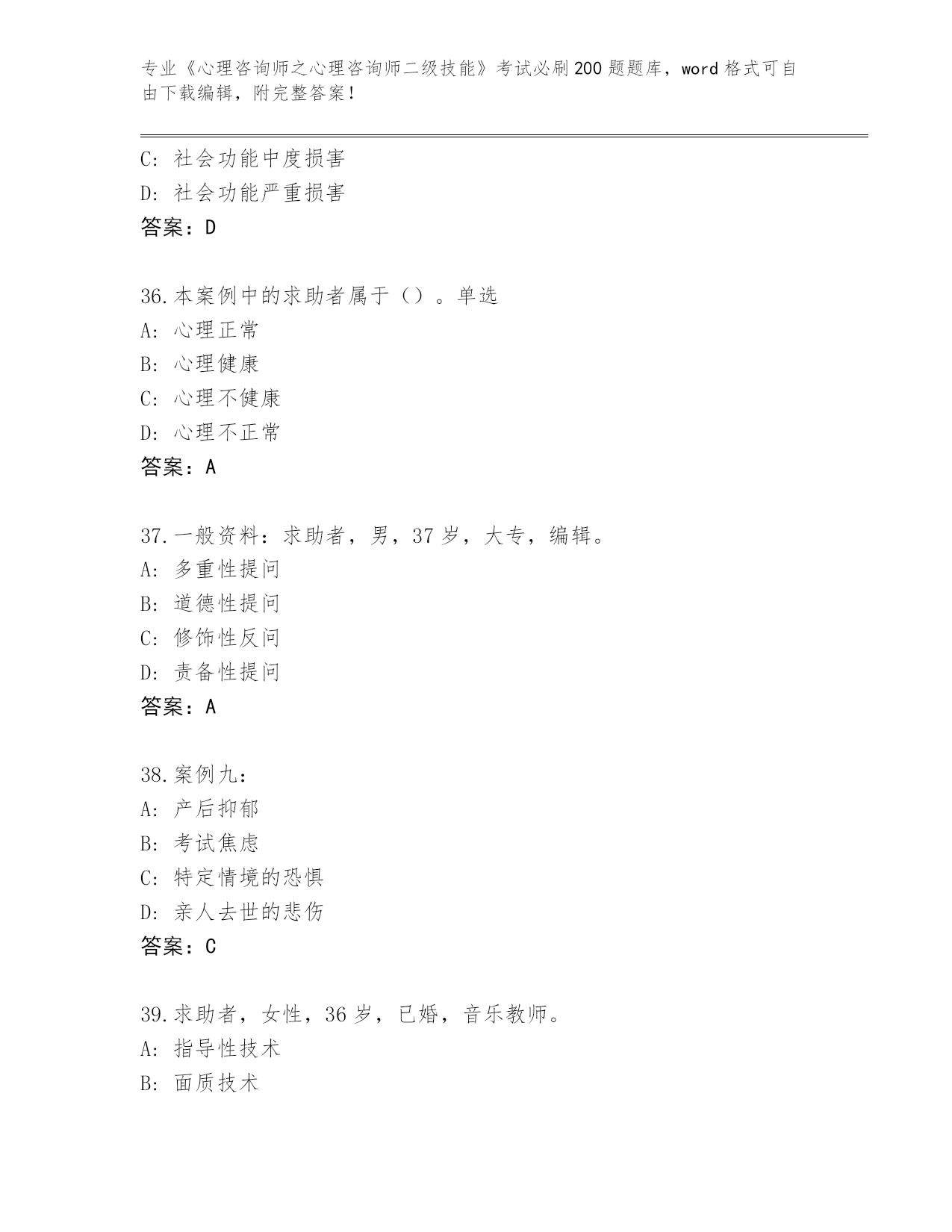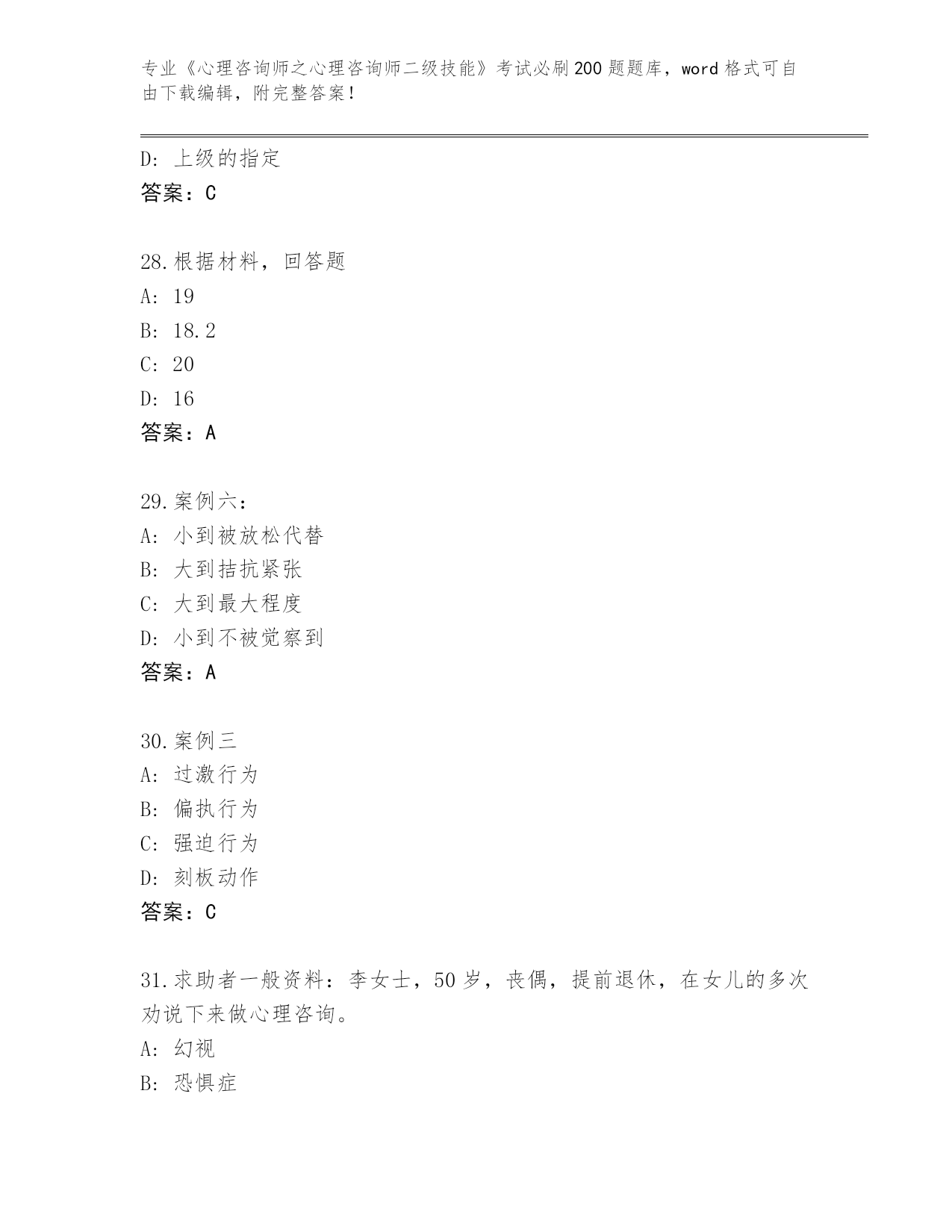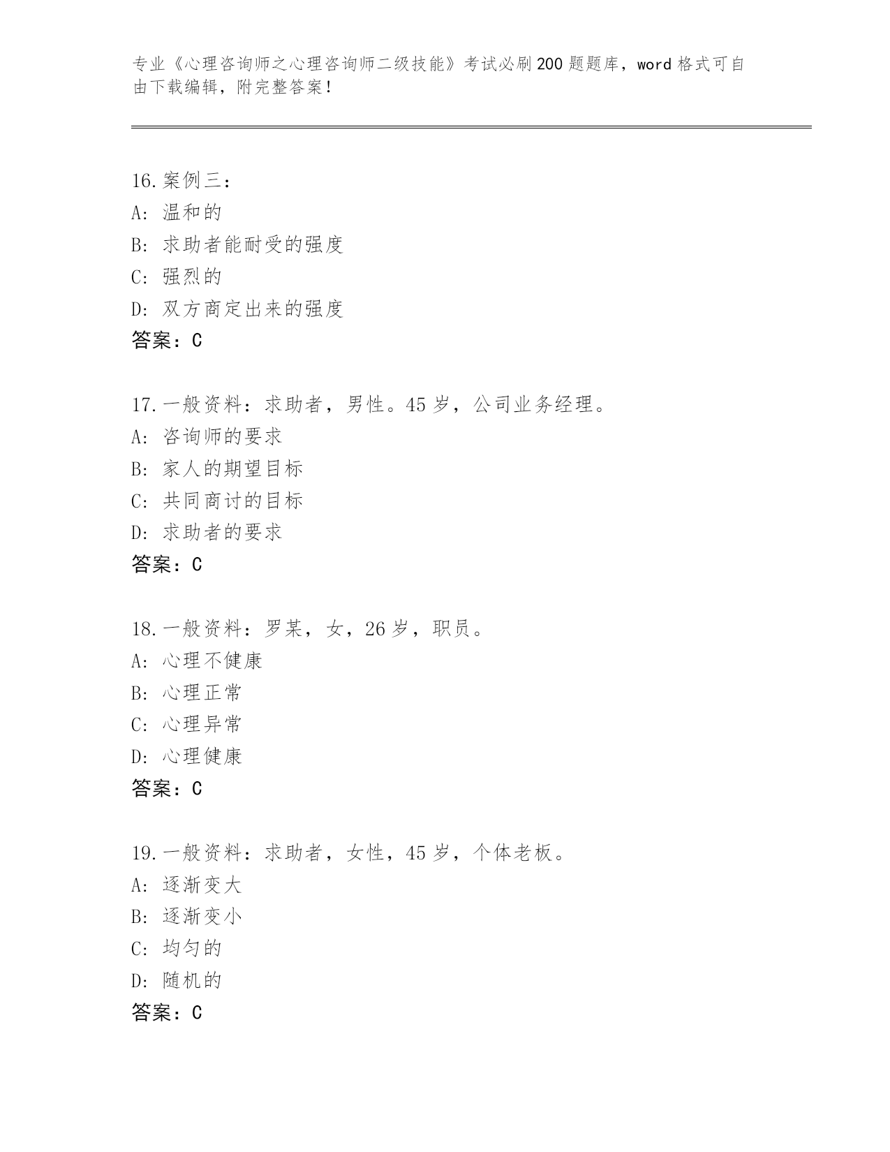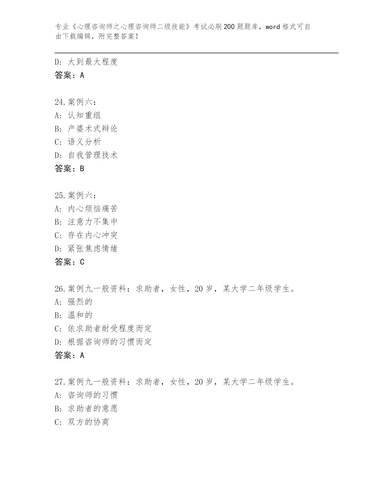 江苏省盱眙县内部使用《心理咨询师之心理咨询师二级技能》资格考试必刷200题题库及答案下载