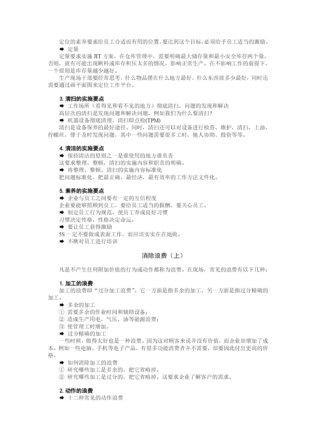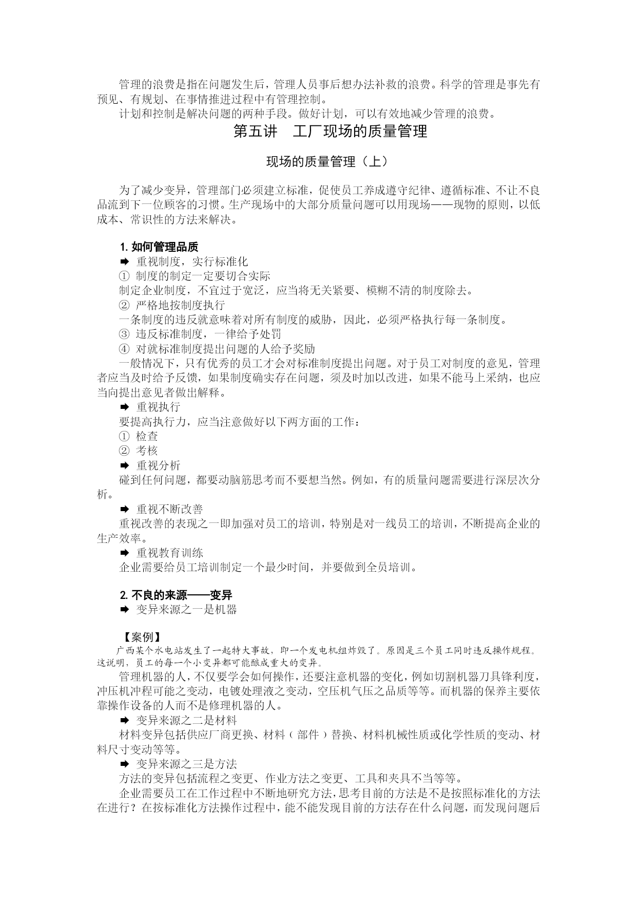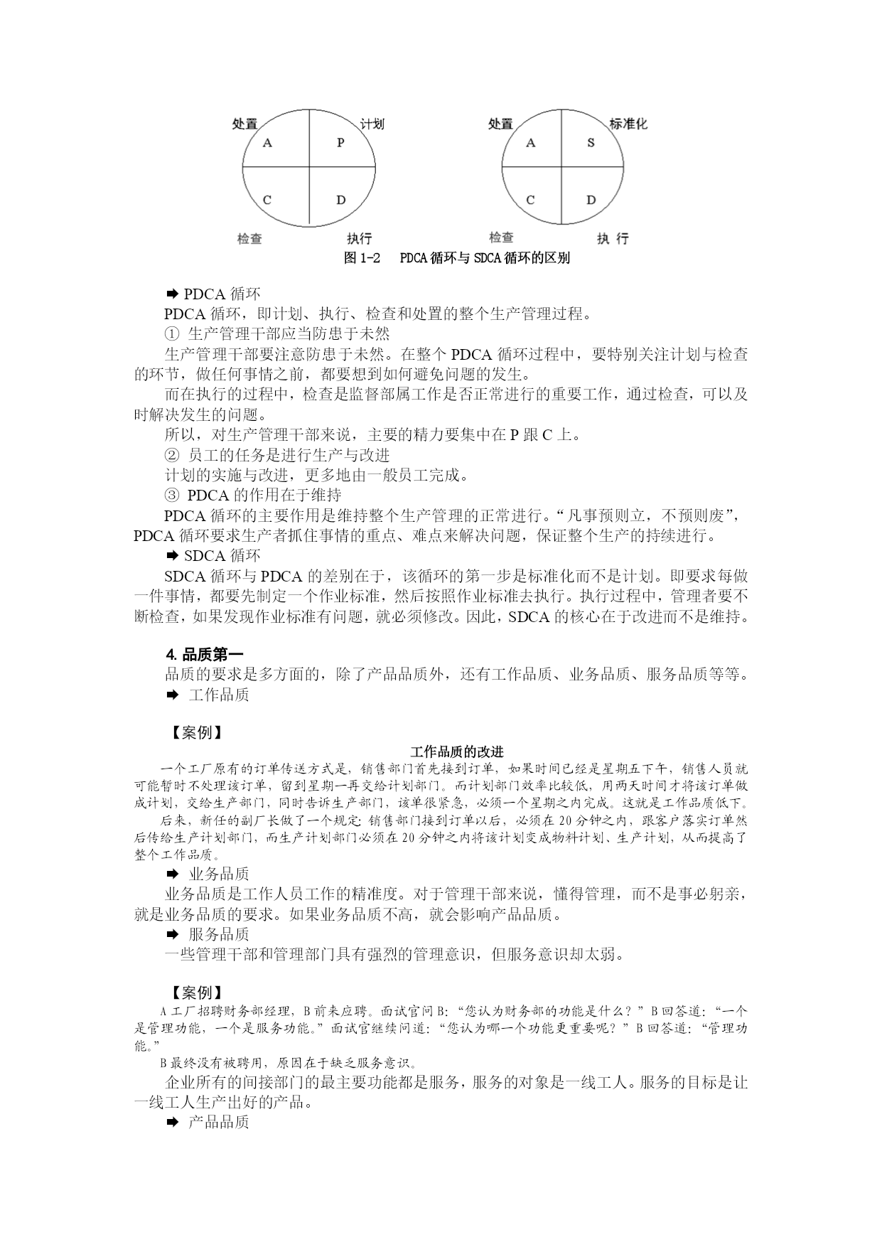 第一讲工厂成本管控之改善观念对于生产型企业来说,做工厂就是做成本。因为企业的技术、设备都可以被他人模仿,所以,生产竞争的关键就是成本的竞争。相同的生产技术、相同的设备、相同的产品,谁的成本低,谁就能够生存。降低工厂成本的方式有很多。本课程主要是从生产一线的管理角度来探究如何通过现场管理来降低生产成本。降低生产成本的途径除了精简人员、压低原材料的价格外,更有效的是改进方法。工厂中主要的改善观念改善是由持续不断的努力所产生的诸多小步伐改进逐次累积而成的。1.改善与管理图1-1工厂各级人员参与改善与管理示意图【图解】根据上图可以发现,从作业人员到高层管理者,每个人都有自己的责任。其工作可分为维持性工作、改善性工作和创新性工作三种。维持性工作是静态的,改善性工作是渐变的,而创新性工作往往是突变的。一般地说,基层人员更多地是从事维持工作,同时承担一部分改善和创新的工作。而层级越高的管理者承担的变化性的工作越多。【自检1-1】如何理解越是高层管理者,越需要思考创新的工作?____________________________________________________________________________________________________________________________________HYPERLINK"http://www.cneln.net/kcjy/F22/html/ckda1-1.htm"见参考答案1-1参考答案1-1HYPERLINK"http://www.cneln.net/kcjy/F22/html/0101_.htm"\l"a"返回低层人员的工作往往是一些静态性、维持性的,而层级越高,承担的变化性工作越多,需要脱离旧有模式进行决策的机会就越多,因此,层级越高的管理者越需要思考创新的工作。2.改善须注重过程一些管理者往往只注重工厂管理的结果而忽视过程。实际上,没有好的过程,就不可能有理想的结果。所以为了达到产量目标、品质目标、成本目标,必须注重管理过程,以过程为导向。3.PDCA/SDCA循环图1-2PDCA循环与SDCA循环的区别PDCA循环PDCA循环,即计划、执行、检查和处置的整个生产管理过程。①生产管理干部应当防患于未然生产管理干部要注意防患于未然。在整个PDCA循环过程中,要特别关注计划与检查的环节,做任何事情之前,都要想到如何避免问题的发生。而在执行的过程中,检查是监督部属工作是否正常进行的重要工作,通过检查,可以及时解决发生的问题。所以,对生产管理干部来说,主要的精力要集中在P跟C上。②员工的任务是进行生产与改进计划的实施与改进,更多地由一般员工完成。③PDCA的作用在于维持PDCA循环的主要作用是维持整个生产管理的正常进行。“凡事预则立,不预则废”,PDCA循环要求生产者抓住事情的重点、难点来解决问题,保证整个生产的持续进行。SDCA循环SDCA循环与PDCA的差别在于,该循环的第一步是标准化而不是计划。即要求每做一件事情,都要先制定一个作业标准,然后按照作业标准去执行。执行过程中,管理者要不断检查,如果发现作业标准有问题,就必须修改。因此,SDCA的核心在于改进而不是维持。4.品质第一品质的要求是多方面的,除了产品品质外,还有工作品质、业务品质、服务品质等等。工作品质【案例】工作品质的改进一个工厂原有的订单传送方式是,销售部门首先接到订单,如果时间已经是星期五下午,销售人员就可能暂时不处理该订单,留到星期一再交给计划部门。而计划部门效率比较低,用两天时间才将该订单做成计划,交给生产部门,同时告诉生产部门,该单很紧急,必须一个星期之内完成。这就是工作品质低下。后来,新任的副厂长做了一个规定:销售部门接到订单以后,必须在20分钟之内,跟客户落实订单然后传给生产计划部门,而生产计划部门必须在20分钟之内将该计划变成物料计划、生产计划,从而提高了整个工作品质。业务品质业务品质是工作人员工作的精准度。对于管理干部来说,懂得管理,而不是事必躬亲,就是业务品质的要求。如果业务品质不高,就会影响产品品质。服务品质一些管理干部和管理部门具有强烈的管理意识,但服务意识却太弱。【案例】A工厂招聘财务部经理,B前来应聘。面试官问B:“您认为财务部的功能是什么?”B回答道:“一个是管理功能,一个是服务功能。”面试官继续问道:“您认为哪一个功能更重要呢?”B回答道:“管理功能。”B最终没有被聘用,原因在于缺乏服务意识。企业所有的间接部门的最主要功能都是服务,服务的对象是一线工人。服务的目标是让一线工人生产出好的产品。产品品质相比较而言,