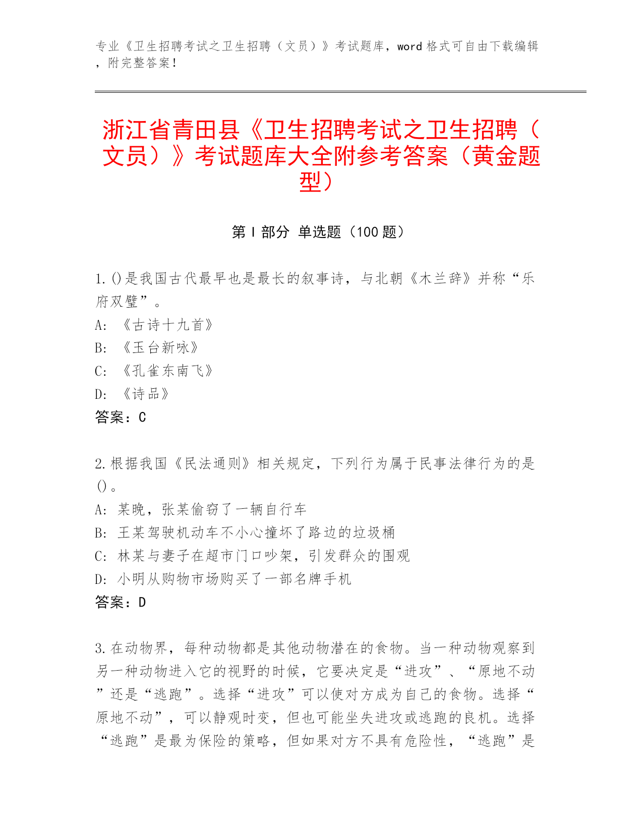 内部使用浙江省青田县《卫生招聘考试之卫生招聘(文员)》考试必考200题真题及参考答案(黄金题型)