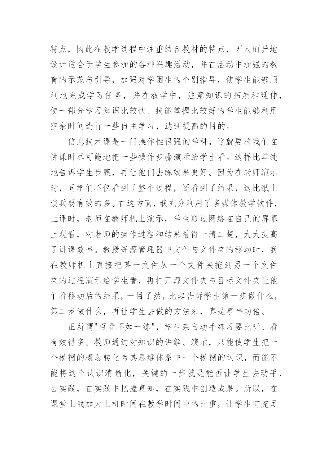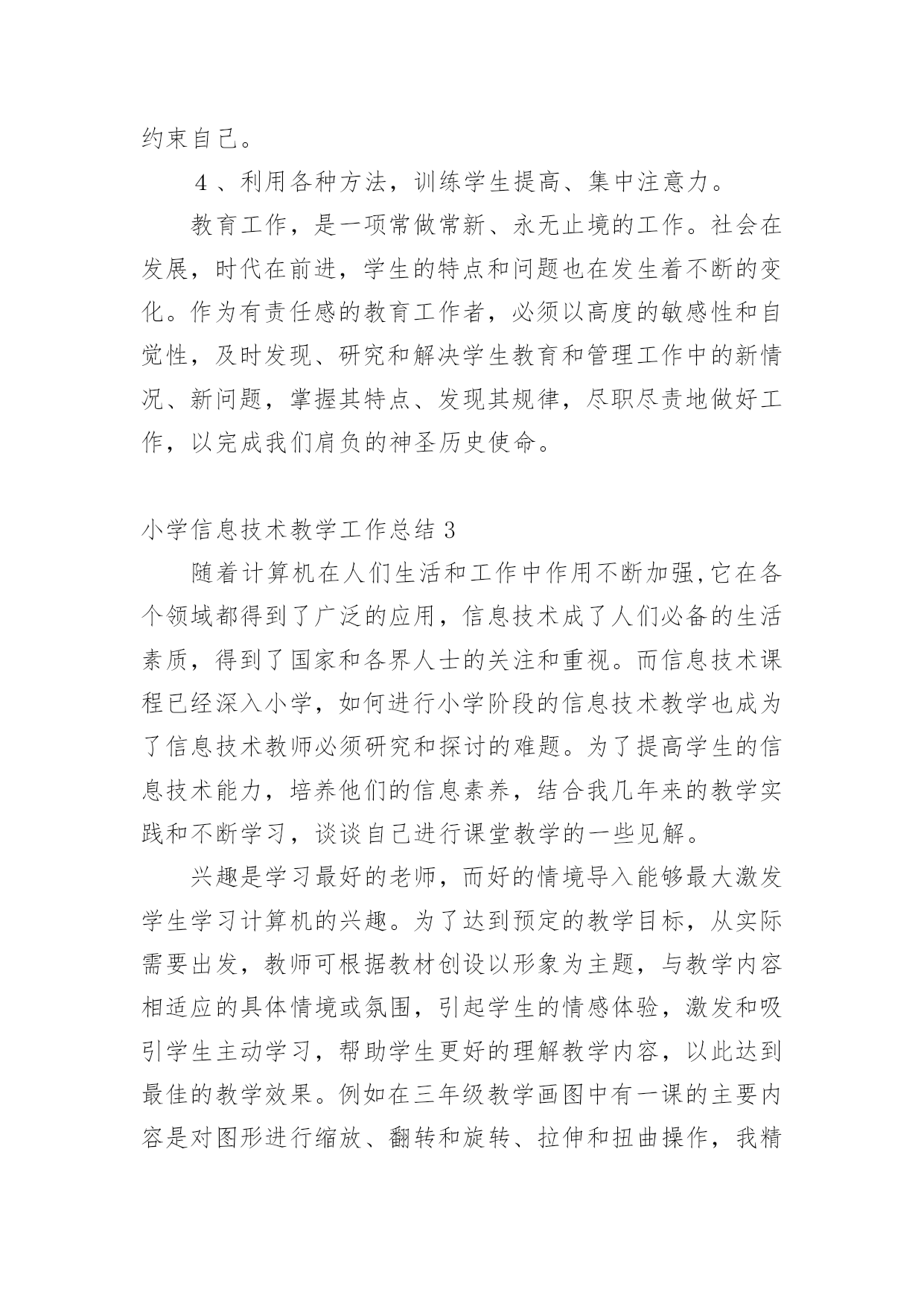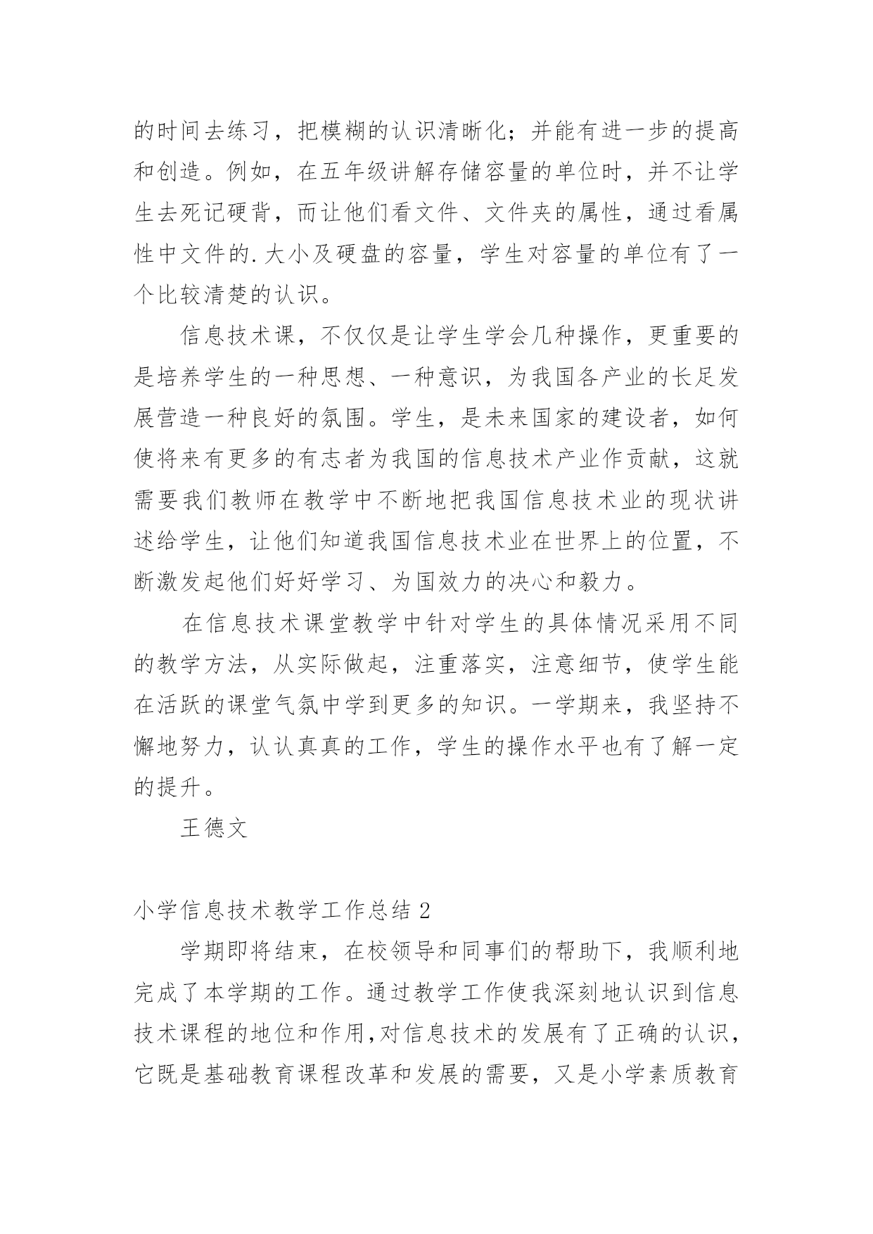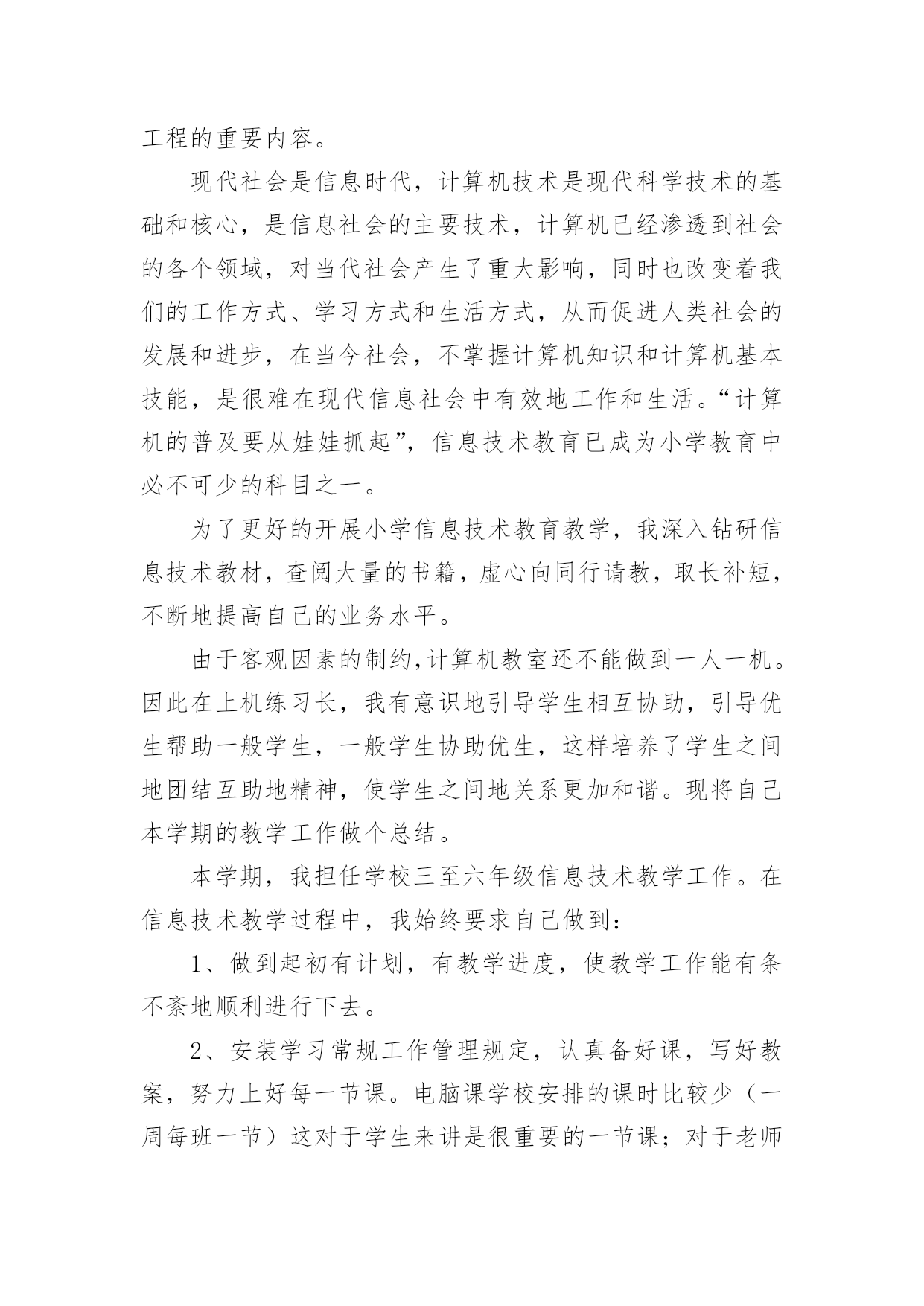 小学信息技术教学工作总结小学信息技术教学工作总结15篇总结是指对某一阶段的工作、学习或思想中的经验或情况加以总结和概括的书面材料,通过它可以正确认识以往学习和工作中的优缺点,因此十分有必须要写一份总结哦。你想知道总结怎么写吗?下面是小编为大家收集的小学信息技术教学工作总结,欢迎阅读与收藏。小学信息技术教学工作总结1信息技术在我校四到五年级实施教学的课程,每周每班一课时,是小学阶段的必修课程,该课程的开设对于学生信息素养的提升,对终身学习能力的培养具有非常重要的意义。现阶段信息技术课的教学目标是主要培养学生掌握计算机操作技能,着眼于使学生掌握信息科学、信息技术的基本知识,注重培养学生信息采集、加工、发布等信息处理的基本技能,促进和提高学生主动利用信息技术和信息资源解决实际问题的能力,并用于学习和生活,当然最重要的还在于高中的信息技术会考,完成相关的教学任务及教学要求。本学期教学内容包括信息技术基础知识、画图软件的操作、键盘输入等知识。一、不断学习提高个人素养积极参加学校组织的教学活动,提高自己的政治素质和理论素养,注重自己思想道德水平的提高。平时积极参加教研活动,在工作之余,学习网络管理和计算机维护的相关知识,努力提高个人的业务水平,为信息技术教学工作打下良好的基础。二、扎实细致地做好教学工作备课对于每门课程的教学而言,都是必不可少的环节,信息技术学科教学也不例外。在备课的过程中,我首先对所要教授的知识进行全面的研究、归纳、总结,并根据教授对象的不同特点找到教授的最佳方法与方式。在此基础上将所备内容在计算机上进行逐一推敲、验证、演练,以使一些空洞的知识具有可操作性;同时,还将每个知识点构造成一个操作性实例,通过对实例的演练让学生对知识点产生准确、完整的认识,由此得出相关的结论。从而做到对人、书、机三者进行有机结合的备课,本学期开始逐步完成电子教案。根据信息技术学科的基本特点,我在教学过程中当坚持以学生为主体,即在教师为主导、学生为主体的双主教学模式下进一步强调学生的主体地位。因为计算机课程操作性强、更新速度快、创造性强的特点都要求我们必须强调学生在教学活动中的主体地位。学生只有通过自主地学习,才能在掌握基础知识的基础上,发现问题,解决问题,从而提高自己的操作水平,跟上知识的发展更新并进一步发挥自己的创造力。如果单纯地依靠老师的教授,他们所掌握的知识将总是有限的。在教学中,学生所使用的教材为电子工业出版社出版的教材,教材能够贴近实际,符合学生的认知规律和身心发展特点,因此在教学过程中注重结合教材的特点,因人而异地设计适合于学生参加的各种兴趣活动,并在活动中加强的教育的示范与引导,加强对学困生的个别指导,使学生能够顺利地完成学习任务,并在教学中,注意知识的拓展和延伸,使一部分学习知识比较快、技能掌握比较好的学生能够利用空余时间进行一些自主学习,达到提高的目的。信息技术课是一门操作性很强的学科,这就要求我们在讲课时尽可能地把一些操作步骤演示给学生看。这样比单纯地告诉学生步骤,再让他们去练效果更好。因为在老师演示时,同学们不仅看到了整个过程,还看到了结果,这比纸上谈兵要有效的多。在这方面,我充分利用了多媒体教学软件,上课时,老师在教师机上演示,学生通过网络在自己的屏幕上观看,对老师的操作过程和结果看得一清二楚,大大提高了讲课效率。教授资源管理器中文件与文件夹的移动时,我在教师机上直接把某一文件从一个文件夹拖到另一个文件夹的过程演示给学生看,再打开源文件夹与目标文件夹让他们看移动后的结果,一目了然,比起告诉学生第一步做什么,第二步做什么,再让学生去做的方法来,真是事半功倍。正所谓"百看不如一练",学生亲自动手练习要比听、看有效得多。教师通过对知识的讲解、演示,只能使学生把一个模糊的概念转化为其思维体系中一个模糊的认识,而能不能将这个认识清晰化,关键的一步就是能否让学生去动手、去实践,在实践中把握真知,在实践中创造成果。所以,在课堂上我加大上机时间在教学时间中的比重,让学生有充足的时间去练习,把模糊的认识清晰化;并能有进一步的提高和创造。例如,在五年级讲解存储容量的单位时,并不让学生去死记硬背,而让他们看文件、文件夹的属性,通过看属性中文件的.大小及硬盘的容量,学生对容量的单位有了一个比较清楚的认识。信息技术课,不仅仅是让学生学会几种操作,更重要的是培养学生的一种思想、一种意识,为我国各产业的长足发展营造一种良好的氛围。学生,是未来国家的建设者,如何使将来有更多的有志者为我国的信息技术产业作贡献,这就需要我们教师在教学中不断地把我国信息技术业的现状讲述给学生,让他们知道我国信息技术业在世界上的位置,不断激发起他们好好学习、为国效力的决心和毅力。在信息技术课堂教学中针对学生的具体情况采用不同的教学方法,从实际做起,注重落实,注意细节,使学