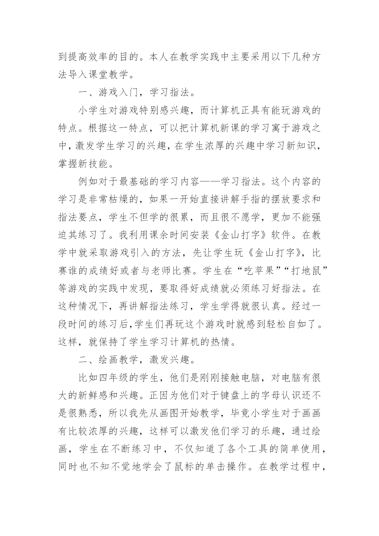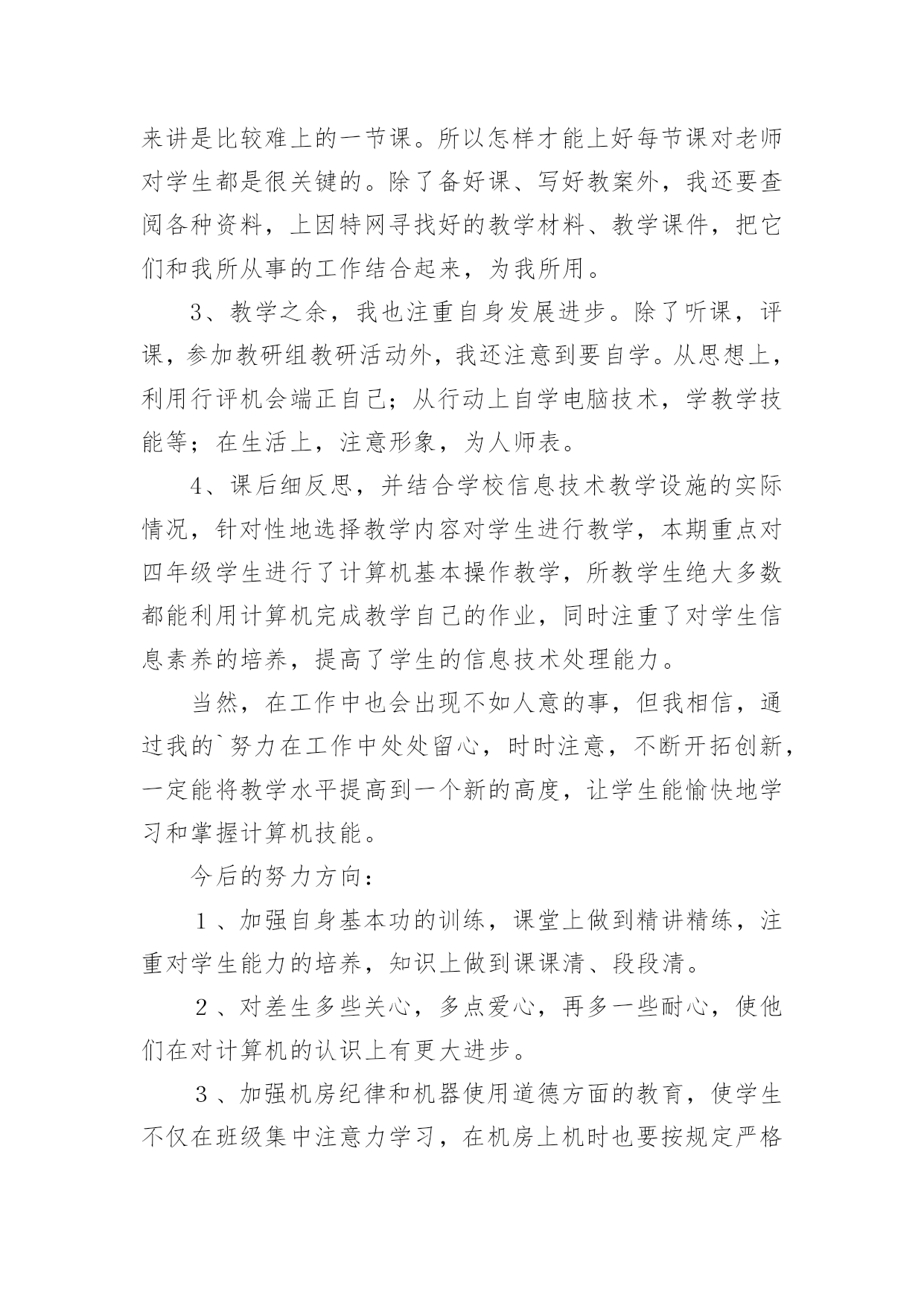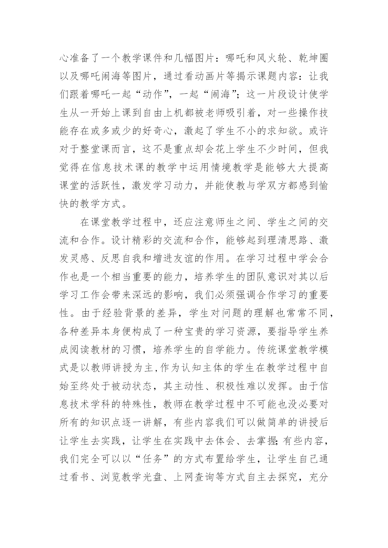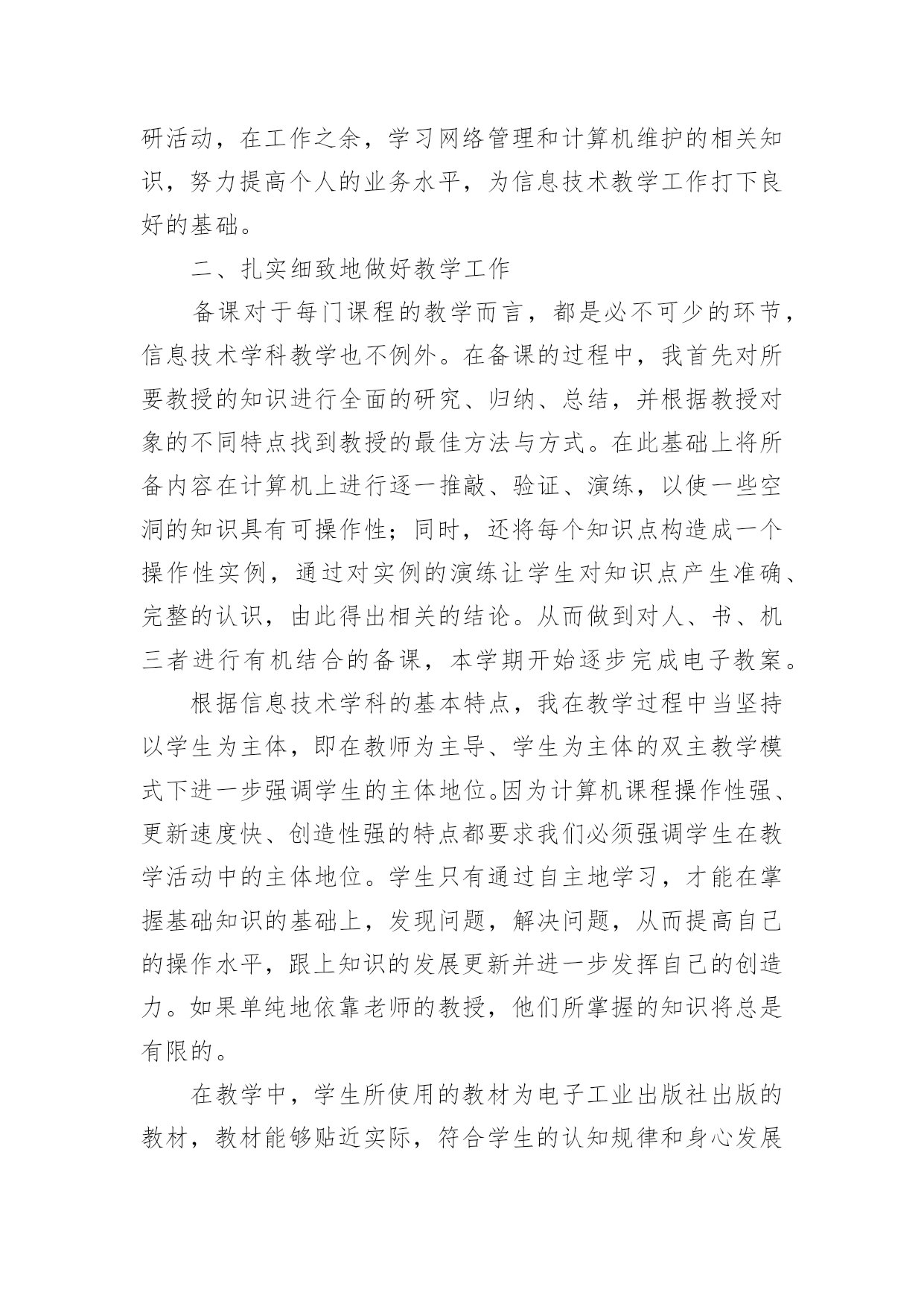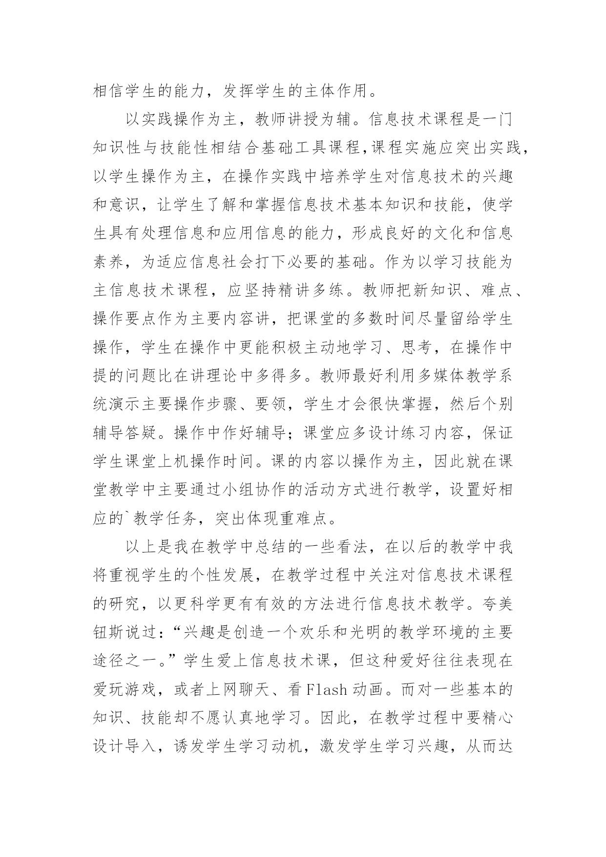 小学信息技术教学工作总结小学信息技术教学工作总结15篇总结是指对某一阶段的工作、学习或思想中的经验或情况加以总结和概括的书面材料,通过它可以正确认识以往学习和工作中的优缺点,因此十分有必须要写一份总结哦。你想知道总结怎么写吗?下面是小编为大家收集的小学信息技术教学工作总结,欢迎阅读与收藏。小学信息技术教学工作总结1信息技术在我校四到五年级实施教学的课程,每周每班一课时,是小学阶段的必修课程,该课程的开设对于学生信息素养的提升,对终身学习能力的培养具有非常重要的意义。现阶段信息技术课的教学目标是主要培养学生掌握计算机操作技能,着眼于使学生掌握信息科学、信息技术的基本知识,注重培养学生信息采集、加工、发布等信息处理的基本技能,促进和提高学生主动利用信息技术和信息资源解决实际问题的能力,并用于学习和生活,当然最重要的还在于高中的信息技术会考,完成相关的教学任务及教学要求。本学期教学内容包括信息技术基础知识、画图软件的操作、键盘输入等知识。一、不断学习提高个人素养积极参加学校组织的教学活动,提高自己的政治素质和理论素养,注重自己思想道德水平的提高。平时积极参加教研活动,在工作之余,学习网络管理和计算机维护的相关知识,努力提高个人的业务水平,为信息技术教学工作打下良好的基础。二、扎实细致地做好教学工作备课对于每门课程的教学而言,都是必不可少的环节,信息技术学科教学也不例外。在备课的过程中,我首先对所要教授的知识进行全面的研究、归纳、总结,并根据教授对象的不同特点找到教授的最佳方法与方式。在此基础上将所备内容在计算机上进行逐一推敲、验证、演练,以使一些空洞的知识具有可操作性;同时,还将每个知识点构造成一个操作性实例,通过对实例的演练让学生对知识点产生准确、完整的认识,由此得出相关的结论。从而做到对人、书、机三者进行有机结合的备课,本学期开始逐步完成电子教案。根据信息技术学科的基本特点,我在教学过程中当坚持以学生为主体,即在教师为主导、学生为主体的双主教学模式下进一步强调学生的主体地位。因为计算机课程操作性强、更新速度快、创造性强的特点都要求我们必须强调学生在教学活动中的主体地位。学生只有通过自主地学习,才能在掌握基础知识的基础上,发现问题,解决问题,从而提高自己的操作水平,跟上知识的发展更新并进一步发挥自己的创造力。如果单纯地依靠老师的教授,他们所掌握的知识将总是有限的。在教学中,学生所使用的教材为电子工业出版社出版的教材,教材能够贴近实际,符合学生的认知规律和身心发展特点,因此在教学过程中注重结合教材的特点,因人而异地设计适合于学生参加的各种兴趣活动,并在活动中加强的教育的示范与引导,加强对学困生的个别指导,使学生能够顺利地完成学习任务,并在教学中,注意知识的拓展和延伸,使一部分学习知识比较快、技能掌握比较好的学生能够利用空余时间进行一些自主学习,达到提高的目的。信息技术课是一门操作性很强的学科,这就要求我们在讲课时尽可能地把一些操作步骤演示给学生看。这样比单纯地告诉学生步骤,再让他们去练效果更好。因为在老师演示时,同学们不仅看到了整个过程,还看到了结果,这比纸上谈兵要有效的多。在这方面,我充分利用了多媒体教学软件,上课时,老师在教师机上演示,学生通过网络在自己的屏幕上观看,对老师的操作过程和结果看得一清二楚,大大提高了讲课效率。教授资源管理器中文件与文件夹的移动时,我在教师机上直接把某一文件从一个文件夹拖到另一个文件夹的过程演示给学生看,再打开源文件夹与目标文件夹让他们看移动后的结果,一目了然,比起告诉学生第一步做什么,第二步做什么,再让学生去做的方法来,真是事半功倍。正所谓"百看不如一练",学生亲自动手练习要比听、看有效得多。教师通过对知识的讲解、演示,只能使学生把一个模糊的概念转化为其思维体系中一个模糊的认识,而能不能将这个认识清晰化,关键的一步就是能否让学生去动手、去实践,在实践中把握真知,在实践中创造成果。所以,在课堂上我加大上机时间在教学时间中的比重,让学生有充足的时间去练习,把模糊的认识清晰化;并能有进一步的提高和创造。例如,在五年级讲解存储容量的单位时,并不让学生去死记硬背,而让他们看文件、文件夹的属性,通过看属性中文件的.大小及硬盘的容量,学生对容量的单位有了一个比较清楚的认识。信息技术课,不仅仅是让学生学会几种操作,更重要的是培养学生的一种思想、一种意识,为我国各产业的长足发展营造一种良好的氛围。学生,是未来国家的建设者,如何使将来有更多的有志者为我国的信息技术产业作贡献,这就需要我们教师在教学中不断地把我国信息技术业的现状讲述给学生,让他们知道我国信息技术业在世界上的位置,不断激发起他们好好学习、为国效力的决心和毅力。在信息技术课堂教学中针对学生的具体情况采用不同的教学方法,从实际做起,注重落实,注意细节,使学