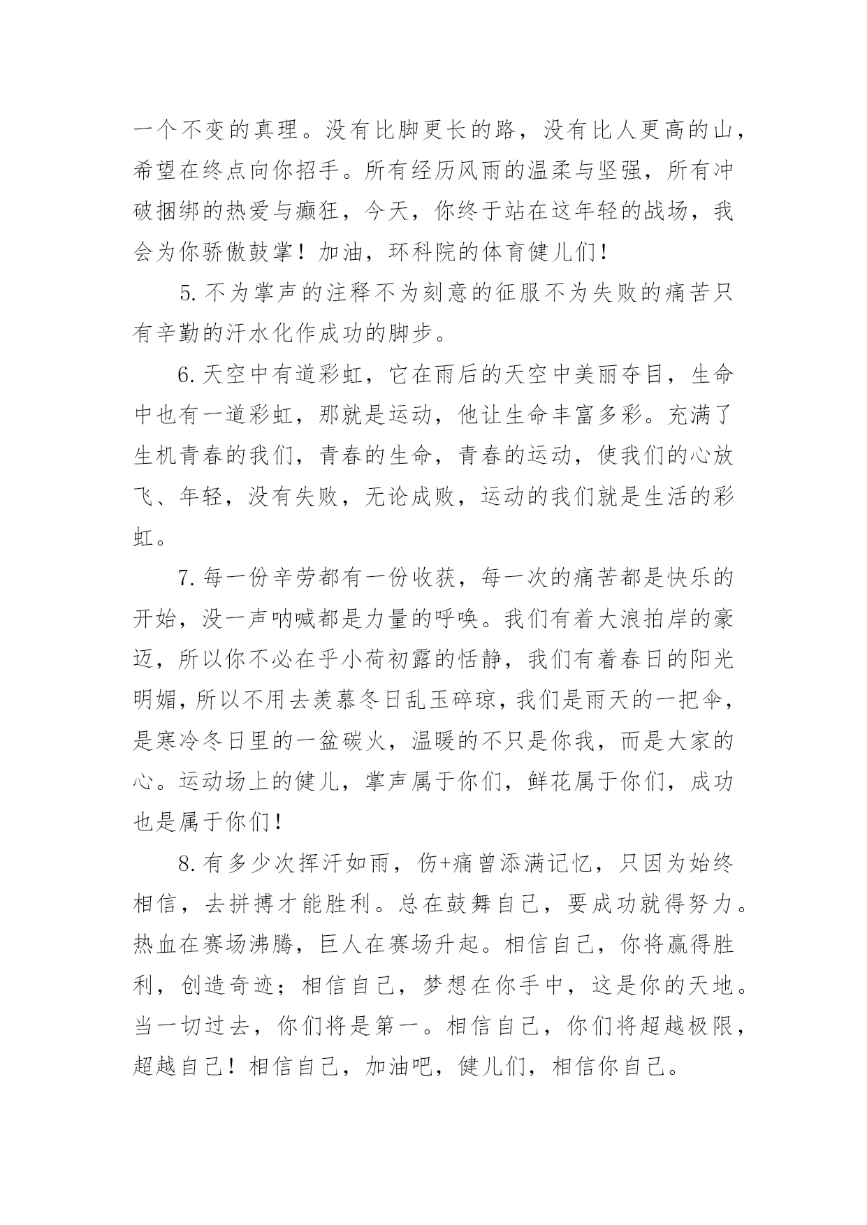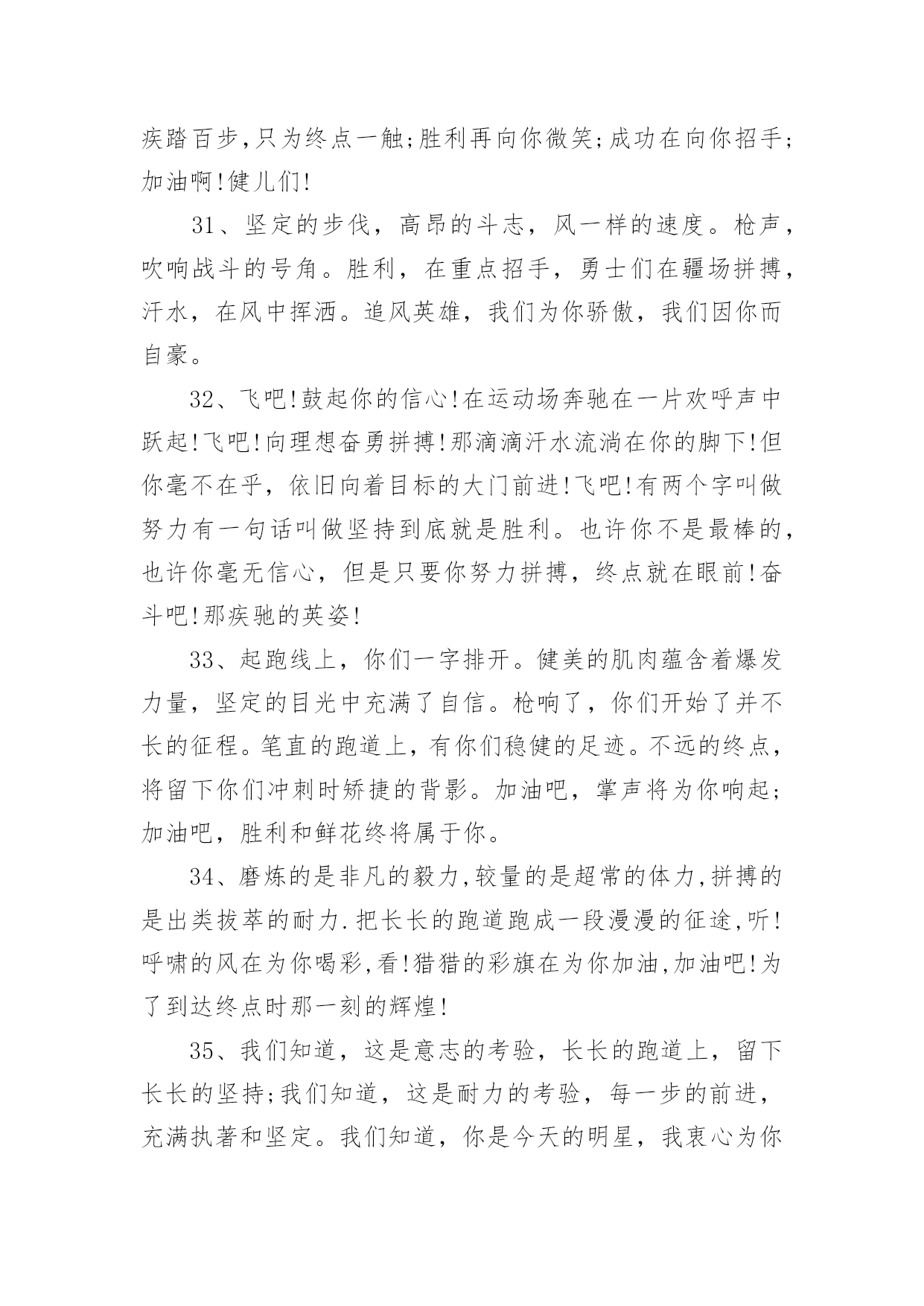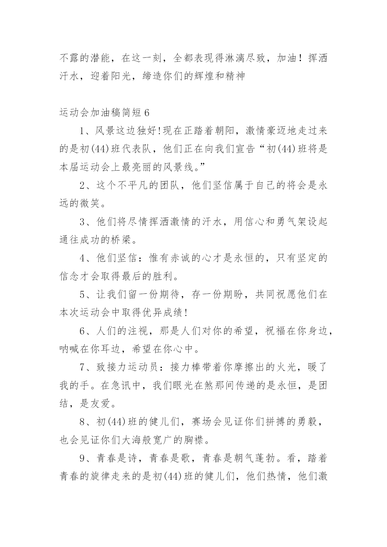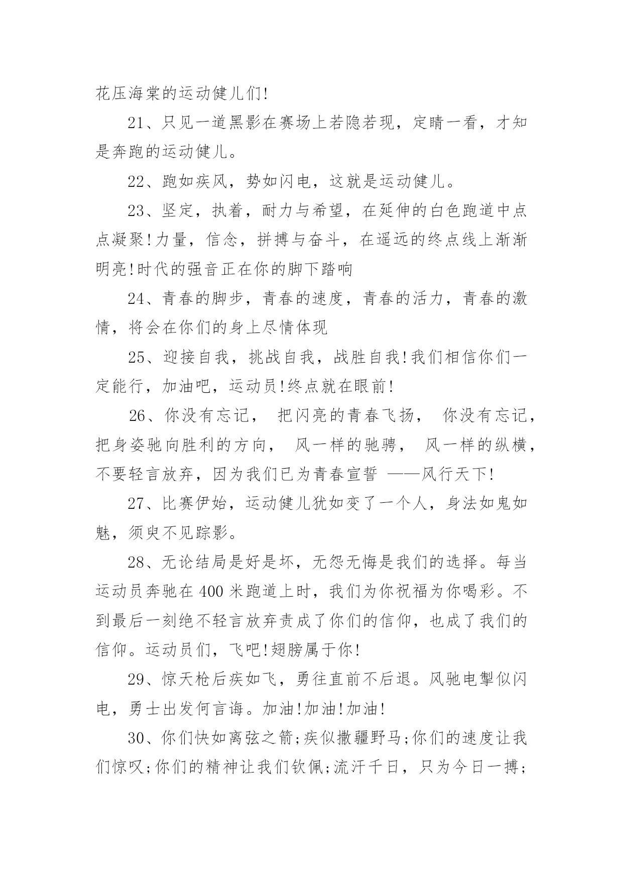 运动会加油稿简短在现在的社会生活中,我们越来越需要加油稿,加油稿可以起到活跃气氛的作用。相信写加油稿是一个让许多人都头痛的问题,以下是小编整理的运动会加油稿简短,希望对大家有所帮助。运动会加油稿简短1你的汗水洒在跑道上,如同给成功之花浇上了养分,让它们盛开绽放。你的欢笑在赛场上飞扬,为班级争光,你是最出色的。在宽广的赛场上,你像一匹奔马,像一支离弦的`箭,奔跑着,追逐着自己的目标。不停地跑吧,追逐吧,你比虎还勇猛,比豹还强壮。运动会加油稿简短2接力棒带着你摩擦出的火光,暖了我的手。我们眼光在刹那间传递的是永恒,是团结,是友爱。你的吼声震撼了你我他,牵动着你我他的心弦,让我们共同演绎这扣人心弦的飞荡。让我们共同为集体,我们大家的'心,供一份热,点一盏温馨暖人的灯。运动会加油稿简短3拿着粉笔的你们,有最帅气的身影;戴着运动牌的你们,有最矫健的身姿;平日的讲台是你们展示才华的地方,今天的跑道是你们呈现实力的舞台,1500米的跑道是与往日不同的长,望着你的步伐,我们都在跑道边陪你,坚持就是胜利,无论结局是好是坏,老师,你永远都是我们的`骄傲!__的老师啊!我们将在终点迎接你,坚持到底,你们是最棒的,加油!加油!加油!运动会加油稿简短41、你们挥舞着充满力量的双臂看着实心球化成美丽的身影我着实在心里佩服你们你们抛出了自己的最佳水平。2、你是运动场的心脏,跳动梦想;你是漫长路的精神,激励辉煌;你们是将上下求索的人!风为你加油,云为你助兴,坚定,执着,耐力与希望,在延伸的白色跑道中点点凝聚!力量,信念,拼搏与奋斗,在遥远的终点线上渐渐明亮!时代的强音正在你的脚下踏响。3、你用行动述说着过城的重要,没有无尽的终点,没有无法攀登的险峰,希望载着终点在向你微笑,拼搏吧!经历是一种精彩,迸发你全部的能量,成功是你汗水的写照。4、年轻的我们自信飞扬,青春的气息如同出生的朝阳,蓬勃的'力量如同阳光的挥洒。此时此刻,跑道便是我们精彩的舞台,声声加油便是我们最高的奖项!论何成功,谈何荣辱,心中的信念只有一个拼搏!5、朋友们,为运动健儿们喝彩,为运动喝彩吧!场上精彩纷呈,空气里的每一个分子浸透着自信。高二(班的我要高喊一声“这里无限精彩6、不为鲜花的围绕,不为刹那的荣耀,只有执着的信念,化作不停的奔跑,心中燃烧着梦想,脚下不停的步伐!7、这是意志的拼搏,这是速度的挑战,胜利在向你们招手,胜利在向你们呼唤!8、快去击败困难、快去夺取胜利!9、“路上再多崎岖,我们有壮志雄心,就算跌倒也不放弃……”GO!GO!GO!拿出你们炽热的心,赛出崭新的自己,赢得最后的胜利!运动会加油稿简短51.生活中,我们每天都在尝试尝试中,我们走向成功品味失败,走过心灵的阴雨晴空运动员们,不要放弃尝试无论失败与否重要的是你勇于参与的精神,付出的背后是胜利无论是否成功,我们永远赞美你,你们永远是我们的骄傲。2.我们的运动健儿,摩拳擦掌,跃跃欲试,要在运动场上一显身手,互论短长。运动场上,显露竞争精神,展现俺辈英雄本色;运动场下,友谊第一,比赛第二;增进感情,健身才可以健康。运动健儿最漂亮!3.泥泞的路走过无数累了,告诉自己:快了,再坚持一会儿身上的伤流出血来疼了,告诉自己:别哭,会好的摔到了,告诉自己:快爬起来,世上很少有坦途。4.心中坚定的信念,脚下沉稳的步伐,你用行动诉说着一个不变的真理。没有比脚更长的路,没有比人更高的山,希望在终点向你招手。所有经历风雨的温柔与坚强,所有冲破捆绑的热爱与癫狂,今天,你终于站在这年轻的战场,我会为你骄傲鼓掌!加油,环科院的体育健儿们!5.不为掌声的注释不为刻意的征服不为失败的痛苦只有辛勤的汗水化作成功的脚步。6.天空中有道彩虹,它在雨后的天空中美丽夺目,生命中也有一道彩虹,那就是运动,他让生命丰富多彩。充满了生机青春的我们,青春的生命,青春的运动,使我们的心放飞、年轻,没有失败,无论成败,运动的我们就是生活的彩虹。7.每一份辛劳都有一份收获,每一次的痛苦都是快乐的开始,没一声呐喊都是力量的呼唤。我们有着大浪拍岸的豪迈,所以你不必在乎小荷初露的恬静,我们有着春日的阳光明媚,所以不用去羡慕冬日乱玉碎琼,我们是雨天的一把伞,是寒冷冬日里的一盆碳火,温暖的不只是你我,而是大家的心。运动场上的健儿,掌声属于你们,鲜花属于你们,成功也是属于你们!8.有多少次挥汗如雨,伤+痛曾添满记忆,只因为始终相信,去拼搏才能胜利。总在鼓舞自己,要成功就得努力。热血在赛场沸腾,巨人在赛场升起。相信自己,你将赢得胜利,创造奇迹;相信自己,梦想在你手中,这是你的天地。当一切过去,你们将是第一。相信自己,你们将超越极限,超越自己!相信自己,加油吧,健儿们,相信你自己。9.年轻的我们自信飞扬,青春的气息如同出生的`朝阳,蓬勃的力量如同阳光的挥洒。此时此刻,跑道便是我们精彩的舞台,声