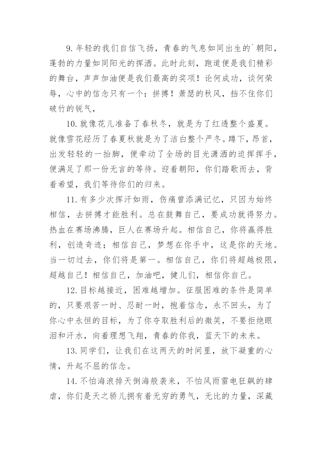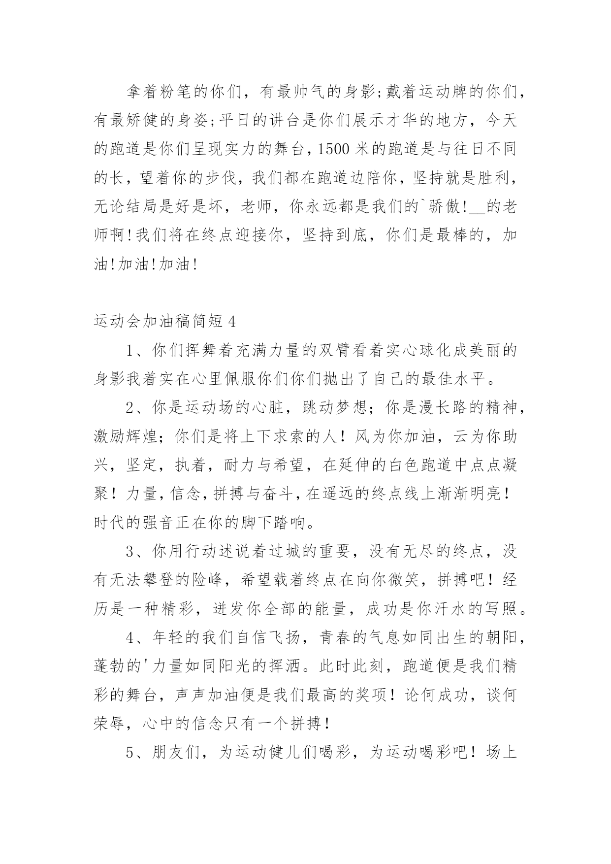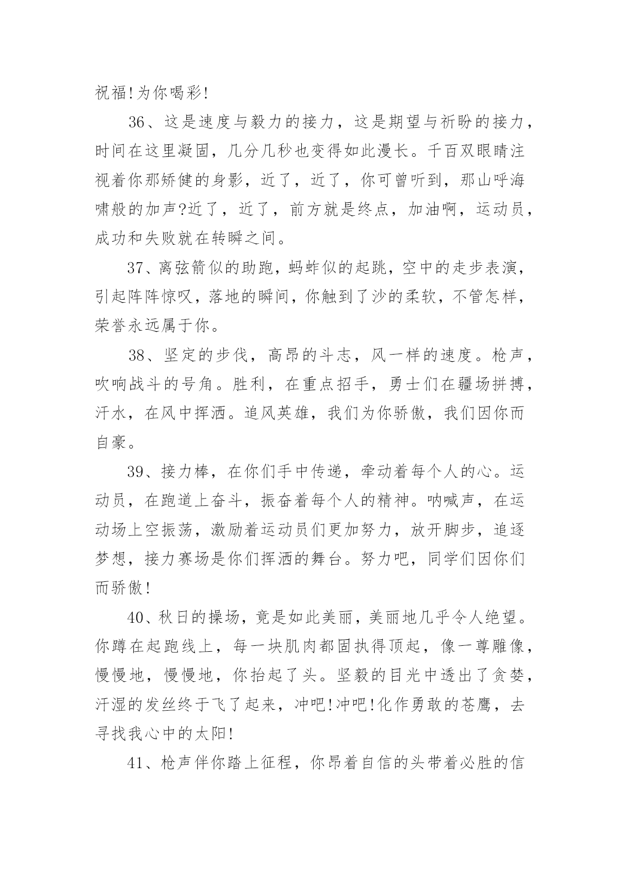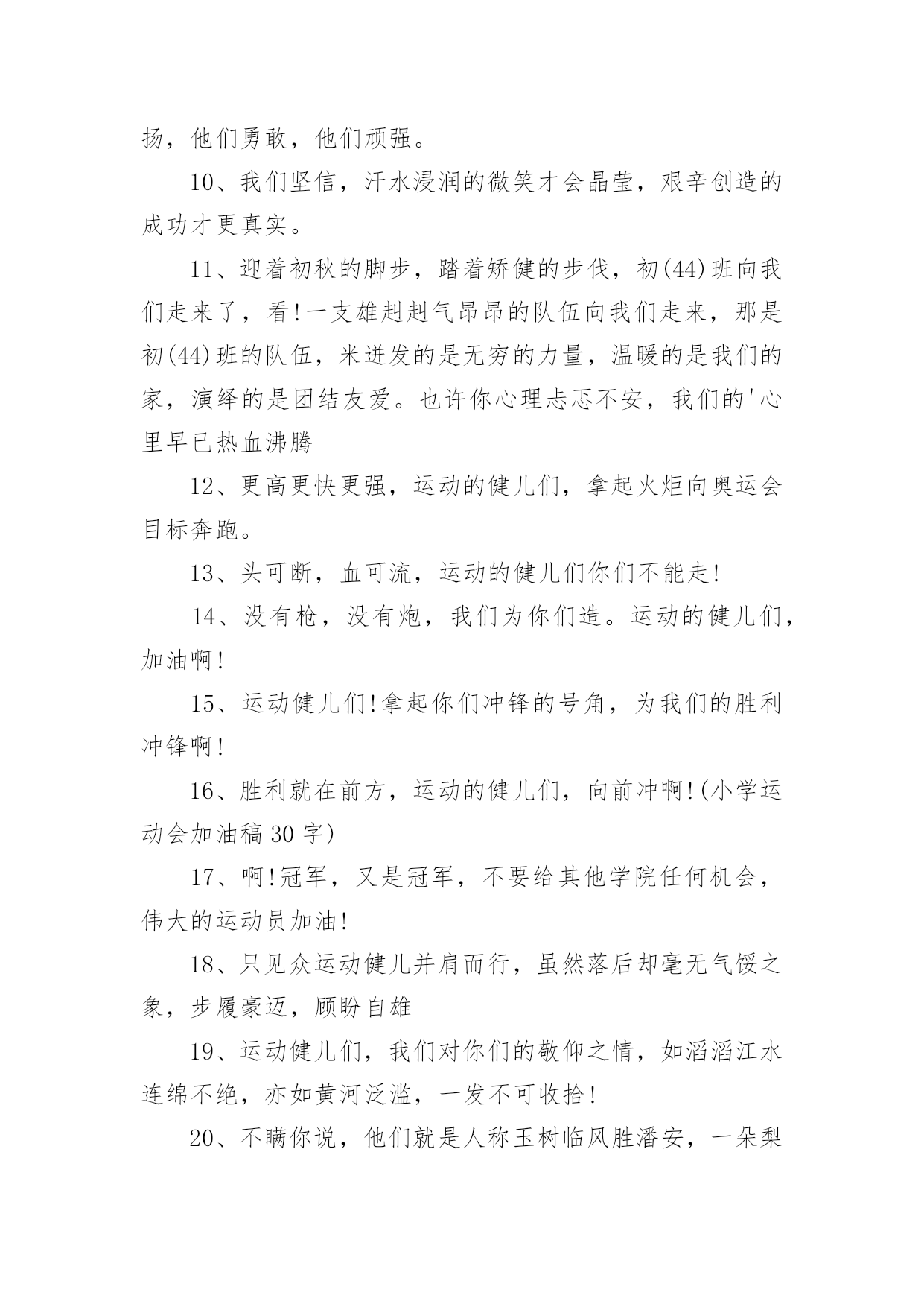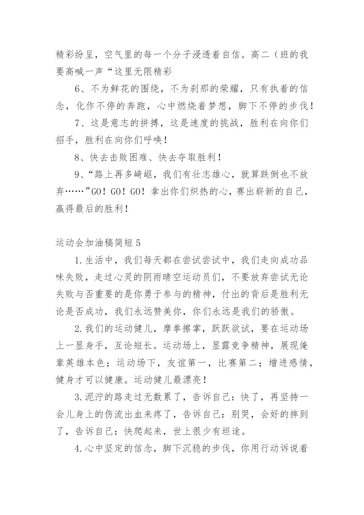 运动会加油稿简短在现在的社会生活中,我们越来越需要加油稿,加油稿可以起到活跃气氛的作用。相信写加油稿是一个让许多人都头痛的问题,以下是小编整理的运动会加油稿简短,希望对大家有所帮助。运动会加油稿简短1你的汗水洒在跑道上,如同给成功之花浇上了养分,让它们盛开绽放。你的欢笑在赛场上飞扬,为班级争光,你是最出色的。在宽广的赛场上,你像一匹奔马,像一支离弦的`箭,奔跑着,追逐着自己的目标。不停地跑吧,追逐吧,你比虎还勇猛,比豹还强壮。运动会加油稿简短2接力棒带着你摩擦出的火光,暖了我的手。我们眼光在刹那间传递的是永恒,是团结,是友爱。你的吼声震撼了你我他,牵动着你我他的心弦,让我们共同演绎这扣人心弦的飞荡。让我们共同为集体,我们大家的'心,供一份热,点一盏温馨暖人的灯。运动会加油稿简短3拿着粉笔的你们,有最帅气的身影;戴着运动牌的你们,有最矫健的身姿;平日的讲台是你们展示才华的地方,今天的跑道是你们呈现实力的舞台,1500米的跑道是与往日不同的长,望着你的步伐,我们都在跑道边陪你,坚持就是胜利,无论结局是好是坏,老师,你永远都是我们的`骄傲!__的老师啊!我们将在终点迎接你,坚持到底,你们是最棒的,加油!加油!加油!运动会加油稿简短41、你们挥舞着充满力量的双臂看着实心球化成美丽的身影我着实在心里佩服你们你们抛出了自己的最佳水平。2、你是运动场的心脏,跳动梦想;你是漫长路的精神,激励辉煌;你们是将上下求索的人!风为你加油,云为你助兴,坚定,执着,耐力与希望,在延伸的白色跑道中点点凝聚!力量,信念,拼搏与奋斗,在遥远的终点线上渐渐明亮!时代的强音正在你的脚下踏响。3、你用行动述说着过城的重要,没有无尽的终点,没有无法攀登的险峰,希望载着终点在向你微笑,拼搏吧!经历是一种精彩,迸发你全部的能量,成功是你汗水的写照。4、年轻的我们自信飞扬,青春的气息如同出生的朝阳,蓬勃的'力量如同阳光的挥洒。此时此刻,跑道便是我们精彩的舞台,声声加油便是我们最高的奖项!论何成功,谈何荣辱,心中的信念只有一个拼搏!5、朋友们,为运动健儿们喝彩,为运动喝彩吧!场上精彩纷呈,空气里的每一个分子浸透着自信。高二(班的我要高喊一声“这里无限精彩6、不为鲜花的围绕,不为刹那的荣耀,只有执着的信念,化作不停的奔跑,心中燃烧着梦想,脚下不停的步伐!7、这是意志的拼搏,这是速度的挑战,胜利在向你们招手,胜利在向你们呼唤!8、快去击败困难、快去夺取胜利!9、“路上再多崎岖,我们有壮志雄心,就算跌倒也不放弃……”GO!GO!GO!拿出你们炽热的心,赛出崭新的自己,赢得最后的胜利!运动会加油稿简短51.生活中,我们每天都在尝试尝试中,我们走向成功品味失败,走过心灵的阴雨晴空运动员们,不要放弃尝试无论失败与否重要的是你勇于参与的精神,付出的背后是胜利无论是否成功,我们永远赞美你,你们永远是我们的骄傲。2.我们的运动健儿,摩拳擦掌,跃跃欲试,要在运动场上一显身手,互论短长。运动场上,显露竞争精神,展现俺辈英雄本色;运动场下,友谊第一,比赛第二;增进感情,健身才可以健康。运动健儿最漂亮!3.泥泞的路走过无数累了,告诉自己:快了,再坚持一会儿身上的伤流出血来疼了,告诉自己:别哭,会好的摔到了,告诉自己:快爬起来,世上很少有坦途。4.心中坚定的信念,脚下沉稳的步伐,你用行动诉说着一个不变的真理。没有比脚更长的路,没有比人更高的山,希望在终点向你招手。所有经历风雨的温柔与坚强,所有冲破捆绑的热爱与癫狂,今天,你终于站在这年轻的战场,我会为你骄傲鼓掌!加油,环科院的体育健儿们!5.不为掌声的注释不为刻意的征服不为失败的痛苦只有辛勤的汗水化作成功的脚步。6.天空中有道彩虹,它在雨后的天空中美丽夺目,生命中也有一道彩虹,那就是运动,他让生命丰富多彩。充满了生机青春的我们,青春的生命,青春的运动,使我们的心放飞、年轻,没有失败,无论成败,运动的我们就是生活的彩虹。7.每一份辛劳都有一份收获,每一次的痛苦都是快乐的开始,没一声呐喊都是力量的呼唤。我们有着大浪拍岸的豪迈,所以你不必在乎小荷初露的恬静,我们有着春日的阳光明媚,所以不用去羡慕冬日乱玉碎琼,我们是雨天的一把伞,是寒冷冬日里的一盆碳火,温暖的不只是你我,而是大家的心。运动场上的健儿,掌声属于你们,鲜花属于你们,成功也是属于你们!8.有多少次挥汗如雨,伤+痛曾添满记忆,只因为始终相信,去拼搏才能胜利。总在鼓舞自己,要成功就得努力。热血在赛场沸腾,巨人在赛场升起。相信自己,你将赢得胜利,创造奇迹;相信自己,梦想在你手中,这是你的天地。当一切过去,你们将是第一。相信自己,你们将超越极限,超越自己!相信自己,加油吧,健儿们,相信你自己。9.年轻的我们自信飞扬,青春的气息如同出生的`朝阳,蓬勃的力量如同阳光的挥洒。此时此刻,跑道便是我们精彩的舞台,声