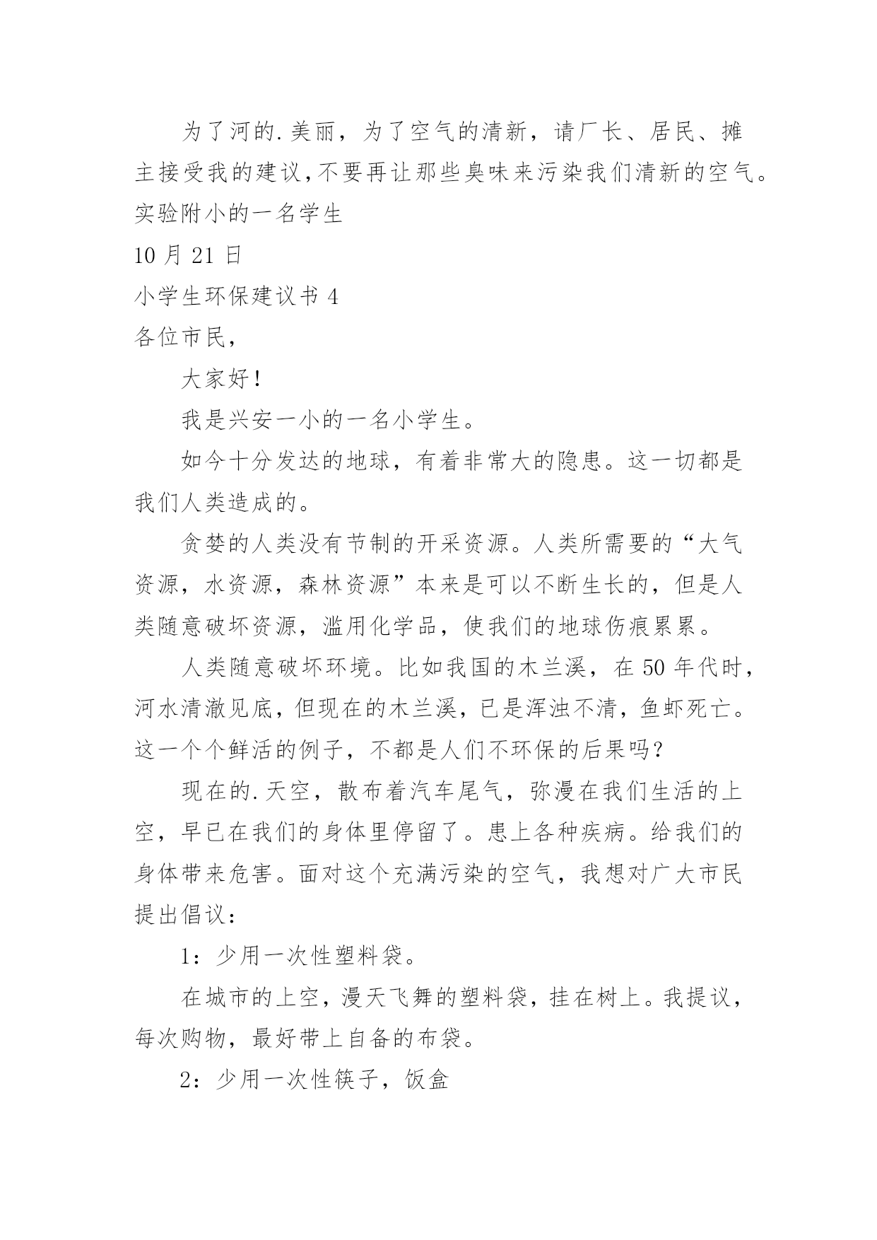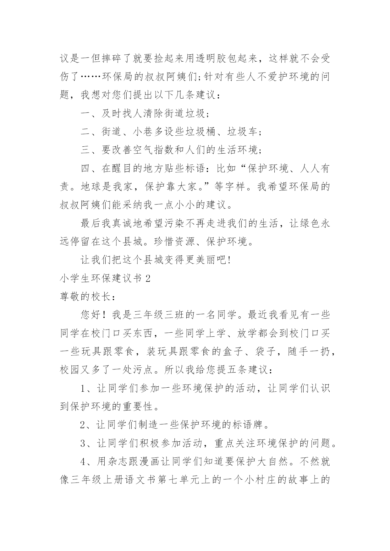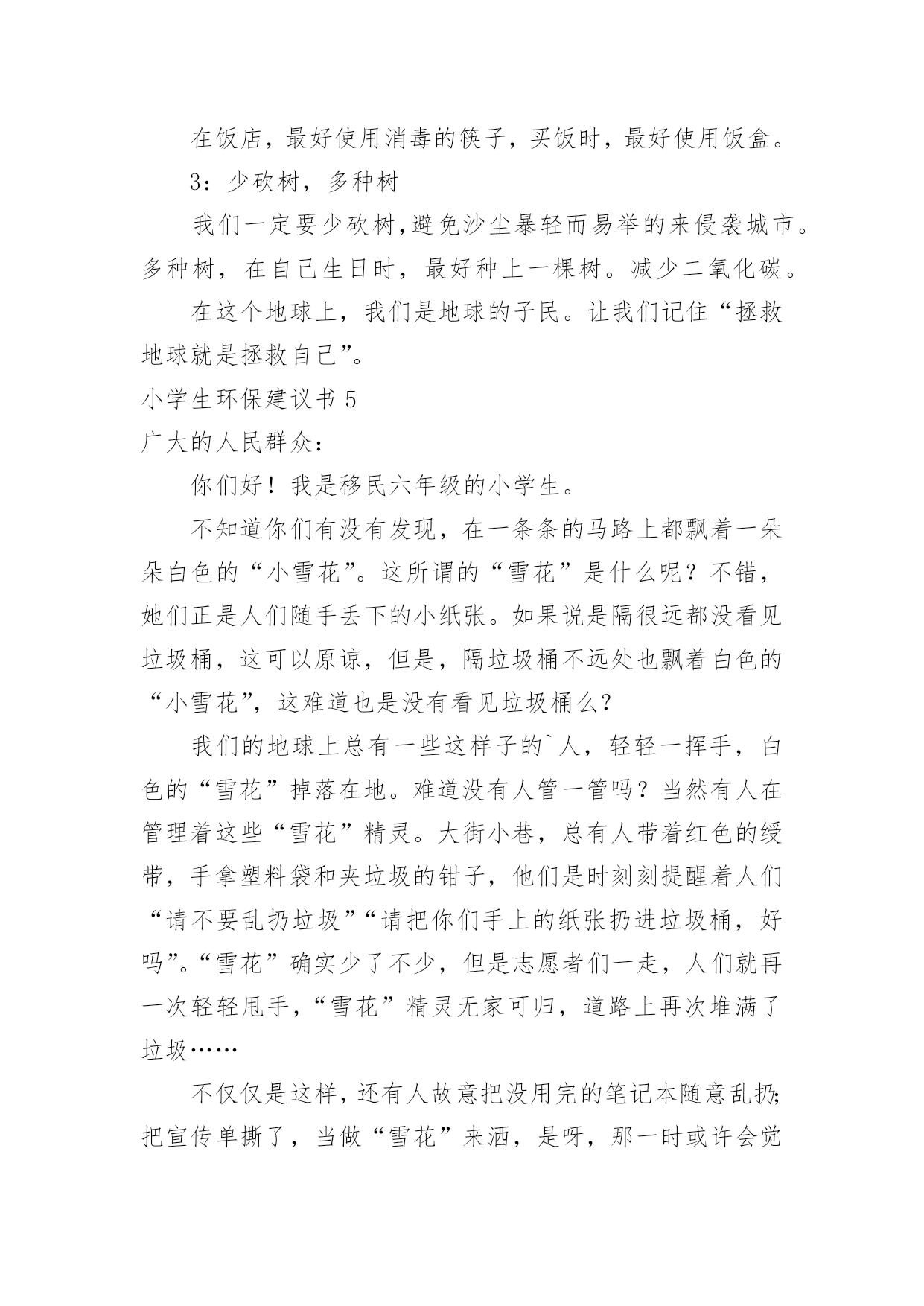 小学生环保建议书小学生环保建议书15篇现如今,很多地方都会使用到建议书,建议书是个人或者单位有关方面为了开展某项工作,完成某项任务或进行某种活动而倡议大家一起做什么事情,或提出合理化的意见、建议时使用的一种文体。相信写建议书是一个让许多人都头痛的问题,下面是小编精心整理的小学生环保建议书,欢迎阅读与收藏。小学生环保建议书1环保局的叔叔阿姨们;你们好!我是一名六年级的小学生,我和我的朋友们都渴望在一个美丽的环境下生活、学习。可是,现在的环境,已经算是被污染了。所以,环保局的叔叔阿姨们,能采纳我的建议让我们把它变得更美丽吧!地发货好地球是我们的母亲,是生命的`摇篮。我们“善待地球就是善待自己”现在有许多的人破坏了环境,例如;河水中到处都是白色垃圾;大量未经处理的污水被排放到江河中;还有一点更是重要的,如果人们把碗个摔碎了,就直接扔进了垃圾桶,如果有人去清理垃圾桶时一不小心就会把手给划破了,这样会对人们带来危害的,我的建议是一但摔碎了就要捡起来用透明胶包起来,这样就不会受伤了……环保局的叔叔阿姨们;针对有些人不爱护环境的问题,我想对您们提出以下几条建议:一、及时找人清除街道垃圾;二、街道、小巷多设些垃圾桶、垃圾车;三、要改善空气指数和人们的生活环境;四、在醒目的地方贴些标语:比如“保护环境、人人有责。地球是我家,保护靠大家。”等字样。我希望环保局的叔叔阿姨们能采纳我一点小小的建议。最后我真诚地希望污染不再走进我们的生活,让绿色永远停留在这个县城。珍惜资源、保护环境。让我们把这个县城变得更美丽吧!小学生环保建议书2尊敬的校长:您好!我是三年级三班的一名同学。最近我看见有一些同学在校门口买东西,一些同学上学、放学都会到校门口买一些玩具跟零食,装玩具跟零食的盒子、袋子,随手一扔,校园又多了一处污点。所以我给您提五条建议:1、让同学们参加一些环境保护的活动,让同学们认识到保护环境的重要性。2、让同学们制造一些保护环境的标语牌。3、让同学们积极参加活动,重点关注环境保护的问题。4、用杂志跟漫画让同学们知道要保护大自然。不然就像三年级上册语文书第七单元上的一个小村庄的故事上的人们,因为不保护大自然,就收到大自然的惩罚。5、多组织活动,让同学跟家长都参加,加强环保意识。校长,我这五条建议请您收下,希望您在百忙之中抽出一点时间,看看我的`建议书,采纳我的建议,让我们的校园变得更美丽,空气更清新。小学生环保建议书3河旁边的居民和周围的厂长:我是实验附小的一名小学生。我在回家时经过河,看见河里的水都发黑发臭了。以前的河可不是这样的。那时河水清澈见底,河里的鱼儿都很肥,许多的人都在这钓鱼呢!可现在河水发黑发臭,小鱼。小虾早搬家了。虽然河的两岸种了树,河底铺了鹅卵石,但人们还是看都不看一眼就走了。它无奈地垂下了头,像生命垂危的老人。为什么河河水会发黑发臭呢?经过调查后,我才知道是因为周围的工厂把工业废水直接排到河里,让它变得发黑发臭了。另一个原因就是附近的居民也把没有经过处理的生活用水直接排到河里。还有一个原因是路边路边摆水果摊的人常常把烂水果扔到河里,日久天长,河水也就变臭了。因此,我向你们提出建议:1、工厂里的水先进行处理,然后循环使用。2、生活用水也可以先进行处理,然后排到河里。3、在河旁边多设几个垃圾桶,让摊主不要把垃圾扔到河里,而是扔到垃圾桶里。为了河的.美丽,为了空气的清新,请厂长、居民、摊主接受我的建议,不要再让那些臭味来污染我们清新的空气。实验附小的一名学生10月21日小学生环保建议书4各位市民,大家好!我是兴安一小的一名小学生。如今十分发达的地球,有着非常大的隐患。这一切都是我们人类造成的。贪婪的人类没有节制的开采资源。人类所需要的“大气资源,水资源,森林资源”本来是可以不断生长的,但是人类随意破坏资源,滥用化学品,使我们的地球伤痕累累。人类随意破坏环境。比如我国的木兰溪,在50年代时,河水清澈见底,但现在的木兰溪,已是浑浊不清,鱼虾死亡。这一个个鲜活的例子,不都是人们不环保的后果吗?现在的.天空,散布着汽车尾气,弥漫在我们生活的上空,早已在我们的身体里停留了。患上各种疾病。给我们的身体带来危害。面对这个充满污染的空气,我想对广大市民提出倡议:1:少用一次性塑料袋。在城市的上空,漫天飞舞的塑料袋,挂在树上。我提议,每次购物,最好带上自备的布袋。2:少用一次性筷子,饭盒在饭店,最好使用消毒的筷子,买饭时,最好使用饭盒。3:少砍树,多种树我们一定要少砍树,避免沙尘暴轻而易举的来侵袭城市。多种树,在自己生日时,最好种上一棵树。减少二氧化碳。在这个地球上,我们是地球的子民。让我们记住“拯救地球就是拯救自己”。小学生环保建议书5广大的人民群众:你们好!我是移民六年级的小学生。不知道你们有没有发现,在一条条的马路上都飘着一朵朵白色的“小雪花”。这