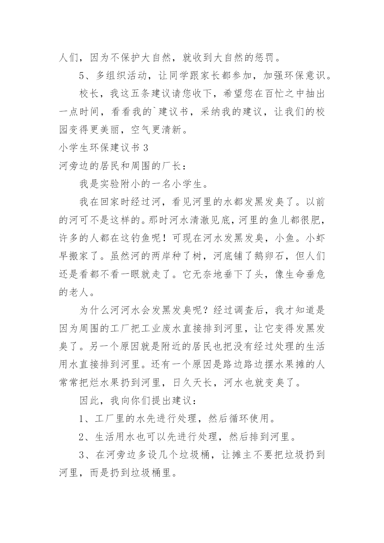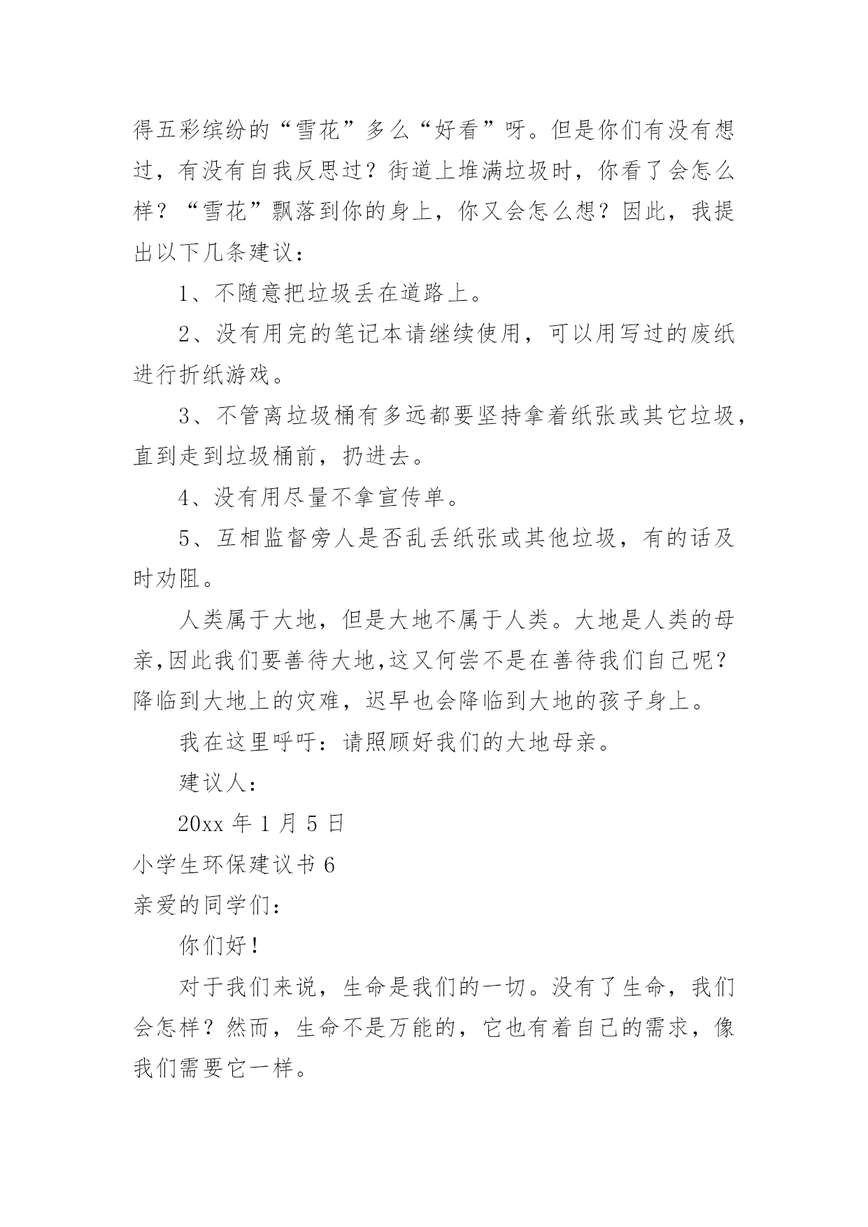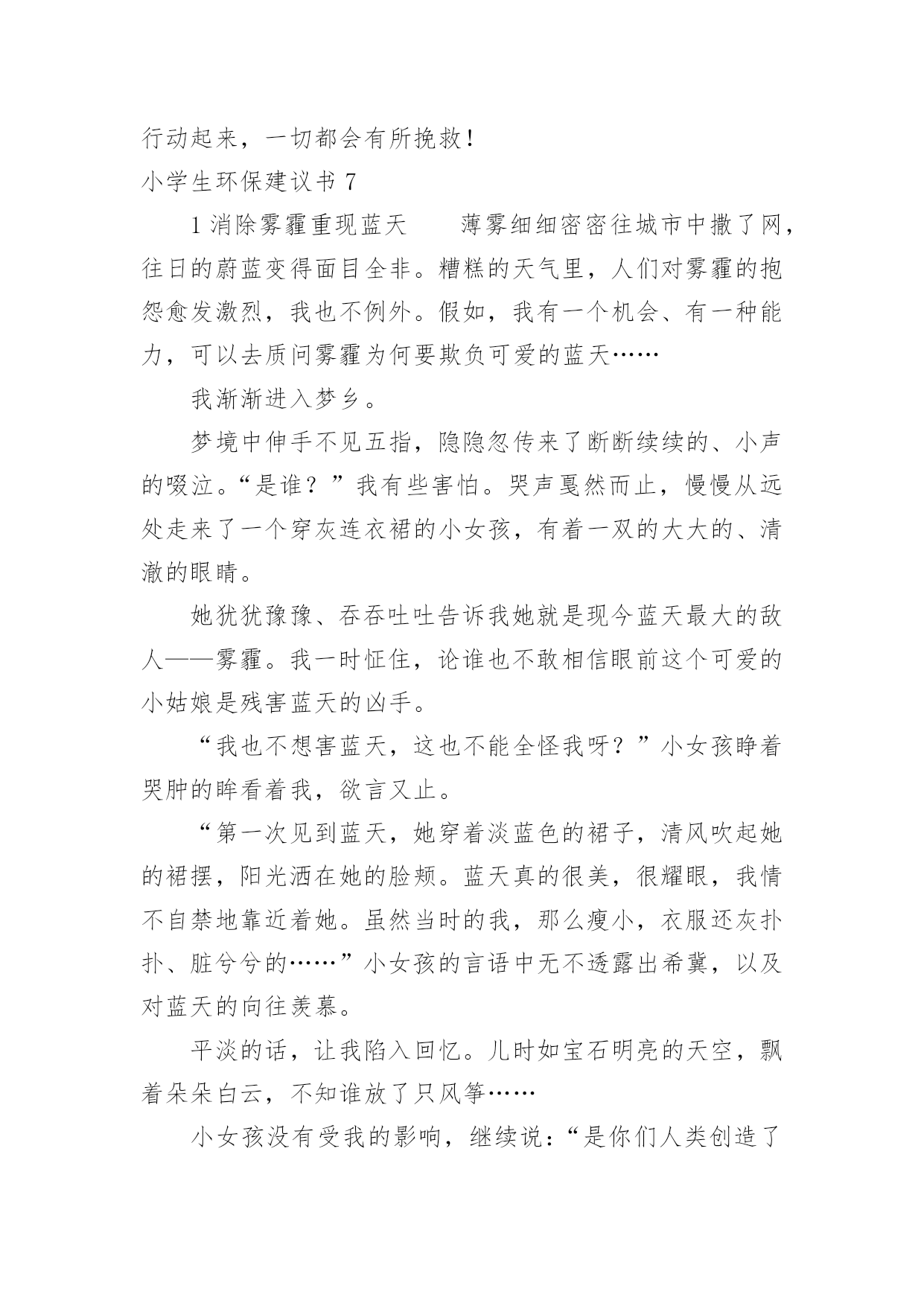 小学生环保建议书小学生环保建议书15篇现如今,很多地方都会使用到建议书,建议书是个人或者单位有关方面为了开展某项工作,完成某项任务或进行某种活动而倡议大家一起做什么事情,或提出合理化的意见、建议时使用的一种文体。相信写建议书是一个让许多人都头痛的问题,下面是小编精心整理的小学生环保建议书,欢迎阅读与收藏。小学生环保建议书1环保局的叔叔阿姨们;你们好!我是一名六年级的小学生,我和我的朋友们都渴望在一个美丽的环境下生活、学习。可是,现在的环境,已经算是被污染了。所以,环保局的叔叔阿姨们,能采纳我的建议让我们把它变得更美丽吧!地发货好地球是我们的母亲,是生命的`摇篮。我们“善待地球就是善待自己”现在有许多的人破坏了环境,例如;河水中到处都是白色垃圾;大量未经处理的污水被排放到江河中;还有一点更是重要的,如果人们把碗个摔碎了,就直接扔进了垃圾桶,如果有人去清理垃圾桶时一不小心就会把手给划破了,这样会对人们带来危害的,我的建议是一但摔碎了就要捡起来用透明胶包起来,这样就不会受伤了……环保局的叔叔阿姨们;针对有些人不爱护环境的问题,我想对您们提出以下几条建议:一、及时找人清除街道垃圾;二、街道、小巷多设些垃圾桶、垃圾车;三、要改善空气指数和人们的生活环境;四、在醒目的地方贴些标语:比如“保护环境、人人有责。地球是我家,保护靠大家。”等字样。我希望环保局的叔叔阿姨们能采纳我一点小小的建议。最后我真诚地希望污染不再走进我们的生活,让绿色永远停留在这个县城。珍惜资源、保护环境。让我们把这个县城变得更美丽吧!小学生环保建议书2尊敬的校长:您好!我是三年级三班的一名同学。最近我看见有一些同学在校门口买东西,一些同学上学、放学都会到校门口买一些玩具跟零食,装玩具跟零食的盒子、袋子,随手一扔,校园又多了一处污点。所以我给您提五条建议:1、让同学们参加一些环境保护的活动,让同学们认识到保护环境的重要性。2、让同学们制造一些保护环境的标语牌。3、让同学们积极参加活动,重点关注环境保护的问题。4、用杂志跟漫画让同学们知道要保护大自然。不然就像三年级上册语文书第七单元上的一个小村庄的故事上的人们,因为不保护大自然,就收到大自然的惩罚。5、多组织活动,让同学跟家长都参加,加强环保意识。校长,我这五条建议请您收下,希望您在百忙之中抽出一点时间,看看我的`建议书,采纳我的建议,让我们的校园变得更美丽,空气更清新。小学生环保建议书3河旁边的居民和周围的厂长:我是实验附小的一名小学生。我在回家时经过河,看见河里的水都发黑发臭了。以前的河可不是这样的。那时河水清澈见底,河里的鱼儿都很肥,许多的人都在这钓鱼呢!可现在河水发黑发臭,小鱼。小虾早搬家了。虽然河的两岸种了树,河底铺了鹅卵石,但人们还是看都不看一眼就走了。它无奈地垂下了头,像生命垂危的老人。为什么河河水会发黑发臭呢?经过调查后,我才知道是因为周围的工厂把工业废水直接排到河里,让它变得发黑发臭了。另一个原因就是附近的居民也把没有经过处理的生活用水直接排到河里。还有一个原因是路边路边摆水果摊的人常常把烂水果扔到河里,日久天长,河水也就变臭了。因此,我向你们提出建议:1、工厂里的水先进行处理,然后循环使用。2、生活用水也可以先进行处理,然后排到河里。3、在河旁边多设几个垃圾桶,让摊主不要把垃圾扔到河里,而是扔到垃圾桶里。为了河的.美丽,为了空气的清新,请厂长、居民、摊主接受我的建议,不要再让那些臭味来污染我们清新的空气。实验附小的一名学生10月21日小学生环保建议书4各位市民,大家好!我是兴安一小的一名小学生。如今十分发达的地球,有着非常大的隐患。这一切都是我们人类造成的。贪婪的人类没有节制的开采资源。人类所需要的“大气资源,水资源,森林资源”本来是可以不断生长的,但是人类随意破坏资源,滥用化学品,使我们的地球伤痕累累。人类随意破坏环境。比如我国的木兰溪,在50年代时,河水清澈见底,但现在的木兰溪,已是浑浊不清,鱼虾死亡。这一个个鲜活的例子,不都是人们不环保的后果吗?现在的.天空,散布着汽车尾气,弥漫在我们生活的上空,早已在我们的身体里停留了。患上各种疾病。给我们的身体带来危害。面对这个充满污染的空气,我想对广大市民提出倡议:1:少用一次性塑料袋。在城市的上空,漫天飞舞的塑料袋,挂在树上。我提议,每次购物,最好带上自备的布袋。2:少用一次性筷子,饭盒在饭店,最好使用消毒的筷子,买饭时,最好使用饭盒。3:少砍树,多种树我们一定要少砍树,避免沙尘暴轻而易举的来侵袭城市。多种树,在自己生日时,最好种上一棵树。减少二氧化碳。在这个地球上,我们是地球的子民。让我们记住“拯救地球就是拯救自己”。小学生环保建议书5广大的人民群众:你们好!我是移民六年级的小学生。不知道你们有没有发现,在一条条的马路上都飘着一朵朵白色的“小雪花”。这