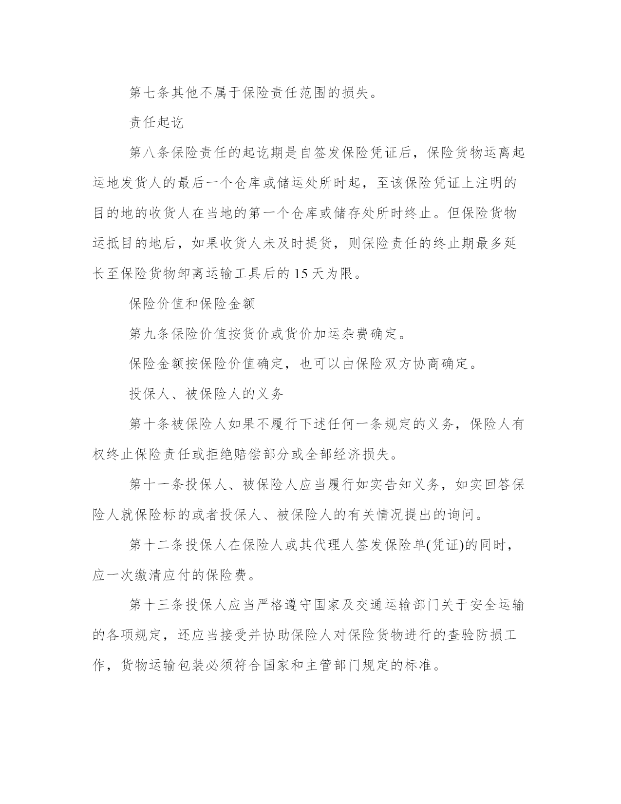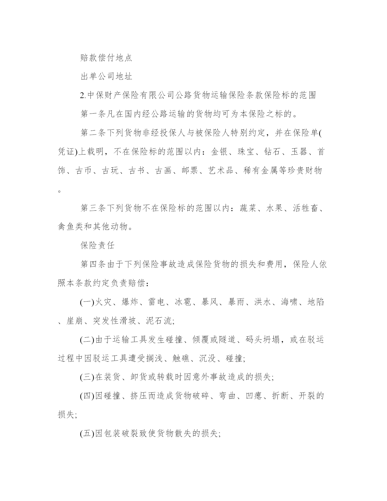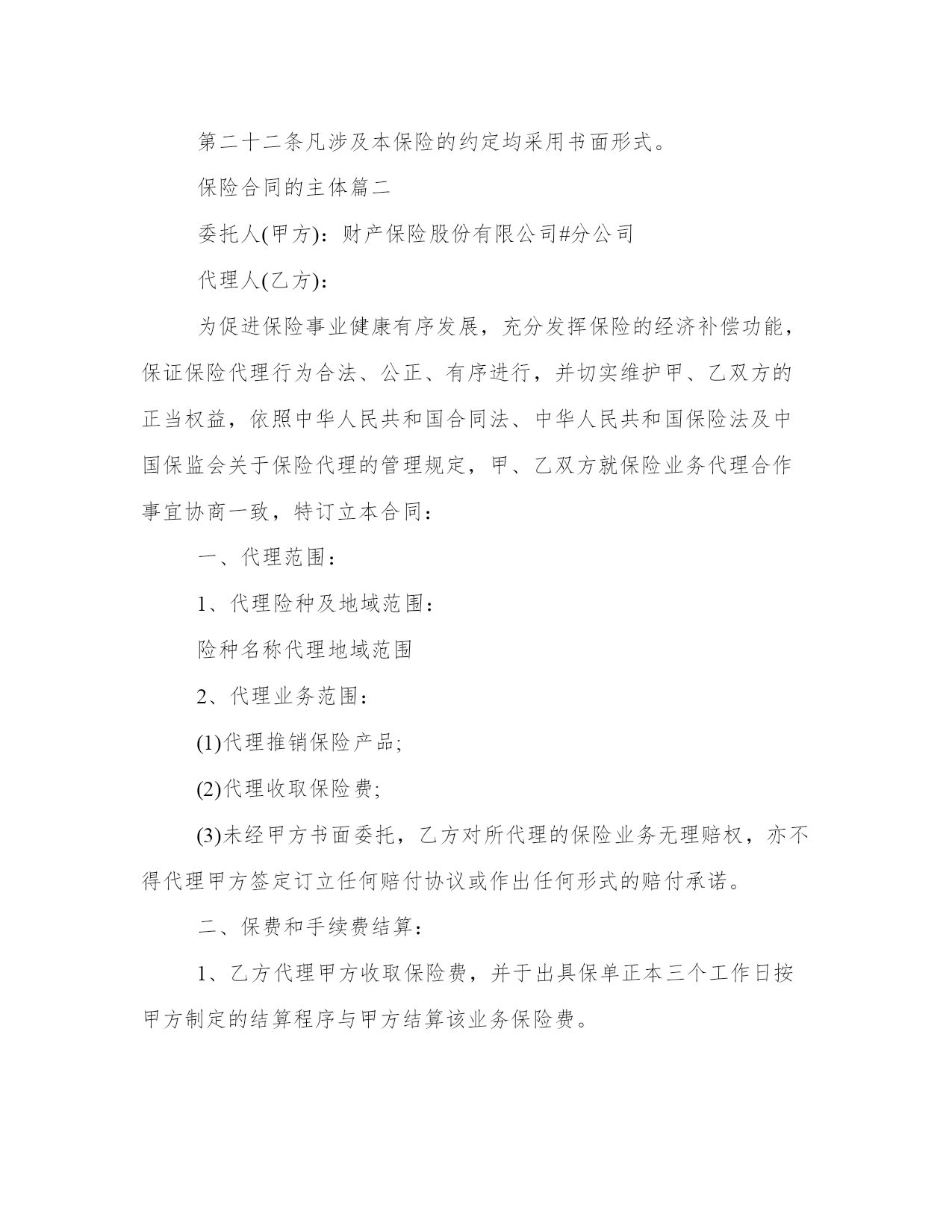 最新保险合同的主体(8篇)在生活中,越来越多人会去使用协议,签订签订协议是最有效的法律依据之一。那么合同书的格式,你掌握了吗?下面是小编为大家带来的合同优秀范文,希望大家可以喜欢。保险合同的主体篇一中保财产保险有限公司(以下简称本公司)根据__________________(以下简称为被保险人)的要求由被保险人向本公司缴付约定的保险费,按照本保险单承保险别和背后所载条款与下列特款承保下述货物运输保险,特立本保险单。标记包装及量保险货物项目保险金额(表格呈现)总保险金额:________________________________________保费________________费率____________装载工具_______________开航日期____________自_______________至_______________承保险别:所保货物,如发生保险单项下可能引起索赔的损失或损坏,应立即通知本公司下述代理人查勘。如有索赔,应向本公司提交保险单正本(本保险单共有一份正本)及有关文件。____________保险公司赔款偿付地点出单公司地址2.中保财产保险有限公司公路货物运输保险条款保险标的范围第一条凡在国内经公路运输的货物均可为本保险之标的。第二条下列货物非经投保人与被保险人特别约定,并在保险单(凭证)上载明,不在保险标的范围以内:金银、珠宝、钻石、玉器、首饰、古币、古玩、古书、古画、邮票、艺术品、稀有金属等珍贵财物。第三条下列货物不在保险标的范围以内:蔬菜、水果、活牲畜、禽鱼类和其他动物。保险责任第四条由于下列保险事故造成保险货物的损失和费用,保险人依照本条款约定负责赔偿:(一)火灾、爆炸、雷电、冰雹、暴风、暴雨、洪水、海啸、地陷、崖崩、突发性滑坡、泥石流;(二)由于运输工具发生碰撞、倾覆或隧道、码头坍塌,或在驳运过程中因驳运工具遭受搁浅、触礁、沉没、碰撞;(三)在装货、卸货或转载时因意外事故造成的损失;(四)因碰撞、挤压而造成货物破碎、弯曲、凹瘪、折断、开裂的损失;(五)因包装破裂致使货物散失的损失;(六)液体货物因受碰撞或挤压致使所用容器(包括封口)损坏而渗漏的损失,或用液体保藏的货物因液体渗漏而造成该货物腐烂变质的损失;(七)符合安全运输规定而遭受雨淋所致的损失;(八)在发生上述灾害事故时,因纷乱造成货物的散失以及因施救或保护货物所支付的直接合理的费用。责任免除第五条由于下列原因造成保险货物的损失,保险人不负赔偿责任:(一)战争、敌对行为、军事行动、扣押、罢工、暴动、哄抢;(二)地震造成的损失;(三)盗窃或整件提货不着的损失;(四)在保险责任开始前,被保险货物已存在的品质不良或数量短差所造成的损失;(五)被保险货物的自然损耗、本质缺陷、特性所引起的损失或费用;(六)市价跌落、运输延迟所引起的损失;(七)属于发货人责任引起的损失;(八)投保人、被保险人的故意行为或违法犯罪行为;第六条经国家有关部门认定的违法、非法货物,保险人不负赔偿责任。第七条其他不属于保险责任范围的损失。责任起讫第八条保险责任的起讫期是自签发保险凭证后,保险货物运离起运地发货人的最后一个仓库或储运处所时起,至该保险凭证上注明的目的地的收货人在当地的第一个仓库或储存处所时终止。但保险货物运抵目的地后,如果收货人未及时提货,则保险责任的终止期最多延长至保险货物卸离运输工具后的15天为限。保险价值和保险金额第九条保险价值按货价或货价加运杂费确定。保险金额按保险价值确定,也可以由保险双方协商确定。投保人、被保险人的义务第十条被保险人如果不履行下述任何一条规定的义务,保险人有权终止保险责任或拒绝赔偿部分或全部经济损失。第十一条投保人、被保险人应当履行如实告知义务,如实回答保险人就保险标的或者投保人、被保险人的有关情况提出的询问。第十二条投保人在保险人或其代理人签发保险单(凭证)的同时,应一次缴清应付的保险费。第十三条投保人应当严格遵守国家及交通运输部门关于安全运输的各项规定,还应当接受并协助保险人对保险货物进行的查验防损工作,货物运输包装必须符合国家和主管部门规定的标准。第十四条保险货物如果发生保险责任范围内的损失时,投保人或被保险人获悉后,应迅速采取合理的施救和保护措施并立即通知保险人的当地机构(最迟不超过10天)。赔偿处理第十五条被保险人向保险人申请索赔时,必须提供下列有关单证:(一)保险单(凭证)、运单(货票)、提货单、发票(货价证明);(二)承运部门签发的事故签证、交接验收记录、鉴定书;(三)收货单位的入库记录、检验报告、损失清单及救护保险货物所支付的直接合理的费用单据;(四)其他有利于保险理赔的单证。保险人在接到上述