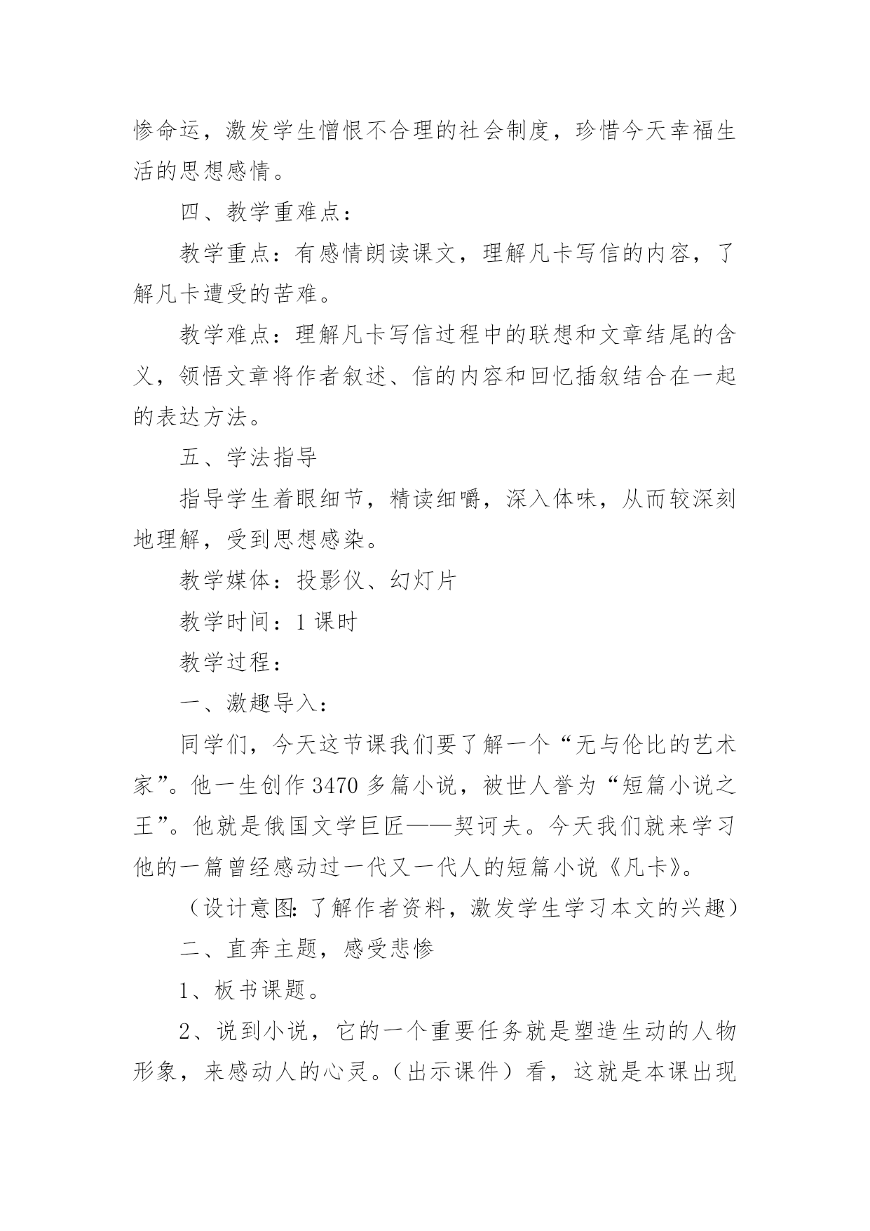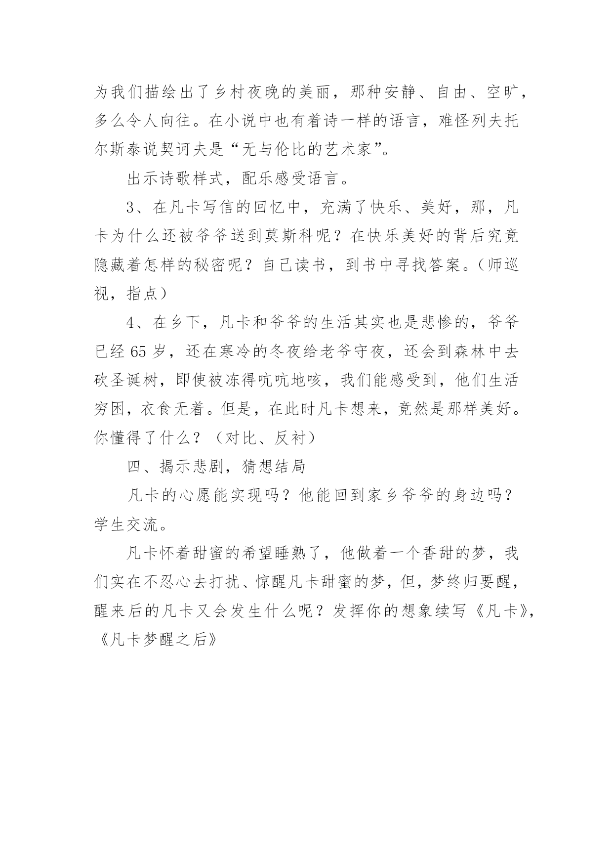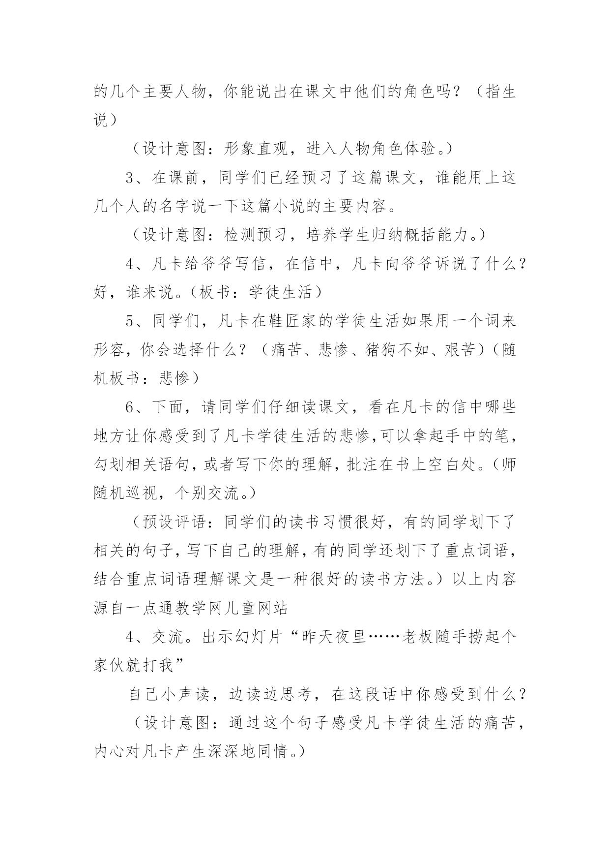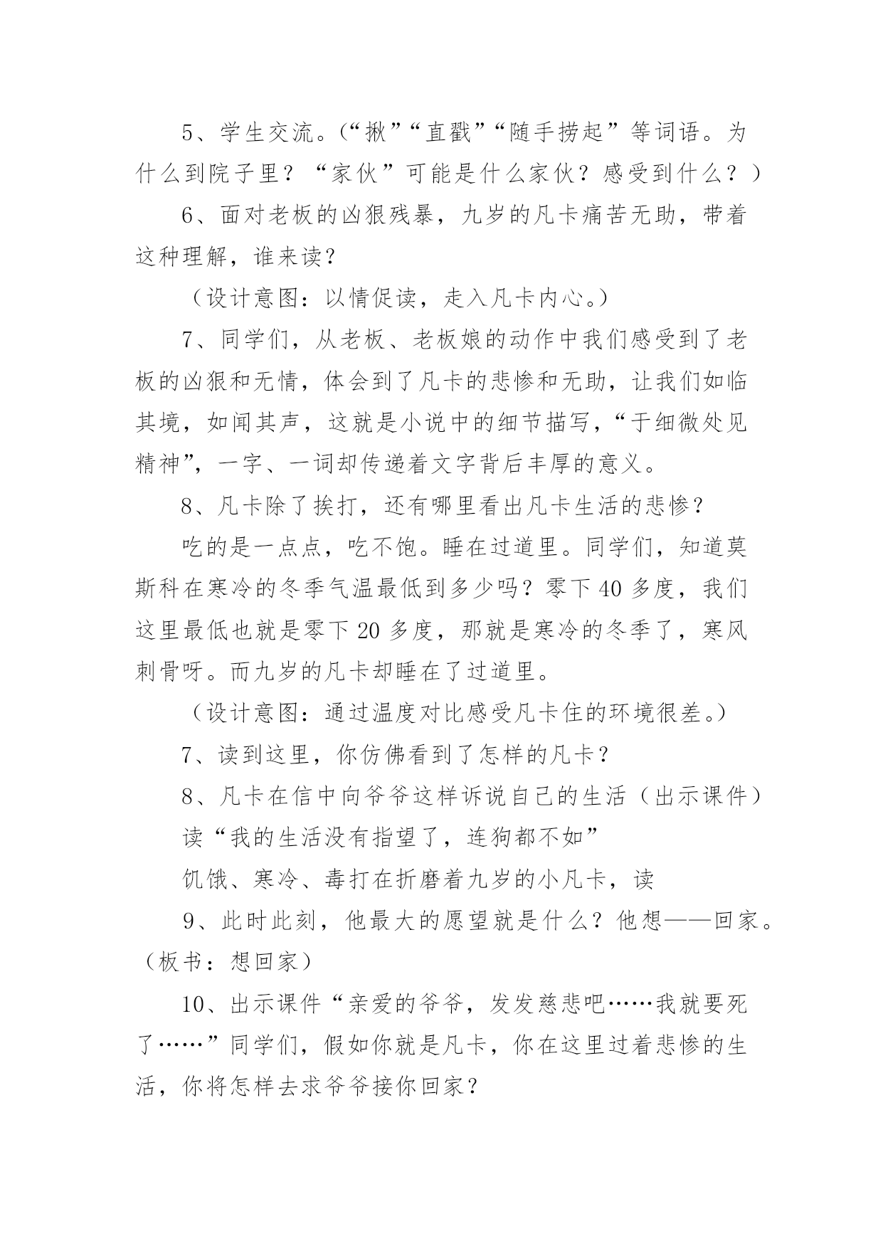 《凡卡》教学设计在教学工作者实际的教学活动中,通常需要用到教学设计来辅助教学,教学设计是把教学原理转化为教学材料和教学活动的计划。优秀的教学设计都具备一些什么特点呢?下面是小编收集整理的《凡卡》教学设计,仅供参考,大家一起来看看吧。一、知识与技能:1、通过课前有效预习,能掌握本课生字新词,理解词义,正确、流利、有感情地朗读课文。2、能找出课文中体现凡卡学徒生活悲惨的重点句段,抓住重点词语体会、感受,有感情朗读,感受凡卡的悲惨生活,激发学生同情心和对黑暗社会的憎恨。3、体会小说中细腻传神的细节描写和对比反衬的写作手法。领悟把作者叙述、信的内容和回忆插叙结合在一起的表达方法。二、过程与方法:通过自读自悟和动手标记,理清文章条理,通过有感情地朗读凡卡写信的内容以及描写他的神态、联想的段落,了解他的内心,体会文章表达的思想感情;通过精读,学习文章表达手法。三、情感态度价值观:引导学生深入理解课文,了解沙皇统治下穷苦孩子的悲惨命运,激发学生憎恨不合理的社会制度,珍惜今天幸福生活的思想感情。四、教学重难点:教学重点:有感情朗读课文,理解凡卡写信的内容,了解凡卡遭受的苦难。教学难点:理解凡卡写信过程中的联想和文章结尾的含义,领悟文章将作者叙述、信的内容和回忆插叙结合在一起的表达方法。五、学法指导指导学生着眼细节,精读细嚼,深入体味,从而较深刻地理解,受到思想感染。教学媒体:投影仪、幻灯片教学时间:1课时教学过程:一、激趣导入:同学们,今天这节课我们要了解一个“无与伦比的艺术家”。他一生创作3470多篇小说,被世人誉为“短篇小说之王”。他就是俄国文学巨匠——契诃夫。今天我们就来学习他的一篇曾经感动过一代又一代人的短篇小说《凡卡》。(设计意图:了解作者资料,激发学生学习本文的兴趣)二、直奔主题,感受悲惨1、板书课题。2、说到小说,它的一个重要任务就是塑造生动的人物形象,来感动人的心灵。(出示课件)看,这就是本课出现的几个主要人物,你能说出在课文中他们的角色吗?(指生说)(设计意图:形象直观,进入人物角色体验。)3、在课前,同学们已经预习了这篇课文,谁能用上这几个人的名字说一下这篇小说的主要内容。(设计意图:检测预习,培养学生归纳概括能力。)4、凡卡给爷爷写信,在信中,凡卡向爷爷诉说了什么?好,谁来说。(板书:学徒生活)5、同学们,凡卡在鞋匠家的学徒生活如果用一个词来形容,你会选择什么?(痛苦、悲惨、猪狗不如、艰苦)(随机板书:悲惨)6、下面,请同学们仔细读课文,看在凡卡的信中哪些地方让你感受到了凡卡学徒生活的悲惨,可以拿起手中的笔,勾划相关语句,或者写下你的理解,批注在书上空白处。(师随机巡视,个别交流。)(预设评语:同学们的读书习惯很好,有的同学划下了相关的句子,写下自己的理解,有的同学还划下了重点词语,结合重点词语理解课文是一种很好的读书方法。)以上内容源自一点通教学网儿童网站4、交流。出示幻灯片“昨天夜里……老板随手捞起个家伙就打我”自己小声读,边读边思考,在这段话中你感受到什么?(设计意图:通过这个句子感受凡卡学徒生活的痛苦,内心对凡卡产生深深地同情。)5、学生交流。(“揪”“直戳”“随手捞起”等词语。为什么到院子里?“家伙”可能是什么家伙?感受到什么?)6、面对老板的凶狠残暴,九岁的凡卡痛苦无助,带着这种理解,谁来读?(设计意图:以情促读,走入凡卡内心。)7、同学们,从老板、老板娘的动作中我们感受到了老板的凶狠和无情,体会到了凡卡的悲惨和无助,让我们如临其境,如闻其声,这就是小说中的细节描写,“于细微处见精神”,一字、一词却传递着文字背后丰厚的意义。8、凡卡除了挨打,还有哪里看出凡卡生活的悲惨?吃的是一点点,吃不饱。睡在过道里。同学们,知道莫斯科在寒冷的冬季气温最低到多少吗?零下40多度,我们这里最低也就是零下20多度,那就是寒冷的冬季了,寒风刺骨呀。而九岁的凡卡却睡在了过道里。(设计意图:通过温度对比感受凡卡住的环境很差。)7、读到这里,你仿佛看到了怎样的凡卡?8、凡卡在信中向爷爷这样诉说自己的生活(出示课件)读“我的生活没有指望了,连狗都不如”饥饿、寒冷、毒打在折磨着九岁的小凡卡,读9、此时此刻,他最大的愿望就是什么?他想——回家。(板书:想回家)10、出示课件“亲爱的爷爷,发发慈悲吧……我就要死了……”同学们,假如你就是凡卡,你在这里过着悲惨的生活,你将怎样去求爷爷接你回家?过渡:凡卡想离开“这儿”,“这儿”指的是哪里?鞋匠的家。是的,凡卡想离开鞋匠的家,想离开莫斯科。那,同学们,在凡卡眼中,繁华、热闹的大城市莫斯科究竟是怎样的一个城市呢?对这里,他一点留恋也没有吗?自己读书,从书中你读懂了什么。(学生读书之后,可以先小组交流一下。师巡视,指点)11、在繁华、热闹的莫斯科,有很多人,有很多乡下没有的东西,但这一切对凡卡而言是