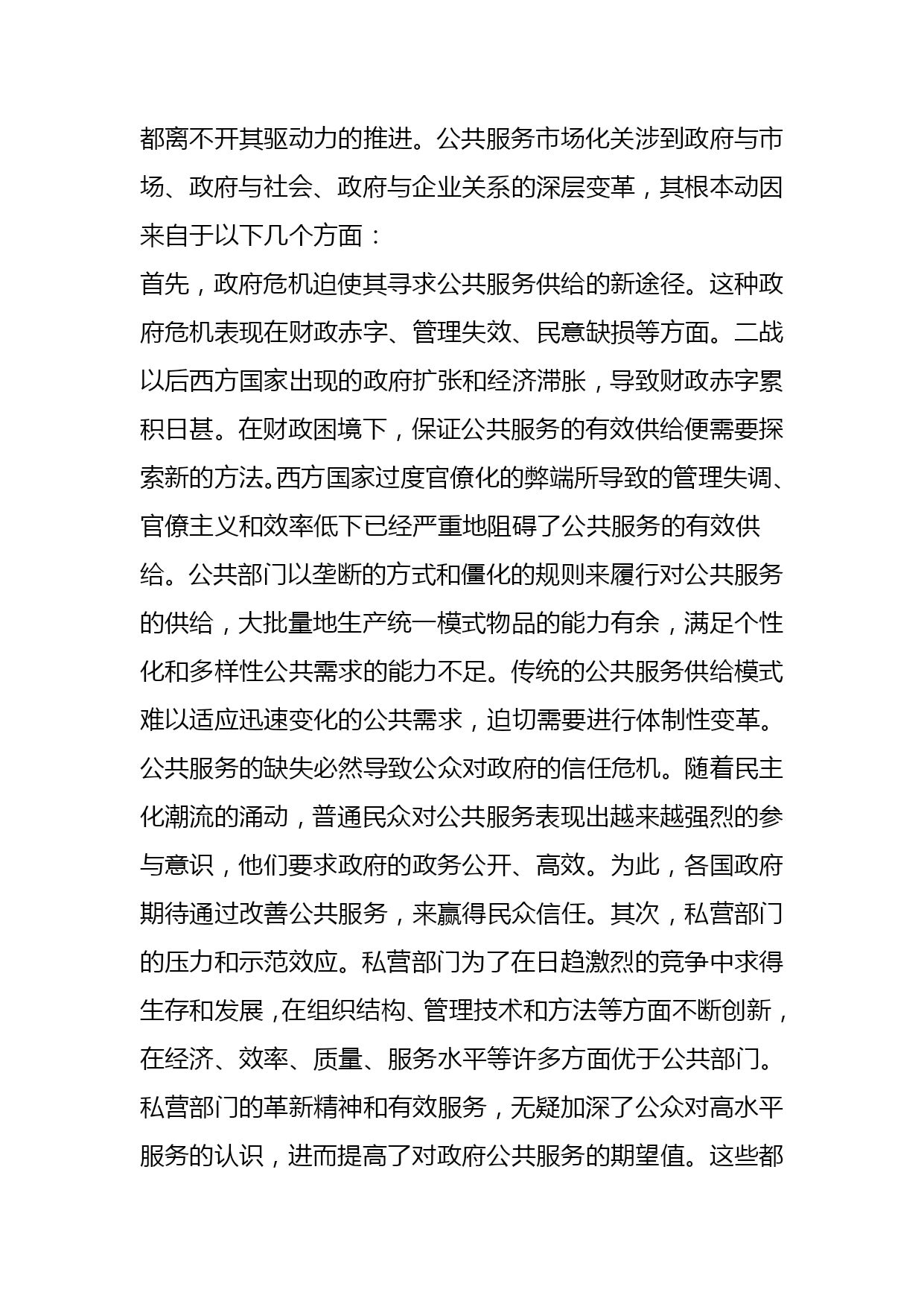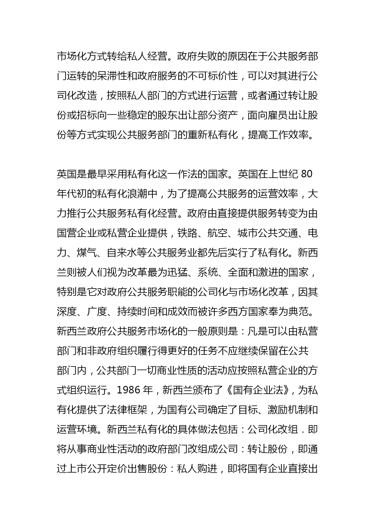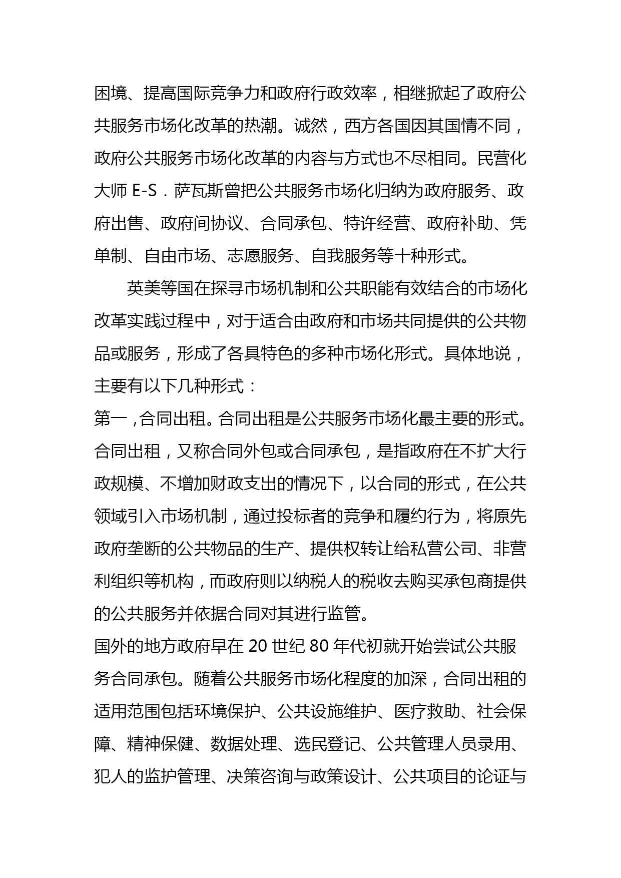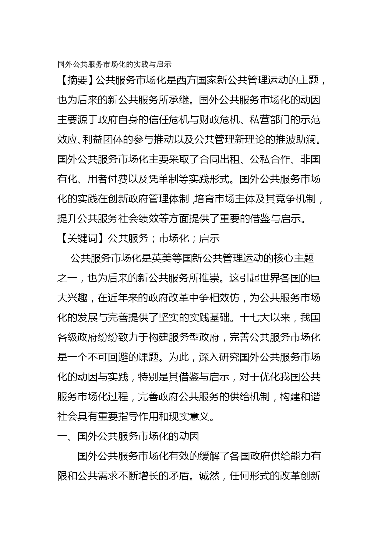 国外公共服务市场化的实践与启示(完整版)资料(可以直接使用,可编辑优秀版资料,欢迎下载)国外公共服务市场化的实践与启示【摘要】公共服务市场化是西方国家新公共管理运动的主题,也为后来的新公共服务所承继。国外公共服务市场化的动因主要源于政府自身的信任危机与财政危机、私营部门的示范效应、利益团体的参与推动以及公共管理新理论的推波助澜。国外公共服务市场化主要采取了合同出租、公私合作、非国有化、用者付费以及凭单制等实践形式。国外公共服务市场化的实践在创新政府管理体制,培育市场主体及其竞争机制,提升公共服务社会绩效等方面提供了重要的借鉴与启示。【关键词】公共服务;市场化;启示公共服务市场化是英美等国新公共管理运动的核心主题之一,也为后来的新公共服务所推崇。这引起世界各国的巨大兴趣,在近年来的政府改革中争相效仿,为公共服务市场化的发展与完善提供了坚实的实践基础。十七大以来,我国各级政府纷纷致力于构建服务型政府,完善公共服务市场化是一个不可回避的课题。为此,深入研究国外公共服务市场化的动因与实践,特别是其借鉴与启示,对于优化我国公共服务市场化过程,完善政府公共服务的供给机制,构建和谐社会具有重要指导作用和现实意义。一、国外公共服务市场化的动因国外公共服务市场化有效的缓解了各国政府供给能力有限和公共需求不断增长的矛盾。诚然,任何形式的改革创新都离不开其驱动力的推进。公共服务市场化关涉到政府与市场、政府与社会、政府与企业关系的深层变革,其根本动因来自于以下几个方面:首先,政府危机迫使其寻求公共服务供给的新途径。这种政府危机表现在财政赤字、管理失效、民意缺损等方面。二战以后西方国家出现的政府扩张和经济滞胀,导致财政赤字累积日甚。在财政困境下,保证公共服务的有效供给便需要探索新的方法。西方国家过度官僚化的弊端所导致的管理失调、官僚主义和效率低下已经严重地阻碍了公共服务的有效供给。公共部门以垄断的方式和僵化的规则来履行对公共服务的供给,大批量地生产统一模式物品的能力有余,满足个性化和多样性公共需求的能力不足。传统的公共服务供给模式难以适应迅速变化的公共需求,迫切需要进行体制性变革。公共服务的缺失必然导致公众对政府的信任危机。随着民主化潮流的涌动,普通民众对公共服务表现出越来越强烈的参与意识,他们要求政府的政务公开、高效。为此,各国政府期待通过改善公共服务,来赢得民众信任。其次,私营部门的压力和示范效应。私营部门为了在日趋激烈的竞争中求得生存和发展,在组织结构、管理技术和方法等方面不断创新,在经济、效率、质量、服务水平等许多方面优于公共部门。私营部门的革新精神和有效服务,无疑加深了公众对高水平服务的认识,进而提高了对政府公共服务的期望值。这些都为公共部门改革公共服务提供了范例和动力。再次,公共服务市场化得到各方利益团体的推动。市场化改变了公共服务的生产供给规则,其现实收益和预期收益能够同时满足制度供给者和需求者的利益要求。公共服务的市场化有利于政府开源节流,缓解财政矛盾,有效配置行政资源,最大限度地满足公共需求以提升政府的公众形象。非政府组织和私营部门可以通过市场化手段承接公共服务项目,获取适当合理的收益,实现组织的战略且标。社会公众通过市场能够得到多样化的选择机会,获得更有效的公共服务,充分满足个性化的需要。此外,公共行政理论的进展受到经济学、管理学、政治学新理论的巨大影响,为公共服务市场化提供了理论依据。例如公共选择理论主张用市场力量来改善政府的功能,提高政府效率,更多地依赖市场机制来提供公共服务;代理理论的观点直接影响到在公共服务市场化中合同的签订形式、代理人的选择以及代理人的激励等制度安排问题:交易成本理论则为选择公共服务供给的最佳方式提供了理论指导。这些理论上对市场化的推波助澜,为公共服务的改革实践提供了明确的路径导向。二、国外公共服务市场化的实践自20世纪70年代以来,英国、美国、新西兰、澳大利亚等西方国家为了适应社会经济发展的需要以及摆脱财政困境、提高国际竞争力和政府行政效率,相继掀起了政府公共服务市场化改革的热潮。诚然,西方各国因其国情不同,政府公共服务市场化改革的内容与方式也不尽相同。民营化大师E-S.萨瓦斯曾把公共服务市场化归纳为政府服务、政府出售、政府间协议、合同承包、特许经营、政府补助、凭单制、自由市场、志愿服务、自我服务等十种形式。英美等国在探寻市场机制和公共职能有效结合的市场化改革实践过程中,对于适合由政府和市场共同提供的公共物品或服务,形成了各具特色的多种市场化形式。具体地说,主要有以下几种形式:第一,合同出租。合同出租是公共服务市场化最主要的形式。合同出租,又称合同外包或合同承包,是指政府在不扩大行政规模、不增加财政支出的情况下,以合同的形式,在公共领域引入市场机制,通过投标者的竞争和履约行为,将原先政府垄断的