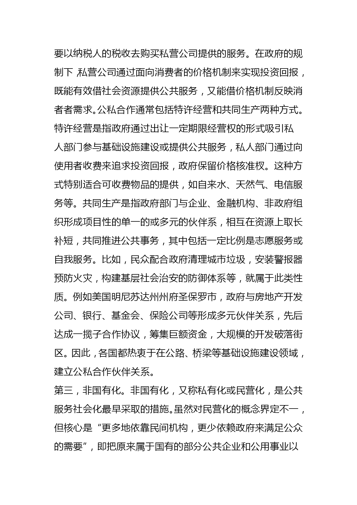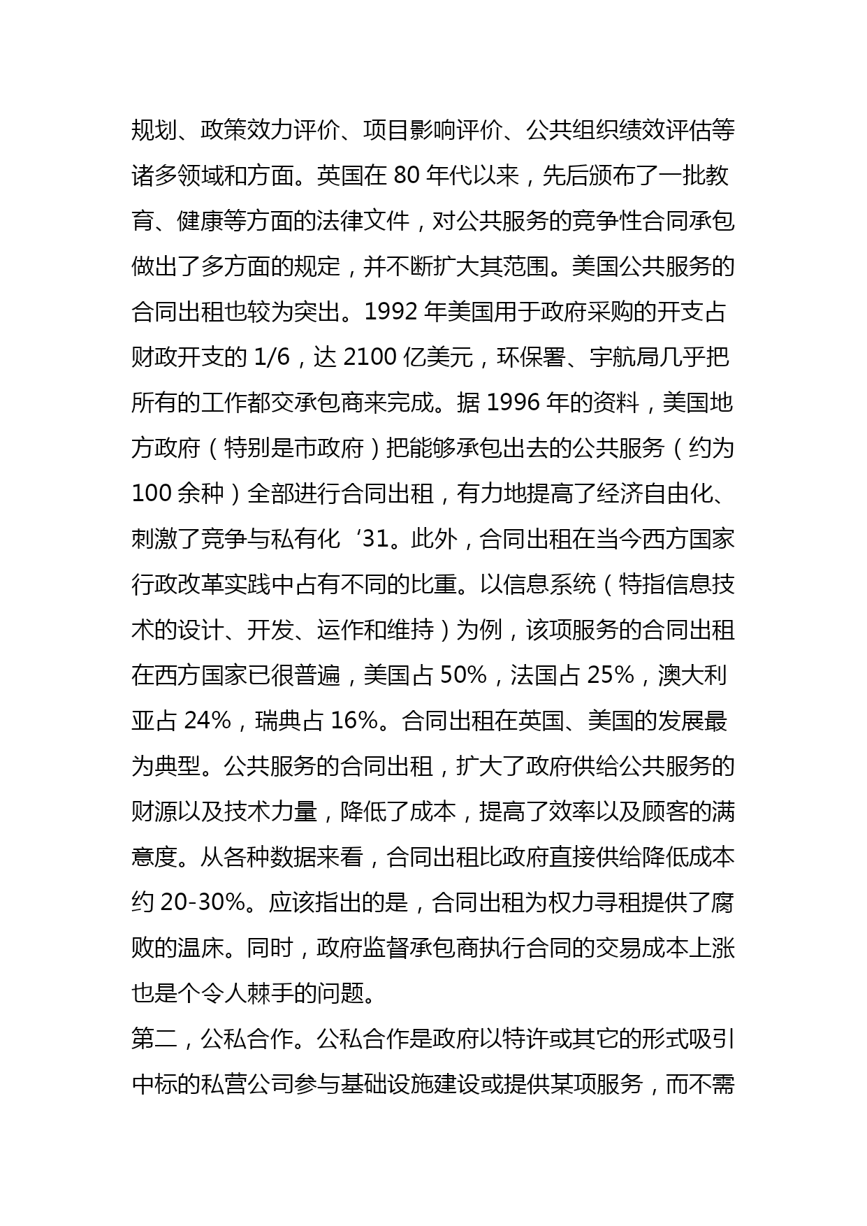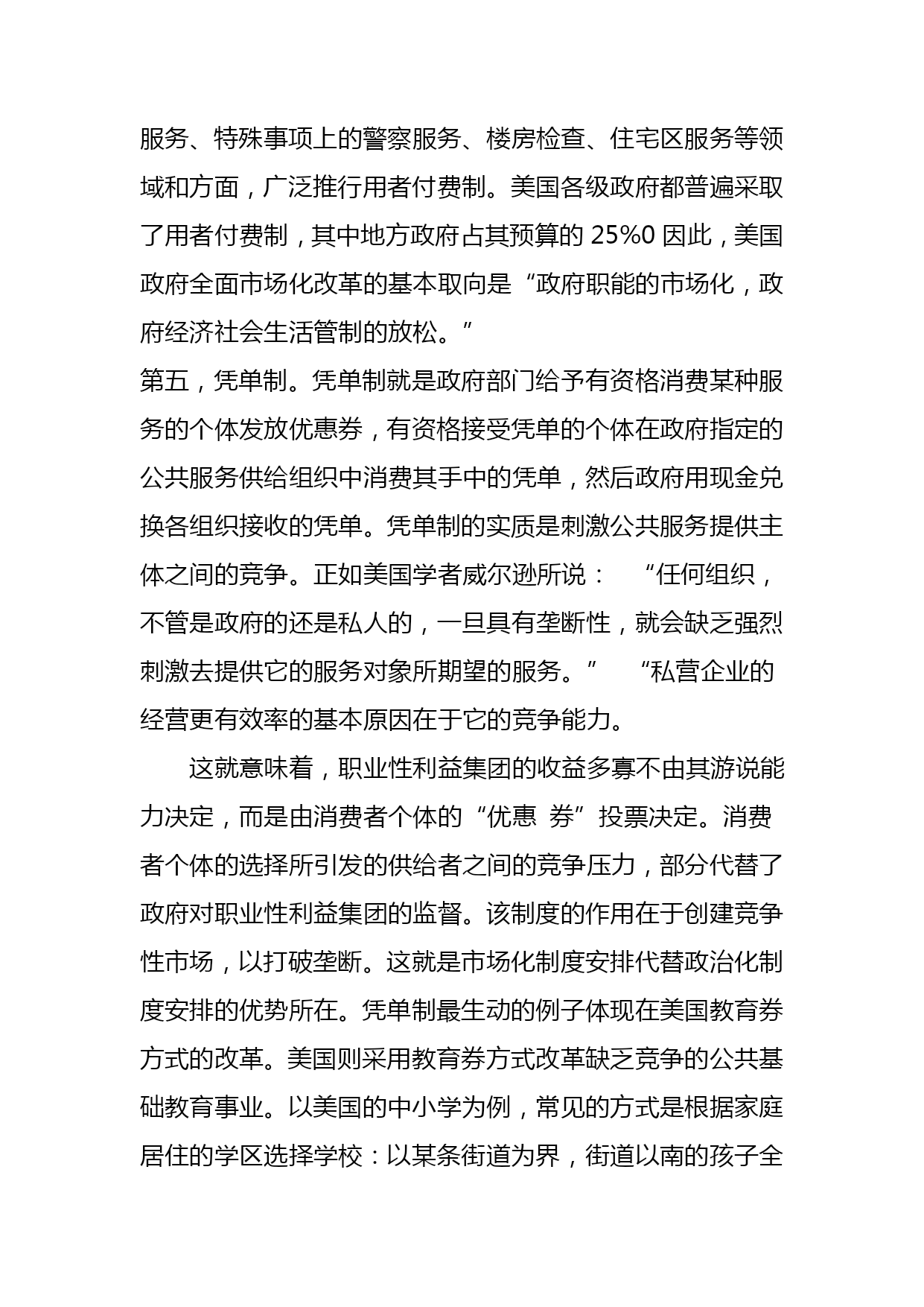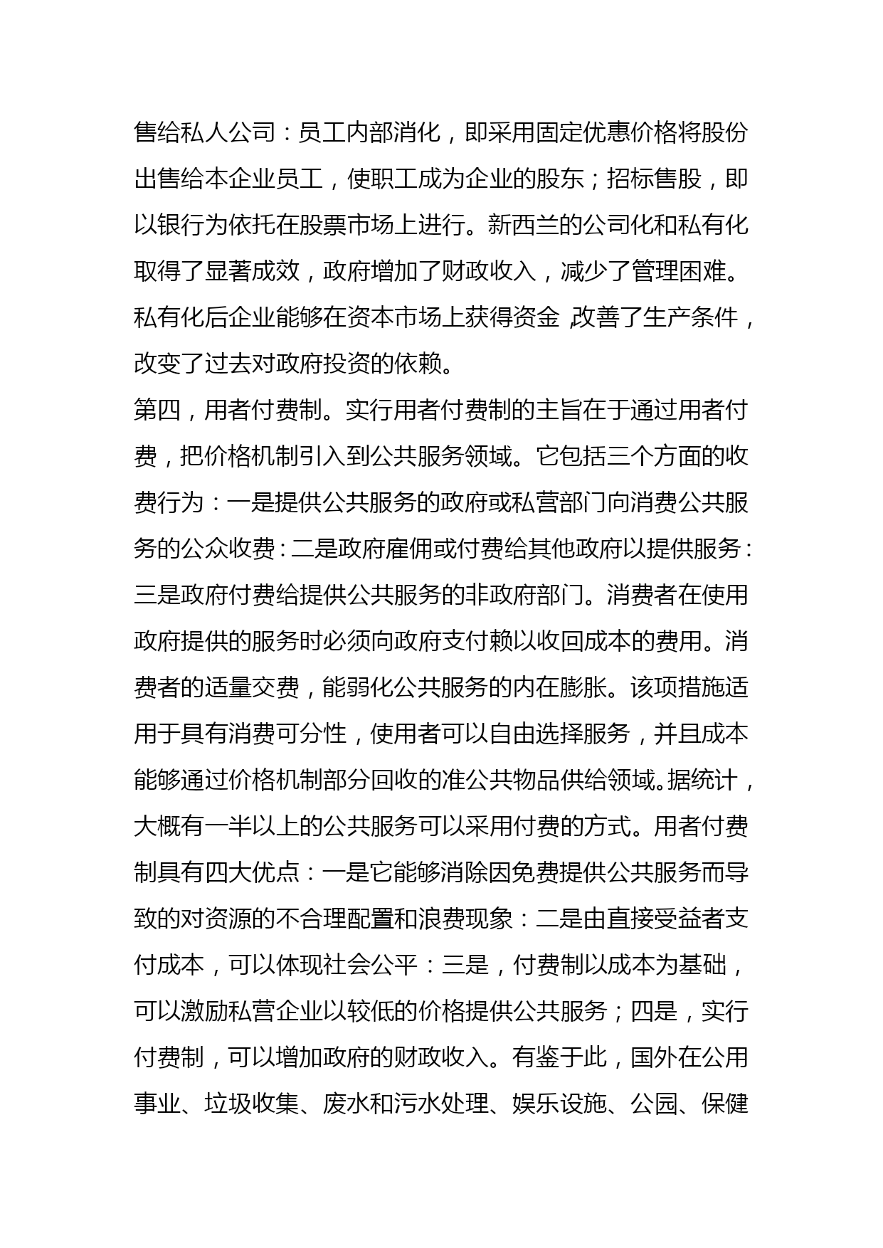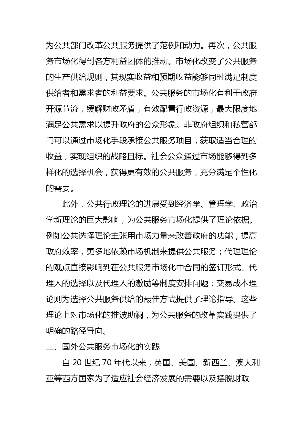 国外公共服务市场化的实践与启示(完整版)资料(可以直接使用,可编辑优秀版资料,欢迎下载)国外公共服务市场化的实践与启示【摘要】公共服务市场化是西方国家新公共管理运动的主题,也为后来的新公共服务所承继。国外公共服务市场化的动因主要源于政府自身的信任危机与财政危机、私营部门的示范效应、利益团体的参与推动以及公共管理新理论的推波助澜。国外公共服务市场化主要采取了合同出租、公私合作、非国有化、用者付费以及凭单制等实践形式。国外公共服务市场化的实践在创新政府管理体制,培育市场主体及其竞争机制,提升公共服务社会绩效等方面提供了重要的借鉴与启示。【关键词】公共服务;市场化;启示公共服务市场化是英美等国新公共管理运动的核心主题之一,也为后来的新公共服务所推崇。这引起世界各国的巨大兴趣,在近年来的政府改革中争相效仿,为公共服务市场化的发展与完善提供了坚实的实践基础。十七大以来,我国各级政府纷纷致力于构建服务型政府,完善公共服务市场化是一个不可回避的课题。为此,深入研究国外公共服务市场化的动因与实践,特别是其借鉴与启示,对于优化我国公共服务市场化过程,完善政府公共服务的供给机制,构建和谐社会具有重要指导作用和现实意义。一、国外公共服务市场化的动因国外公共服务市场化有效的缓解了各国政府供给能力有限和公共需求不断增长的矛盾。诚然,任何形式的改革创新都离不开其驱动力的推进。公共服务市场化关涉到政府与市场、政府与社会、政府与企业关系的深层变革,其根本动因来自于以下几个方面:首先,政府危机迫使其寻求公共服务供给的新途径。这种政府危机表现在财政赤字、管理失效、民意缺损等方面。二战以后西方国家出现的政府扩张和经济滞胀,导致财政赤字累积日甚。在财政困境下,保证公共服务的有效供给便需要探索新的方法。西方国家过度官僚化的弊端所导致的管理失调、官僚主义和效率低下已经严重地阻碍了公共服务的有效供给。公共部门以垄断的方式和僵化的规则来履行对公共服务的供给,大批量地生产统一模式物品的能力有余,满足个性化和多样性公共需求的能力不足。传统的公共服务供给模式难以适应迅速变化的公共需求,迫切需要进行体制性变革。公共服务的缺失必然导致公众对政府的信任危机。随着民主化潮流的涌动,普通民众对公共服务表现出越来越强烈的参与意识,他们要求政府的政务公开、高效。为此,各国政府期待通过改善公共服务,来赢得民众信任。其次,私营部门的压力和示范效应。私营部门为了在日趋激烈的竞争中求得生存和发展,在组织结构、管理技术和方法等方面不断创新,在经济、效率、质量、服务水平等许多方面优于公共部门。私营部门的革新精神和有效服务,无疑加深了公众对高水平服务的认识,进而提高了对政府公共服务的期望值。这些都为公共部门改革公共服务提供了范例和动力。再次,公共服务市场化得到各方利益团体的推动。市场化改变了公共服务的生产供给规则,其现实收益和预期收益能够同时满足制度供给者和需求者的利益要求。公共服务的市场化有利于政府开源节流,缓解财政矛盾,有效配置行政资源,最大限度地满足公共需求以提升政府的公众形象。非政府组织和私营部门可以通过市场化手段承接公共服务项目,获取适当合理的收益,实现组织的战略且标。社会公众通过市场能够得到多样化的选择机会,获得更有效的公共服务,充分满足个性化的需要。此外,公共行政理论的进展受到经济学、管理学、政治学新理论的巨大影响,为公共服务市场化提供了理论依据。例如公共选择理论主张用市场力量来改善政府的功能,提高政府效率,更多地依赖市场机制来提供公共服务;代理理论的观点直接影响到在公共服务市场化中合同的签订形式、代理人的选择以及代理人的激励等制度安排问题:交易成本理论则为选择公共服务供给的最佳方式提供了理论指导。这些理论上对市场化的推波助澜,为公共服务的改革实践提供了明确的路径导向。二、国外公共服务市场化的实践自20世纪70年代以来,英国、美国、新西兰、澳大利亚等西方国家为了适应社会经济发展的需要以及摆脱财政困境、提高国际竞争力和政府行政效率,相继掀起了政府公共服务市场化改革的热潮。诚然,西方各国因其国情不同,政府公共服务市场化改革的内容与方式也不尽相同。民营化大师E-S.萨瓦斯曾把公共服务市场化归纳为政府服务、政府出售、政府间协议、合同承包、特许经营、政府补助、凭单制、自由市场、志愿服务、自我服务等十种形式。英美等国在探寻市场机制和公共职能有效结合的市场化改革实践过程中,对于适合由政府和市场共同提供的公共物品或服务,形成了各具特色的多种市场化形式。具体地说,主要有以下几种形式:第一,合同出租。合同出租是公共服务市场化最主要的形式。合同出租,又称合同外包或合同承包,是指政府在不扩大行政规模、不增加财政支出的情况下,以合同的形式,在公共领域引入市场机制,通过投标者的竞争和履约行为,将原先政府垄断的
