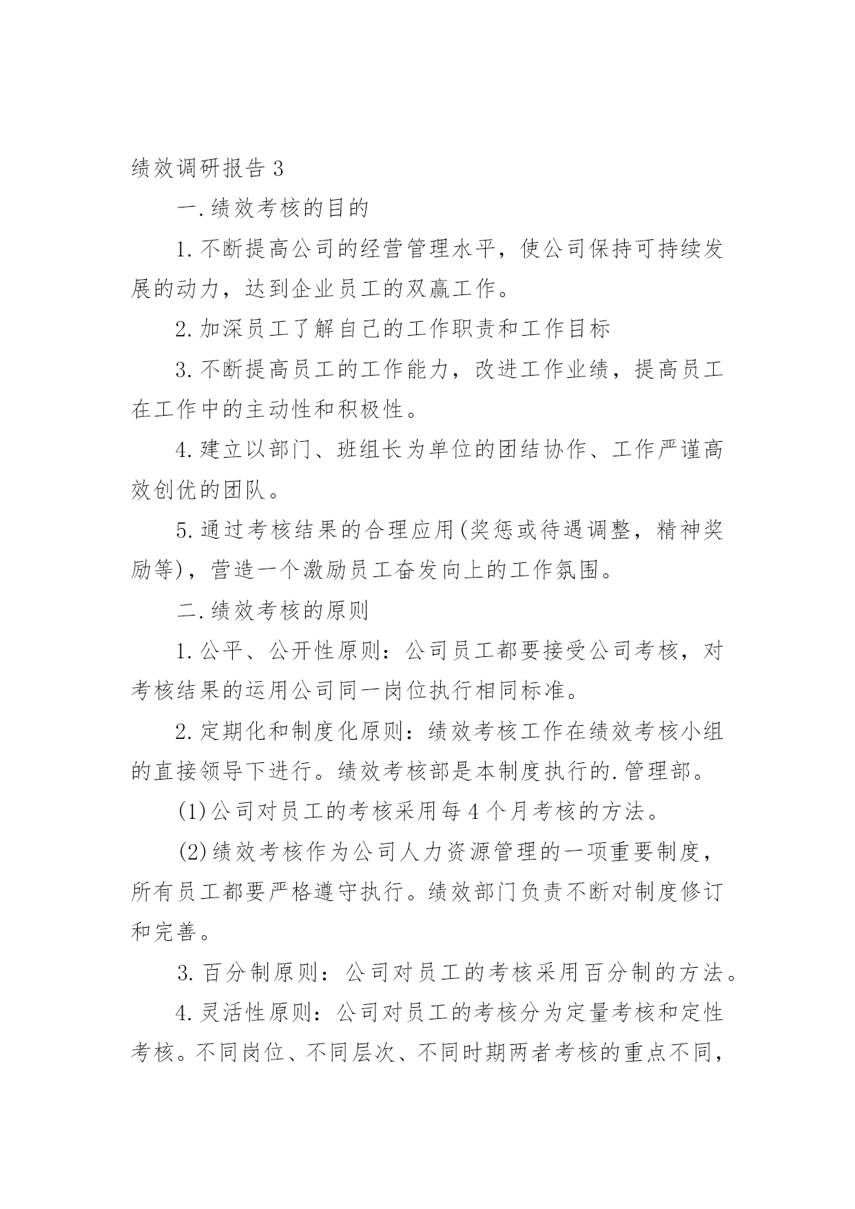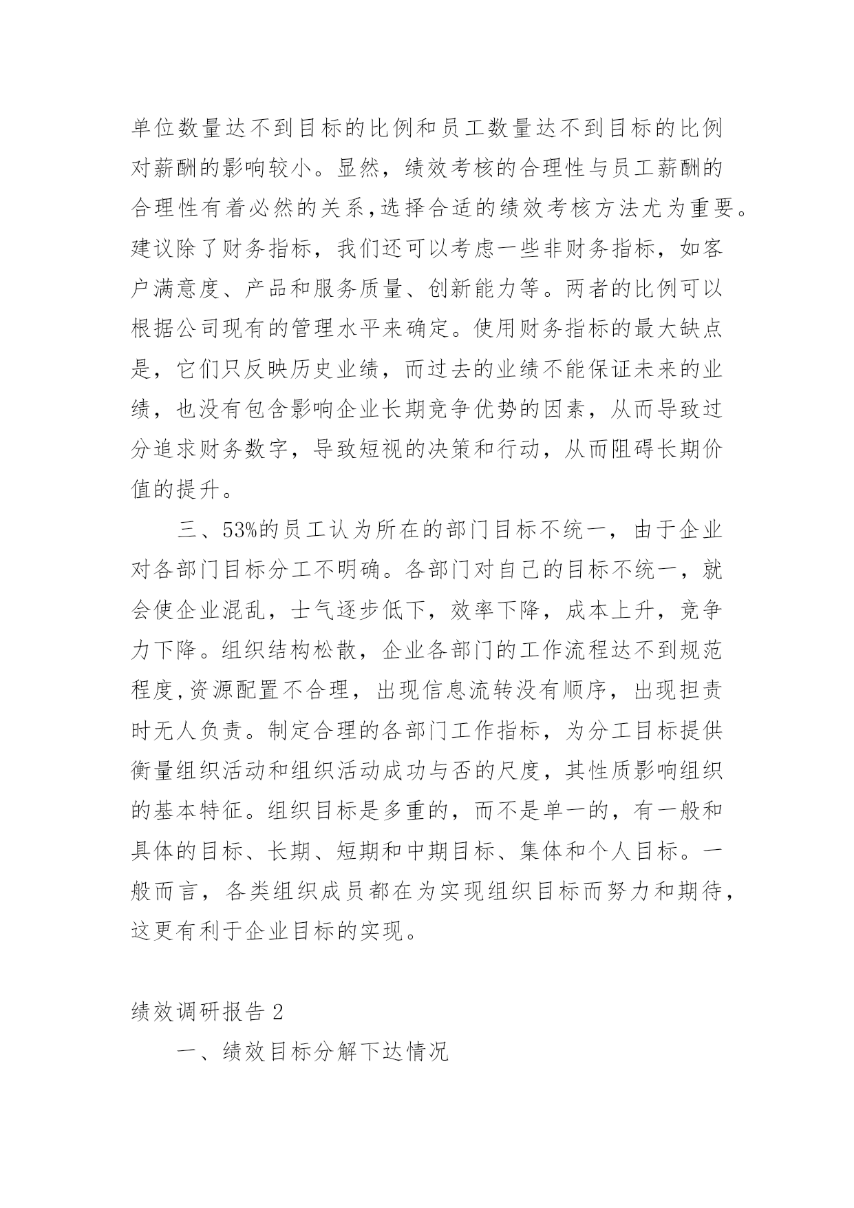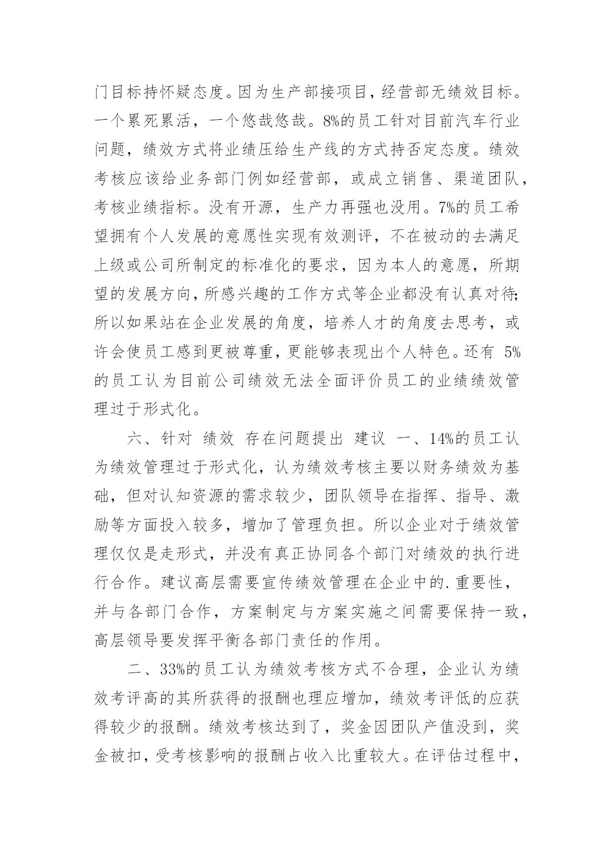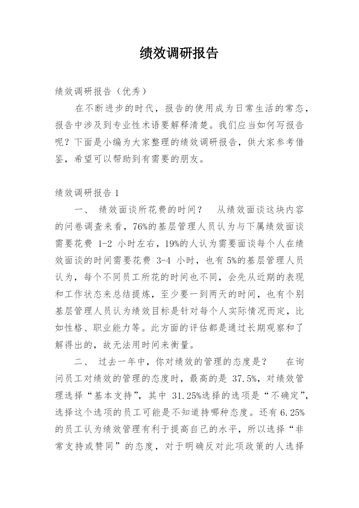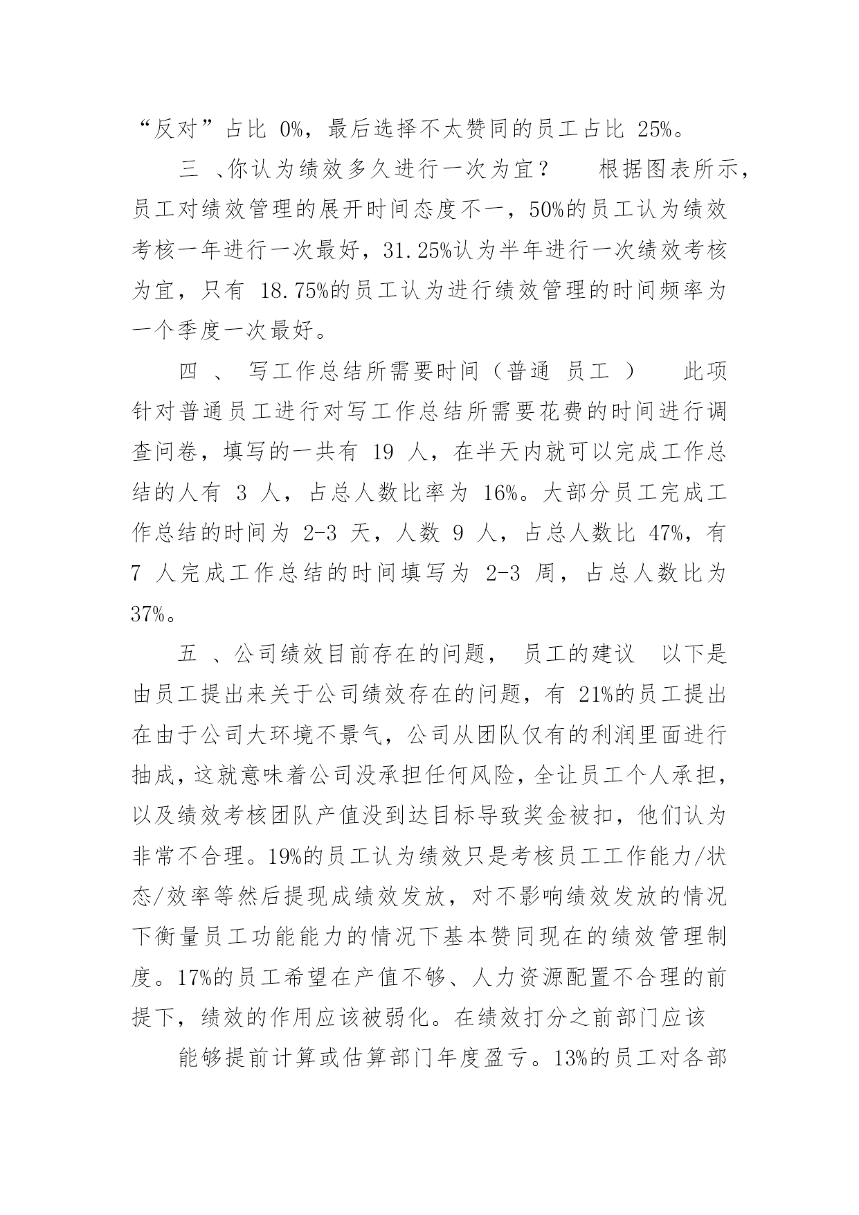 绩效调研报告绩效调研报告(优秀)在不断进步的时代,报告的使用成为日常生活的常态,报告中涉及到专业性术语要解释清楚。我们应当如何写报告呢?下面是小编为大家整理的绩效调研报告,供大家参考借鉴,希望可以帮助到有需要的朋友。绩效调研报告1一、绩效面谈所花费的时间?从绩效面谈这块内容的问卷调查来看,76%的基层管理人员认为与下属绩效面谈需要花费1-2小时左右,19%的人认为需要面谈每个人在绩效面谈的时间需要花费3-4小时,也有5%的基层管理人员认为,每个不同员工所花的时间也不同,会先从近期的表现和工作状态来总结提炼,至少要一到两天的时间,也有个别基层管理人员认为绩效目标是针对每个人实际情况而定,比如性格、职业能力等。此方面的评估都是通过长期观察和了解得出的,故无法用时间来衡量。二、过去一年中,你对绩效的管理的态度是?在询问员工对绩效的管理的态度时,最高的是37.5%,对绩效管理选择“基本支持”,其中31.25%选择的选项是“不确定”,选择这个选项的员工可能是不知道持哪种态度。还有6.25%的员工认为绩效管理有利于提高自己的水平,所以选择“非常支持或赞同”的态度,对于明确反对此项政策的人选择“反对”占比0%,最后选择不太赞同的员工占比25%。三、你认为绩效多久进行一次为宜?根据图表所示,员工对绩效管理的展开时间态度不一,50%的员工认为绩效考核一年进行一次最好,31.25%认为半年进行一次绩效考核为宜,只有18.75%的员工认为进行绩效管理的时间频率为一个季度一次最好。四、写工作总结所需要时间(普通员工)此项针对普通员工进行对写工作总结所需要花费的时间进行调查问卷,填写的一共有19人,在半天内就可以完成工作总结的人有3人,占总人数比率为16%。大部分员工完成工作总结的时间为2-3天,人数9人,占总人数比47%,有7人完成工作总结的时间填写为2-3周,占总人数比为37%。五、公司绩效目前存在的问题,员工的建议以下是由员工提出来关于公司绩效存在的问题,有21%的员工提出在由于公司大环境不景气,公司从团队仅有的利润里面进行抽成,这就意味着公司没承担任何风险,全让员工个人承担,以及绩效考核团队产值没到达目标导致奖金被扣,他们认为非常不合理。19%的员工认为绩效只是考核员工工作能力/状态/效率等然后提现成绩效发放,对不影响绩效发放的情况下衡量员工功能能力的情况下基本赞同现在的绩效管理制度。17%的员工希望在产值不够、人力资源配置不合理的前提下,绩效的作用应该被弱化。在绩效打分之前部门应该能够提前计算或估算部门年度盈亏。13%的员工对各部门目标持怀疑态度。因为生产部接项目,经营部无绩效目标。一个累死累活,一个悠哉悠哉。8%的员工针对目前汽车行业问题,绩效方式将业绩压给生产线的方式持否定态度。绩效考核应该给业务部门例如经营部,或成立销售、渠道团队,考核业绩指标。没有开源,生产力再强也没用。7%的员工希望拥有个人发展的意愿性实现有效测评,不在被动的去满足上级或公司所制定的标准化的要求,因为本人的意愿,所期望的发展方向,所感兴趣的工作方式等企业都没有认真对待;所以如果站在企业发展的角度,培养人才的角度去思考,或许会使员工感到更被尊重,更能够表现出个人特色。还有5%的员工认为目前公司绩效无法全面评价员工的业绩绩效管理过于形式化。六、针对绩效存在问题提出建议一、14%的员工认为绩效管理过于形式化,认为绩效考核主要以财务绩效为基础,但对认知资源的需求较少,团队领导在指挥、指导、激励等方面投入较多,增加了管理负担。所以企业对于绩效管理仅仅是走形式,并没有真正协同各个部门对绩效的执行进行合作。建议高层需要宣传绩效管理在企业中的.重要性,并与各部门合作,方案制定与方案实施之间需要保持一致,高层领导要发挥平衡各部门责任的作用。二、33%的员工认为绩效考核方式不合理,企业认为绩效考评高的其所获得的报酬也理应增加,绩效考评低的应获得较少的报酬。绩效考核达到了,奖金因团队产值没到,奖金被扣,受考核影响的报酬占收入比重较大。在评估过程中,单位数量达不到目标的比例和员工数量达不到目标的比例对薪酬的影响较小。显然,绩效考核的合理性与员工薪酬的合理性有着必然的关系,选择合适的绩效考核方法尤为重要。建议除了财务指标,我们还可以考虑一些非财务指标,如客户满意度、产品和服务质量、创新能力等。两者的比例可以根据公司现有的管理水平来确定。使用财务指标的最大缺点是,它们只反映历史业绩,而过去的业绩不能保证未来的业绩,也没有包含影响企业长期竞争优势的因素,从而导致过分追求财务数字,导致短视的决策和行动,从而阻碍长期价值的提升。三、53%的员工认为所在的部门目标不统一,由于企业对各部门目标分工不明确。各部门对自己的目标不统一,就会使企业混乱,士气逐步低下,效率下降,成本上升,竞争力下降。组织结构