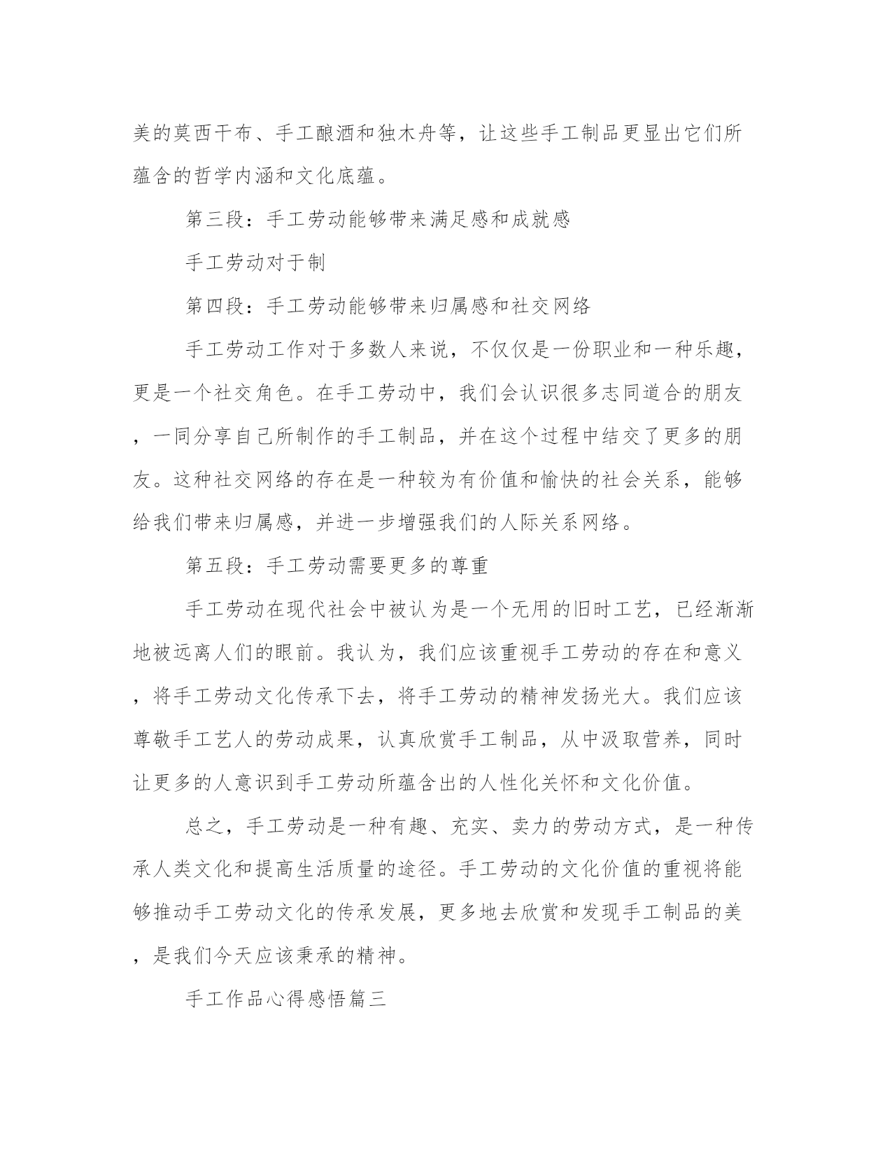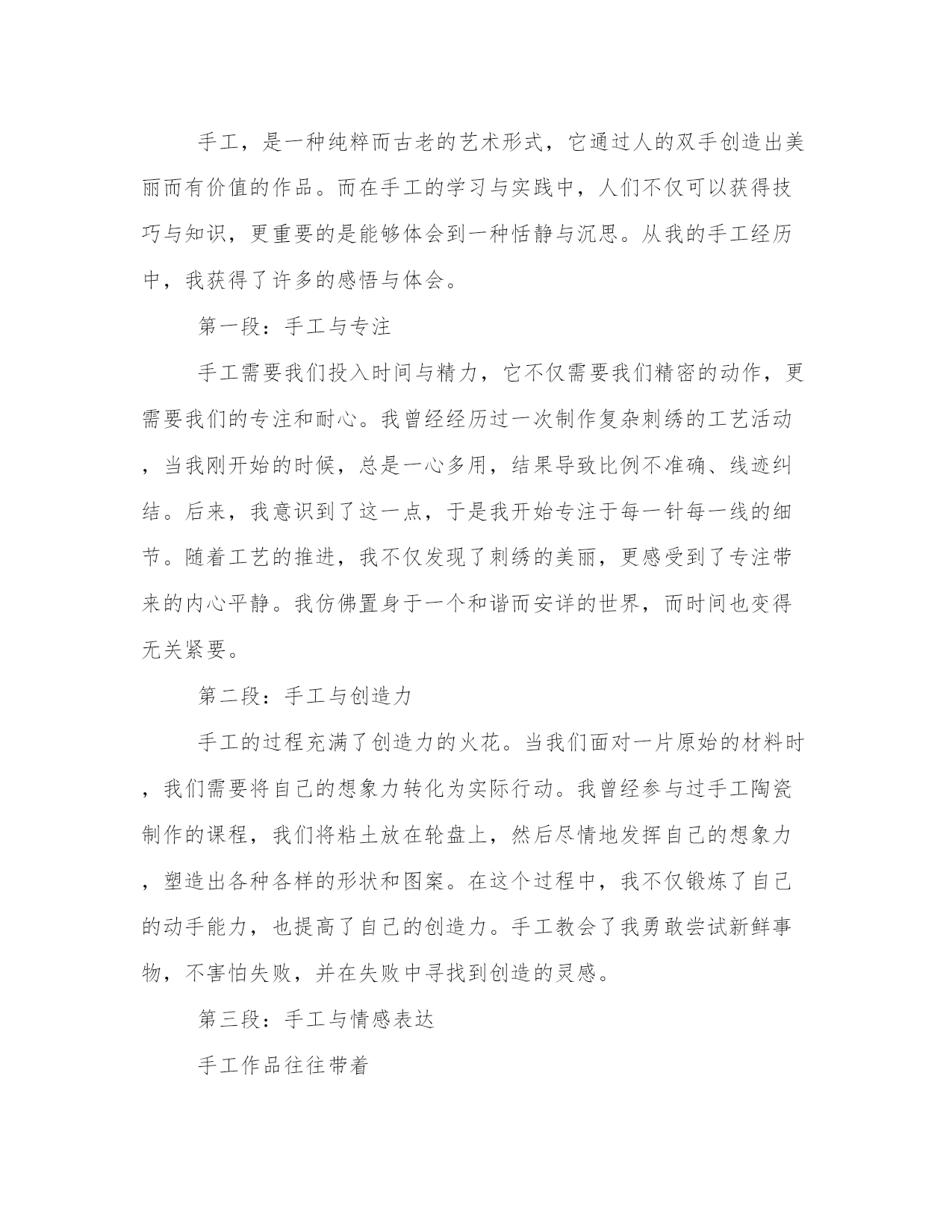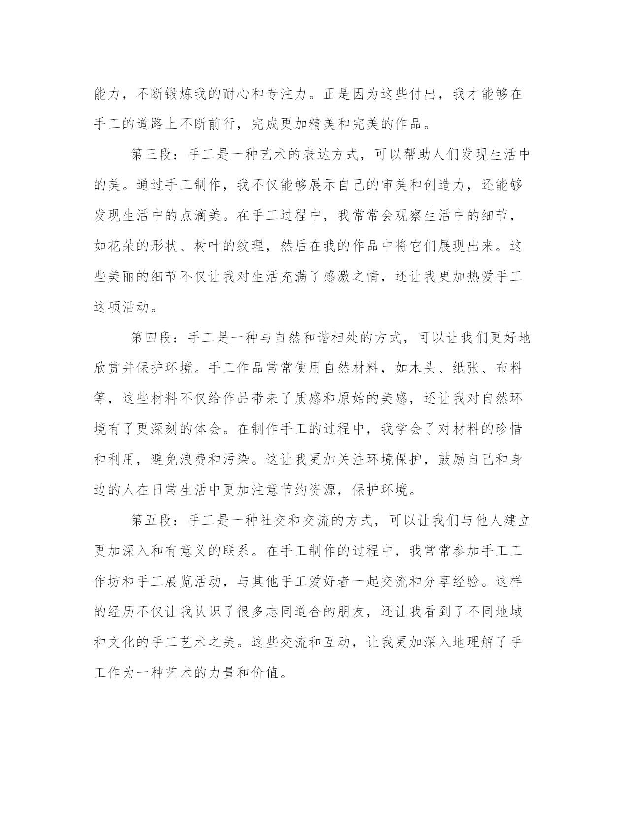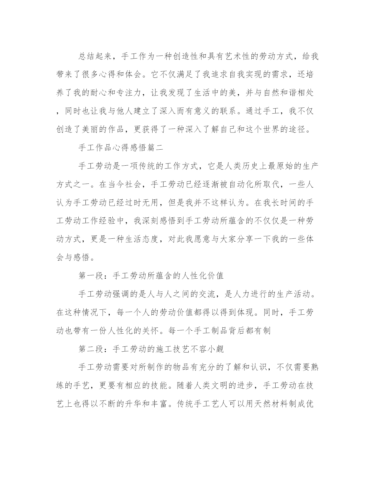 热门手工作品心得感悟(汇总16篇)感悟是一种对内心情感和认知的表达,能够使我们更加真实地理解和感受生活的美好和意义。感悟需要坚持,可以尝试将自己的感悟写下来,形成文字表达。这是一篇写给年轻人的感悟,希望能够给你一些关于人生的启示。手工作品心得感悟篇一手工是一种用手和工具进行创造性劳动的方式,它既是一种技能,也是一种艺术。手工作为人类最早的生产方式之一,在现代社会仍然存在并且受到人们的喜爱。通过手工,我不仅可以创造出美丽的作品,还可以从中获得很多感悟和体会。下面我将分享我在手工过程中所得到的心得体会。第一段:手工作为一种创造性劳动方式,能够满足人的自我实现的需求。在手工过程中,我可以根据自己的创意和想法来设计和制作作品,这让我感到非常有成就感。无论是织毛衣、编织手链还是雕刻木雕,每一次完成一个作品时,我都能够感受到自己的创造力和能力。这让我更加了解自己,也让我对自己的未来充满了期待。第二段:手工是一种耐心和细致的活动,可以培养人的耐心和专注力。在手工过程中,我常常需要反复调整和修正,而这需要我花费大量的时间和精力。在这个过程中,我学会了稍事休息、相信自己的能力,不断锻炼我的耐心和专注力。正是因为这些付出,我才能够在手工的道路上不断前行,完成更加精美和完美的作品。第三段:手工是一种艺术的表达方式,可以帮助人们发现生活中的美。通过手工制作,我不仅能够展示自己的审美和创造力,还能够发现生活中的点滴美。在手工过程中,我常常会观察生活中的细节,如花朵的形状、树叶的纹理,然后在我的作品中将它们展现出来。这些美丽的细节不仅让我对生活充满了感激之情,还让我更加热爱手工这项活动。第四段:手工是一种与自然和谐相处的方式,可以让我们更好地欣赏并保护环境。手工作品常常使用自然材料,如木头、纸张、布料等,这些材料不仅给作品带来了质感和原始的美感,还让我对自然环境有了更深刻的体会。在制作手工的过程中,我学会了对材料的珍惜和利用,避免浪费和污染。这让我更加关注环境保护,鼓励自己和身边的人在日常生活中更加注意节约资源,保护环境。第五段:手工是一种社交和交流的方式,可以让我们与他人建立更加深入和有意义的联系。在手工制作的过程中,我常常参加手工工作坊和手工展览活动,与其他手工爱好者一起交流和分享经验。这样的经历不仅让我认识了很多志同道合的朋友,还让我看到了不同地域和文化的手工艺术之美。这些交流和互动,让我更加深入地理解了手工作为一种艺术的力量和价值。总结起来,手工作为一种创造性和具有艺术性的劳动方式,给我带来了很多心得和体会。它不仅满足了我追求自我实现的需求,还培养了我的耐心和专注力,让我发现了生活中的美,并与自然和谐相处,同时也让我与他人建立了深入而有意义的联系。通过手工,我不仅创造了美丽的作品,更获得了一种深入了解自己和这个世界的途径。手工作品心得感悟篇二手工劳动是一项传统的工作方式,它是人类历史上最原始的生产方式之一。在当今社会,手工劳动已经逐渐被自动化所取代,一些人认为手工劳动已经过时无用,但是我并不这样认为。在我长时间的手工劳动工作经验中,我深刻感悟到手工劳动所蕴含的不仅仅是一种劳动方式,更是一种生活态度,对此我愿意与大家分享一下我的一些体会与感悟。第一段:手工劳动所蕴含的人性化价值手工劳动强调的是人与人之间的交流,是人力进行的生产活动。在这种情况下,每一个人的劳动价值都得以得到体现。同时,手工劳动也带有一份人性化的关怀。每一个手工制品背后都有制第二段:手工劳动的施工技艺不容小觑手工劳动需要对所制作的物品有充分的了解和认识,不仅需要熟练的手艺,更要有相应的技能。随着人类文明的进步,手工劳动在技艺上也得以不断的升华和丰富。传统手工艺人可以用天然材料制成优美的莫西干布、手工酿酒和独木舟等,让这些手工制品更显出它们所蕴含的哲学内涵和文化底蕴。第三段:手工劳动能够带来满足感和成就感手工劳动对于制第四段:手工劳动能够带来归属感和社交网络手工劳动工作对于多数人来说,不仅仅是一份职业和一种乐趣,更是一个社交角色。在手工劳动中,我们会认识很多志同道合的朋友,一同分享自己所制作的手工制品,并在这个过程中结交了更多的朋友。这种社交网络的存在是一种较为有价值和愉快的社会关系,能够给我们带来归属感,并进一步增强我们的人际关系网络。第五段:手工劳动需要更多的尊重手工劳动在现代社会中被认为是一个无用的旧时工艺,已经渐渐地被远离人们的眼前。我认为,我们应该重视手工劳动的存在和意义,将手工劳动文化传承下去,将手工劳动的精神发扬光大。我们应该尊敬手工艺人的劳动成果,认真欣赏手工制品,从中汲取营养,同时让更多的人意识到手工劳动所蕴含出的人性化关怀和文化价值。总之,手工劳动是一种有趣、充实、卖力的劳动方式,是一种传承人类文化和提高生活质量的途径。
