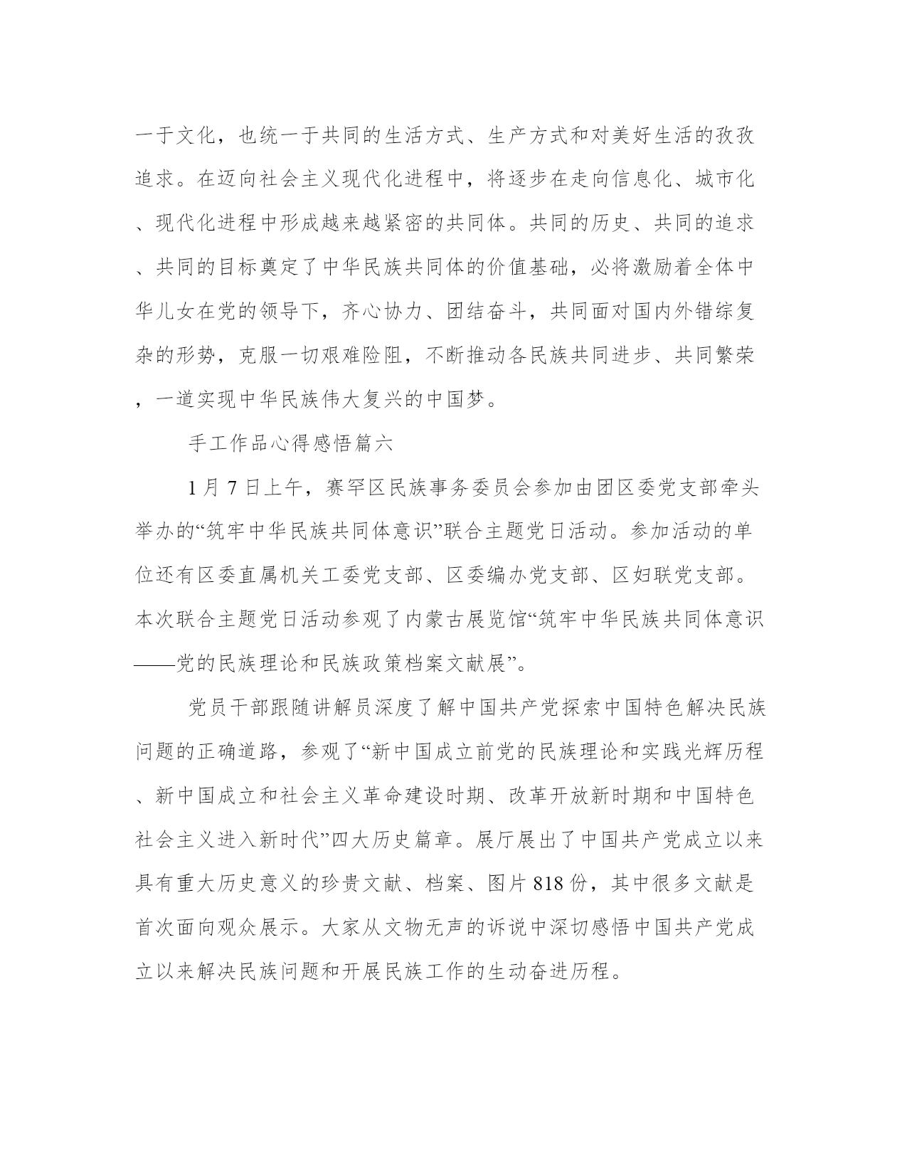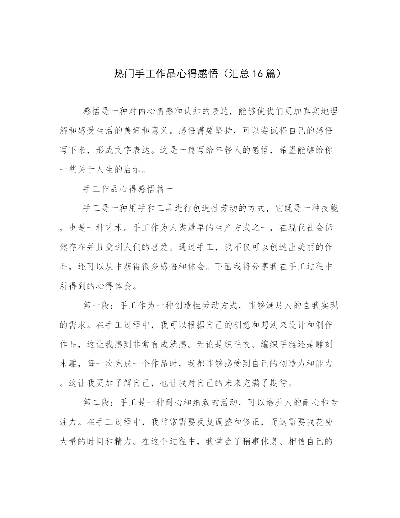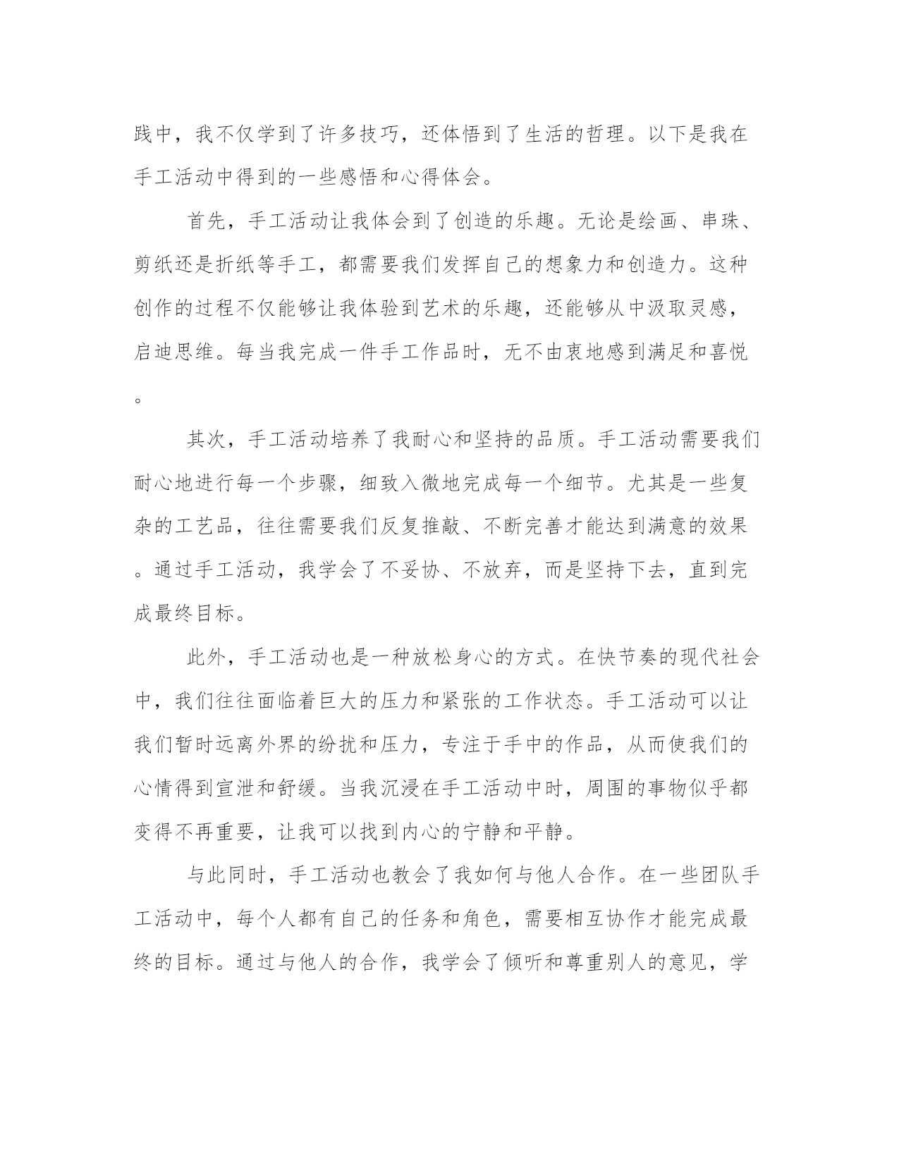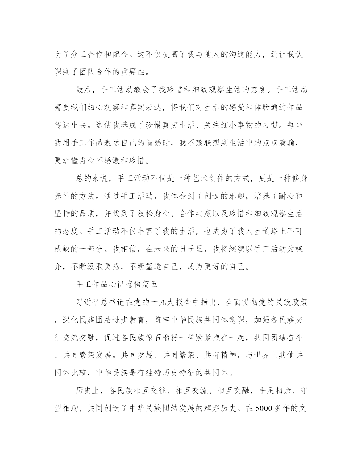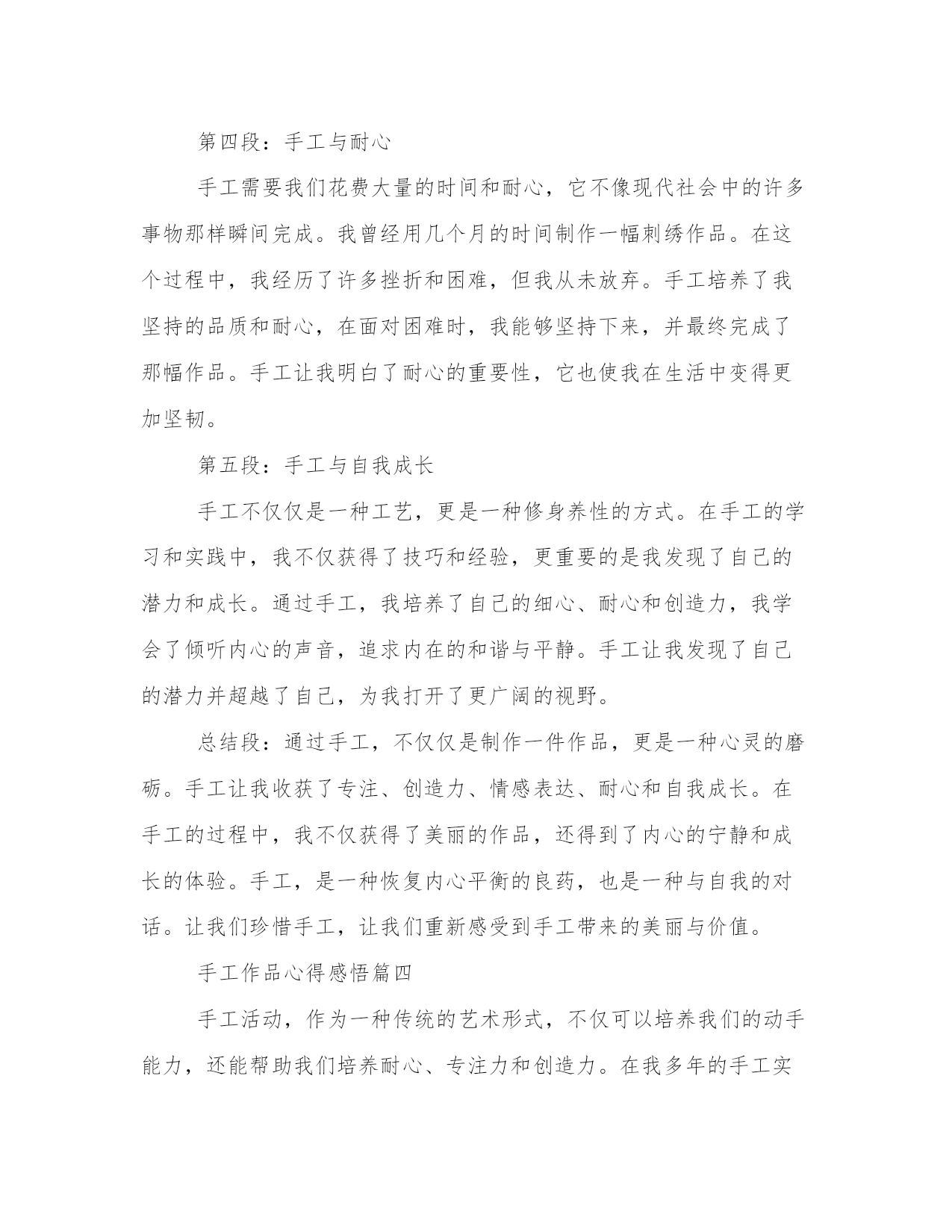 热门手工作品心得感悟(汇总16篇)感悟是一种对内心情感和认知的表达,能够使我们更加真实地理解和感受生活的美好和意义。感悟需要坚持,可以尝试将自己的感悟写下来,形成文字表达。这是一篇写给年轻人的感悟,希望能够给你一些关于人生的启示。手工作品心得感悟篇一手工是一种用手和工具进行创造性劳动的方式,它既是一种技能,也是一种艺术。手工作为人类最早的生产方式之一,在现代社会仍然存在并且受到人们的喜爱。通过手工,我不仅可以创造出美丽的作品,还可以从中获得很多感悟和体会。下面我将分享我在手工过程中所得到的心得体会。第一段:手工作为一种创造性劳动方式,能够满足人的自我实现的需求。在手工过程中,我可以根据自己的创意和想法来设计和制作作品,这让我感到非常有成就感。无论是织毛衣、编织手链还是雕刻木雕,每一次完成一个作品时,我都能够感受到自己的创造力和能力。这让我更加了解自己,也让我对自己的未来充满了期待。第二段:手工是一种耐心和细致的活动,可以培养人的耐心和专注力。在手工过程中,我常常需要反复调整和修正,而这需要我花费大量的时间和精力。在这个过程中,我学会了稍事休息、相信自己的能力,不断锻炼我的耐心和专注力。正是因为这些付出,我才能够在手工的道路上不断前行,完成更加精美和完美的作品。第三段:手工是一种艺术的表达方式,可以帮助人们发现生活中的美。通过手工制作,我不仅能够展示自己的审美和创造力,还能够发现生活中的点滴美。在手工过程中,我常常会观察生活中的细节,如花朵的形状、树叶的纹理,然后在我的作品中将它们展现出来。这些美丽的细节不仅让我对生活充满了感激之情,还让我更加热爱手工这项活动。第四段:手工是一种与自然和谐相处的方式,可以让我们更好地欣赏并保护环境。手工作品常常使用自然材料,如木头、纸张、布料等,这些材料不仅给作品带来了质感和原始的美感,还让我对自然环境有了更深刻的体会。在制作手工的过程中,我学会了对材料的珍惜和利用,避免浪费和污染。这让我更加关注环境保护,鼓励自己和身边的人在日常生活中更加注意节约资源,保护环境。第五段:手工是一种社交和交流的方式,可以让我们与他人建立更加深入和有意义的联系。在手工制作的过程中,我常常参加手工工作坊和手工展览活动,与其他手工爱好者一起交流和分享经验。这样的经历不仅让我认识了很多志同道合的朋友,还让我看到了不同地域和文化的手工艺术之美。这些交流和互动,让我更加深入地理解了手工作为一种艺术的力量和价值。总结起来,手工作为一种创造性和具有艺术性的劳动方式,给我带来了很多心得和体会。它不仅满足了我追求自我实现的需求,还培养了我的耐心和专注力,让我发现了生活中的美,并与自然和谐相处,同时也让我与他人建立了深入而有意义的联系。通过手工,我不仅创造了美丽的作品,更获得了一种深入了解自己和这个世界的途径。手工作品心得感悟篇二手工劳动是一项传统的工作方式,它是人类历史上最原始的生产方式之一。在当今社会,手工劳动已经逐渐被自动化所取代,一些人认为手工劳动已经过时无用,但是我并不这样认为。在我长时间的手工劳动工作经验中,我深刻感悟到手工劳动所蕴含的不仅仅是一种劳动方式,更是一种生活态度,对此我愿意与大家分享一下我的一些体会与感悟。第一段:手工劳动所蕴含的人性化价值手工劳动强调的是人与人之间的交流,是人力进行的生产活动。在这种情况下,每一个人的劳动价值都得以得到体现。同时,手工劳动也带有一份人性化的关怀。每一个手工制品背后都有制第二段:手工劳动的施工技艺不容小觑手工劳动需要对所制作的物品有充分的了解和认识,不仅需要熟练的手艺,更要有相应的技能。随着人类文明的进步,手工劳动在技艺上也得以不断的升华和丰富。传统手工艺人可以用天然材料制成优美的莫西干布、手工酿酒和独木舟等,让这些手工制品更显出它们所蕴含的哲学内涵和文化底蕴。第三段:手工劳动能够带来满足感和成就感手工劳动对于制第四段:手工劳动能够带来归属感和社交网络手工劳动工作对于多数人来说,不仅仅是一份职业和一种乐趣,更是一个社交角色。在手工劳动中,我们会认识很多志同道合的朋友,一同分享自己所制作的手工制品,并在这个过程中结交了更多的朋友。这种社交网络的存在是一种较为有价值和愉快的社会关系,能够给我们带来归属感,并进一步增强我们的人际关系网络。第五段:手工劳动需要更多的尊重手工劳动在现代社会中被认为是一个无用的旧时工艺,已经渐渐地被远离人们的眼前。我认为,我们应该重视手工劳动的存在和意义,将手工劳动文化传承下去,将手工劳动的精神发扬光大。我们应该尊敬手工艺人的劳动成果,认真欣赏手工制品,从中汲取营养,同时让更多的人意识到手工劳动所蕴含出的人性化关怀和文化价值。总之,手工劳动是一种有趣、充实、卖力的劳动方式,是一种传承人类文化和提高生活质量的途径。