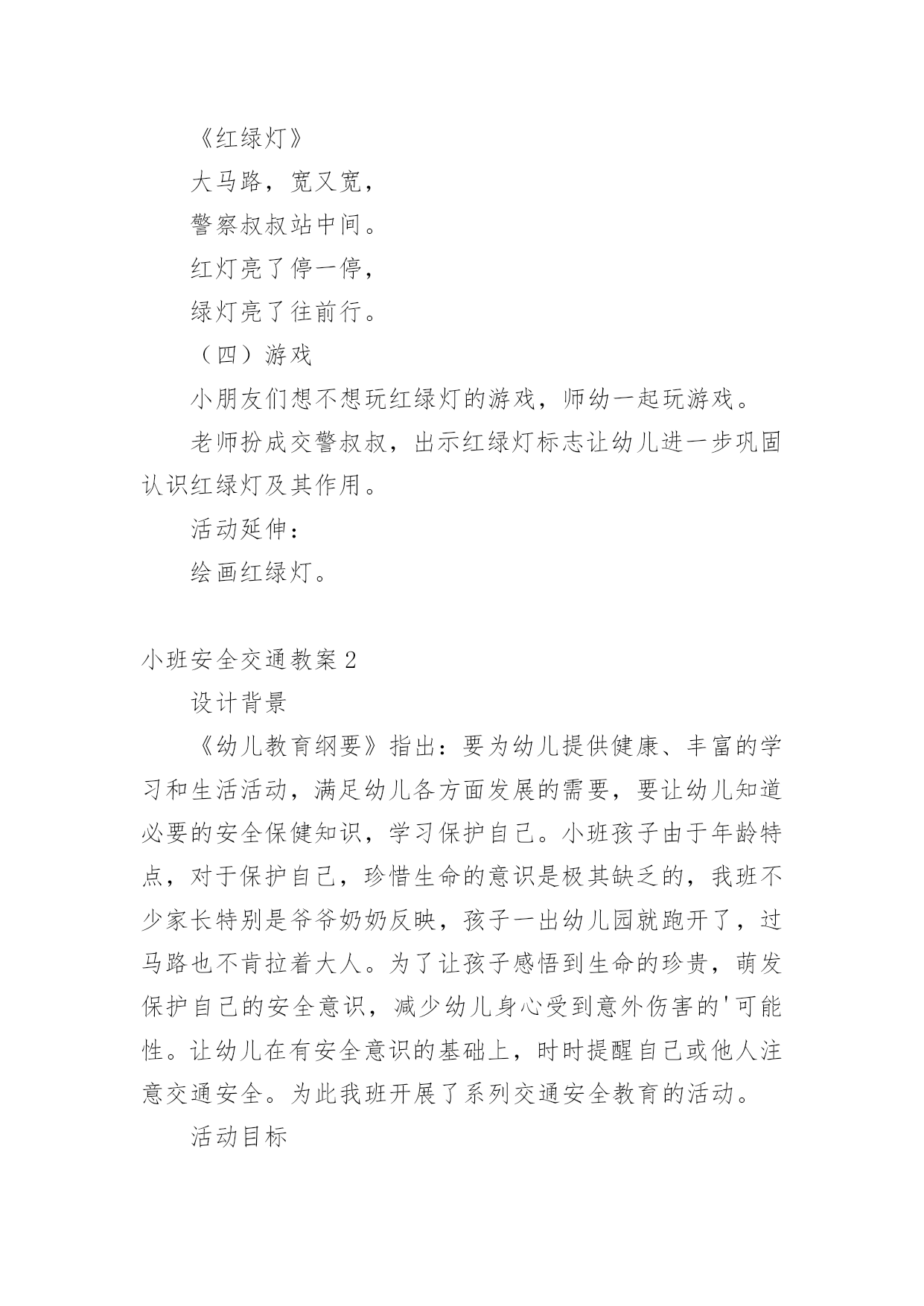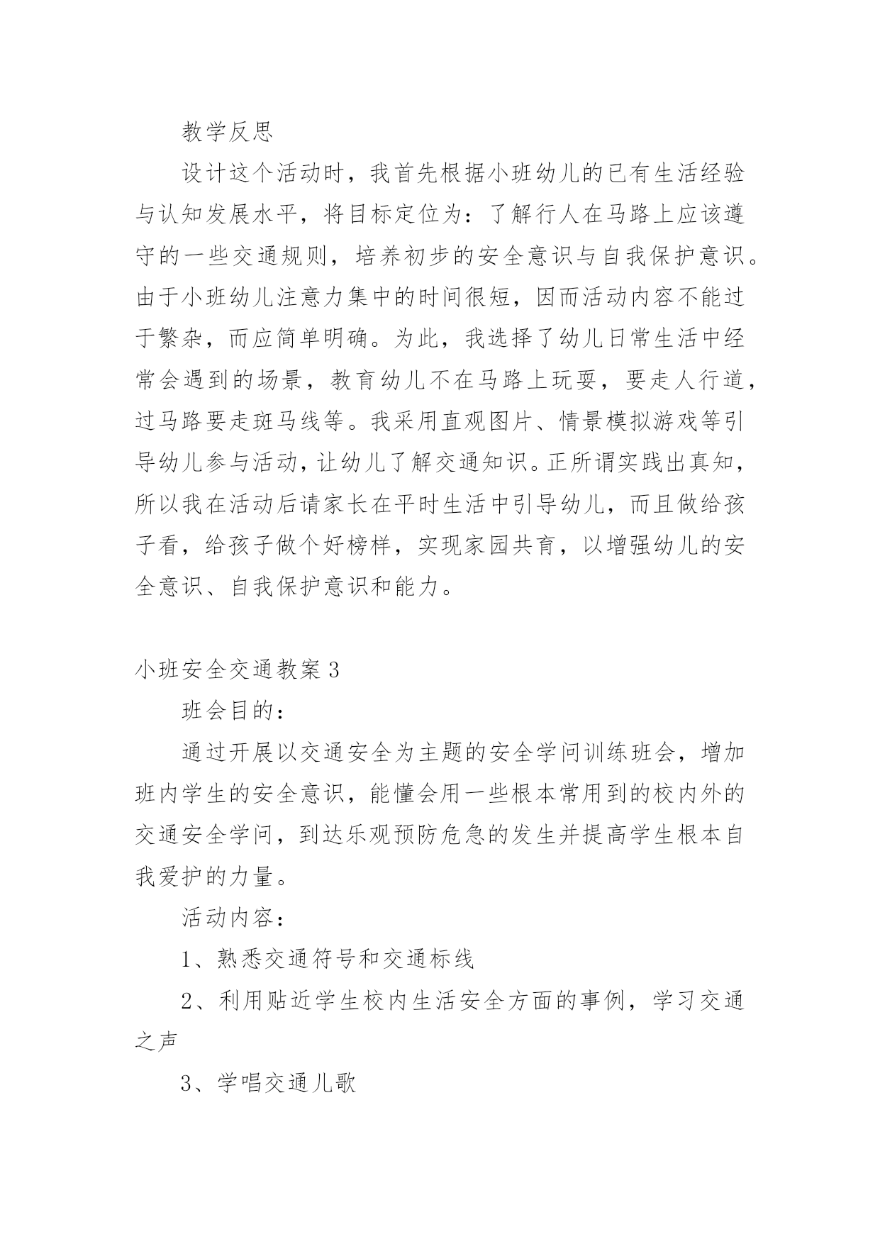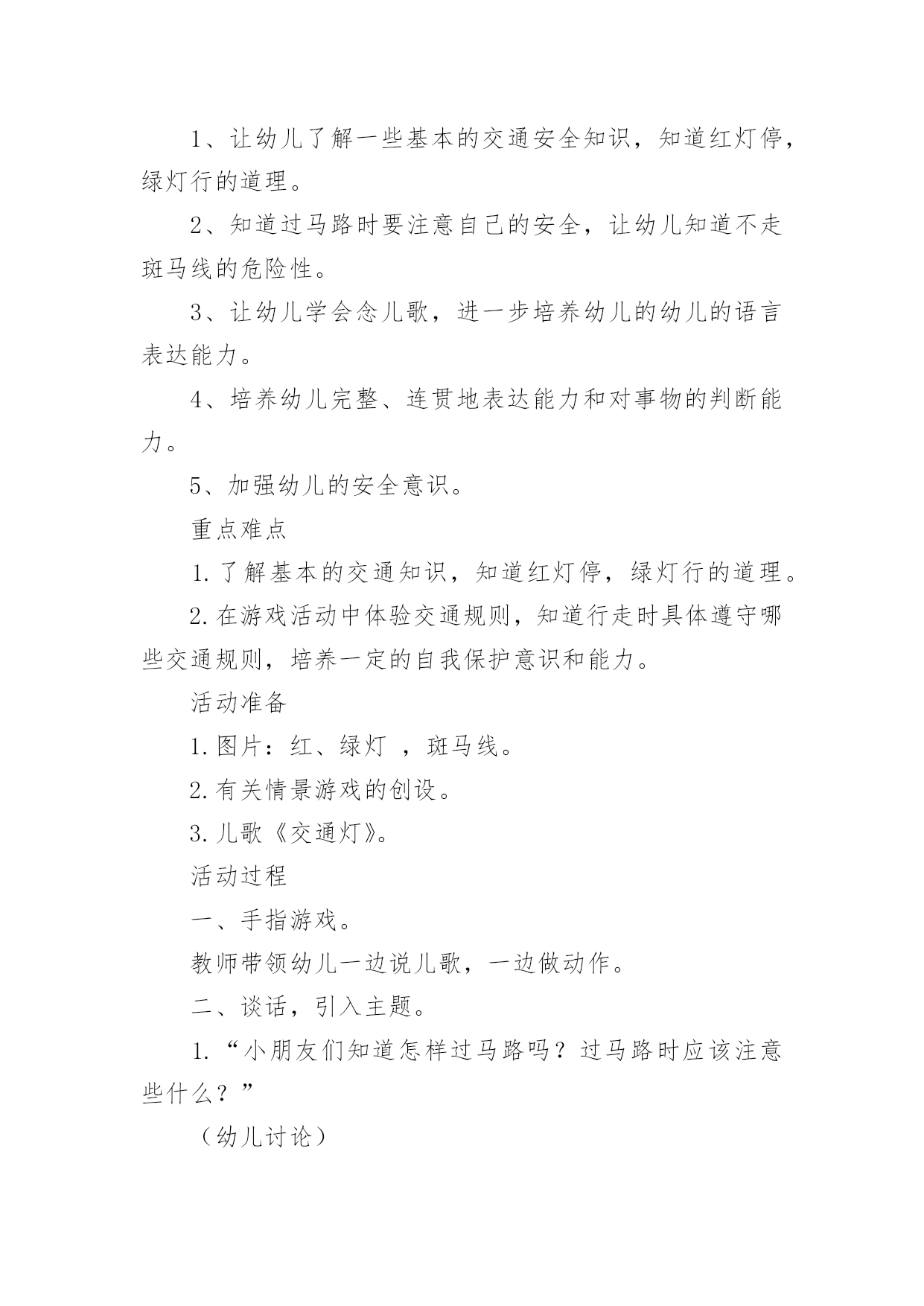 小班安全交通教案在教学工作者开展教学活动前,常常要根据教学需要编写教案,教案是教材及大纲与课堂教学的纽带和桥梁。怎样写教案才更能起到其作用呢?下面是小编为大家整理的小班安全交通教案,欢迎阅读与收藏。小班安全交通教案1活动目标:1、注意安全,初步培养幼儿的自我保护意识。2、能认识简单的`交通标记并了解安全通过马路应遵守的交通规则。活动准备:挂图四幅,红绿灯标牌各一个。视频资料活动过程:(一)导入:幼儿观看视频,引起幼儿注意。提问:发生了什么事?怎么发生的?(二)认识交通标志。1、出示挂图认识简单的交通标志:人行横道线、信号灯、停车线等。2、通过游戏《猜猜看》,来巩固对交通标志的认识。3、提问:如何过马路?安全过马路有什么好处?培养幼儿的自我保护意识。(三)学说儿歌《红绿灯》大马路,宽又宽,警察叔叔站中间。红灯亮了停一停,绿灯亮了往前行。(四)游戏小朋友们想不想玩红绿灯的游戏,师幼一起玩游戏。老师扮成交警叔叔,出示红绿灯标志让幼儿进一步巩固认识红绿灯及其作用。活动延伸:绘画红绿灯。小班安全交通教案2设计背景《幼儿教育纲要》指出:要为幼儿提供健康、丰富的学习和生活活动,满足幼儿各方面发展的需要,要让幼儿知道必要的安全保健知识,学习保护自己。小班孩子由于年龄特点,对于保护自己,珍惜生命的意识是极其缺乏的,我班不少家长特别是爷爷奶奶反映,孩子一出幼儿园就跑开了,过马路也不肯拉着大人。为了让孩子感悟到生命的珍贵,萌发保护自己的安全意识,减少幼儿身心受到意外伤害的'可能性。让幼儿在有安全意识的基础上,时时提醒自己或他人注意交通安全。为此我班开展了系列交通安全教育的活动。活动目标1、让幼儿了解一些基本的交通安全知识,知道红灯停,绿灯行的道理。2、知道过马路时要注意自己的安全,让幼儿知道不走斑马线的危险性。3、让幼儿学会念儿歌,进一步培养幼儿的幼儿的语言表达能力。4、培养幼儿完整、连贯地表达能力和对事物的判断能力。5、加强幼儿的安全意识。重点难点1.了解基本的交通知识,知道红灯停,绿灯行的道理。2.在游戏活动中体验交通规则,知道行走时具体遵守哪些交通规则,培养一定的自我保护意识和能力。活动准备1.图片:红、绿灯,斑马线。2.有关情景游戏的创设。3.儿歌《交通灯》。活动过程一、手指游戏。教师带领幼儿一边说儿歌,一边做动作。二、谈话,引入主题。1.“小朋友们知道怎样过马路吗?过马路时应该注意些什么?”(幼儿讨论)教师小结:在马路上我们要右侧通行,跟大人一起时要让大人握着手走,不能乱跑。当我们要过马路时,一定要左右看看,没有车辆经过时我们才能穿过马路。2.出示图片,引导幼儿认识红、绿灯,斑马线。3、讲解交通规则。4、幼儿跟教师学说儿歌“人行道上右侧行,红灯停(出示图片红灯),绿灯行(出示图片绿灯),过马路要走斑马线。”三、游戏体验《过马路》。(1)带领幼儿一边走一边根据场景提问,巩固对交通规则的认识。场景一:人行道和车行道师:前面有两种道路,行人应该走哪一种路?(人行道。)师:行人应该注意什么?(靠右边走,不能边走边玩,特别是不能到车行道上玩。)场景二:十字路口师:要过马路了,我们应该怎么走?(找到斑马线,看清红绿灯,红灯停,绿灯行。)四、延伸活动:行人走在马路上还应该注意什么?五、活动结束小朋友们真聪明,我们顺利的通过马路了,一起跟红绿灯说再见吧!教学反思设计这个活动时,我首先根据小班幼儿的已有生活经验与认知发展水平,将目标定位为:了解行人在马路上应该遵守的一些交通规则,培养初步的安全意识与自我保护意识。由于小班幼儿注意力集中的时间很短,因而活动内容不能过于繁杂,而应简单明确。为此,我选择了幼儿日常生活中经常会遇到的场景,教育幼儿不在马路上玩耍,要走人行道,过马路要走斑马线等。我采用直观图片、情景模拟游戏等引导幼儿参与活动,让幼儿了解交通知识。正所谓实践出真知,所以我在活动后请家长在平时生活中引导幼儿,而且做给孩子看,给孩子做个好榜样,实现家园共育,以增强幼儿的安全意识、自我保护意识和能力。小班安全交通教案3班会目的:通过开展以交通安全为主题的安全学问训练班会,增加班内学生的安全意识,能懂会用一些根本常用到的校内外的交通安全学问,到达乐观预防危急的发生并提高学生根本自我爱护的力量。活动内容:1、熟悉交通符号和交通标线2、利用贴近学生校内生活安全方面的事例,学习交通之声3、学唱交通儿歌活动预备:1、收集适合学生特点的`一些安全标志图片并打印局部图片。2、改编贴近学生实际的《安全歌》,收集有关交通的之声。四、活动过程师生问好并组织活动纪律,让班内学生明确本节班会的主题,让学生在生活中懂得珍惜爱惜自己珍贵的生命,始终把安全放在第一位。接下来师引领学生回忆稳固五一前夕了解过的一些关于安全标志的图片,师问生答。熟悉横穿公路应当留意些什么?横穿公路横穿公路