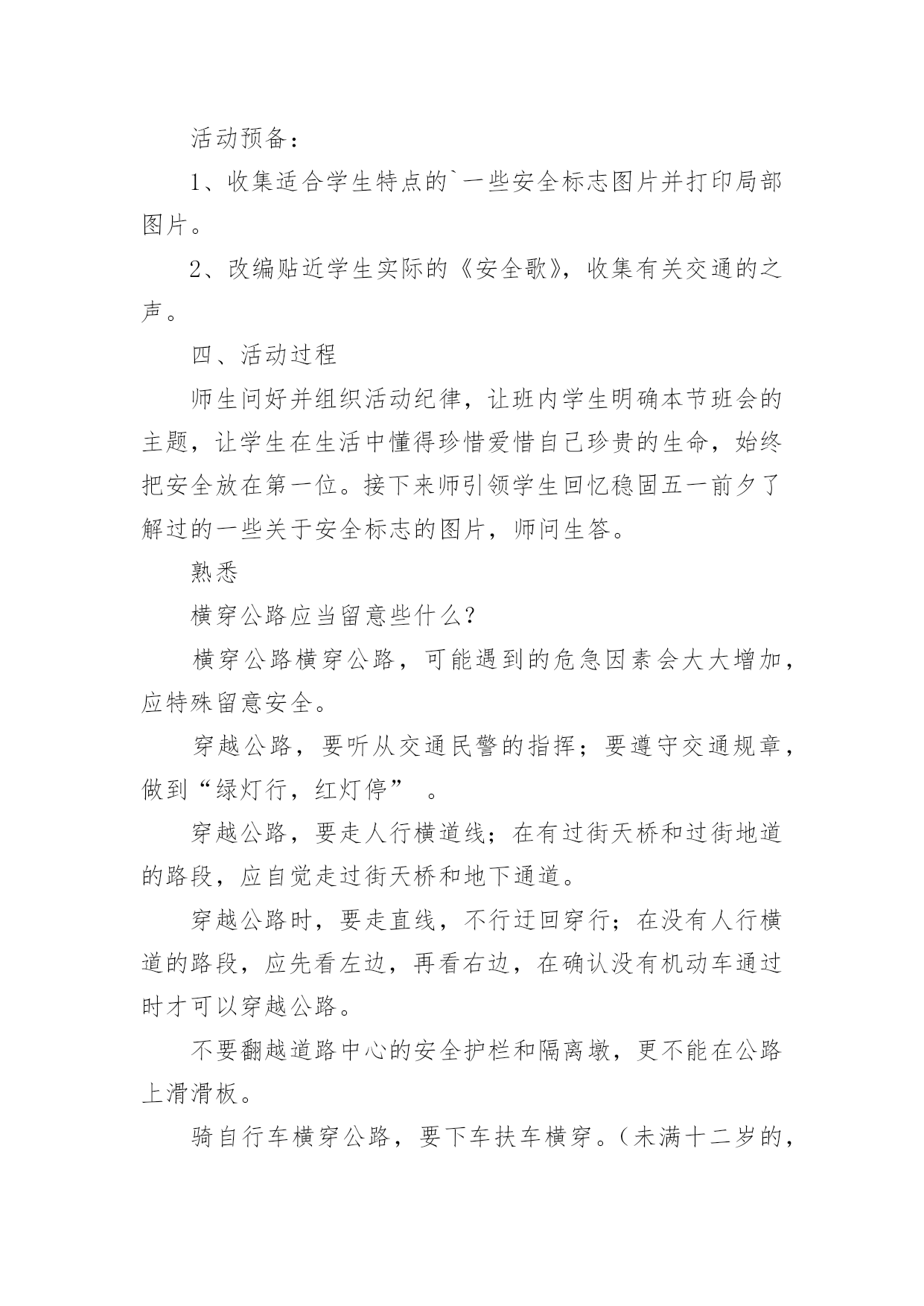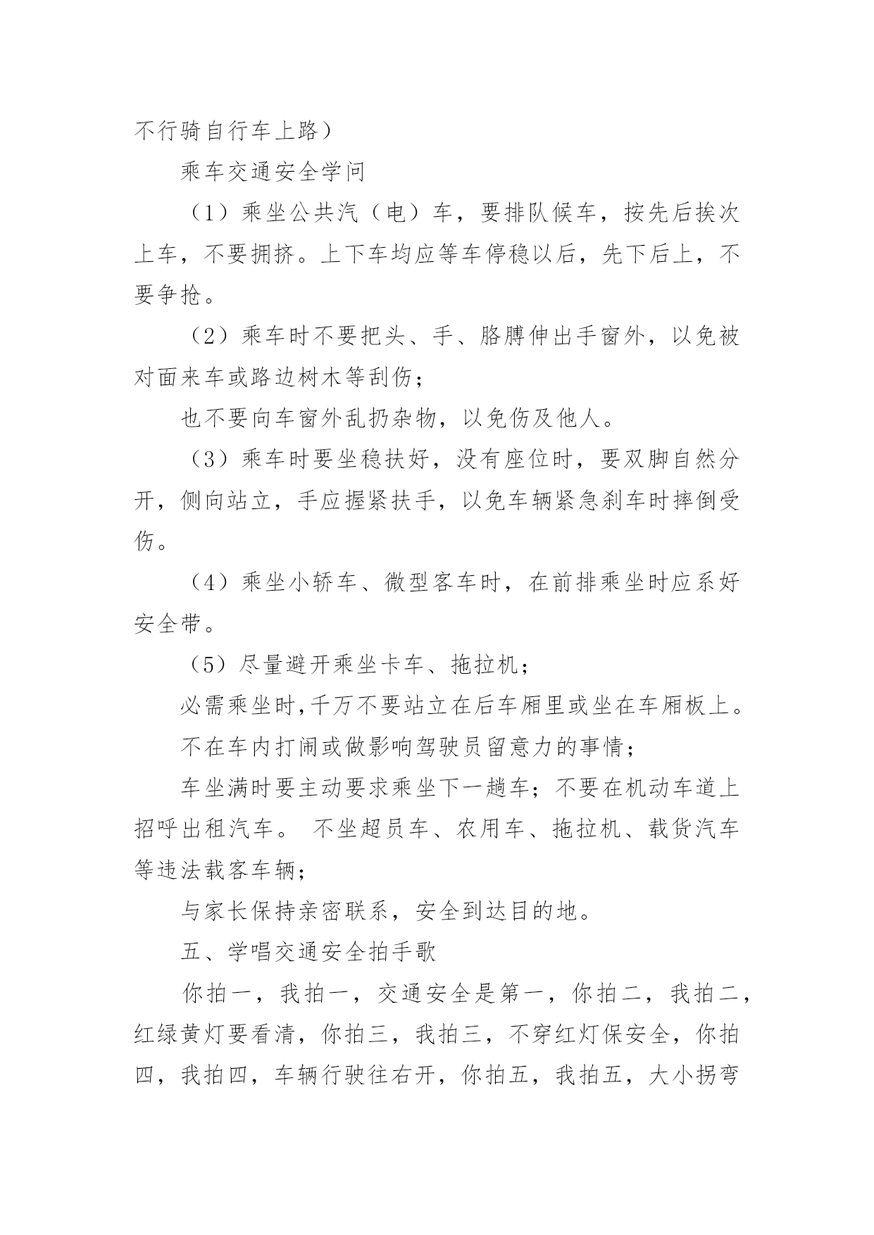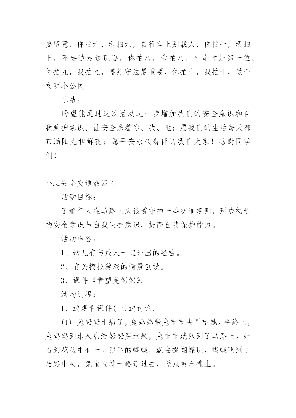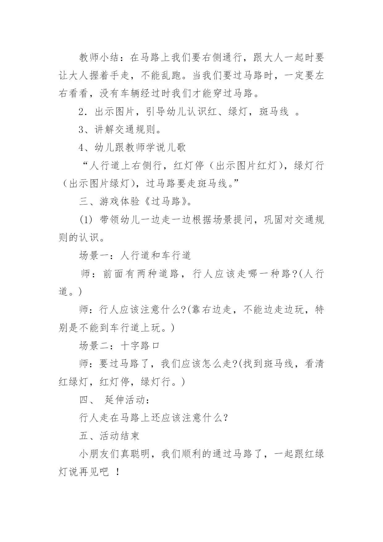 小班安全交通教案在教学工作者开展教学活动前,常常要根据教学需要编写教案,教案是教材及大纲与课堂教学的纽带和桥梁。怎样写教案才更能起到其作用呢?下面是小编为大家整理的小班安全交通教案,欢迎阅读与收藏。小班安全交通教案1活动目标:1、注意安全,初步培养幼儿的自我保护意识。2、能认识简单的`交通标记并了解安全通过马路应遵守的交通规则。活动准备:挂图四幅,红绿灯标牌各一个。视频资料活动过程:(一)导入:幼儿观看视频,引起幼儿注意。提问:发生了什么事?怎么发生的?(二)认识交通标志。1、出示挂图认识简单的交通标志:人行横道线、信号灯、停车线等。2、通过游戏《猜猜看》,来巩固对交通标志的认识。3、提问:如何过马路?安全过马路有什么好处?培养幼儿的自我保护意识。(三)学说儿歌《红绿灯》大马路,宽又宽,警察叔叔站中间。红灯亮了停一停,绿灯亮了往前行。(四)游戏小朋友们想不想玩红绿灯的游戏,师幼一起玩游戏。老师扮成交警叔叔,出示红绿灯标志让幼儿进一步巩固认识红绿灯及其作用。活动延伸:绘画红绿灯。小班安全交通教案2设计背景《幼儿教育纲要》指出:要为幼儿提供健康、丰富的学习和生活活动,满足幼儿各方面发展的需要,要让幼儿知道必要的安全保健知识,学习保护自己。小班孩子由于年龄特点,对于保护自己,珍惜生命的意识是极其缺乏的,我班不少家长特别是爷爷奶奶反映,孩子一出幼儿园就跑开了,过马路也不肯拉着大人。为了让孩子感悟到生命的珍贵,萌发保护自己的安全意识,减少幼儿身心受到意外伤害的'可能性。让幼儿在有安全意识的基础上,时时提醒自己或他人注意交通安全。为此我班开展了系列交通安全教育的活动。活动目标1、让幼儿了解一些基本的交通安全知识,知道红灯停,绿灯行的道理。2、知道过马路时要注意自己的安全,让幼儿知道不走斑马线的危险性。3、让幼儿学会念儿歌,进一步培养幼儿的幼儿的语言表达能力。4、培养幼儿完整、连贯地表达能力和对事物的判断能力。5、加强幼儿的安全意识。重点难点1.了解基本的交通知识,知道红灯停,绿灯行的道理。2.在游戏活动中体验交通规则,知道行走时具体遵守哪些交通规则,培养一定的自我保护意识和能力。活动准备1.图片:红、绿灯,斑马线。2.有关情景游戏的创设。3.儿歌《交通灯》。活动过程一、手指游戏。教师带领幼儿一边说儿歌,一边做动作。二、谈话,引入主题。1.“小朋友们知道怎样过马路吗?过马路时应该注意些什么?”(幼儿讨论)教师小结:在马路上我们要右侧通行,跟大人一起时要让大人握着手走,不能乱跑。当我们要过马路时,一定要左右看看,没有车辆经过时我们才能穿过马路。2.出示图片,引导幼儿认识红、绿灯,斑马线。3、讲解交通规则。4、幼儿跟教师学说儿歌“人行道上右侧行,红灯停(出示图片红灯),绿灯行(出示图片绿灯),过马路要走斑马线。”三、游戏体验《过马路》。(1)带领幼儿一边走一边根据场景提问,巩固对交通规则的认识。场景一:人行道和车行道师:前面有两种道路,行人应该走哪一种路?(人行道。)师:行人应该注意什么?(靠右边走,不能边走边玩,特别是不能到车行道上玩。)场景二:十字路口师:要过马路了,我们应该怎么走?(找到斑马线,看清红绿灯,红灯停,绿灯行。)四、延伸活动:行人走在马路上还应该注意什么?五、活动结束小朋友们真聪明,我们顺利的通过马路了,一起跟红绿灯说再见吧!教学反思设计这个活动时,我首先根据小班幼儿的已有生活经验与认知发展水平,将目标定位为:了解行人在马路上应该遵守的一些交通规则,培养初步的安全意识与自我保护意识。由于小班幼儿注意力集中的时间很短,因而活动内容不能过于繁杂,而应简单明确。为此,我选择了幼儿日常生活中经常会遇到的场景,教育幼儿不在马路上玩耍,要走人行道,过马路要走斑马线等。我采用直观图片、情景模拟游戏等引导幼儿参与活动,让幼儿了解交通知识。正所谓实践出真知,所以我在活动后请家长在平时生活中引导幼儿,而且做给孩子看,给孩子做个好榜样,实现家园共育,以增强幼儿的安全意识、自我保护意识和能力。小班安全交通教案3班会目的:通过开展以交通安全为主题的安全学问训练班会,增加班内学生的安全意识,能懂会用一些根本常用到的校内外的交通安全学问,到达乐观预防危急的发生并提高学生根本自我爱护的力量。活动内容:1、熟悉交通符号和交通标线2、利用贴近学生校内生活安全方面的事例,学习交通之声3、学唱交通儿歌活动预备:1、收集适合学生特点的`一些安全标志图片并打印局部图片。2、改编贴近学生实际的《安全歌》,收集有关交通的之声。四、活动过程师生问好并组织活动纪律,让班内学生明确本节班会的主题,让学生在生活中懂得珍惜爱惜自己珍贵的生命,始终把安全放在第一位。接下来师引领学生回忆稳固五一前夕了解过的一些关于安全标志的图片,师问生答。熟悉横穿公路应当留意些什么?横穿公路横穿公路