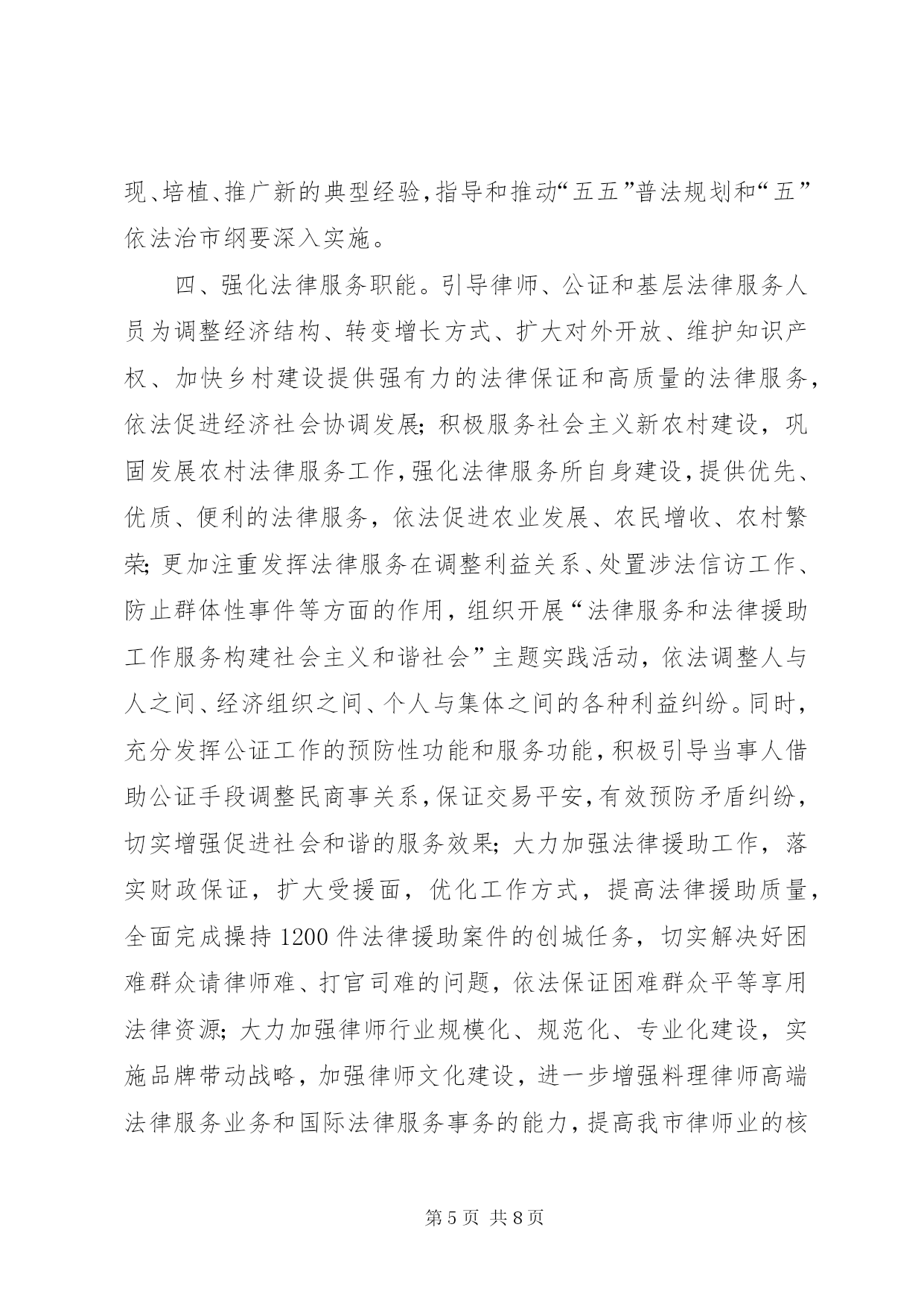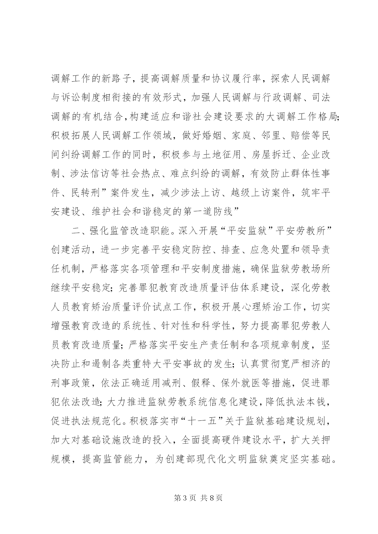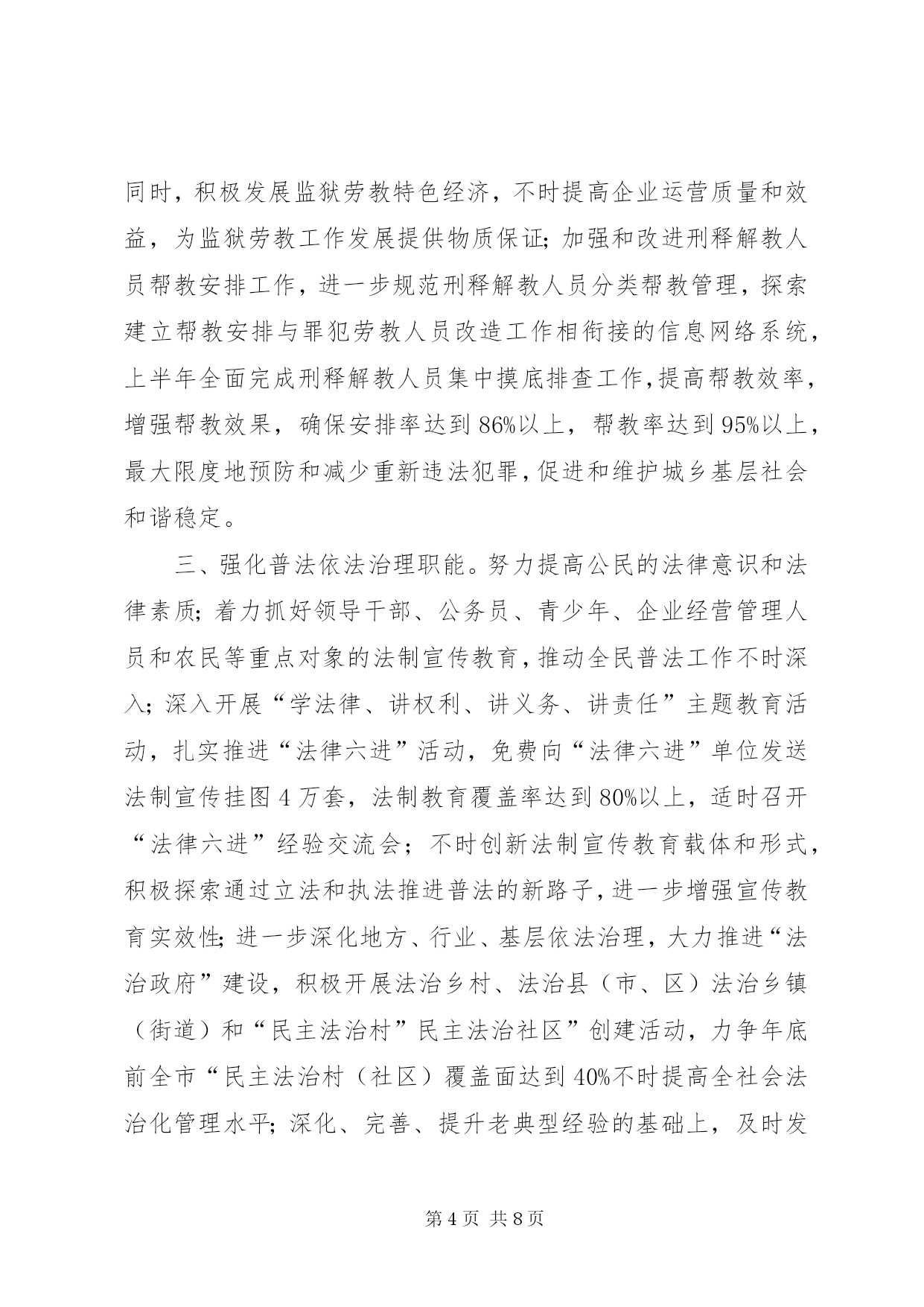 第PAGE\*Arabic\*MERGEFORMAT8页共NUMPAGES\*MERGEFORMAT8页司法局普法部署要点全面提升服务和保证平安建设、和谐社会建设的能力。依照中央的统一部署要求,加强班子队伍建设。继续深化社会主义法治理念教育,把社会主义法治理念教育作为司法行政队伍建设的一条主线,贯穿于服务构建社会主义和谐社会的全过程,深入耐久地开展下去,使社会主义法治理念对司法行政工作的指导地位在各级司法行政机关和全体干警中牢固确立起来;认真贯彻落实《公务员法》加强各级领导班子建设,加大直管和协管力度,积极推进领导干部轮岗交流,配强配好“一把手”把各级领导班子建设成为坚持科学发展观、适应和谐社会建设的坚强领导集体;大力加强内部法制建设,继续抓好“规范执法行为、促进执法公正”专项整改活动,完善和落实执法责任制,注重发挥执法执业档案的效能,切实提高做好行政复议应诉的水平和能力,加强执法监督检查,确保严格、公正、文明执法;认真落实司法部五年教育培训规划,大力加强职业道德、执业纪律教育和业务培训,不时提高服务和保证和谐社会建设的素质能力;大力加强党风廉政建设,深入开展廉政主题教育活动,强化领导作风建设,严格执行党风廉政建设责任制,认真落实廉洁自律各项规定,坚决防止违法违纪案件发生;既要从严管警,使之始终具有高度的组织性、纪律性,坚持井然有序、奋发向上的工作和精神状态,又要坚持从优待警,从政治上、工作上、生活上关心维护干警,不时改善执法执业环境,为司法行政工作全面、继续、健康发展注入新的生机和活力。深入贯彻党的和六中全会精神,年全市司法行政工作总的指导思想和目标要求是坚持以邓小平理论和“三个代表”重要思想为指导。全面落实科学发展观,依照市委、市政府和上级司法行政机关的布置要求,紧紧围绕构建社会主义和谐社会这一总目标,抓住加强基层基础建设和深化体制机制改革“两个重点”强化矛盾纠纷排查调处、监管改造、普法依法治理、法律服务“项职能”确保实现“六个明显提高”基层组织规范化建设水平明显提高,矛盾纠纷化解能力明显提高,罪犯劳教人员教育改造质量明显提高,普法依法治理的实效明显提高,法律服务社会公信度明显提高,班子队伍整体素质明显提高,为推动省会经济社会又好又快发展、深化平安建设、构建社会主义和谐社会提供优质高效的法律服务和强有力的法律保证,发明和谐稳定的社会环境和公正高效的法治环境,以优异效果迎接党的胜利召开。重点要抓好以下七项工作:一、强化矛盾纠纷排查调处职能。进一步健全完善人民调解工作网络,完善矛盾纠纷排查、预警、调处、处置机制,充分发挥全市矛盾纠纷信息网络系统的功能作用,确保矛盾纠纷发现得早、控制得住,及时把矛盾纠纷解决在当地、化解在基层、消灭在萌芽状态;针对新时期矛盾纠纷的新特点,积极探索做好人民调解工作的新路子,提高调解质量和协议履行率,探索人民调解与诉讼制度相衔接的有效形式,加强人民调解与行政调解、司法调解的有机结合,构建适应和谐社会建设要求的大调解工作格局;积极拓展人民调解工作领域,做好婚姻、家庭、邻里、赔偿等民间纠纷调解工作的同时,积极参与土地征用、房屋拆迁、企业改制、涉法信访等社会热点、难点纠纷的调解,有效防止群体性事件、民转刑”案件发生,减少涉法上访、越级上访案件,筑牢平安建设、维护社会和谐稳定的第一道防线”二、强化监管改造职能。深入开展“平安监狱”平安劳教所”创建活动,进一步完善平安稳定防控、排查、应急处置和领导责任机制,严格落实各项管理和平安制度措施,确保监狱劳教场所继续平安稳定;完善罪犯教育改造质量评估体系建设,深化劳教人员教育矫治质量评价试点工作,积极开展心理矫治工作,切实增强教育改造的系统性、针对性和科学性,努力提高罪犯劳教人员教育改造质量;严格落实平安生产责任制和各项规章制度,坚决防止和遏制各类重特大平安事故的发生;认真贯彻宽严相济的刑事政策,依法正确适用减刑、假释、保外就医等措施,促进罪犯依法改造;大力推进监狱劳教系统信息化建设,降低执法本钱,促进执法规范化。积极落实市“十一五”关于监狱基础建设规划,加大对基础设施改造的投入,全面提高硬件建设水平,扩大关押规模,提高监管能力,为创建部现代化文明监狱奠定坚实基础。同时,积极发展监狱劳教特色经济,不时提高企业运营质量和效益,为监狱劳教工作发展提供物质保证;加强和改进刑释解教人员帮教安排工作,进一步规范刑释解教人员分类帮教管理,探索建立帮教安排与罪犯劳教人员改造工作相衔接的信息网络系统,上半年全面完成刑释解教人员集中摸底排查工作,提高帮教效率,增强帮教效果,确保安排率达到86%以上,帮教率达到95%以上,最大限度地预防和减少重新违法犯罪,促进和维护城乡基层社会和谐稳定。三、强化普法依法治理职能。努力提高公民的法律意识和法律素质;着力抓好领导干部、