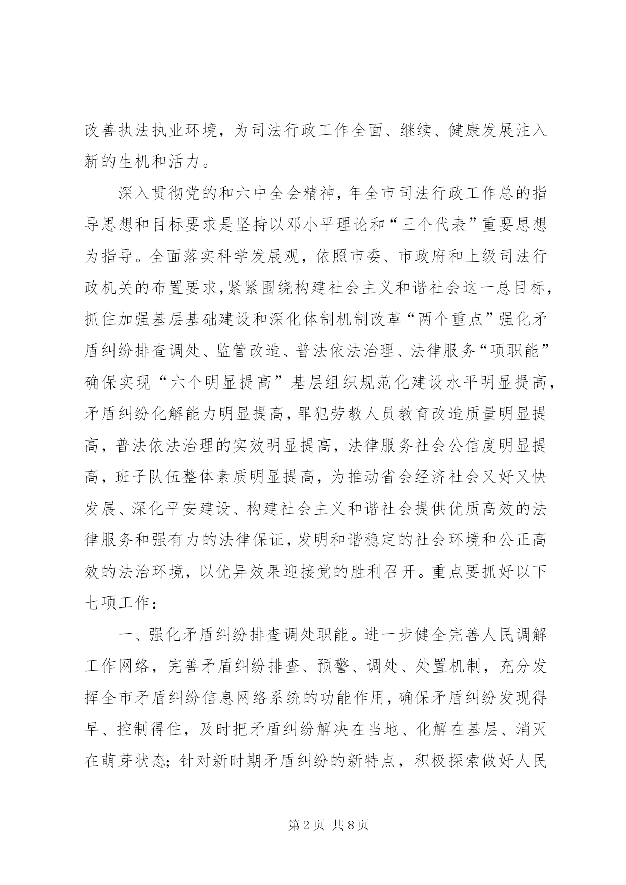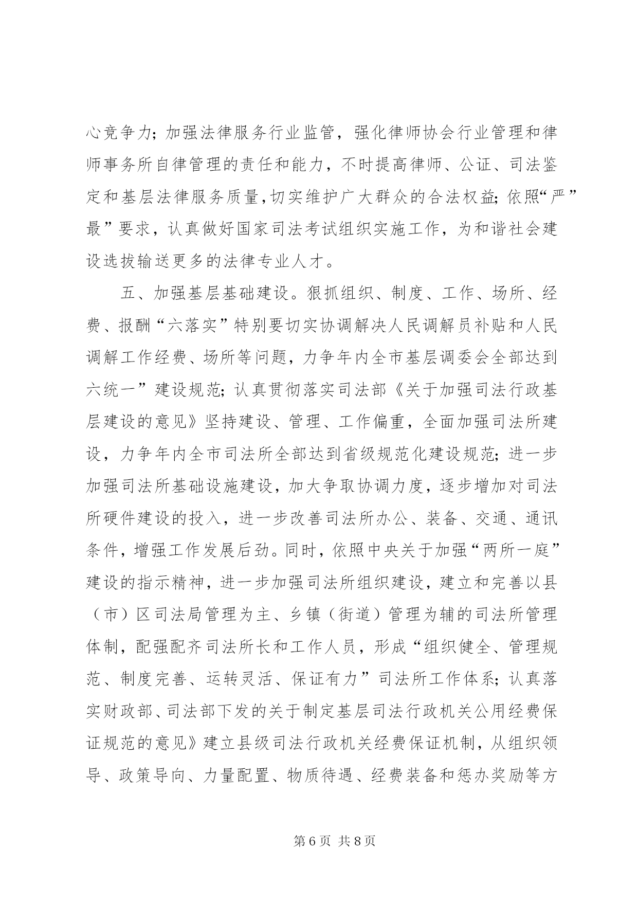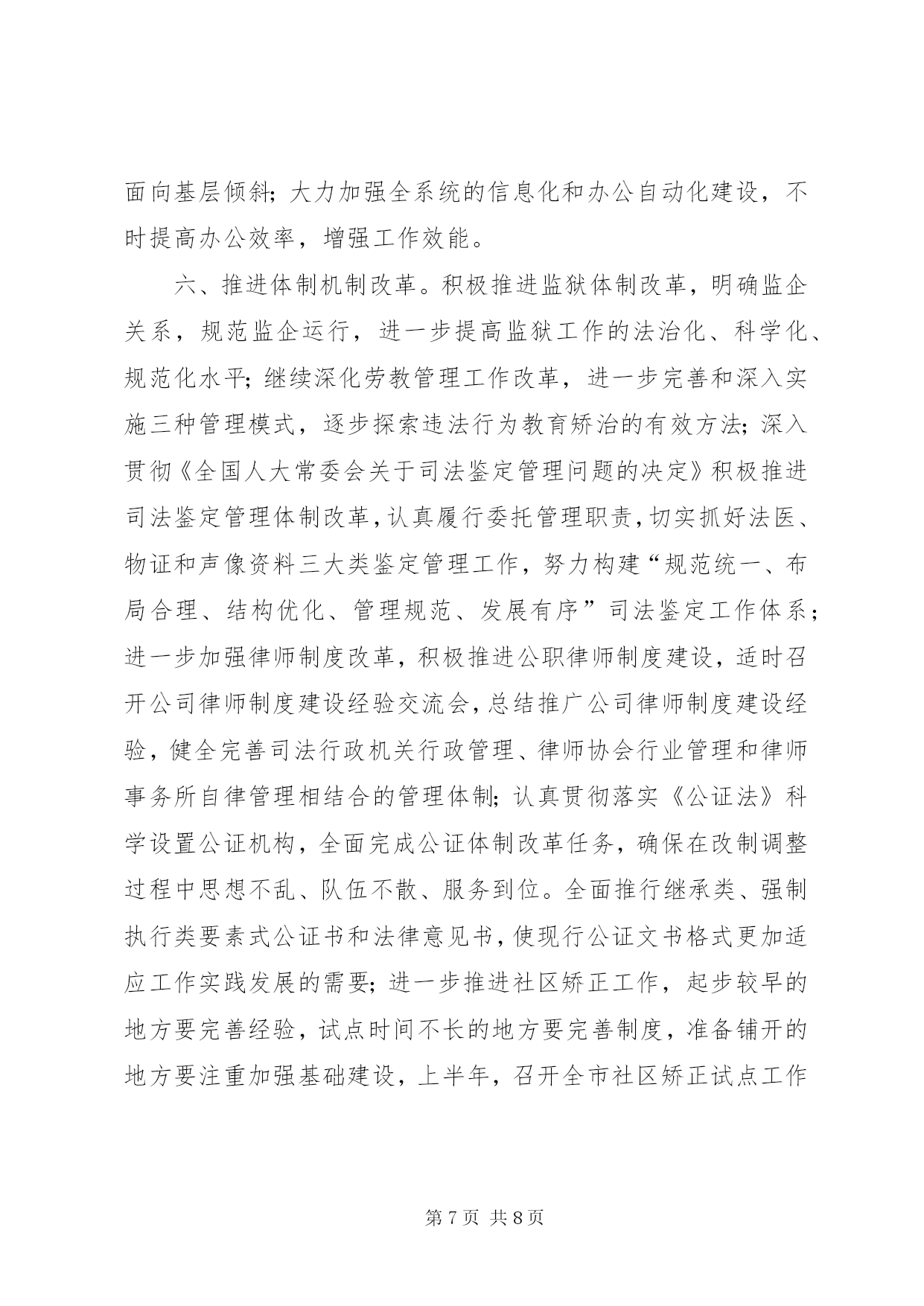 第PAGE\*Arabic\*MERGEFORMAT8页共NUMPAGES\*MERGEFORMAT8页司法局普法部署要点全面提升服务和保证平安建设、和谐社会建设的能力。依照中央的统一部署要求,加强班子队伍建设。继续深化社会主义法治理念教育,把社会主义法治理念教育作为司法行政队伍建设的一条主线,贯穿于服务构建社会主义和谐社会的全过程,深入耐久地开展下去,使社会主义法治理念对司法行政工作的指导地位在各级司法行政机关和全体干警中牢固确立起来;认真贯彻落实《公务员法》加强各级领导班子建设,加大直管和协管力度,积极推进领导干部轮岗交流,配强配好“一把手”把各级领导班子建设成为坚持科学发展观、适应和谐社会建设的坚强领导集体;大力加强内部法制建设,继续抓好“规范执法行为、促进执法公正”专项整改活动,完善和落实执法责任制,注重发挥执法执业档案的效能,切实提高做好行政复议应诉的水平和能力,加强执法监督检查,确保严格、公正、文明执法;认真落实司法部五年教育培训规划,大力加强职业道德、执业纪律教育和业务培训,不时提高服务和保证和谐社会建设的素质能力;大力加强党风廉政建设,深入开展廉政主题教育活动,强化领导作风建设,严格执行党风廉政建设责任制,认真落实廉洁自律各项规定,坚决防止违法违纪案件发生;既要从严管警,使之始终具有高度的组织性、纪律性,坚持井然有序、奋发向上的工作和精神状态,又要坚持从优待警,从政治上、工作上、生活上关心维护干警,不时改善执法执业环境,为司法行政工作全面、继续、健康发展注入新的生机和活力。深入贯彻党的和六中全会精神,年全市司法行政工作总的指导思想和目标要求是坚持以邓小平理论和“三个代表”重要思想为指导。全面落实科学发展观,依照市委、市政府和上级司法行政机关的布置要求,紧紧围绕构建社会主义和谐社会这一总目标,抓住加强基层基础建设和深化体制机制改革“两个重点”强化矛盾纠纷排查调处、监管改造、普法依法治理、法律服务“项职能”确保实现“六个明显提高”基层组织规范化建设水平明显提高,矛盾纠纷化解能力明显提高,罪犯劳教人员教育改造质量明显提高,普法依法治理的实效明显提高,法律服务社会公信度明显提高,班子队伍整体素质明显提高,为推动省会经济社会又好又快发展、深化平安建设、构建社会主义和谐社会提供优质高效的法律服务和强有力的法律保证,发明和谐稳定的社会环境和公正高效的法治环境,以优异效果迎接党的胜利召开。重点要抓好以下七项工作:一、强化矛盾纠纷排查调处职能。进一步健全完善人民调解工作网络,完善矛盾纠纷排查、预警、调处、处置机制,充分发挥全市矛盾纠纷信息网络系统的功能作用,确保矛盾纠纷发现得早、控制得住,及时把矛盾纠纷解决在当地、化解在基层、消灭在萌芽状态;针对新时期矛盾纠纷的新特点,积极探索做好人民调解工作的新路子,提高调解质量和协议履行率,探索人民调解与诉讼制度相衔接的有效形式,加强人民调解与行政调解、司法调解的有机结合,构建适应和谐社会建设要求的大调解工作格局;积极拓展人民调解工作领域,做好婚姻、家庭、邻里、赔偿等民间纠纷调解工作的同时,积极参与土地征用、房屋拆迁、企业改制、涉法信访等社会热点、难点纠纷的调解,有效防止群体性事件、民转刑”案件发生,减少涉法上访、越级上访案件,筑牢平安建设、维护社会和谐稳定的第一道防线”二、强化监管改造职能。深入开展“平安监狱”平安劳教所”创建活动,进一步完善平安稳定防控、排查、应急处置和领导责任机制,严格落实各项管理和平安制度措施,确保监狱劳教场所继续平安稳定;完善罪犯教育改造质量评估体系建设,深化劳教人员教育矫治质量评价试点工作,积极开展心理矫治工作,切实增强教育改造的系统性、针对性和科学性,努力提高罪犯劳教人员教育改造质量;严格落实平安生产责任制和各项规章制度,坚决防止和遏制各类重特大平安事故的发生;认真贯彻宽严相济的刑事政策,依法正确适用减刑、假释、保外就医等措施,促进罪犯依法改造;大力推进监狱劳教系统信息化建设,降低执法本钱,促进执法规范化。积极落实市“十一五”关于监狱基础建设规划,加大对基础设施改造的投入,全面提高硬件建设水平,扩大关押规模,提高监管能力,为创建部现代化文明监狱奠定坚实基础。同时,积极发展监狱劳教特色经济,不时提高企业运营质量和效益,为监狱劳教工作发展提供物质保证;加强和改进刑释解教人员帮教安排工作,进一步规范刑释解教人员分类帮教管理,探索建立帮教安排与罪犯劳教人员改造工作相衔接的信息网络系统,上半年全面完成刑释解教人员集中摸底排查工作,提高帮教效率,增强帮教效果,确保安排率达到86%以上,帮教率达到95%以上,最大限度地预防和减少重新违法犯罪,促进和维护城乡基层社会和谐稳定。三、强化普法依法治理职能。努力提高公民的法律意识和法律素质;着力抓好领导干部、