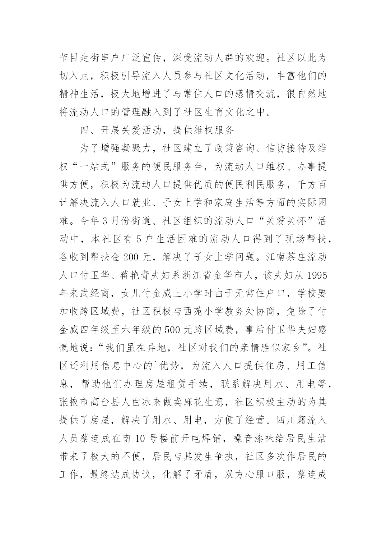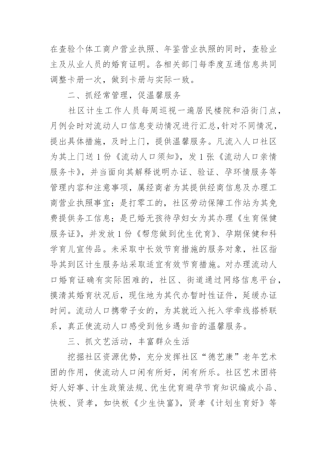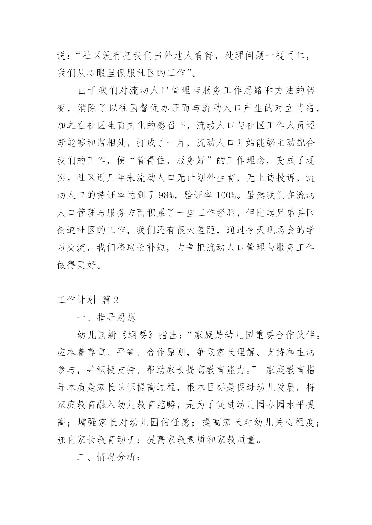 工作计划时间流逝得如此之快,我们的工作同时也在不断更新迭代中,写好计划才不会让我们努力的时候迷失方向哦。什么样的计划才是有效的呢?下面是小编收集整理的工作计划5篇,仅供参考,大家一起来看看吧。工作计划篇1近年来,在市、区相关部门和街道办事处的指导支持下,围绕“管得住,服务好”的工作理念,建全完善了管理服务内容与工作制度,做到了机构、场地、人员、经费、工作、制度“六到位”,初步探索出了一条社区流动人口管理与服务的路子。一、抓协调配合,促综合治理一是做好改制企业“单位人”向“社会人”转化过程中,育龄妇女的移交衔接工作。针对下岗职工、人户分离住户中的育龄妇女流动性大等难点,社区按照街道的要求,对已婚育龄人口逐人登记,并将流动已婚育龄妇女按现居住地编入自管小组,和常住已婚育龄妇女同管理同服务。二是协调发挥部门作用,认真履行部门职责,强化流动人口管理。社区为辖区相关部门提供必需的表、册、卡,制作统一的办证通知书,为流动已婚育龄妇女提供孕环情服务,并与流出地搞好信息通报。协调派出所在查验流动人口暂住证、流动人口房屋租赁合同的同时,查验《流动人口婚育证明》。工商所在查验个体工商户营业执照、年鉴营业执照的同时,查验业主及从业人员的婚育证明。各相关部门每季度互通信息共同调整卡册一次,做到卡册与实际一致。二、抓经常管理,促温馨服务社区计生工作人员每周巡视一遍居民楼院和沿街门点,月例会时对流动人口信息变动情况进行汇总,针对不同情况,提出具体措施,及时上门,提供温馨服务。凡流入人口社区为其上门送1份《流动人口须知》,发1张《流动人口亲情服务卡》,并当面向其解释说明办证、验证、孕环情服务等管理内容和注意事项,属经商者为其提供经商信息及办理工商营业执照事宜;是打零工的,社区劳动保障工作站为其免费提供务工信息;是已婚无孩待孕妇女为其办理《生育保健服务证》,并发放1份《帮您做到优生优育》、孕期保健和科学育儿宣传品。未采取中长效节育措施的服务对象,社区指导其到区计生服务站采取适宜有效节育措施。对办理流动人口婚育证确有实际困难的,社区、街道通过网络信息平台,摸清其婚育状况后,现住地为其代办暂时性证件,延缓办证时间。流动人口携带子女的,为其就近入托入学牵线搭桥联系,真正使流动人口感受到他乡遇知音的温馨服务。三、抓文艺活动,丰富群众生活挖掘社区资源优势,充分发挥社区“德艺康”老年艺术团的作用,使流动人口闲有所好,闲有所乐。社区艺术团将好人好事、计生政策法规、优生优育避孕节育知识编成小品、快板、贤孝,如快板《少生快富》,贤孝《计划生育好》等节目走街串户广泛宣传,深受流动人群的欢迎。社区以此为切入点,积极引导流入人员参与社区文化活动,丰富他们的精神生活,极大地增进了与常住人口的感情交流,很自然地将流动人口的管理融入到了社区生育文化之中。四、开展关爱活动,提供维权服务为了增强凝聚力,社区建立了政策咨询、信访接待及维权“一站式”服务的便民服务台,为流动人口维权、办事提供方便,积极为流动人口提供优质的便民利民服务,千方百计解决流入人口就业、子女上学和家庭生活等方面的实际困难。今年3月份街道、社区组织的流动人口“关爱关怀”活动中,本社区有5户生活困难的流动人口得到了现场帮扶,各收到帮扶金200元,解决了子女上学问题。江南茶庄流动人口付卫华、蒋艳青夫妇系浙江省金华市人,该夫妇从1995年来武经商,女儿付金威上小学时由于无常住户口,学校要加收跨区域费,社区积极与西苑小学教务处协商,免除了付金威四年级至六年级的500元跨区域费,事后付卫华夫妇感慨地说:“我们虽在异地,社区对我们的亲情胜似家乡”。社区还利用信息中心的`优势,为流入人口提供住房、用工信息,帮助他们办理房屋租赁手续,联系解决用水、用电等,张掖市高台县人白冰来做卖麻花生意,社区积极主动的为其提供了房屋,解决了用水、用电,方便了经营。四川籍流入人员蔡连成在南10号楼前开电焊铺,噪音漆味给居民生活带来了极大的不便,居民与其发生争执,社区多次作居民的工作,最终达成协议,化解了矛盾,双方心服口服,蔡连成说:“社区没有把我们当外地人看待,处理问题一视同仁,我们从心眼里佩服社区的工作”。由于我们对流动人口管理与服务工作思路和方法的转变,消除了以往因督促办证而与流动人口产生的对立情绪,加之在社区生育文化的感召下,流动人口与社区工作人员逐渐能够和谐相处,打成了一片,流动人口开始能够主动配合我们的工作,使“管得住,服务好”的工作理念,变成了现实。社区近几年来流动人口无计划外生育,无上访投诉,流动人口的持证率达到了98%,验证率100%。虽然我们在流动人口管理与服务方面积累了一些工作经验,但比起兄弟县区街道社区的工作,我们还有很大差距,通过今天现场会的学习交流,我们将取长补短,力争把流动人口管理与服务工作做得更好。工作计划篇2一、指导思想幼