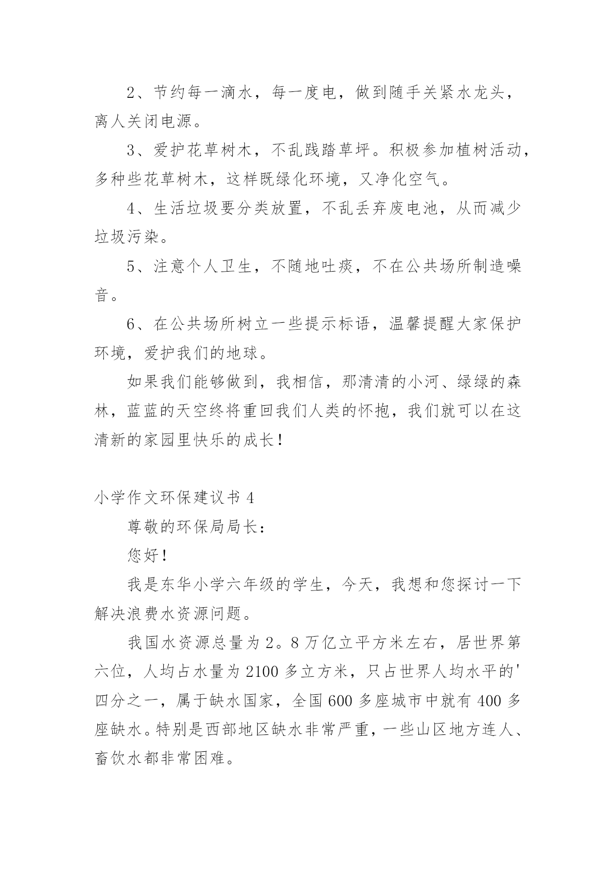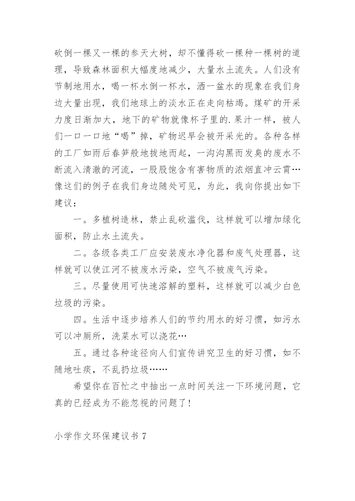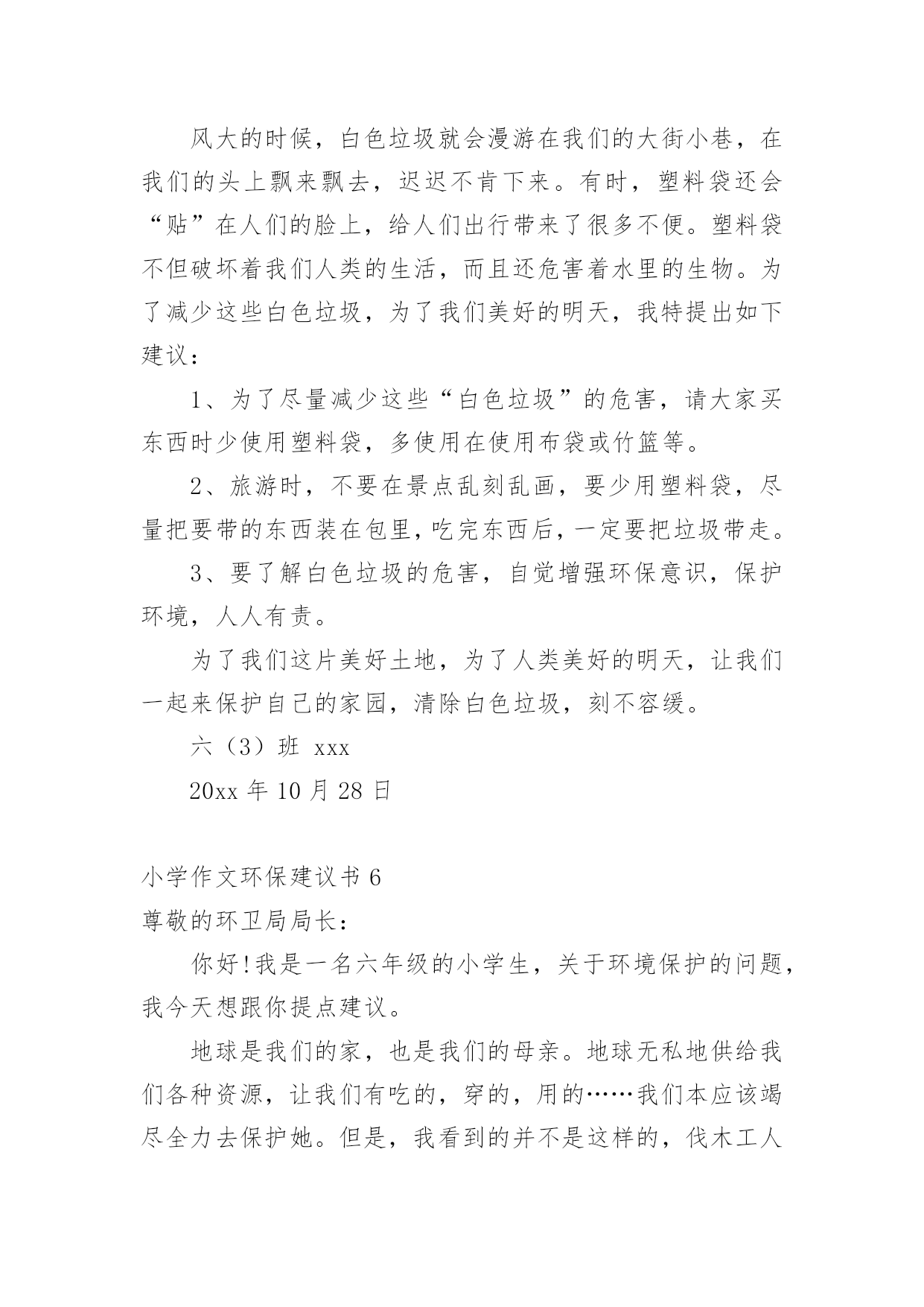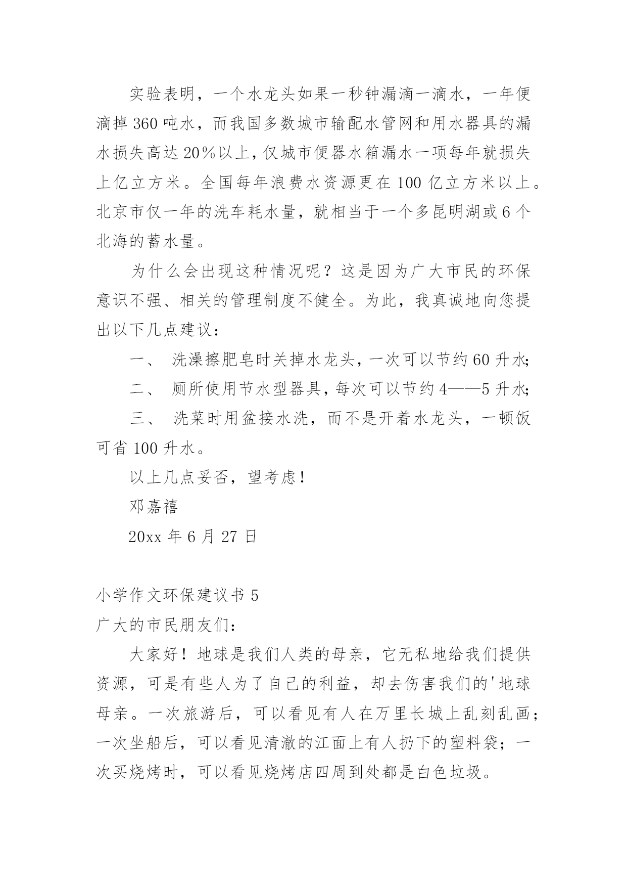 小学作文环保建议书在现实社会中,能够利用到建议书的场合越来越多,我们在写建议书时要分条列出建议的具体内容。相信写建议书是一个让许多人都头痛的问题,下面是小编为大家收集的小学作文环保建议书,希望能够帮助到大家。小学作文环保建议书1各位市民,大家好!我是兴安一小的一名小学生。如今十分发达的地球,有着非常大的隐患。这一切都是我们人类造成的。贪婪的人类没有节制的'开采资源。人类所需要的“大气资源,水资源,森林资源”本来是可以不断生长的,但是人类随意破坏资源,滥用化学品,使我们的地球伤痕累累。人类随意破坏环境。比如我国的木兰溪,在50年代时,河水清澈见底,但现在的木兰溪,已是浑浊不清,鱼虾死亡。这一个个鲜活的例子,不都是人们不环保的后果吗?现在的天空,散布着汽车尾气,弥漫在我们生活的上空,早已在我们的身体里停留了。患上各种疾病。给我们的身体带来危害。面对这个充满污染的空气,我想对广大市民提出倡议:1:少用一次性塑料袋。在城市的上空,漫天飞舞的塑料袋,挂在树上。我提议,每次购物,最好带上自备的布袋。2:少用一次性筷子,饭盒在饭店,最好使用消毒的筷子,买饭时,最好使用饭盒。3:少砍树,多种树我们一定要少砍树,避免沙尘暴轻而易举的来侵袭城市。多种树,在自己生日时,最好种上一棵树。减少二氧化碳。在这个地球上,我们是地球的子民。让我们记住“拯救地球就是拯救自己”。小学作文环保建议书2各位地球公民:在生活中,垃圾随处可见。还有还有自然资源,我们的浪费导致它一点点流失。人们不爱护环境,大街小巷的垃圾随处可见。许多餐厅大量使用一次性产品,这只图一时方便。对环境一点利益都没有,反而有害处。许多人洗手后不关水龙头,用灯后不关灯,许多同学写作业,这一页没写好撕下来扔掉。这些,对我们的家园—地球,带来的是更多的.害处。所以我建议:一、走在大街上,不要把垃圾扔在地上,把垃圾送回它的家—垃圾桶,这个举手之劳,我们人人都能做得到。二、一次性产品,如一次性筷子、一次性纸杯等,它们对环境污染大,浪费资源,还不卫生。我们要尽量少用。三、我们要节约用水,用洗了衣服的水冲厕所,洗了菜的水洗手,用完水后切记关紧水龙头。让水资源为我们再做贡献。四、节约用电,家里的电器,如电脑、洗衣机等,不用拔掉插头,家里没人了,也要记住关灯。五、节约纸张,在写字前。要想好再写,这样可以减少写错,浪费纸张。尽量少用纸,无论是手纸还是餐巾纸,能用手帕代替的用手帕代替。作为地球人,我们应该节约资源,不随处乱扔垃圾。保护起我们的家园!小学作文环保建议书3四三班的同学们:你们好!大家都知道,地球是我们赖以生存的家园,地球是我们人类的母亲,是我们生命的摇篮。曾经的地球母亲是那样美丽,可是我们人类为了自己的利益,乱挖乱采矿产资源,随意排放废水、废气,随便乱扔生活垃圾……由于我们人类大量地破坏环境,如今已经把我们美丽的地球母亲折磨得不像样了。地球母亲在痛苦地呻吟。为了让我们的地球母亲不再受到伤害,让我们的地球母亲恢复她往日的风采,我们有责任,有义务来保护地球母亲。我们要从自我做起,从身边小事做起,来保护地球母亲,保护我们的'家园。我倡议:1、尽量不用一次性物品,去超市购物自备环保型购物袋,减少白色污染。2、节约每一滴水,每一度电,做到随手关紧水龙头,离人关闭电源。3、爱护花草树木,不乱践踏草坪。积极参加植树活动,多种些花草树木,这样既绿化环境,又净化空气。4、生活垃圾要分类放置,不乱丢弃废电池,从而减少垃圾污染。5、注意个人卫生,不随地吐痰,不在公共场所制造噪音。6、在公共场所树立一些提示标语,温馨提醒大家保护环境,爱护我们的地球。如果我们能够做到,我相信,那清清的小河、绿绿的森林,蓝蓝的天空终将重回我们人类的怀抱,我们就可以在这清新的家园里快乐的成长!小学作文环保建议书4尊敬的环保局局长:您好!我是东华小学六年级的学生,今天,我想和您探讨一下解决浪费水资源问题。我国水资源总量为2。8万亿立平方米左右,居世界第六位,人均占水量为2100多立方米,只占世界人均水平的'四分之一,属于缺水国家,全国600多座城市中就有400多座缺水。特别是西部地区缺水非常严重,一些山区地方连人、畜饮水都非常困难。实验表明,一个水龙头如果一秒钟漏滴一滴水,一年便滴掉360吨水,而我国多数城市输配水管网和用水器具的漏水损失高达20%以上,仅城市便器水箱漏水一项每年就损失上亿立方米。全国每年浪费水资源更在100亿立方米以上。北京市仅一年的洗车耗水量,就相当于一个多昆明湖或6个北海的蓄水量。为什么会出现这种情况呢?这是因为广大市民的环保意识不强、相关的管理制度不健全。为此,我真诚地向您提出以下几点建议:一、洗澡擦肥皂时关掉水龙头,一次可以节约60升水;二、厕所使用节水型器具,每次可以节约4——5升水;三、洗菜时用盆接水洗,而不是开着水龙