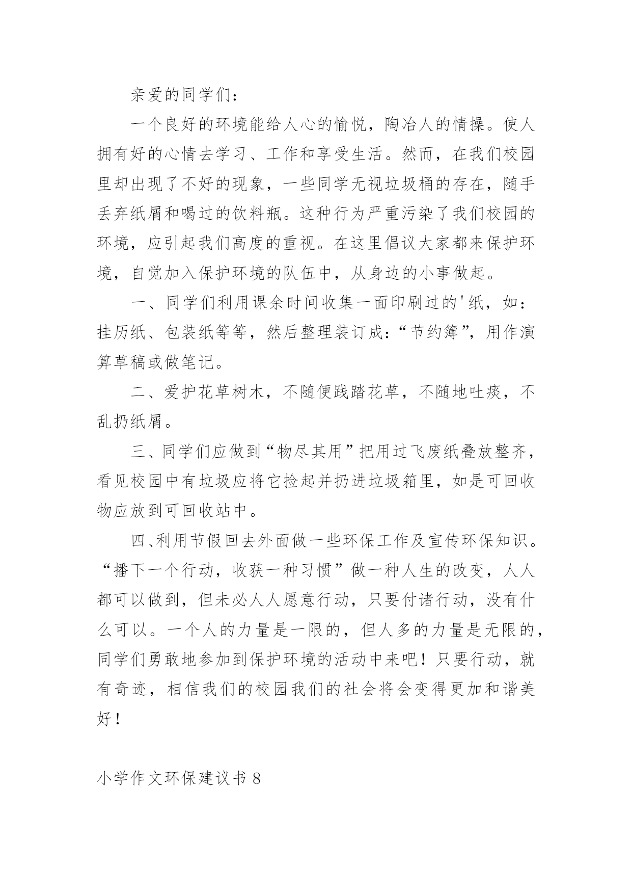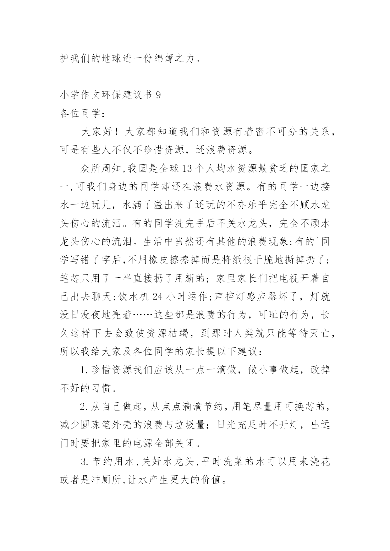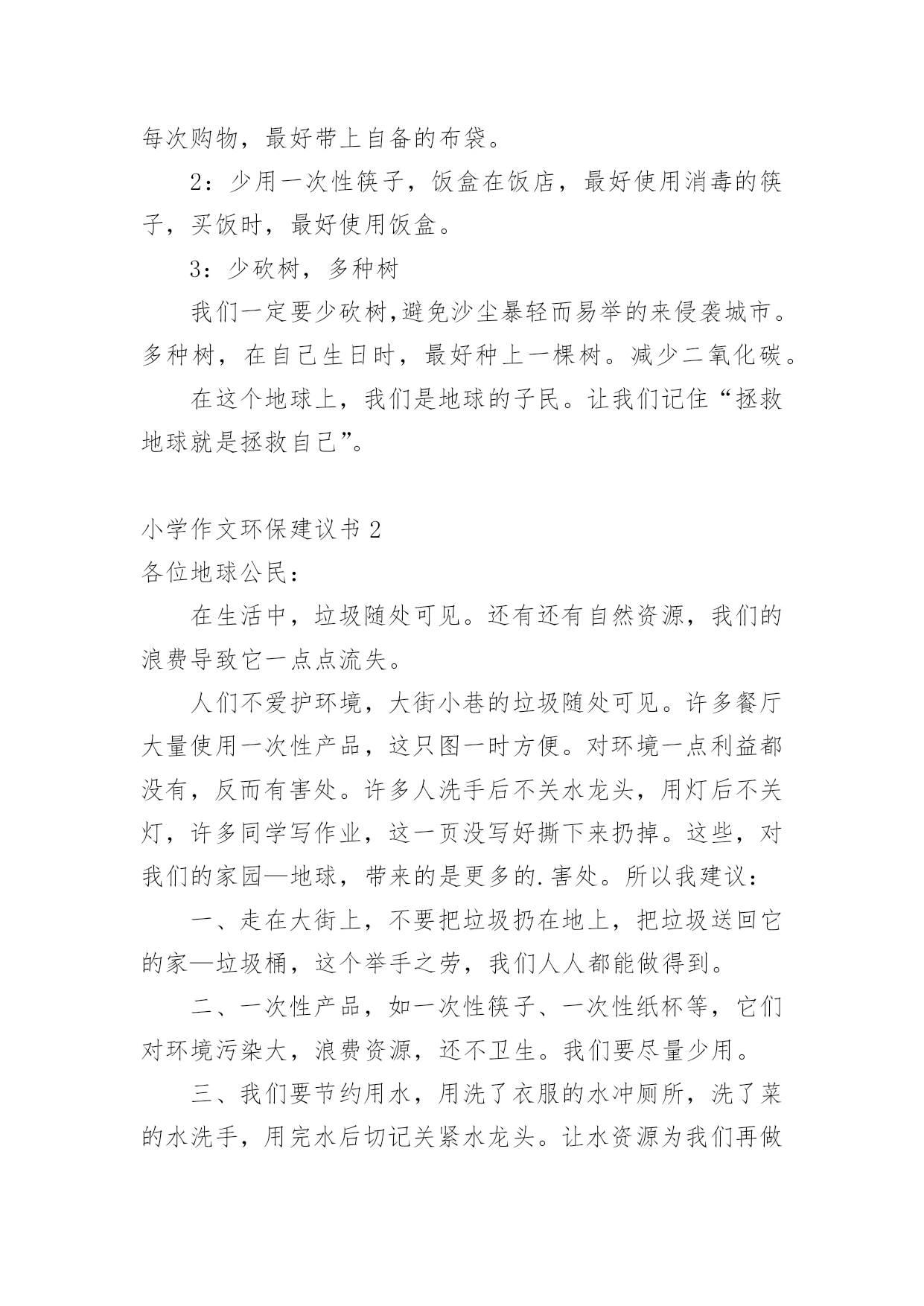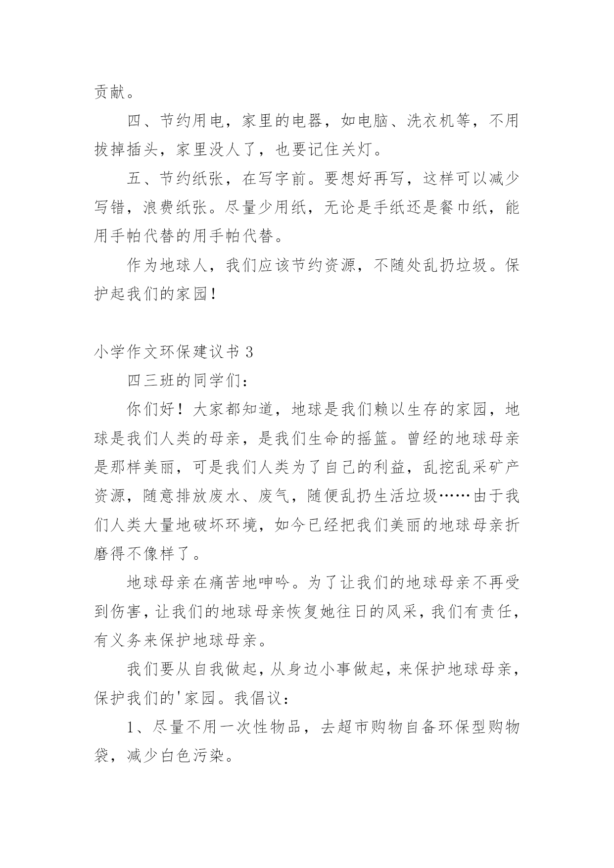 小学作文环保建议书在现实社会中,能够利用到建议书的场合越来越多,我们在写建议书时要分条列出建议的具体内容。相信写建议书是一个让许多人都头痛的问题,下面是小编为大家收集的小学作文环保建议书,希望能够帮助到大家。小学作文环保建议书1各位市民,大家好!我是兴安一小的一名小学生。如今十分发达的地球,有着非常大的隐患。这一切都是我们人类造成的。贪婪的人类没有节制的'开采资源。人类所需要的“大气资源,水资源,森林资源”本来是可以不断生长的,但是人类随意破坏资源,滥用化学品,使我们的地球伤痕累累。人类随意破坏环境。比如我国的木兰溪,在50年代时,河水清澈见底,但现在的木兰溪,已是浑浊不清,鱼虾死亡。这一个个鲜活的例子,不都是人们不环保的后果吗?现在的天空,散布着汽车尾气,弥漫在我们生活的上空,早已在我们的身体里停留了。患上各种疾病。给我们的身体带来危害。面对这个充满污染的空气,我想对广大市民提出倡议:1:少用一次性塑料袋。在城市的上空,漫天飞舞的塑料袋,挂在树上。我提议,每次购物,最好带上自备的布袋。2:少用一次性筷子,饭盒在饭店,最好使用消毒的筷子,买饭时,最好使用饭盒。3:少砍树,多种树我们一定要少砍树,避免沙尘暴轻而易举的来侵袭城市。多种树,在自己生日时,最好种上一棵树。减少二氧化碳。在这个地球上,我们是地球的子民。让我们记住“拯救地球就是拯救自己”。小学作文环保建议书2各位地球公民:在生活中,垃圾随处可见。还有还有自然资源,我们的浪费导致它一点点流失。人们不爱护环境,大街小巷的垃圾随处可见。许多餐厅大量使用一次性产品,这只图一时方便。对环境一点利益都没有,反而有害处。许多人洗手后不关水龙头,用灯后不关灯,许多同学写作业,这一页没写好撕下来扔掉。这些,对我们的家园—地球,带来的是更多的.害处。所以我建议:一、走在大街上,不要把垃圾扔在地上,把垃圾送回它的家—垃圾桶,这个举手之劳,我们人人都能做得到。二、一次性产品,如一次性筷子、一次性纸杯等,它们对环境污染大,浪费资源,还不卫生。我们要尽量少用。三、我们要节约用水,用洗了衣服的水冲厕所,洗了菜的水洗手,用完水后切记关紧水龙头。让水资源为我们再做贡献。四、节约用电,家里的电器,如电脑、洗衣机等,不用拔掉插头,家里没人了,也要记住关灯。五、节约纸张,在写字前。要想好再写,这样可以减少写错,浪费纸张。尽量少用纸,无论是手纸还是餐巾纸,能用手帕代替的用手帕代替。作为地球人,我们应该节约资源,不随处乱扔垃圾。保护起我们的家园!小学作文环保建议书3四三班的同学们:你们好!大家都知道,地球是我们赖以生存的家园,地球是我们人类的母亲,是我们生命的摇篮。曾经的地球母亲是那样美丽,可是我们人类为了自己的利益,乱挖乱采矿产资源,随意排放废水、废气,随便乱扔生活垃圾……由于我们人类大量地破坏环境,如今已经把我们美丽的地球母亲折磨得不像样了。地球母亲在痛苦地呻吟。为了让我们的地球母亲不再受到伤害,让我们的地球母亲恢复她往日的风采,我们有责任,有义务来保护地球母亲。我们要从自我做起,从身边小事做起,来保护地球母亲,保护我们的'家园。我倡议:1、尽量不用一次性物品,去超市购物自备环保型购物袋,减少白色污染。2、节约每一滴水,每一度电,做到随手关紧水龙头,离人关闭电源。3、爱护花草树木,不乱践踏草坪。积极参加植树活动,多种些花草树木,这样既绿化环境,又净化空气。4、生活垃圾要分类放置,不乱丢弃废电池,从而减少垃圾污染。5、注意个人卫生,不随地吐痰,不在公共场所制造噪音。6、在公共场所树立一些提示标语,温馨提醒大家保护环境,爱护我们的地球。如果我们能够做到,我相信,那清清的小河、绿绿的森林,蓝蓝的天空终将重回我们人类的怀抱,我们就可以在这清新的家园里快乐的成长!小学作文环保建议书4尊敬的环保局局长:您好!我是东华小学六年级的学生,今天,我想和您探讨一下解决浪费水资源问题。我国水资源总量为2。8万亿立平方米左右,居世界第六位,人均占水量为2100多立方米,只占世界人均水平的'四分之一,属于缺水国家,全国600多座城市中就有400多座缺水。特别是西部地区缺水非常严重,一些山区地方连人、畜饮水都非常困难。实验表明,一个水龙头如果一秒钟漏滴一滴水,一年便滴掉360吨水,而我国多数城市输配水管网和用水器具的漏水损失高达20%以上,仅城市便器水箱漏水一项每年就损失上亿立方米。全国每年浪费水资源更在100亿立方米以上。北京市仅一年的洗车耗水量,就相当于一个多昆明湖或6个北海的蓄水量。为什么会出现这种情况呢?这是因为广大市民的环保意识不强、相关的管理制度不健全。为此,我真诚地向您提出以下几点建议:一、洗澡擦肥皂时关掉水龙头,一次可以节约60升水;二、厕所使用节水型器具,每次可以节约4——5升水;三、洗菜时用盆接水洗,而不是开着水龙