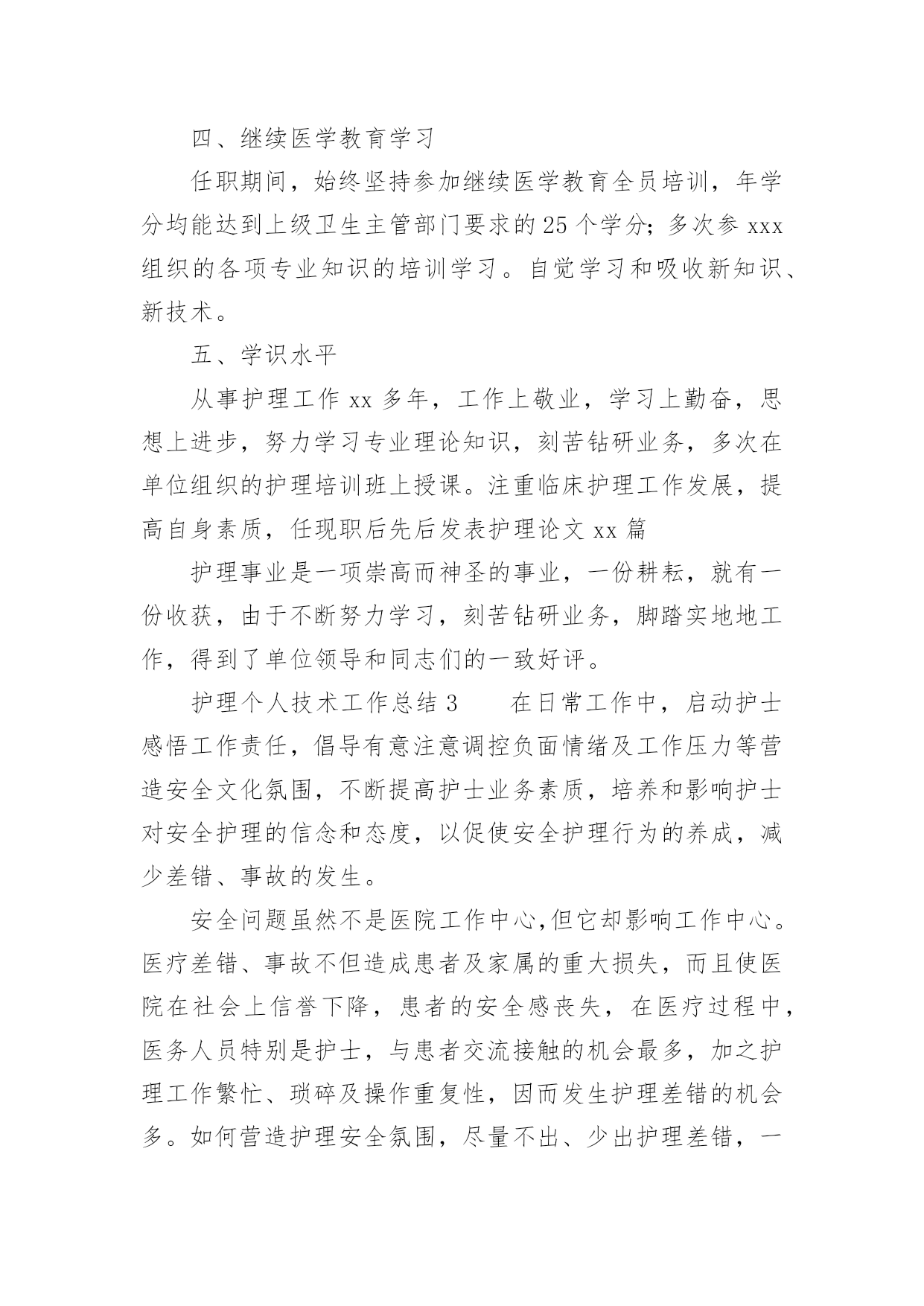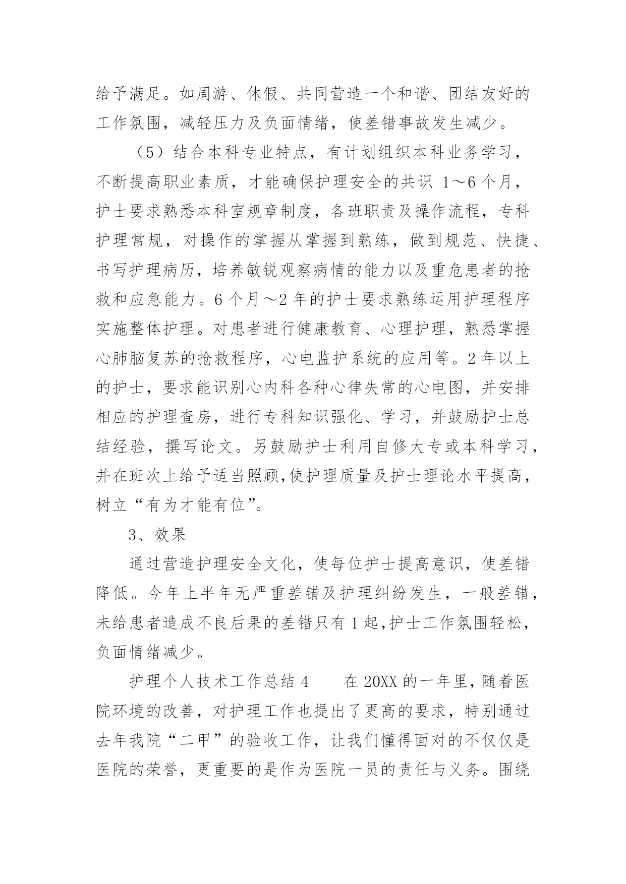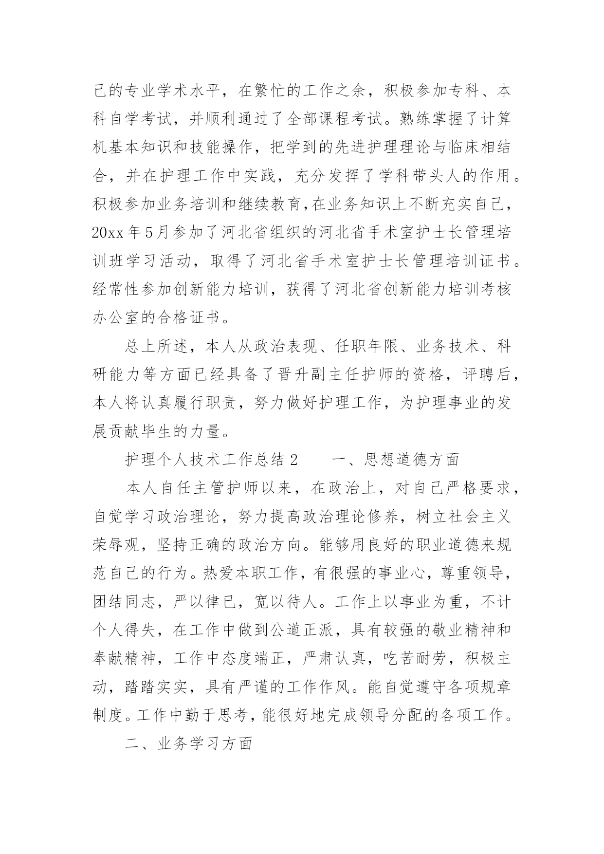 护理个人技术工作总结护理个人技术工作总结(通用5篇)时间是箭,去来迅疾,一段时间的工作已经告一段落,这段时间里,相信大家面临着许多挑战,也收获了许多成长,是时候仔细的写一份工作总结了。工作总结怎么写才能发挥它最大的作用呢?以下是小编收集整理的护理个人技术工作总结(通用5篇),希望能够帮助到大家。护理个人技术工作总结1本人1990年7月毕业于河北医学院邯郸分院护理专业,一直从事临床护理及管理工作至今,曾先后在外科和手术室做临床专业护士,为护理业务技术骨干,现在担任馆陶县人民医院手术室护士长。20xx年通过全国中级职称资格考试,20xx年3月晋升主管护师。20xx年6月获自学专科毕业证书,20xx年12月获自学本科毕业证书。现将本人任职以来工作情况总结如下:从事护理工作20年以来,热爱祖国,拥护共产党的领导,遵守国家法律法规,始终坚持党的路线、方针、政策,认真学习马列主义、毛泽东思想和邓小平理论以及“三个代表”重要思想,坚持以科学发展观为指导,不断提高自己的政治理论水平,积极参加各项政治活动,具有良好的职业道德和敬业精神。热爱护理专业,忠诚护理事业,勤于钻研护理业务,熟练掌握外科专科和手术室护理技术及各项护理技能,护理业务技术水平领先,业务技术年度多次考核优秀。坚持爱岗敬业,崇尚无私奉献,以良好的职业素质和道德修养服务于患者。尤其晋升主管护师以来,认真履行岗位职责,工作更加勤奋,积极进取,努力做好护理学科带头人,认真做好低年资护士和实习护士的指导、带教工作,勤于总结临床护理工作经验,积极探索、理论联系实际,先后积极撰写护理论文17篇,其中论文“试论手术室医院感染控制管理及对策探讨”在《白求恩军医学院学报》杂志上发表,有力的提高了手术室医院感染控制的管理;论文“人性化护理在手术室应用中的应用”在《中华护理杂志》杂志上发表,加强了人性化护理在手术室的应用;论文“试述手术室中易发生差错事故环节及其防范措施”在《中国健康月刊》杂志上发表,有力的减少了手术室差错事故的发生;论文“试论如何在细节上防范围术期护理安全问题”在《中华医学护理期刊》杂志上发表,提高了在细节上防范围术期护理安全的意识;论文“浅谈基层手术室工作的职业损伤和自身防护”在《现代护士进修杂志》杂志上发表,对手术室工作人员的职业损伤和自身防护起到了良好的作用。注重临床科研工作,参加完成了河北省继教课题省级登记号为20080072的“健脾补肾方配合艾灸治疗卵巢的早衰的临床研究”的研究课题,于20xx年3月获得河北省中医药学会的一等奖科技成果完成证书,荣获2007年度河北省中医药学会科学技术奖,并将科研应用于临床工作中,取得了良好的效果。在长期的临床护理工作中,始终坚持以南丁格尔精神为榜样,牢固树立了全心全意为患者服务的思想,工作中勇挑重担,不怕苦累,不为名利,任劳任怨,在2003年抗击非典的战斗中,一直工作在隔离观察病房,克服了重重困难,圆满完成各项工作任务,用自己艰辛的劳动、精湛的技术、高尚的职业道德、无私的奉献精神,塑造了良好的白衣天使形象。以强烈的事业心和责任感,勤奋学习,努力工作,在平凡而神圣的`护理工作中,发挥模范学科带头人的作用,为专科护士的培养、低年资的带教、临床护理工作的拓展做出了一定的成绩,得到领导的信任,同事的认可,患者的信赖,多次被评为院级优秀护士、卫生系统先进工作者、护理技术操作能手,20xx年连续四年被考核为优秀等级。20xx年3月荣获馆陶县“三八红旗手”,20xx年3月被评为全县卫生系统先进工作者,20xx年4月荣获馆陶县“新长征突击手”荣誉称号,20xx年6月被评为全县卫生系统先进工作者。在日常工作中,时刻牢记“以病人为中心”的服务宗旨,设身处地为病人着想,做到凡事都来换位思考“假如我是病人”。接待好每一个手术病人,做好每一项工作,关心每一个病人,当病人入手术室时,护士在手术室门口热情迎接,自我介绍,做好各项安抚工作,加强与病人沟通,减少病人对陌生环境的恐惧,增强对手术治疗的信心。护士长经常询问同事的工作技术,态度及病人的要求,对病人提出的意见和建议都能予以重视,及时解决。随着护理模式的转变,许多护理要求护士具备护理专业知识和相关人文综合知识。为适应护理学科的发展,提高自己的专业学术水平,在繁忙的工作之余,积极参加专科、本科自学考试,并顺利通过了全部课程考试。熟练掌握了计算机基本知识和技能操作,把学到的先进护理理论与临床相结合,并在护理工作中实践,充分发挥了学科带头人的作用。积极参加业务培训和继续教育,在业务知识上不断充实自己,20xx年5月参加了河北省组织的河北省手术室护士长管理培训班学习活动,取得了河北省手术室护士长管理培训证书。经常性参加创新能力培训,获得了河北省创新能力培训考核办公室的合格证书。总上所述,本人从政治表现、任职年限、业务技术