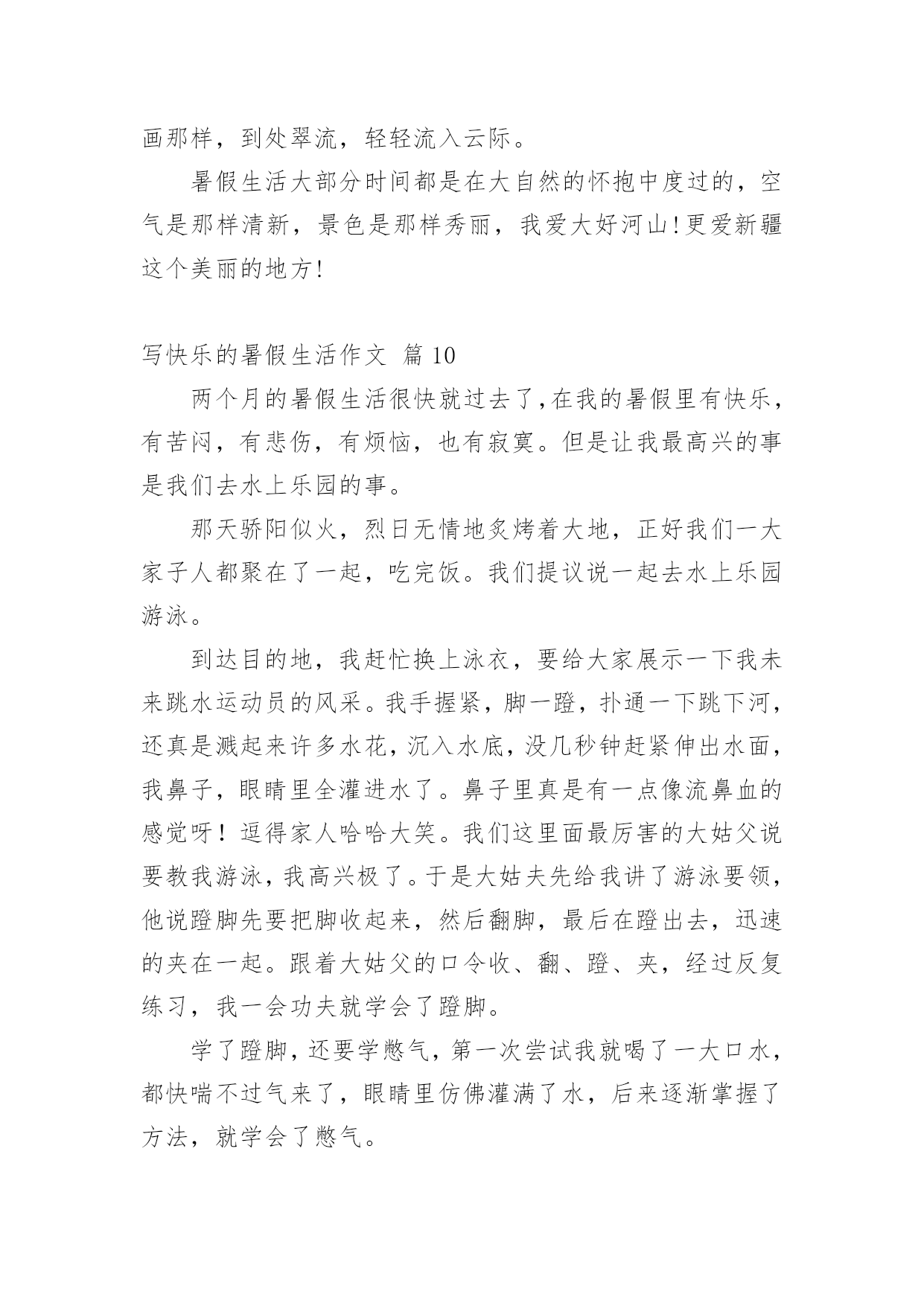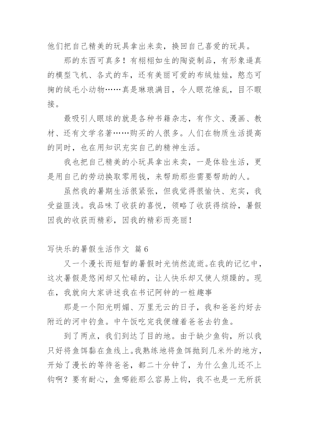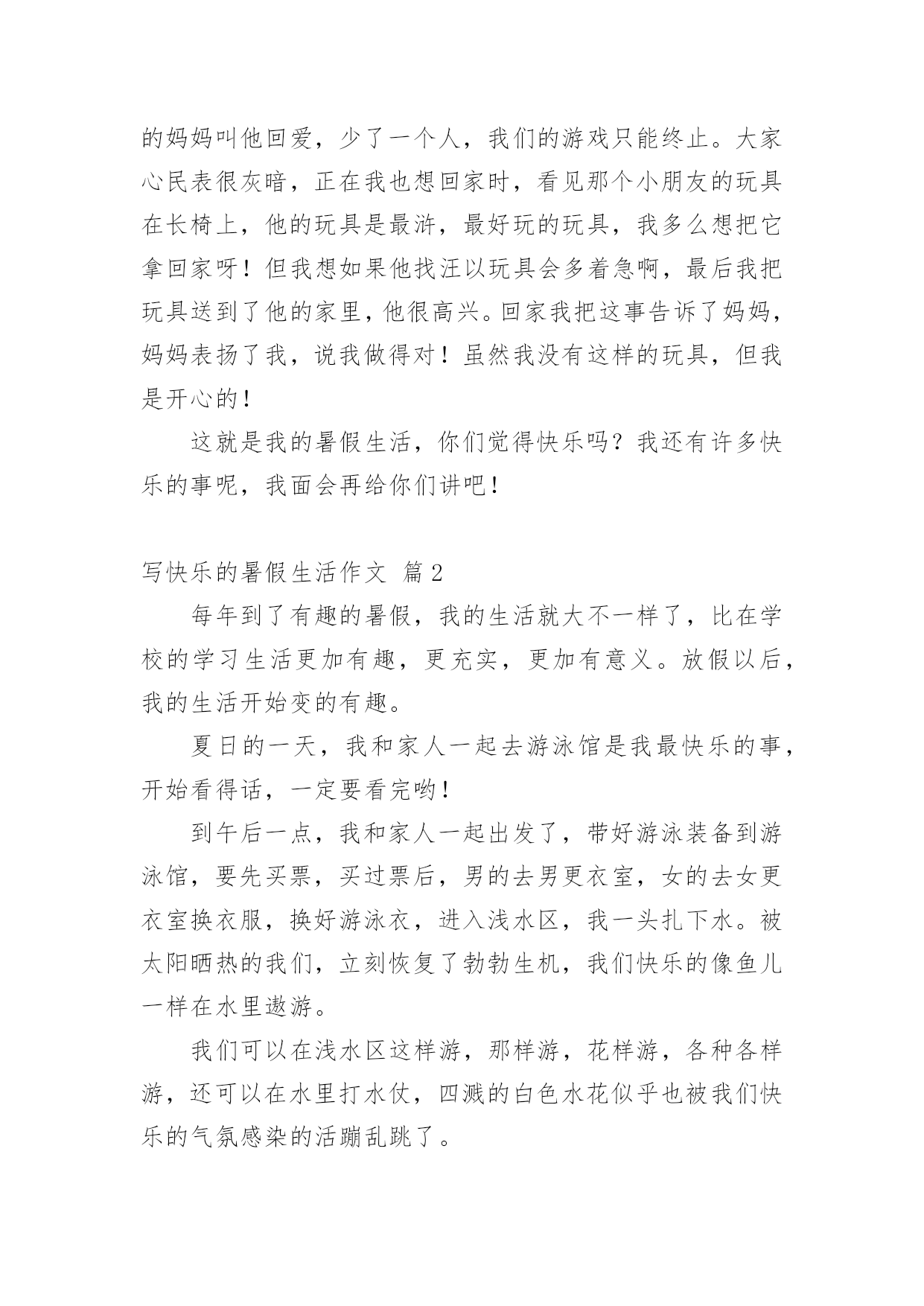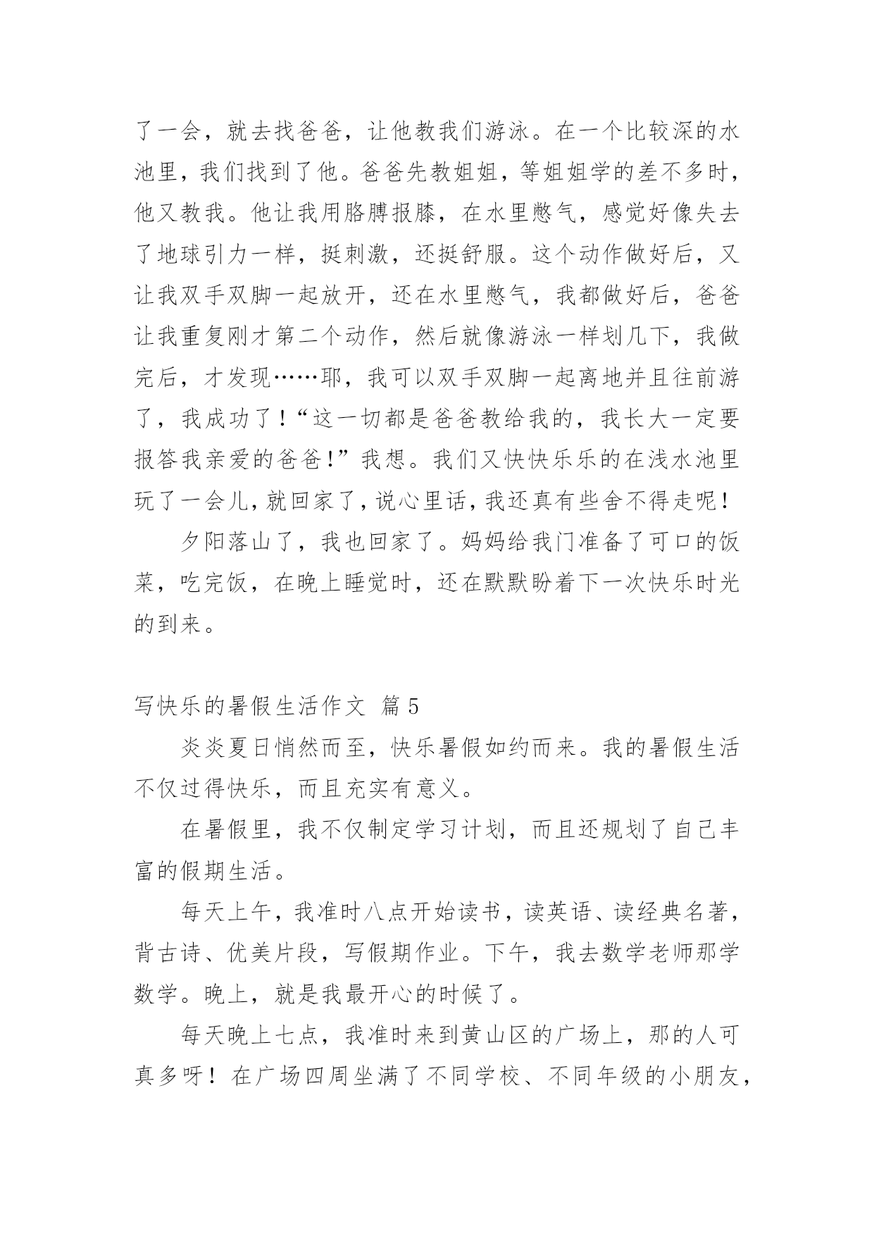 写快乐的暑假生活作文写快乐的暑假生活作文(精选61篇)在平凡的学习、工作、生活中,大家最不陌生的就是作文了吧,作文是由文字组成,经过人的思想考虑,通过语言组织来表达一个主题意义的文体。一篇什么样的作文才能称之为优秀作文呢?下面是小编整理的写快乐的暑假生活作文,欢迎阅读,希望大家能够喜欢。写快乐的暑假生活作文篇1我的暑假生活是快乐的,就让我来讲讲吧!每天早上我都和妈妈去公园跑步,有时想偷懒都不行!可别说,早上的空气真清新,各种花争芳斗艳,小鸟鸣唱……难怪锻炼的人这么多!就这样,我和妈妈也加入到晨炼的队伍中。我们有时赛跑,有时竞走……有一天早上,我和妈妈去柳湖公园散步,看见几个小朋友在草坪里玩,本来没我什么事儿,但我看见草坪里有一个牌子,上面写着“小草也会痛”我就对他们说:“你们看看牌子上写的什么字,如果你是小草,我站在你们头上踏踏,你们通吗?你们再踏小草,我就来踏你!”他们听了后一下就跑了。我心里美滋滋的!有时候我会和楼下的小朋友们玩,玩滑冰、骑车比赛、捉迷藏、玩具大战……有一次,我们玩玩具大战,正玩得高兴呢,一个小朋友的妈妈叫他回爱,少了一个人,我们的游戏只能终止。大家心民表很灰暗,正在我也想回家时,看见那个小朋友的玩具在长椅上,他的玩具是最浒,最好玩的玩具,我多么想把它拿回家呀!但我想如果他找汪以玩具会多着急啊,最后我把玩具送到了他的家里,他很高兴。回家我把这事告诉了妈妈,妈妈表扬了我,说我做得对!虽然我没有这样的玩具,但我是开心的!这就是我的暑假生活,你们觉得快乐吗?我还有许多快乐的事呢,我面会再给你们讲吧!写快乐的暑假生活作文篇2每年到了有趣的暑假,我的生活就大不一样了,比在学校的学习生活更加有趣,更充实,更加有意义。放假以后,我的生活开始变的有趣。夏日的一天,我和家人一起去游泳馆是我最快乐的事,开始看得话,一定要看完哟!到午后一点,我和家人一起出发了,带好游泳装备到游泳馆,要先买票,买过票后,男的去男更衣室,女的去女更衣室换衣服,换好游泳衣,进入浅水区,我一头扎下水。被太阳晒热的我们,立刻恢复了勃勃生机,我们快乐的像鱼儿一样在水里遨游。我们可以在浅水区这样游,那样游,花样游,各种各样游,还可以在水里打水仗,四溅的白色水花似乎也被我们快乐的气氛感染的活蹦乱跳了。充实的暑假生活。平时上学的时候,学习压力很大,我没有时间去做一些自己喜欢做的事情。暑假以后,我有大量的时间去发展我的兴趣和爱好。有时候早起的小鸟也过来凑热闹,暑假里我有计划的完成老师安排的每一项作业,并合理的安排我的娱乐时间,这样的生活让我感到无比的喜悦和欢乐。这就是我的暑假生活。写快乐的暑假生活作文篇3盼呀盼,终于盼到了放暑假,但离开了学校,离开了心爱的老师,离开了朝夕相处的同学,我的心里还真有点空荡荡的。今年的暑假与往年有所不同,培优训练大面积缩水,正规的办学机构相继取消了诸如奥数、作文、英语等培训项目,希望在暑期里充一下电的愿望成了泡影。为了让我的暑假生活过得快乐而又有意义,我想:去美丽的农村看看,走进自然,阅读自然。去那儿闻一闻泥土的芳香,呼吸一下新鲜的空气,见一见清澈的小河,看一看绿油油的植物,听一听爱唱歌的知了,逗一逗可爱的小猫小狗。积极参加由社区居委会组织的暑期实践活动,培养自己适应社会、了解社会能力。在实践中培养兴趣,在欢乐中燃起希望。多读几本好书。唐代诗人杜甫说:“读书破万卷,下笔如有神。”高尔基说:“书是人类进步的阶梯。”唯有博读,才能从书中饮其甘霖琼浆、尝其佳肴鲜羹,使思想得到教育、情操得到陶冶、知识得到增补。我要在熟读好书的同时,做好好词佳句的摘抄,并撰写好读书心得。参加钢笔书法兴趣班。老师说练字可以静心怡情,修身养性。它可以陶冶人的思想道德情操,可以提高人的审美鉴赏能力,可以培养人的严禁踏实作风。暑期时间较长,我要合理安排好假期中学习、休息和娱乐等生活。认真完成暑期作业,复习巩固学科知识。当然,我也要拍一些照片,用相机凝固美丽的瞬间,留下美好的回忆。我的想法不错吧,我要向着既定目标迈进,不折不扣地力争完成。写快乐的暑假生活作文篇4在骄阳似火的一天上午,我望着窗外,窗外晴空万里,没有一丝云彩,这么热的天哪里才凉快呢?我突发奇想:“为什么不到‘水上乐园’去玩玩呢?还可以让爸爸教我游泳哩!”爸爸回来后,经过我再三请求,他终于答应了。吃完午饭后,我打电话和姐姐约好后,在下午4点就顶着烈日开心而又激动的出发了。到了“水上乐园”,就忍不住向里看了看:呀,人可真多!我敢说,在这“水上乐园”,没有一平方米是没人的。我迫不及待的换了泳衣,跳进了一个游泳池。在游泳池里玩了一会,就去找爸爸,让他教我们游泳。在一个比较深的水池里,我们找到了他。爸爸先教姐姐,等姐姐学的差不多时,他又教我。他让我用胳膊报膝,在水里憋气,感觉好像失去了地球引力一样,挺刺激,还挺舒