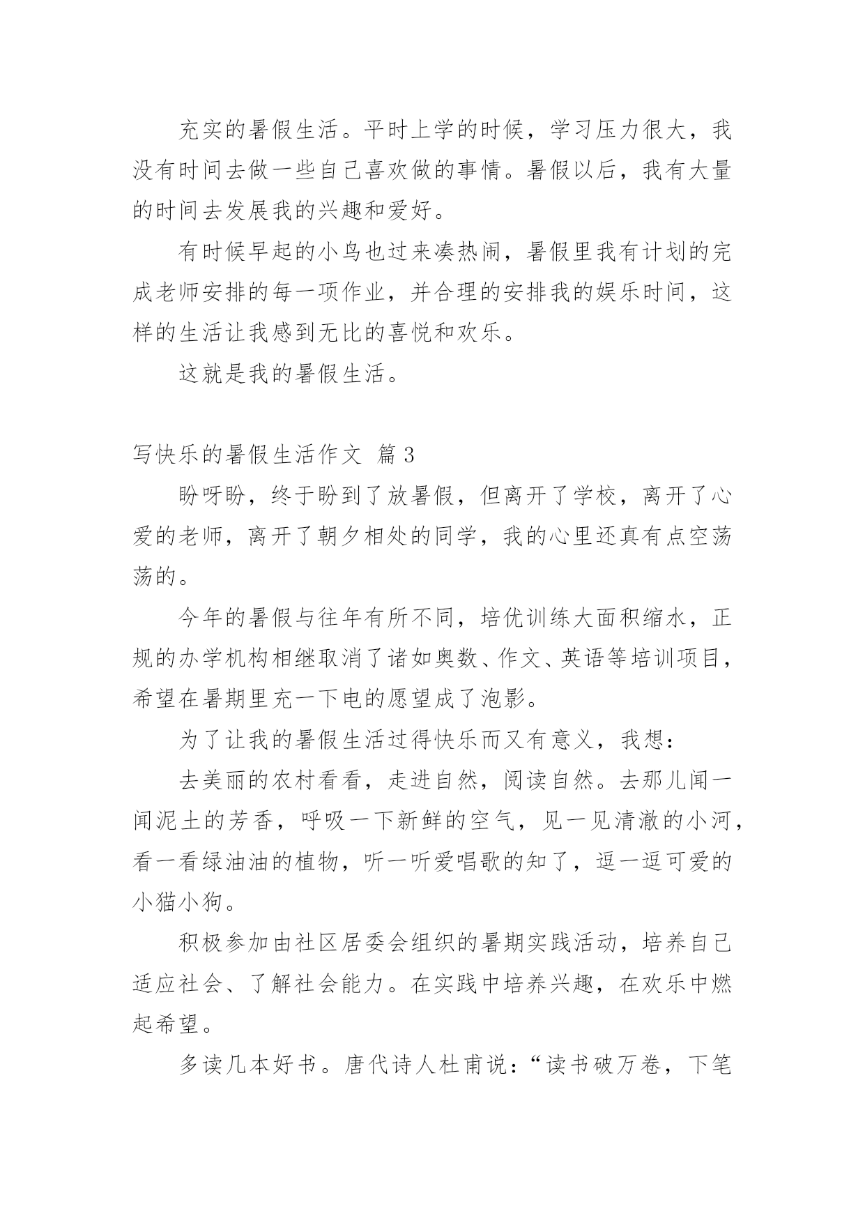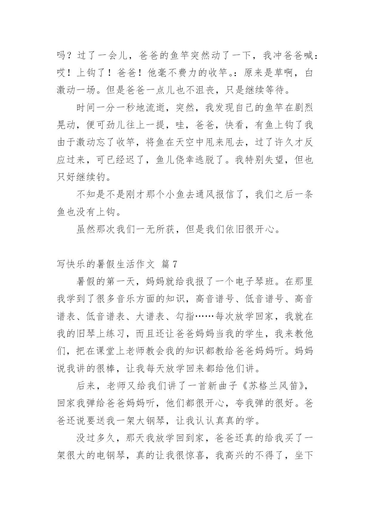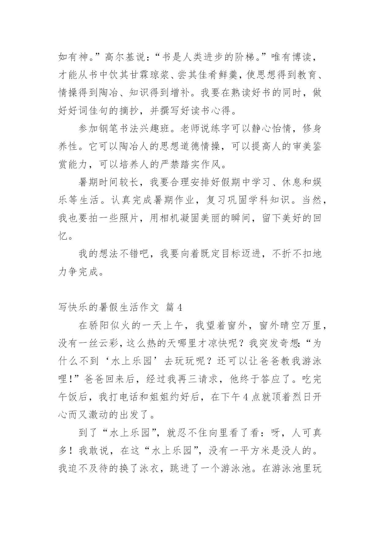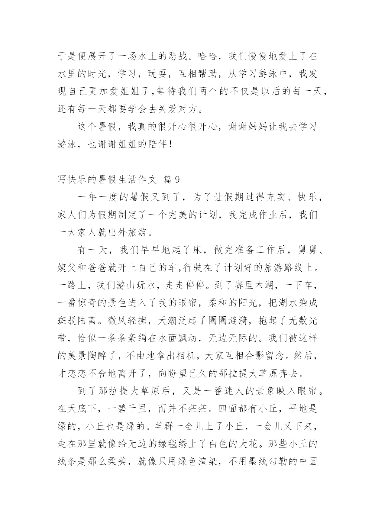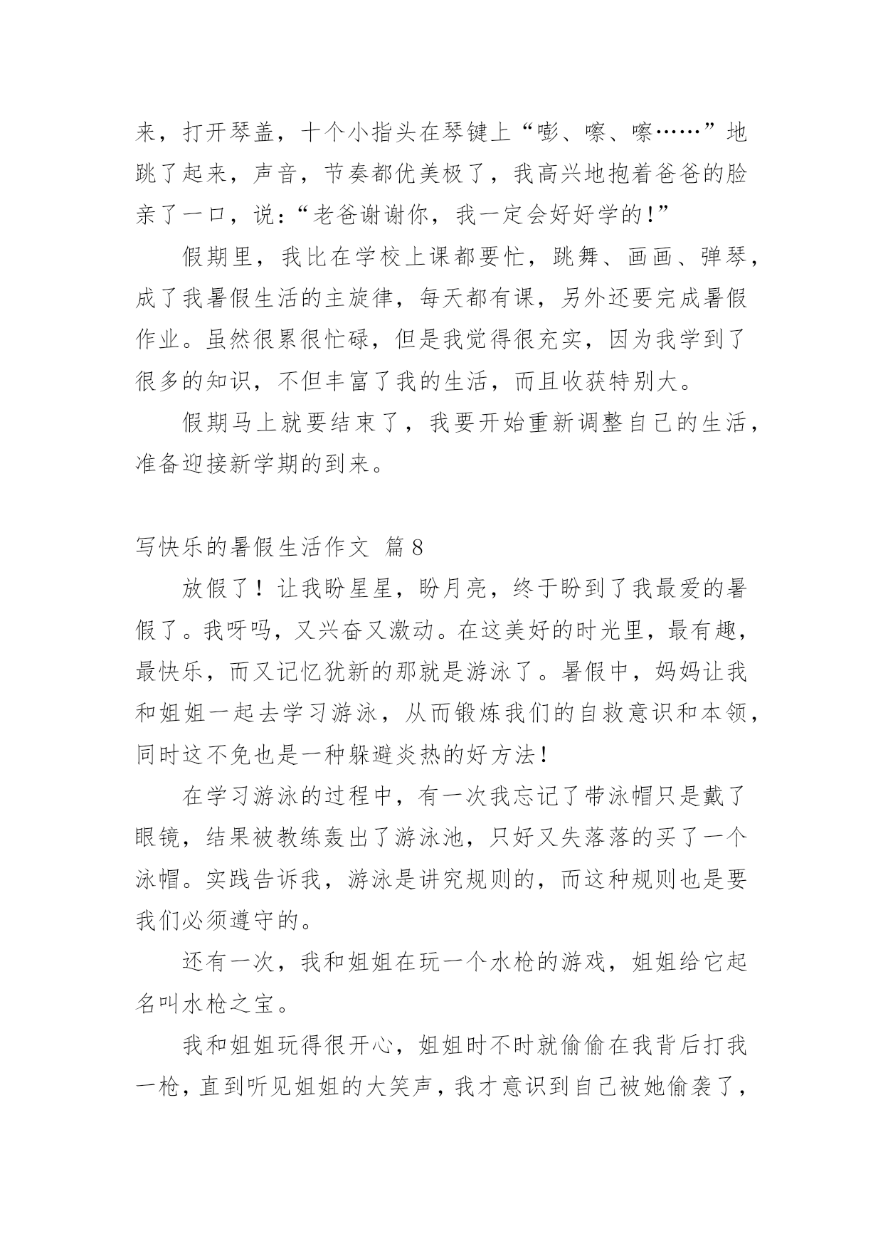 写快乐的暑假生活作文写快乐的暑假生活作文(精选61篇)在平凡的学习、工作、生活中,大家最不陌生的就是作文了吧,作文是由文字组成,经过人的思想考虑,通过语言组织来表达一个主题意义的文体。一篇什么样的作文才能称之为优秀作文呢?下面是小编整理的写快乐的暑假生活作文,欢迎阅读,希望大家能够喜欢。写快乐的暑假生活作文篇1我的暑假生活是快乐的,就让我来讲讲吧!每天早上我都和妈妈去公园跑步,有时想偷懒都不行!可别说,早上的空气真清新,各种花争芳斗艳,小鸟鸣唱……难怪锻炼的人这么多!就这样,我和妈妈也加入到晨炼的队伍中。我们有时赛跑,有时竞走……有一天早上,我和妈妈去柳湖公园散步,看见几个小朋友在草坪里玩,本来没我什么事儿,但我看见草坪里有一个牌子,上面写着“小草也会痛”我就对他们说:“你们看看牌子上写的什么字,如果你是小草,我站在你们头上踏踏,你们通吗?你们再踏小草,我就来踏你!”他们听了后一下就跑了。我心里美滋滋的!有时候我会和楼下的小朋友们玩,玩滑冰、骑车比赛、捉迷藏、玩具大战……有一次,我们玩玩具大战,正玩得高兴呢,一个小朋友的妈妈叫他回爱,少了一个人,我们的游戏只能终止。大家心民表很灰暗,正在我也想回家时,看见那个小朋友的玩具在长椅上,他的玩具是最浒,最好玩的玩具,我多么想把它拿回家呀!但我想如果他找汪以玩具会多着急啊,最后我把玩具送到了他的家里,他很高兴。回家我把这事告诉了妈妈,妈妈表扬了我,说我做得对!虽然我没有这样的玩具,但我是开心的!这就是我的暑假生活,你们觉得快乐吗?我还有许多快乐的事呢,我面会再给你们讲吧!写快乐的暑假生活作文篇2每年到了有趣的暑假,我的生活就大不一样了,比在学校的学习生活更加有趣,更充实,更加有意义。放假以后,我的生活开始变的有趣。夏日的一天,我和家人一起去游泳馆是我最快乐的事,开始看得话,一定要看完哟!到午后一点,我和家人一起出发了,带好游泳装备到游泳馆,要先买票,买过票后,男的去男更衣室,女的去女更衣室换衣服,换好游泳衣,进入浅水区,我一头扎下水。被太阳晒热的我们,立刻恢复了勃勃生机,我们快乐的像鱼儿一样在水里遨游。我们可以在浅水区这样游,那样游,花样游,各种各样游,还可以在水里打水仗,四溅的白色水花似乎也被我们快乐的气氛感染的活蹦乱跳了。充实的暑假生活。平时上学的时候,学习压力很大,我没有时间去做一些自己喜欢做的事情。暑假以后,我有大量的时间去发展我的兴趣和爱好。有时候早起的小鸟也过来凑热闹,暑假里我有计划的完成老师安排的每一项作业,并合理的安排我的娱乐时间,这样的生活让我感到无比的喜悦和欢乐。这就是我的暑假生活。写快乐的暑假生活作文篇3盼呀盼,终于盼到了放暑假,但离开了学校,离开了心爱的老师,离开了朝夕相处的同学,我的心里还真有点空荡荡的。今年的暑假与往年有所不同,培优训练大面积缩水,正规的办学机构相继取消了诸如奥数、作文、英语等培训项目,希望在暑期里充一下电的愿望成了泡影。为了让我的暑假生活过得快乐而又有意义,我想:去美丽的农村看看,走进自然,阅读自然。去那儿闻一闻泥土的芳香,呼吸一下新鲜的空气,见一见清澈的小河,看一看绿油油的植物,听一听爱唱歌的知了,逗一逗可爱的小猫小狗。积极参加由社区居委会组织的暑期实践活动,培养自己适应社会、了解社会能力。在实践中培养兴趣,在欢乐中燃起希望。多读几本好书。唐代诗人杜甫说:“读书破万卷,下笔如有神。”高尔基说:“书是人类进步的阶梯。”唯有博读,才能从书中饮其甘霖琼浆、尝其佳肴鲜羹,使思想得到教育、情操得到陶冶、知识得到增补。我要在熟读好书的同时,做好好词佳句的摘抄,并撰写好读书心得。参加钢笔书法兴趣班。老师说练字可以静心怡情,修身养性。它可以陶冶人的思想道德情操,可以提高人的审美鉴赏能力,可以培养人的严禁踏实作风。暑期时间较长,我要合理安排好假期中学习、休息和娱乐等生活。认真完成暑期作业,复习巩固学科知识。当然,我也要拍一些照片,用相机凝固美丽的瞬间,留下美好的回忆。我的想法不错吧,我要向着既定目标迈进,不折不扣地力争完成。写快乐的暑假生活作文篇4在骄阳似火的一天上午,我望着窗外,窗外晴空万里,没有一丝云彩,这么热的天哪里才凉快呢?我突发奇想:“为什么不到‘水上乐园’去玩玩呢?还可以让爸爸教我游泳哩!”爸爸回来后,经过我再三请求,他终于答应了。吃完午饭后,我打电话和姐姐约好后,在下午4点就顶着烈日开心而又激动的出发了。到了“水上乐园”,就忍不住向里看了看:呀,人可真多!我敢说,在这“水上乐园”,没有一平方米是没人的。我迫不及待的换了泳衣,跳进了一个游泳池。在游泳池里玩了一会,就去找爸爸,让他教我们游泳。在一个比较深的水池里,我们找到了他。爸爸先教姐姐,等姐姐学的差不多时,他又教我。他让我用胳膊报膝,在水里憋气,感觉好像失去了地球引力一样,挺刺激,还挺舒