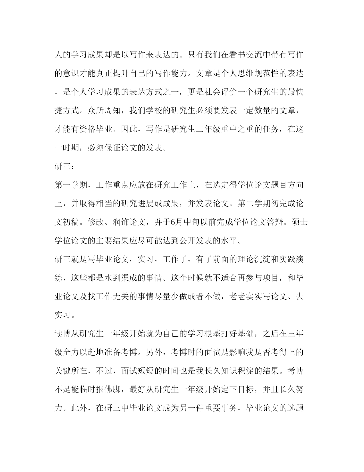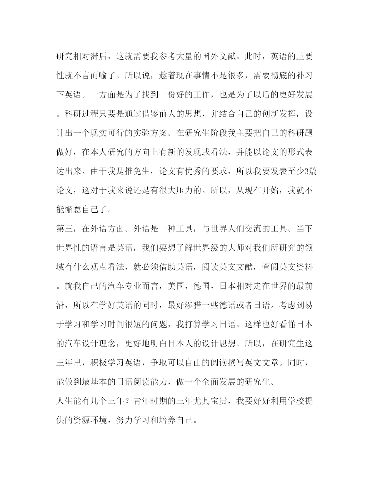 PAGE此资料由网络收集而来,如有侵权请告知上传者立即删除。资料共分享,我们负责传递知识。研究生学习计划(共3篇)下面由作者为你提供研究生学习计划的写法。作为一名推免生,我省去了别人的考研寒窗苦读,但是也失去了很多考研的乐趣。由于不用复习数学知识,现在感觉数学明显没有经过考研训练的同学记住的多。现在遇到很多知识还要重头再翻书复习一遍!感觉好像在补偿没有考研的损失。我现在已经成为了一名真正的研究生,已经逐渐的适应了研究生的生活,大学四年转瞬即逝,研究生的三年也并没有大多数人想象的那么长,这个期间是我们人生和事业的关键期,有许多重要的任务需要我们在这个阶段完成或奠定一个好的基础。这就需要我制定一个研究生期间的整体生涯规划,给自己规定目标和任务,并在实践中不断的摸索并加以改进,尽可能的完成计划中得各项任务。希望在三年后我回首的时候,可以自豪的说,我是一名合格的硕士。首先,在课程学习方面。研一时候开设的课程是为我们打基础的,只有基础牢固了,我们今后在科研的道路上才会走的稳,走的远。现在我们的课程分为学位课和公共课,学位课是与我们的专业有关的,是我们今后研究的理论基础,所以在研一的时候我要把每一门学位课学好,认真思考课程理论的现实意义,融会贯通,学有所用。尤其是数学课程,和我的专业研究方向有莫大关系,掌握好数学工具是以后进一步研究的根本所在。公共课主要是政治内容的,包含自然辩证法和中国特色社会主义等内容。马克思主义是我们学习、研究与工作的基本指导思想。要重视理论学习课,不要当成负担,也不要只当作拿学分的途径,而要真正地去学,学有所得,学有所用。给我们讲授自然辩证法的钱老师,人生阅历、科研经历都很丰富。他用其独特的方式把自然辩证法这门政治基础课讲成了物理课,让我懂得了phd的真实含义。任何学者都应以获得phd为其奋斗目标。只有研究基础课程,并且获得极大成功的,才算得上是科学史上的菁英人才。所以,在研一的期间我会上好每一堂课,以课程学习为主。此外,还应该积极阅读文献,并开始尝试写出1-2篇文献综述报告。上星期,左老师给我定了研究生的方向——消防车管道的流固耦合分析。目前国内这方面的研究相对较少,比之国外,也落后了很多年。这几天,空余时间,我就会向师兄学习adina软件,师兄给了很多资料,现在要考试了,暂时没有时间看。等过一阵子,我将仔细研究下这方面的文献。其次,在科研方面。研二以后我们将完全开始自己的科研计划。这个时候需要自己制定科研计划,实施具体操作。由于之前我已经提前学习了这方面的知识,接手起来应该会相对容易些。但是,由于国内的研究相对滞后,这就需要我参考大量的国外文献。此时,英语的重要性就不言而喻了。所以说,趁着现在事情不是很多,需要彻底的补习下英语。一方面是为了找到一份好的工作,也是为了以后的更好发展。科研过程只要是通过借鉴前人的思想,并结合自己的创新发挥,设计出一个现实可行的实验方案。在研究生阶段我主要把自己的科研题做好,在本人研究的方向上有新的发现或看法,并能以论文的形式表达出来。由于我是推免生,论文有优秀的要求,所以我要发表至少3篇论文,这对于我来说还是有很大压力的。所以,从现在开始,我就不能懈怠自己了。第三,在外语方面。外语是一种工具,与世界人们交流的工具。当下世界性的语言是英语,我们要想了解世界级的大师对我们所研究的领域有什么观点看法,就必须借助英语,阅读英文文献,查阅英文资料。就我自己的汽车专业而言,美国,德国,日本相对走在世界的最前沿,所以在学好英语的同时,最好涉猎一些德语或者日语。考虑到易于学习和学习时间很短的问题,我打算学习日语。这样也好看懂日本的汽车设计理念,更好地明白日本人的设计思想。所以,在研究生这三年里,积极学习英语,争取可以自由的阅读撰写英文文章。同时,能做到最基本的日语阅读能力,做一个全面发展的研究生。人生能有几个三年?青年时期的三年尤其宝贵,我要好好利用学校提供的资源环境,努力学习和培养自己。这篇研究生学习计划范文是我们精心挑选的,但原对你有参考作用。进入研究生阶段,感觉和本科学习有相当大的差别。走进研究生学习新阶段,我必须以端正的学习态度,正确的学习方法迎接新的生活。我将尝试着跨领域学习、研究,主动学习各方面知识,积极创新,不断进取,希望研究生三年生涯中所得所获将成为我人生中又一宝贵财富。我认为做好计划是极其重要的。我计划通过研究生三年的学习时间,在学习掌握专业知识的基础上,努力掌握专业学科之外的广阔领域的相关知识体系,全面提高自己的综合能力水平。同时,与专业领域带头人及各导师保持良好的关系,为以后职业生涯事业的发展打下坚实的基础。此外,健康的身体状况是学习者取得成果的前提条件。因此,坚持锻炼身体,提高身体素质,为以后的学习生活提供强有力的保障。特将三年学习时