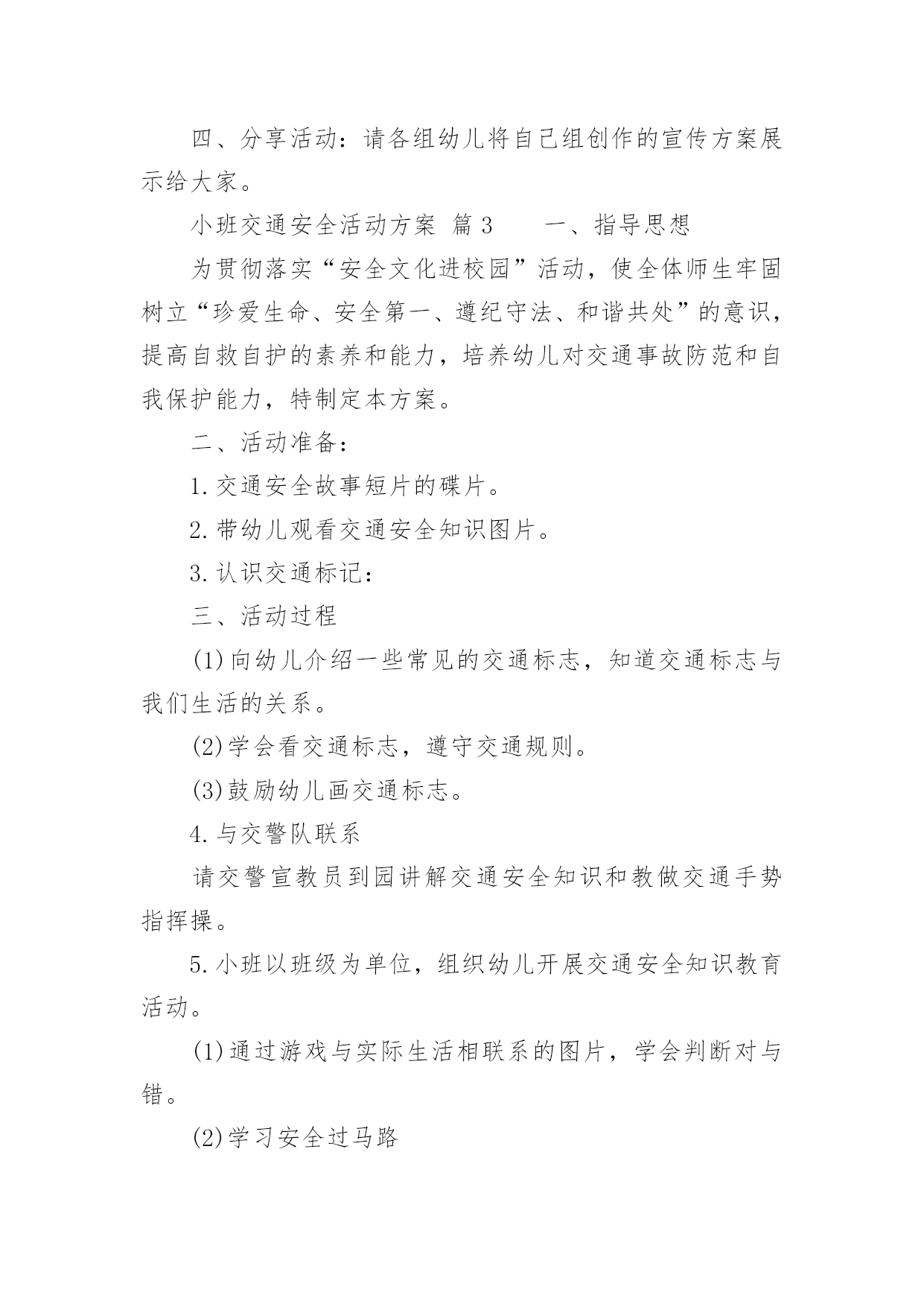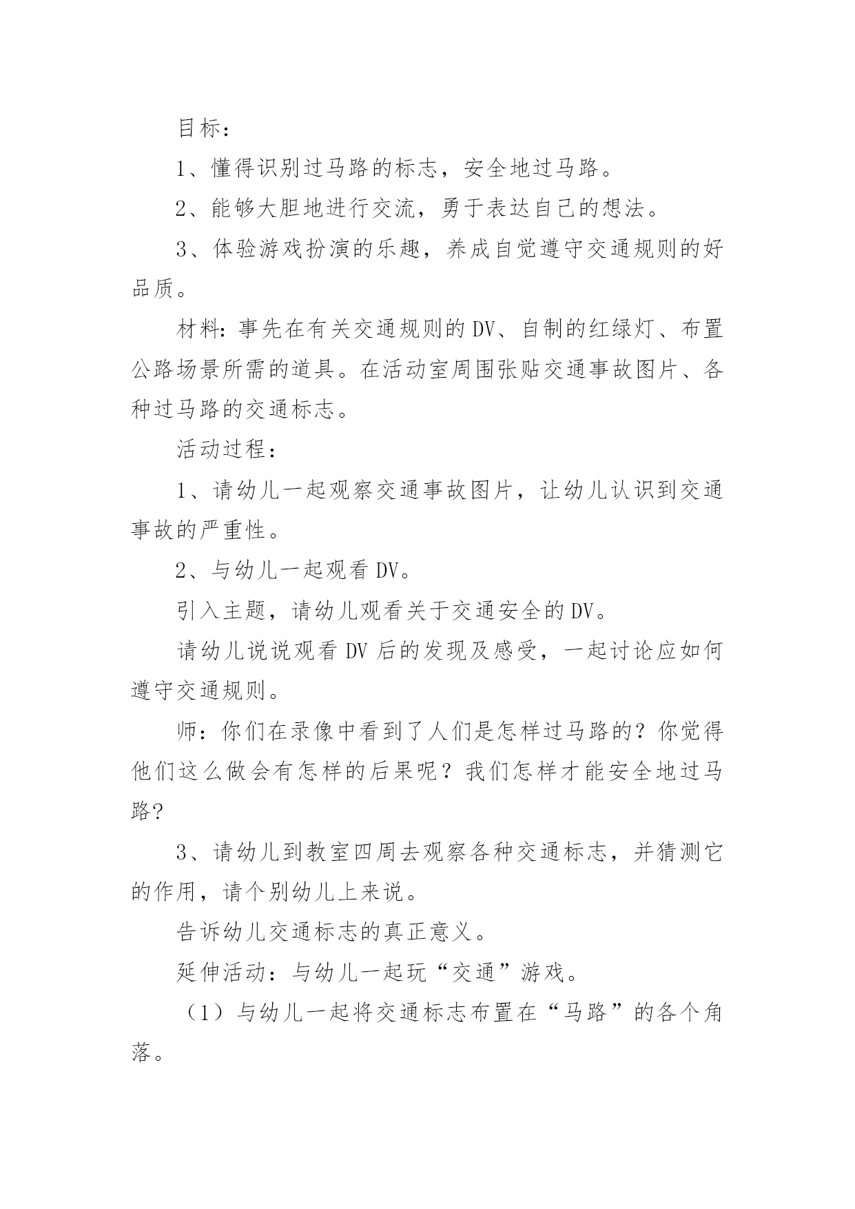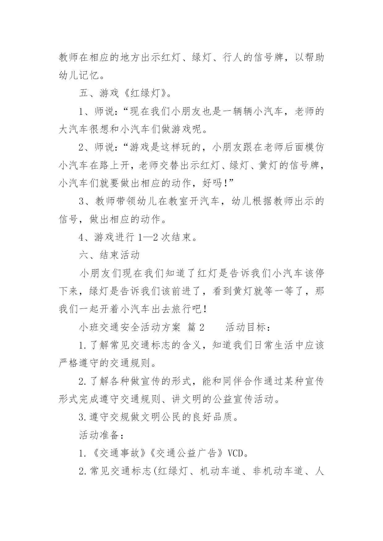 小班交通安全活动方案小班交通安全活动方案(精选20篇)为有力保证活动开展的质量水平,常常需要预先制定活动方案,活动方案是为某一活动所制定的,包括具体行动实施办法细则,步骤等。那么应当如何制定活动方案呢?以下是小编帮大家整理的小班交通安全活动方案,供大家参考借鉴,希望可以帮助到有需要的朋友。小班交通安全活动方案篇1活动目标:1、通过学习儿歌和玩游戏《红绿灯》知道汽车、行人在马路上要遵守交通规则,听从红灯绿灯的指挥。2、在学习儿歌的基础上,能在红绿灯的游戏中能较灵敏的根据信号做动作,体验模仿游戏的快乐。3、使小朋友们感到快乐、好玩,在不知不觉中应经学习了知识。4、遵守社会行为规则,不做“禁止”的事。5、探索、发现生活中的多样性及特征。活动准备:小汽车图片、红、绿、黄信号灯活动过程:一、小汽车出门小朋友,今天老师给你们请一位客人你们看是谁?这辆小汽车叫嘀嘀,他第一次出门,对所有的事物都觉得很新奇。它看到马路上、大街上这么热闹,开心的嘀嘀直叫。它一会开到东,一会开到西,可自由了。忽然它看到大街上有样东西总是不停地眨眼睛,觉得非常奇怪。你们能告诉它这是什么东西吗?(导入红绿灯)二、认识红绿灯1、师说:“你在哪里见过它?它有什么用?老师总结:对,一般马路上的十字路口通常都有红绿灯。红绿灯和交警叔叔差不多是一样的,都是来管理交通的。马路上的红绿灯是为了让马路上的车子有秩序地行进,不发生危险。2、师说:“今天我们就要来认识一下马路上会眨眼的红绿灯,好吗?”它有几种颜色?(一般都有三种颜色:红色、绿色和黄色)3、认识红灯——你们知道红灯眨眼睛,是告诉我们什么?(幼儿自由讲述)——哦。原来是要告诉我们行人和开汽车的司机该停下来了。4、认识绿灯——你们知道绿灯眨眼睛,是告诉我们什么?(幼儿自由讲述)——原来呀,绿灯是要告诉我们,该前进了。5、认识黄灯——你们知道黄灯眨眼睛,又是告诉我们什么?(幼儿自由讲述)——原来呀,黄灯亮时,要停下来等一等,如果已经走在马路上,就要加快脚步赶紧走到马路对面去。三、懂得红绿灯的作用1、师说:“如果没有红绿灯会怎样?(小朋友过马路的时候很危险;汽车和汽车之间也很容易发生危险)”2、小汽车不认识红绿灯,这样在马路上乱开行吗?3、师说:“所以我们一起帮助小汽车想一个办法,好吗?(幼儿自由说说)”4、师说:“老师想到了一个办法,这里有一首儿歌,可以帮助小汽车。我们一起念给小汽车听吧!”——教师朗诵儿歌一遍。5、小汽车看到红灯、绿灯是怎么做的?看到黄灯是怎么做的?(教师用肢体表演引导幼儿自由讲述)四、出示信号牌,学念儿歌1、教师分别出示红灯、绿灯、黄灯的信号牌,请幼儿在座位上分别作出停车、开车、准备的动作。教师先示范。——师说:“老师这儿呢,有三块信号牌,因为我怕小汽车搞不清楚,特地请小朋友和老师一起来帮助小汽车认识红绿灯,好吗?”——师说:“现在我先和小朋友一起来试试这三个信号灯应该做出怎么样的动作?”(边念儿歌边做动作)幼儿操作——师说:“接下来请小朋友来表现了!”幼儿学念儿歌,教师在相应的地方出示红灯、绿灯、行人的信号牌,以帮助幼儿记忆。五、游戏《红绿灯》。1、师说:“现在我们小朋友也是一辆辆小汽车,老师的大汽车很想和小汽车们做游戏呢。2、师说:“游戏是这样玩的,小朋友跟在老师后面模仿小汽车在路上开,老师交替出示红灯、绿灯、黄灯的信号牌,小汽车们就要做出相应的动作,好吗!”3、教师带领幼儿在教室开汽车,幼儿根据教师出示的信号,做出相应的动作。4、游戏进行1—2次结束。六、结束活动小朋友们现在我们知道了红灯是告诉我们小汽车该停下来,绿灯是告诉我们该前进了,看到黄灯就等一等了,那我们一起开着小汽车出去旅行吧!小班交通安全活动方案篇2活动目标:1.了解常见交通标志的含义,知道我们日常生活中应该严格遵守的交通规则。2.了解各种做宣传的形式,能和同伴合作通过某种宣传形式完成遵守交通规则、讲文明的公益宣传活动。3.遵守交规做文明公民的良好品质。活动准备:1.《交通事故》《交通公益广告》VCD。2.常见交通标志(红绿灯、机动车道、非机动车道、人行横道等)3.旧挂历、纸箱、皱纹纸等废旧物品。活动过程:一、观看VCD,了解遵守交通规则的重要性。教师小结:我们都知道了要遵守交通规则才能保证我们每一个人的生命安全,使我们的道路交通更有秩序,使我们社会更文明。二、讨论活动:我们应遵守哪些交通规则?1、引出讨论话题。教师:最近我们全社会都在讲文明、树新风,我们应该懂得守交规、讲文明,做文明公民,那么,我们应该遵守哪些交通规则呢?2、幼儿讨论:我们应该遵守的交通规则。教师引导幼儿分别讨论行人、非机动车辆、机动车辆应遵守的交规。3、认识交通标志:机动车道、非机动车道、人行横道、停车场、禁止停车、红绿灯。三、实践活动:小小交通宣传员。1.讨论:我