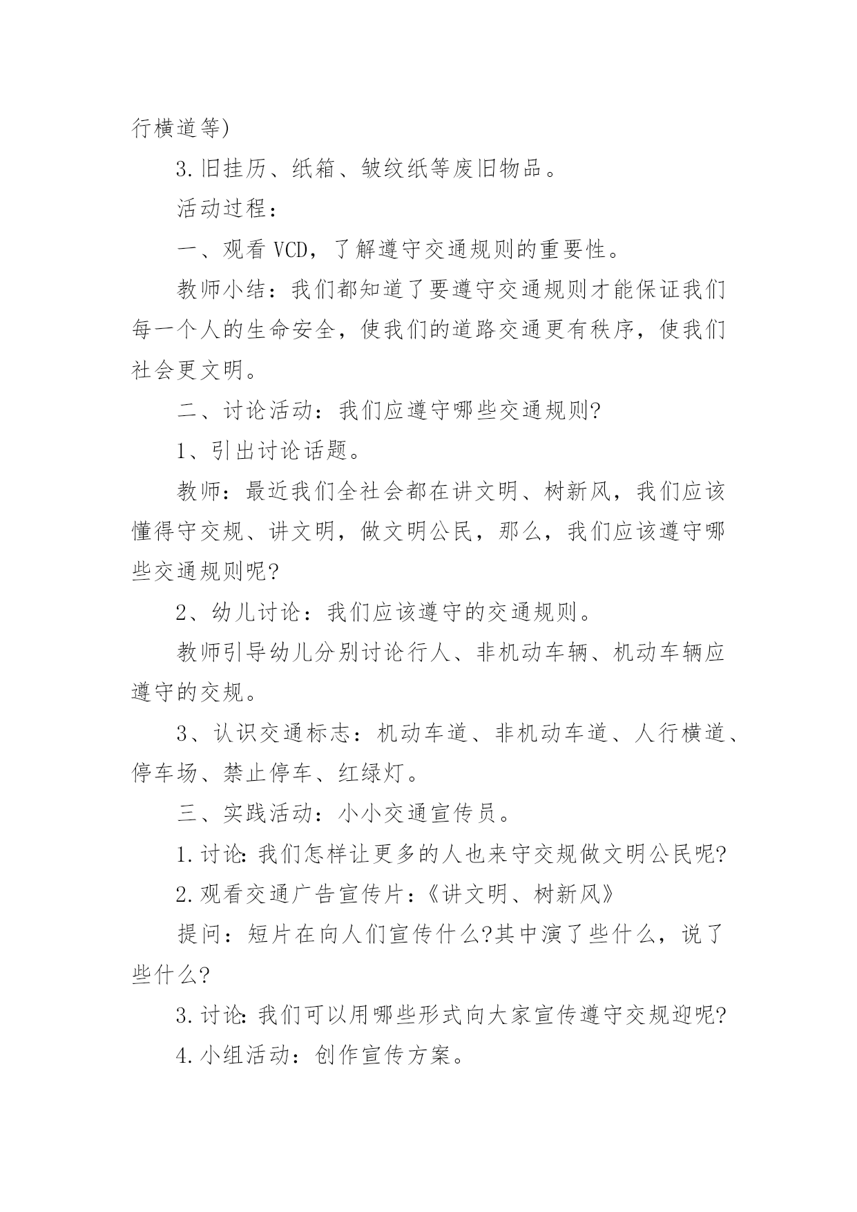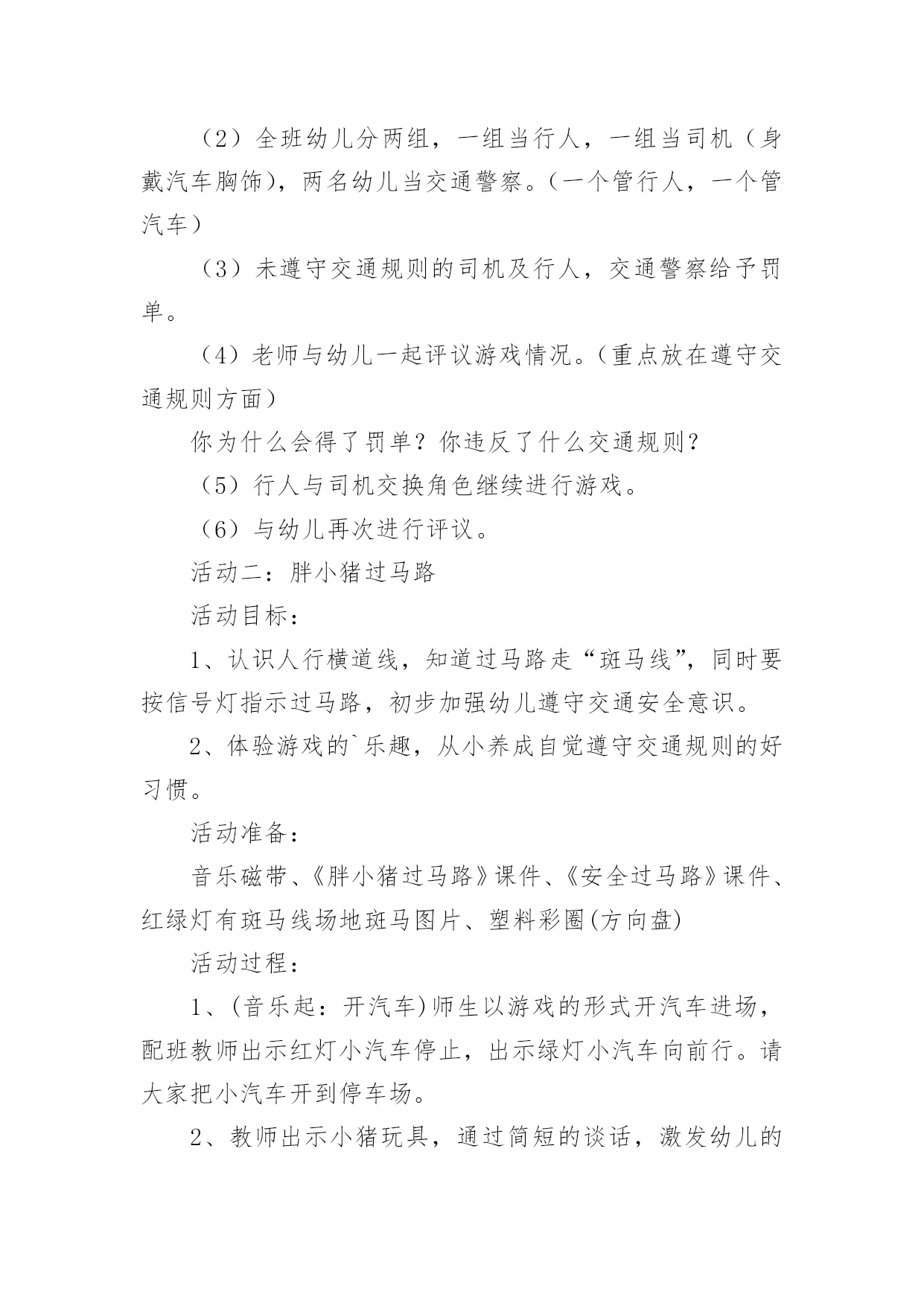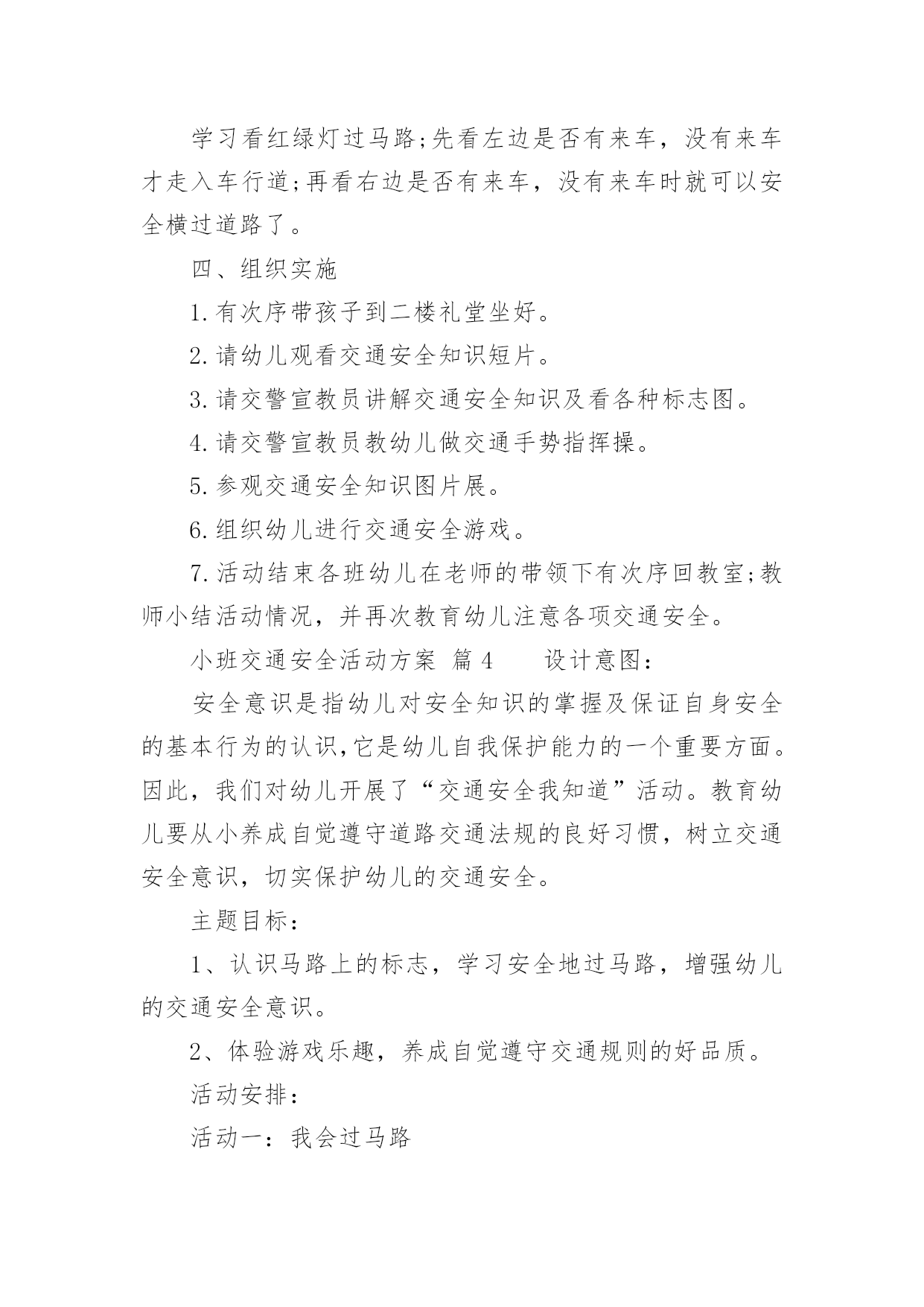 小班交通安全活动方案小班交通安全活动方案(精选20篇)为有力保证活动开展的质量水平,常常需要预先制定活动方案,活动方案是为某一活动所制定的,包括具体行动实施办法细则,步骤等。那么应当如何制定活动方案呢?以下是小编帮大家整理的小班交通安全活动方案,供大家参考借鉴,希望可以帮助到有需要的朋友。小班交通安全活动方案篇1活动目标:1、通过学习儿歌和玩游戏《红绿灯》知道汽车、行人在马路上要遵守交通规则,听从红灯绿灯的指挥。2、在学习儿歌的基础上,能在红绿灯的游戏中能较灵敏的根据信号做动作,体验模仿游戏的快乐。3、使小朋友们感到快乐、好玩,在不知不觉中应经学习了知识。4、遵守社会行为规则,不做“禁止”的事。5、探索、发现生活中的多样性及特征。活动准备:小汽车图片、红、绿、黄信号灯活动过程:一、小汽车出门小朋友,今天老师给你们请一位客人你们看是谁?这辆小汽车叫嘀嘀,他第一次出门,对所有的事物都觉得很新奇。它看到马路上、大街上这么热闹,开心的嘀嘀直叫。它一会开到东,一会开到西,可自由了。忽然它看到大街上有样东西总是不停地眨眼睛,觉得非常奇怪。你们能告诉它这是什么东西吗?(导入红绿灯)二、认识红绿灯1、师说:“你在哪里见过它?它有什么用?老师总结:对,一般马路上的十字路口通常都有红绿灯。红绿灯和交警叔叔差不多是一样的,都是来管理交通的。马路上的红绿灯是为了让马路上的车子有秩序地行进,不发生危险。2、师说:“今天我们就要来认识一下马路上会眨眼的红绿灯,好吗?”它有几种颜色?(一般都有三种颜色:红色、绿色和黄色)3、认识红灯——你们知道红灯眨眼睛,是告诉我们什么?(幼儿自由讲述)——哦。原来是要告诉我们行人和开汽车的司机该停下来了。4、认识绿灯——你们知道绿灯眨眼睛,是告诉我们什么?(幼儿自由讲述)——原来呀,绿灯是要告诉我们,该前进了。5、认识黄灯——你们知道黄灯眨眼睛,又是告诉我们什么?(幼儿自由讲述)——原来呀,黄灯亮时,要停下来等一等,如果已经走在马路上,就要加快脚步赶紧走到马路对面去。三、懂得红绿灯的作用1、师说:“如果没有红绿灯会怎样?(小朋友过马路的时候很危险;汽车和汽车之间也很容易发生危险)”2、小汽车不认识红绿灯,这样在马路上乱开行吗?3、师说:“所以我们一起帮助小汽车想一个办法,好吗?(幼儿自由说说)”4、师说:“老师想到了一个办法,这里有一首儿歌,可以帮助小汽车。我们一起念给小汽车听吧!”——教师朗诵儿歌一遍。5、小汽车看到红灯、绿灯是怎么做的?看到黄灯是怎么做的?(教师用肢体表演引导幼儿自由讲述)四、出示信号牌,学念儿歌1、教师分别出示红灯、绿灯、黄灯的信号牌,请幼儿在座位上分别作出停车、开车、准备的动作。教师先示范。——师说:“老师这儿呢,有三块信号牌,因为我怕小汽车搞不清楚,特地请小朋友和老师一起来帮助小汽车认识红绿灯,好吗?”——师说:“现在我先和小朋友一起来试试这三个信号灯应该做出怎么样的动作?”(边念儿歌边做动作)幼儿操作——师说:“接下来请小朋友来表现了!”幼儿学念儿歌,教师在相应的地方出示红灯、绿灯、行人的信号牌,以帮助幼儿记忆。五、游戏《红绿灯》。1、师说:“现在我们小朋友也是一辆辆小汽车,老师的大汽车很想和小汽车们做游戏呢。2、师说:“游戏是这样玩的,小朋友跟在老师后面模仿小汽车在路上开,老师交替出示红灯、绿灯、黄灯的信号牌,小汽车们就要做出相应的动作,好吗!”3、教师带领幼儿在教室开汽车,幼儿根据教师出示的信号,做出相应的动作。4、游戏进行1—2次结束。六、结束活动小朋友们现在我们知道了红灯是告诉我们小汽车该停下来,绿灯是告诉我们该前进了,看到黄灯就等一等了,那我们一起开着小汽车出去旅行吧!小班交通安全活动方案篇2活动目标:1.了解常见交通标志的含义,知道我们日常生活中应该严格遵守的交通规则。2.了解各种做宣传的形式,能和同伴合作通过某种宣传形式完成遵守交通规则、讲文明的公益宣传活动。3.遵守交规做文明公民的良好品质。活动准备:1.《交通事故》《交通公益广告》VCD。2.常见交通标志(红绿灯、机动车道、非机动车道、人行横道等)3.旧挂历、纸箱、皱纹纸等废旧物品。活动过程:一、观看VCD,了解遵守交通规则的重要性。教师小结:我们都知道了要遵守交通规则才能保证我们每一个人的生命安全,使我们的道路交通更有秩序,使我们社会更文明。二、讨论活动:我们应遵守哪些交通规则?1、引出讨论话题。教师:最近我们全社会都在讲文明、树新风,我们应该懂得守交规、讲文明,做文明公民,那么,我们应该遵守哪些交通规则呢?2、幼儿讨论:我们应该遵守的交通规则。教师引导幼儿分别讨论行人、非机动车辆、机动车辆应遵守的交规。3、认识交通标志:机动车道、非机动车道、人行横道、停车场、禁止停车、红绿灯。三、实践活动:小小交通宣传员。1.讨论:我