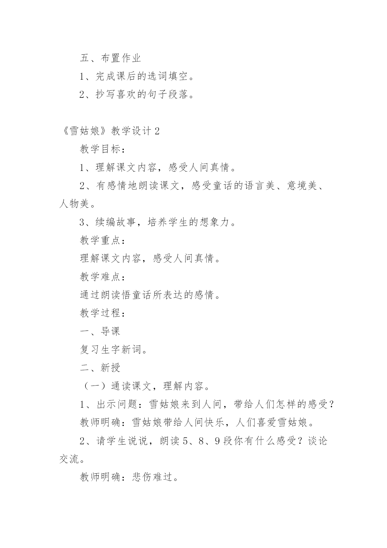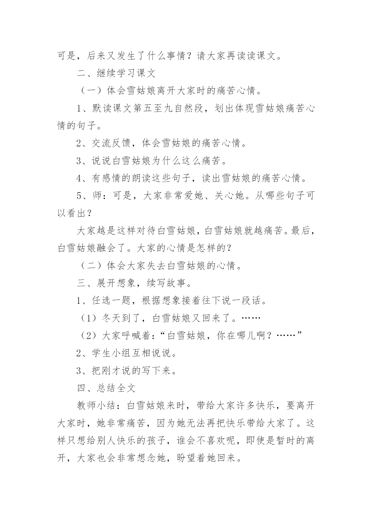 《雪姑娘》教学设计作为一名为他人授业解惑的教育工作者,总归要编写教学设计,教学设计把教学各要素看成一个系统,分析教学问题和需求,确立解决的程序纲要,使教学效果最优化。优秀的教学设计都具备一些什么特点呢?下面是小编精心整理的《雪姑娘》教学设计,欢迎大家分享。《雪姑娘》教学设计1教学要求1、读通课文,学习并掌握本课的生字新词。2、理解课文内容,了解雪姑娘给大家带来的欢乐,体会她离开大家时的痛苦心情。3、展开想象,续写故事。4、有感情的朗读课文。重点难点1、了解雪姑娘给大家带来的欢乐,体会她离开大家时的痛苦心情。2、展开想象,续写故事。课时划分两课时第一课时教学目标1、读通课文,学习并掌握本课的生字新词。2、整体感知课文内容。3、了解雪姑娘给大家带来的欢乐,体会她离开大家时的痛苦心情。教具准备生字词语卡片教学过程一、谈话,导入新课1、师:童话那动人的故事和优美的语言,总能把我们带入美好的情境,使我们受到真、善、美的熏陶。今天,我们就来学习一篇童话。板书课题《雪姑娘》,齐声朗读。2、师:看到这个题目,你有什么疑问?二、粗读课文,感知内容1、自读课文。(1)小组合作学习生字新词。(2)采用比赛的方式,让学生仔细读课文,并作简单的批注。(3)读了故事后,你有什么感受?这篇童话讲了一个怎样的故事?2、检查自学的情况。(1)出示生字词语卡片,指名读,教师强调。(2)指名学生逐段朗读课文。(3)齐读课文。(4)结合相关的`语句,说说读后的感受。(5)说说童话讲了一个什么故事。三、学习课文第一至四自然段,了解雪姑娘带给大家的欢乐1、默读课文,想一想自己喜欢的雪姑娘吗?为什么?2、学生反馈。3、有感情的朗读这部分的内容。四、课堂小结师:伊万和玛璐莎两位老人堆的雪孩子居然活了,他们可真高兴,把她当作自己的孩子,曾经冷冷清清的小屋现在充满了生气和欢乐。雪姑娘带给大家许多欢乐。那么,后来又发生什么事情呢?下节课继续学习课文。五、布置作业熟读课文第二时教学目标1、体会雪姑娘离开大家时的痛苦心情。2、有感情的朗读课文。3、展开想象,续写课文。教学过程一、复习,导入新课1、听写词语。2、师:雪姑娘带给大家许多快乐。她带给伊万和玛璐莎的快乐。“曾经冷冷清清的小屋现在充满了生气和欢乐。”她带给孩子们的快乐。“孩子们纷纷来找雪姑娘玩。他们唱歌给她听,还告诉她种种新鲜的事。”大家都喜欢雪姑娘。可是,后来又发生了什么事情?请大家再读读课文。二、继续学习课文(一)体会雪姑娘离开大家时的痛苦心情。1、默读课文第五至九自然段,划出体现雪姑娘痛苦心情的句子。2、交流反馈,体会雪姑娘的痛苦心情。3、说说白雪姑娘为什么这么痛苦。4、有感情的朗读这些句子,读出雪姑娘的痛苦心情。5、师:可是,大家非常爱她、关心她。从哪些句子可以看出?大家越是这样对待白雪姑娘,白雪姑娘就越痛苦。最后,白雪姑娘融会了。大家的心情是怎样的?(二)体会大家失去白雪姑娘的心情。三、展开想象,续写故事。1、任选一题,根据想象接着往下说一段话。(1)冬天到了,白雪姑娘又回来了。……(2)大家呼喊着:“白雪姑娘,你在哪儿啊?……”2、学生小组互相说说。3、把刚才说的写下来。四、总结全文教师小结:白雪姑娘来时,带给大家许多快乐,要离开大家时,她非常痛苦,因为她无法再把快乐带给大家了。这样只想给别人快乐的孩子,谁会不喜欢呢,即使是暂时的离开,大家也会非常想念她,盼望着她回来。五、布置作业1、完成课后的选词填空。2、抄写喜欢的句子段落。《雪姑娘》教学设计2教学目标:1、理解课文内容,感受人间真情。2、有感情地朗读课文,感受童话的语言美、意境美、人物美。3、续编故事,培养学生的想象力。教学重点:理解课文内容,感受人间真情。教学难点:通过朗读悟童话所表达的感情。教学过程:一、导课复习生字新词。二、新授(一)通读课文,理解内容。1、出示问题:雪姑娘来到人间,带给人们怎样的感受?教师明确:雪姑娘带给人间快乐,人们喜爱雪姑娘。2、请学生说说,朗读5、8、9段你有什么感受?谈论交流。教师明确:悲伤难过。3、请同学们看看屏幕上的三个片段,学生谈自己的发现。(二)品读课文,深入体会。1、体会雪姑娘将要离开人间,她的内心发生了那些变化?把你印象最深或感受最深的词语和句子划记下来。教师明确:忧郁悲伤叹息2、朗读充满情感的语句,深入体会思想感情。“是啊,大自然这么美好,人间这么快乐,而我们的白雪姑娘却要离开了,这怎能不让她忧伤、不让她痛苦呢?”体会忧伤、痛苦的感情。(三)合作探究,体会写法。作者在描写白雪姑娘的忧伤时,都先写了大自然的变化和人们的快乐,你觉得这样写好吗?为什么?教师明确:世界越是美好、雪姑娘就越是忧伤不舍离去。通过以乐景更加衬托出了雪姑娘的哀情。(四)联系生活,体会人间真情。1、朗读全文。2、教师谈话激发学生的.情感:从生活