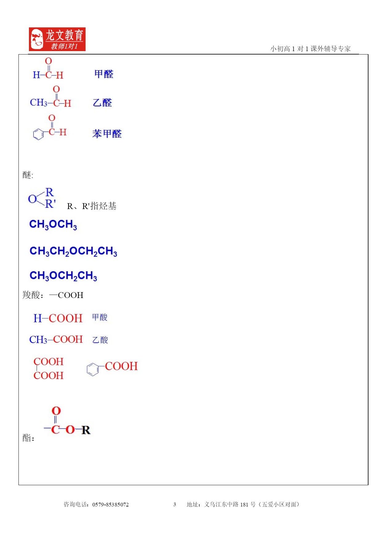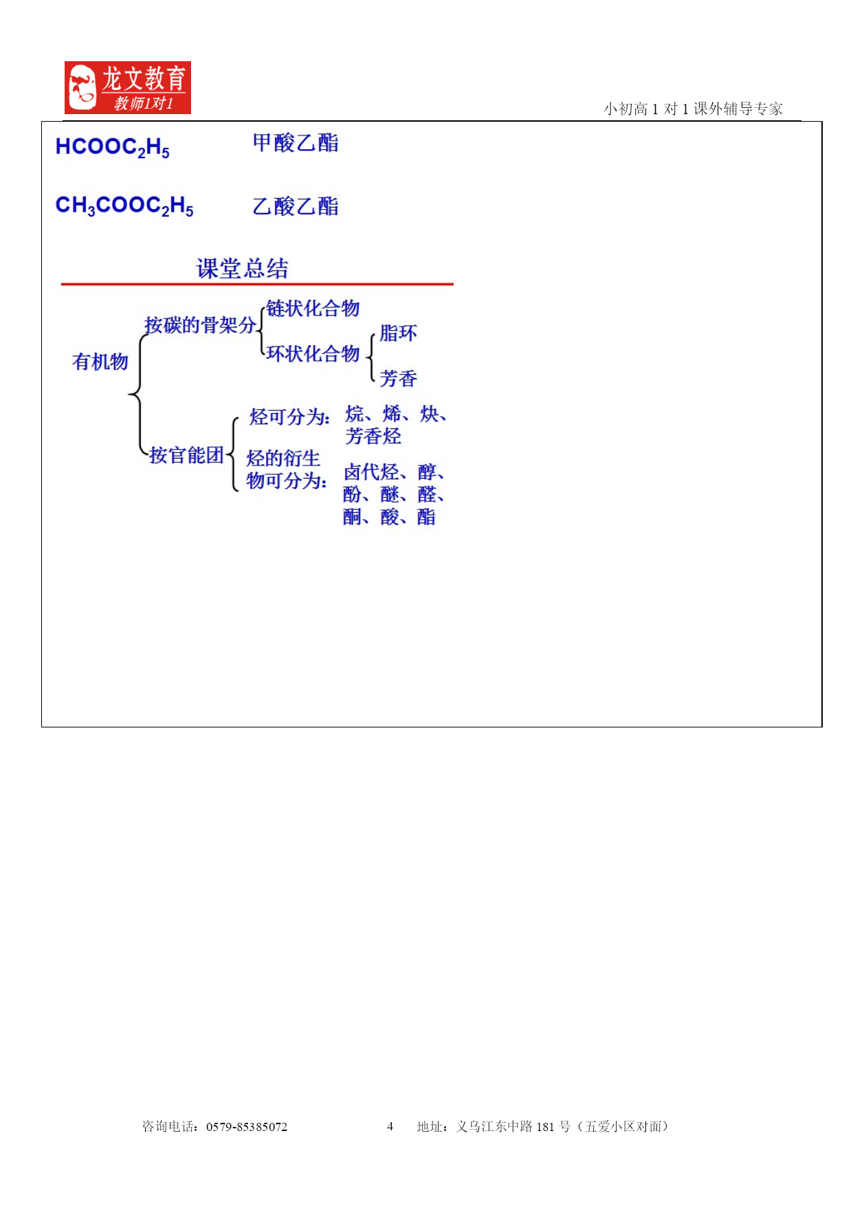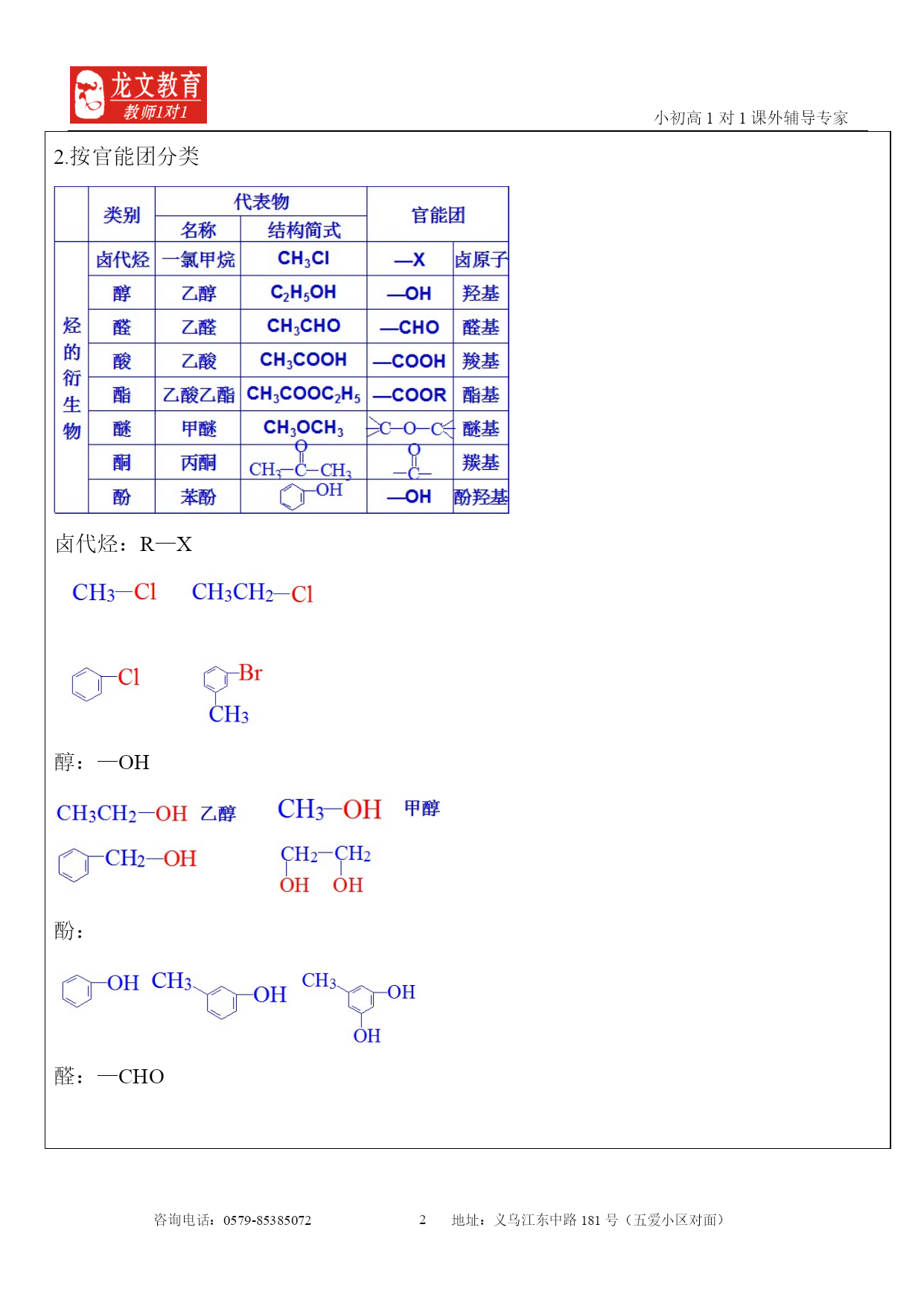 小初高1对1课外辅导专家咨询电话:0579-85385072地址:义乌江东中路181号(五爱小区对面)龙文教育学科教师辅导讲义教师:_____学生:______时间:2012年__月___日时段_____至______课题有机化合物的分类教学目标了解有机化合物的分类方法;认识一些重要的官能团重点、难点有机化合物按官能团进行分类考点及考试要求1.掌握有机化合物的分类方法;2.掌握一些常见的有机化合物的命名教学内容一.有机化合物的分类按碳的骨架分类烃的分类有机化合物的分类2.按官能团分类卤代烃:R—X醇:—OH酚:醛:—CHO醚:R、R'指烃基羧酸:—COOH酯: