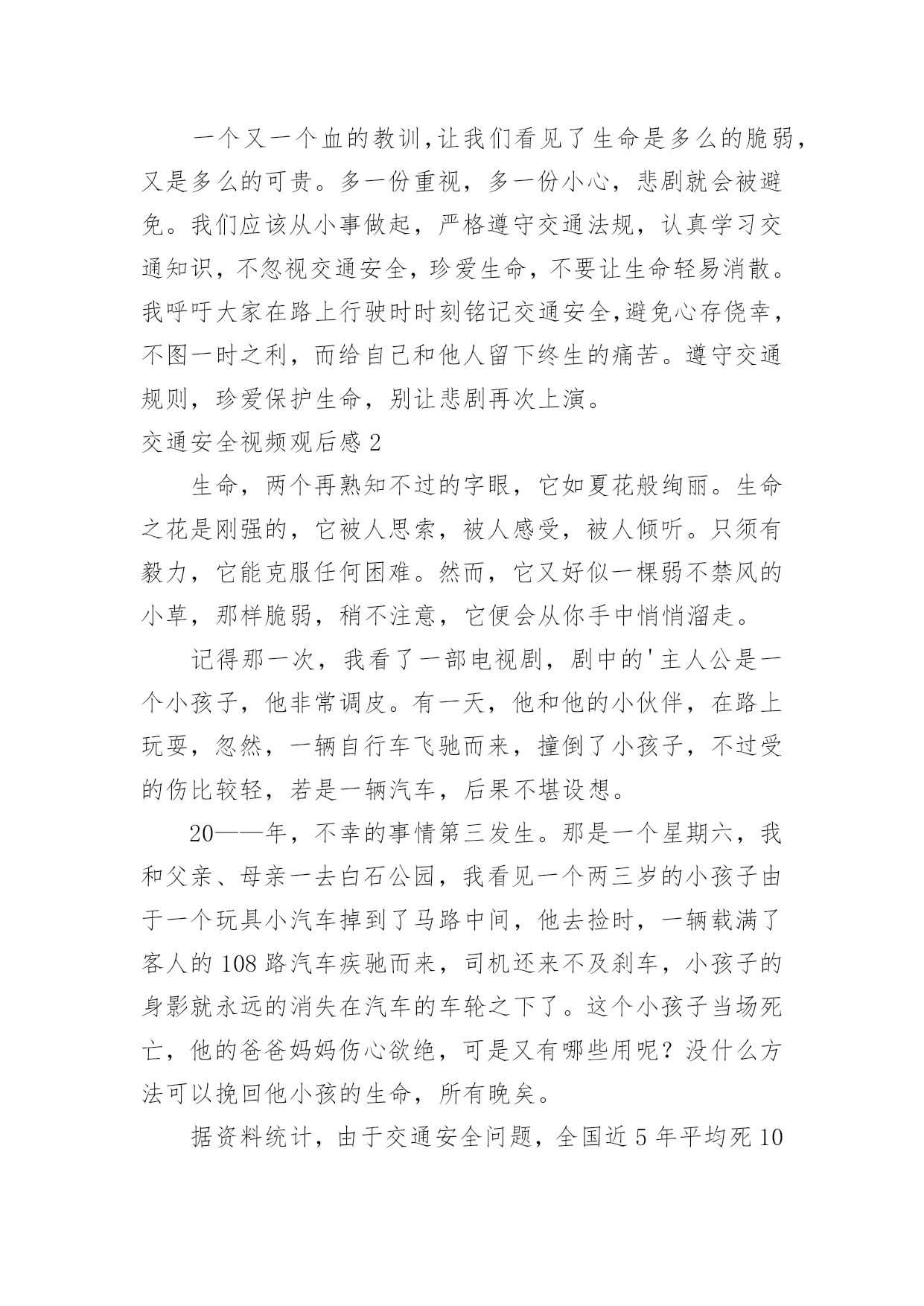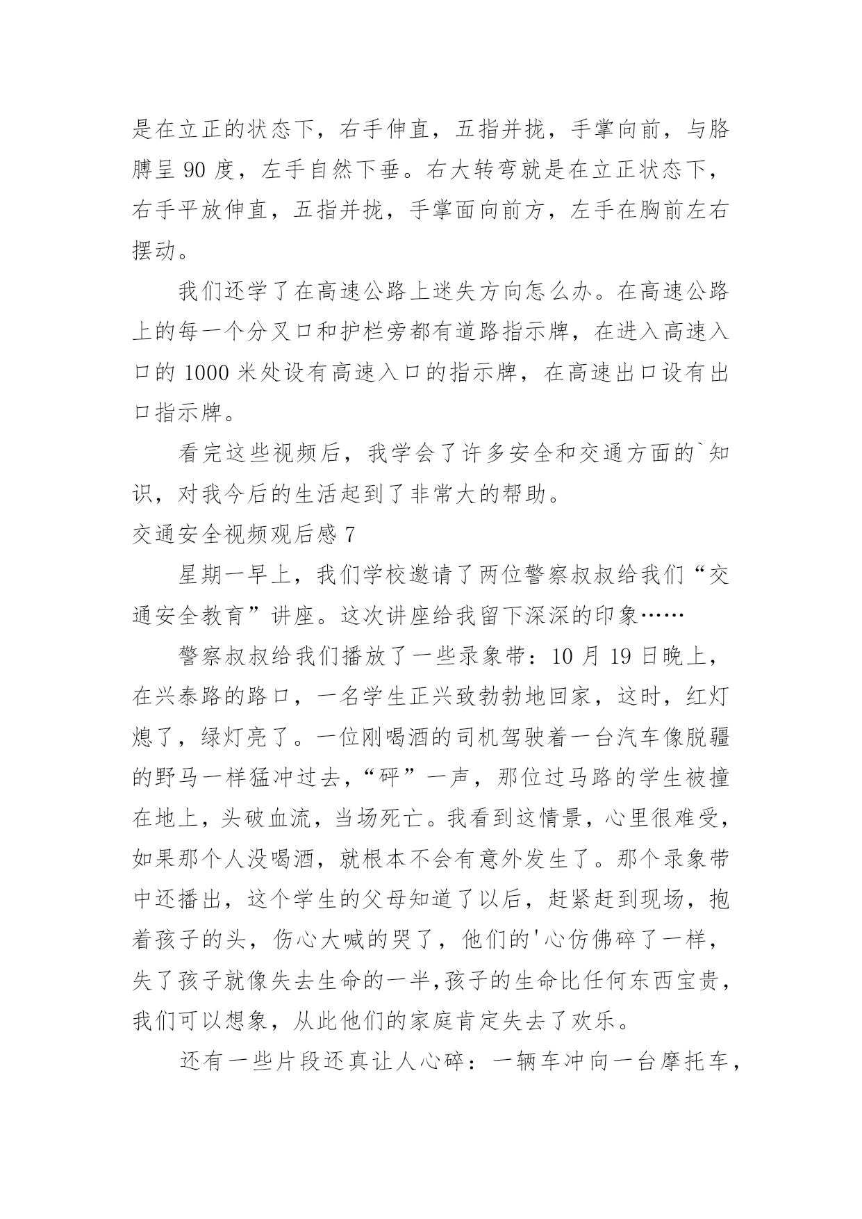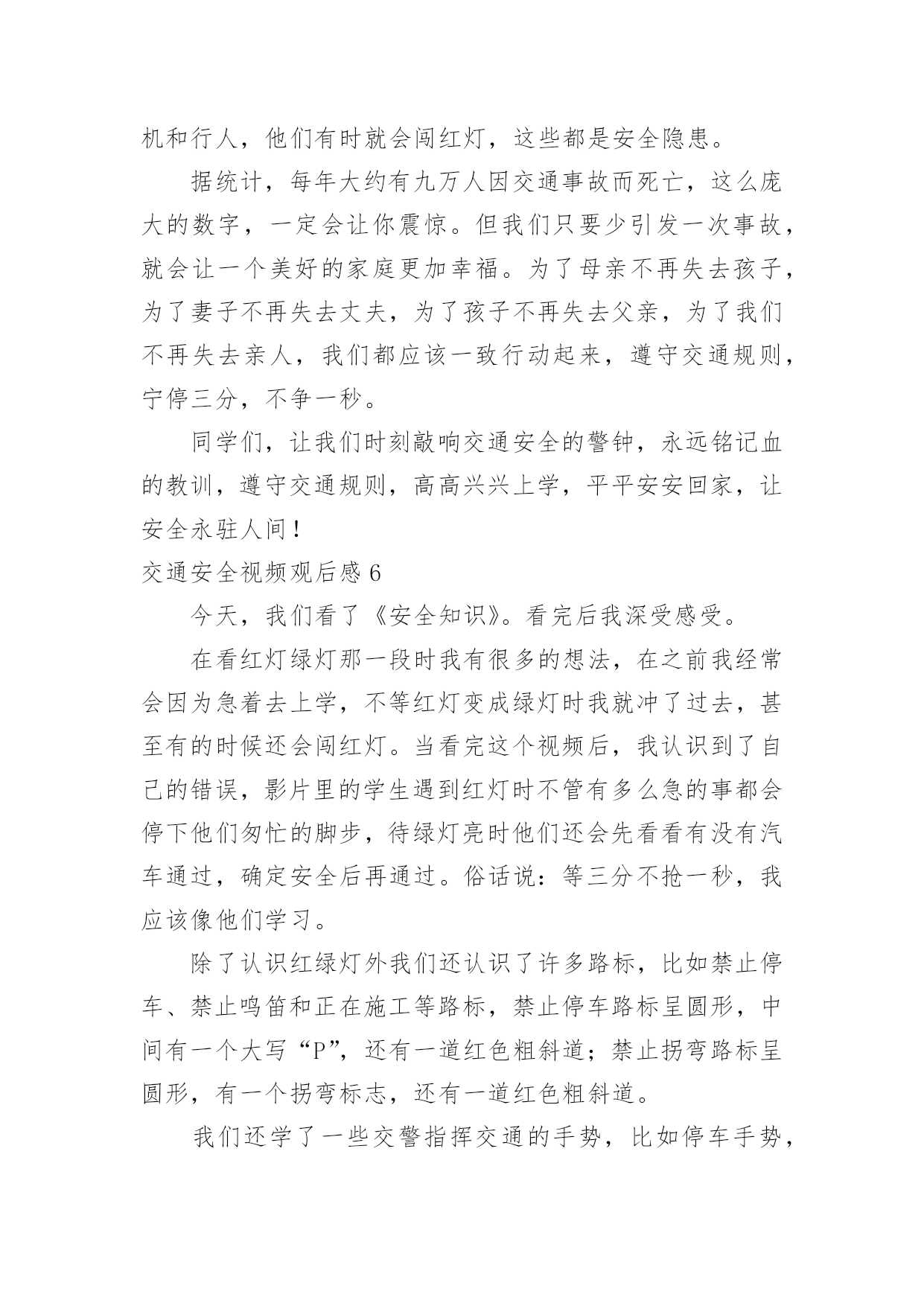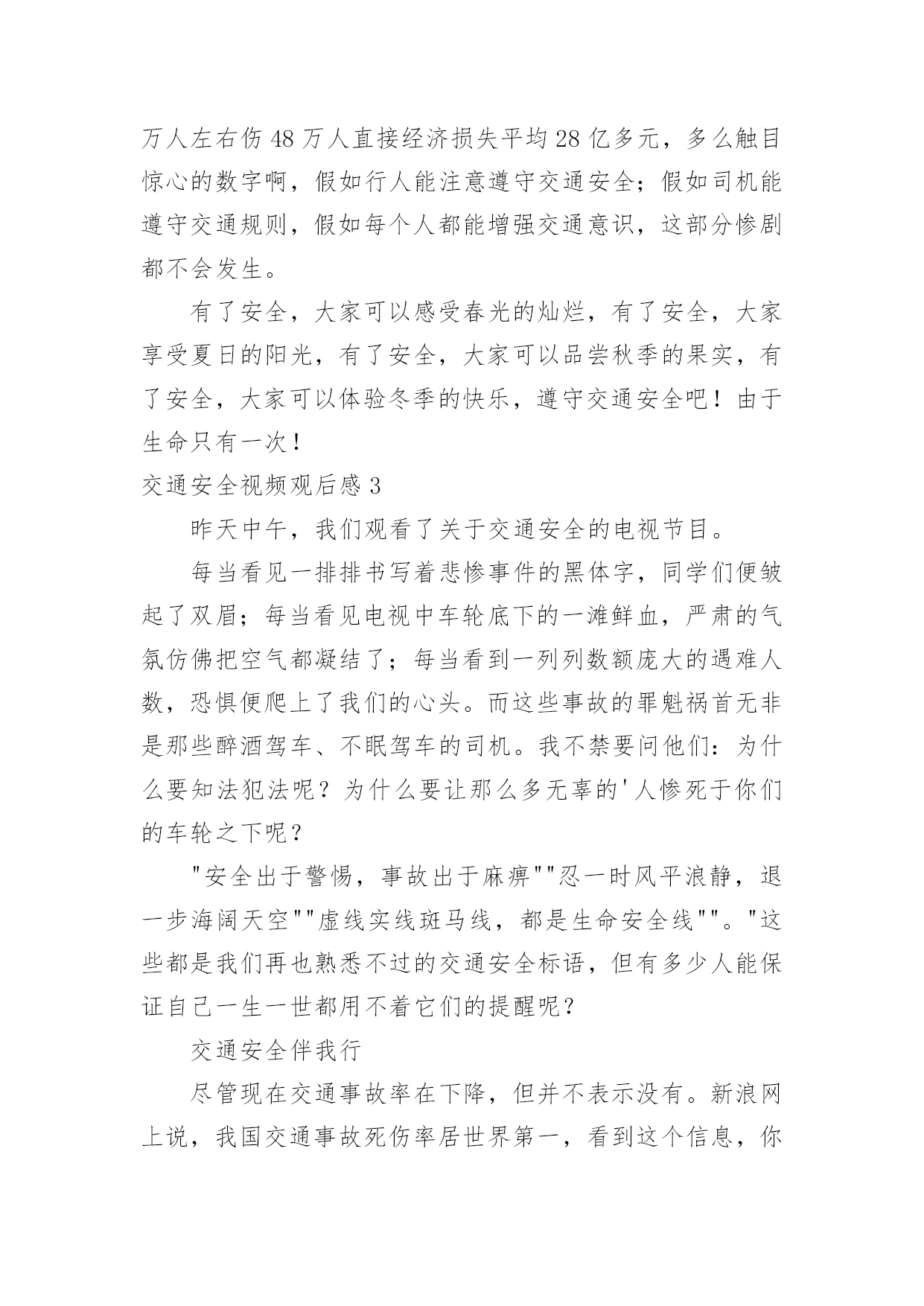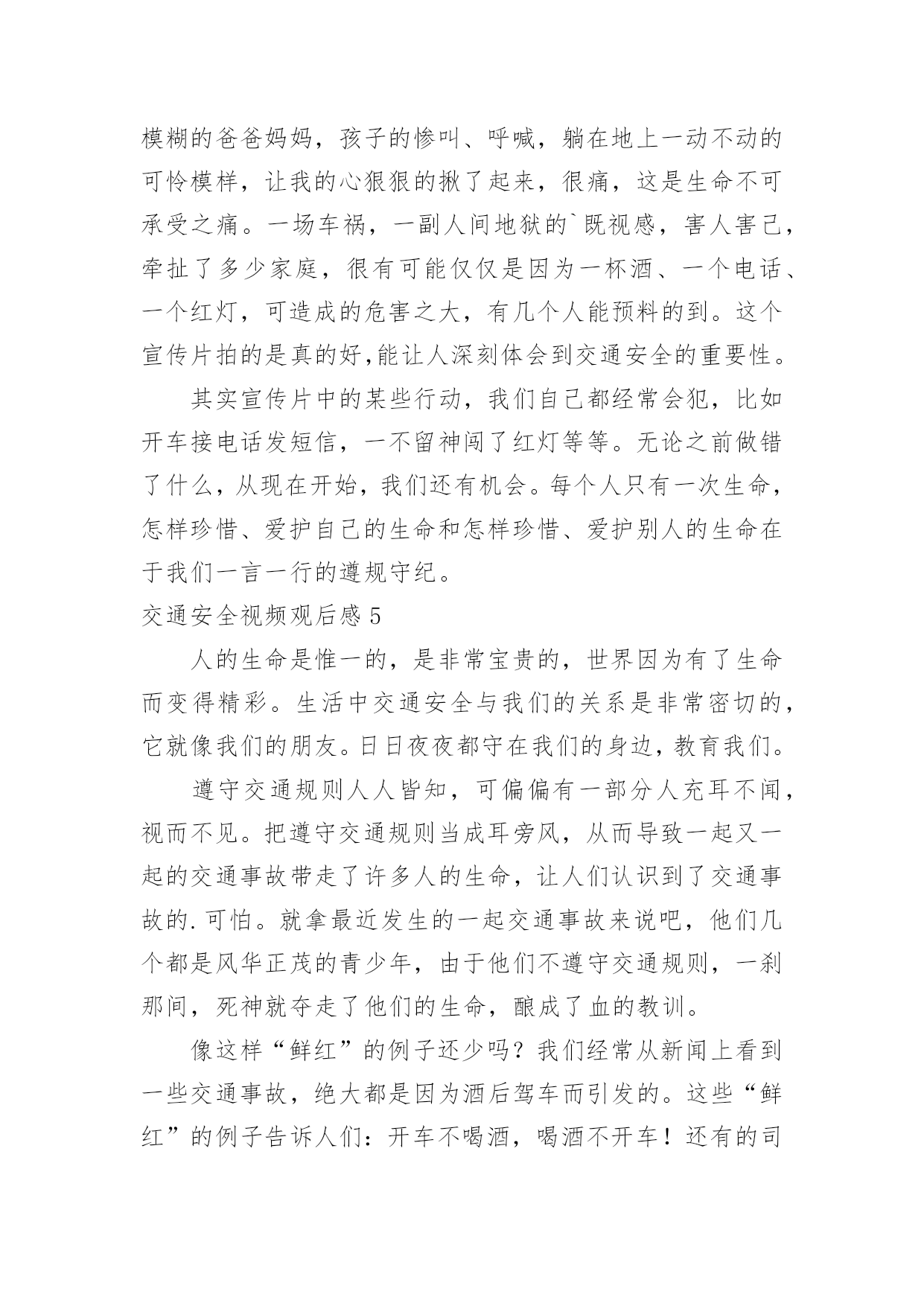 交通安全视频观后感交通安全视频观后感当品味完一部作品后,一定有不少感悟吧,这时候最关键的观后感不能忘了。那么你真的懂得怎么写观后感吗?下面是小编为大家收集的交通安全视频观后感,欢迎大家分享。交通安全视频观后感1全世界每六分钟就有一人死于车祸,而我国交通死亡事故更是全世界第一,每天,都会有人命丧于那无情的车轮之下,鸣笛声之中,一场场悲剧成为交通安全路上又一个警示灯。就是因为人们安全意识的缺乏,对交通安全的忽视,让一个个生命转瞬即逝,一个个家庭因此而支离破碎。在每一个数字背后,都是一条鲜活的生命,成千上万的亲人就在车祸的转眼间中沉浸在悲痛之中,一生无法释怀。因为超速,酒驾,闯红灯等等而引发的一个个交通事故,让人们在瞬间失去了至亲,失去了生命,那将会是一生无法挽回的痛。有些人仅仅因为不重视,而酒后驾车,造成异常惨烈的事故;有的人仅仅贪图一时方便超速行驶,让无辜的生命受到摧残,就连老人,儿童也会被无辜的'牵连。由于对交通安全知识的匮乏,对法律的不重视,不在意,才会有酒后驾车,超速行驶,闯红追尾等等交通事故的发生,毁掉了一个原本团圆幸福的家庭。一个又一个血的教训,让我们看见了生命是多么的脆弱,又是多么的可贵。多一份重视,多一份小心,悲剧就会被避免。我们应该从小事做起,严格遵守交通法规,认真学习交通知识,不忽视交通安全,珍爱生命,不要让生命轻易消散。我呼吁大家在路上行驶时时刻铭记交通安全,避免心存侥幸,不图一时之利,而给自己和他人留下终生的痛苦。遵守交通规则,珍爱保护生命,别让悲剧再次上演。交通安全视频观后感2生命,两个再熟知不过的字眼,它如夏花般绚丽。生命之花是刚强的,它被人思索,被人感受,被人倾听。只须有毅力,它能克服任何困难。然而,它又好似一棵弱不禁风的小草,那样脆弱,稍不注意,它便会从你手中悄悄溜走。记得那一次,我看了一部电视剧,剧中的'主人公是一个小孩子,他非常调皮。有一天,他和他的小伙伴,在路上玩耍,忽然,一辆自行车飞驰而来,撞倒了小孩子,不过受的伤比较轻,若是一辆汽车,后果不堪设想。20——年,不幸的事情第三发生。那是一个星期六,我和父亲、母亲一去白石公园,我看见一个两三岁的小孩子由于一个玩具小汽车掉到了马路中间,他去捡时,一辆载满了客人的108路汽车疾驰而来,司机还来不及刹车,小孩子的身影就永远的消失在汽车的车轮之下了。这个小孩子当场死亡,他的爸爸妈妈伤心欲绝,可是又有哪些用呢?没什么方法可以挽回他小孩的生命,所有晚矣。据资料统计,由于交通安全问题,全国近5年平均死10万人左右伤48万人直接经济损失平均28亿多元,多么触目惊心的数字啊,假如行人能注意遵守交通安全;假如司机能遵守交通规则,假如每个人都能增强交通意识,这部分惨剧都不会发生。有了安全,大家可以感受春光的灿烂,有了安全,大家享受夏日的阳光,有了安全,大家可以品尝秋季的果实,有了安全,大家可以体验冬季的快乐,遵守交通安全吧!由于生命只有一次!交通安全视频观后感3昨天中午,我们观看了关于交通安全的电视节目。每当看见一排排书写着悲惨事件的黑体字,同学们便皱起了双眉;每当看见电视中车轮底下的一滩鲜血,严肃的气氛仿佛把空气都凝结了;每当看到一列列数额庞大的遇难人数,恐惧便爬上了我们的心头。而这些事故的罪魁祸首无非是那些醉酒驾车、不眠驾车的司机。我不禁要问他们:为什么要知法犯法呢?为什么要让那么多无辜的'人惨死于你们的车轮之下呢?"安全出于警惕,事故出于麻痹""忍一时风平浪静,退一步海阔天空""虚线实线斑马线,都是生命安全线""。"这些都是我们再也熟悉不过的交通安全标语,但有多少人能保证自己一生一世都用不着它们的提醒呢?交通安全伴我行尽管现在交通事故率在下降,但并不表示没有。新浪网上说,我国交通事故死伤率居世界第一,看到这个信息,你们一定会很吃惊吧!做一个假设,如果我国交通事故率排第一,是90%,那其他国家呢?70%?60%?甚至0%?那简直不可想象!以后,如果我们看见有谁不遵守交通规则,我们一定要去批评,劝阻,不要视之不理。还有,我们也要联合班级一起去宣传交通规则,让人们知道生命的可贵,让人人都知道遵守交通规则是多么重要。遵守交通规则是每个公民光荣而又神圣的义务。为了自己与他人的生命安全,我们都要去遵守交通规则,宣传交通规则,让安全时时伴我行!让生命时时伴我行!交通安全视频观后感4今日组织员工收看了《中国交通安全教育宣传片》,观看结束后,心情久久不得平复,感触颇深,仔细想想,不禁还有点后怕。整个宣传片时间不长,区区十分钟,却讲述了5个不同类型的交通事故,让人触目惊心,心灵震撼。超速驾驶、开车途中玩手机分神、闯红灯、疲劳驾驶、酒驾,生活中很常见,但是往往被人忽视,尤其现在信息社会,开车接电话发信息的比比皆是,一不小心就会造成交通事故,虽然不一定像宣传片中那么惨烈,但是万一