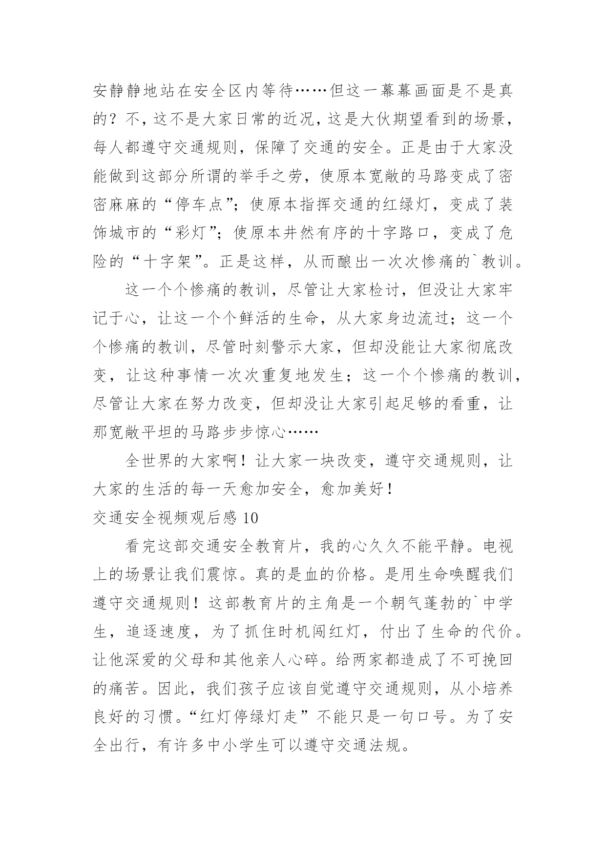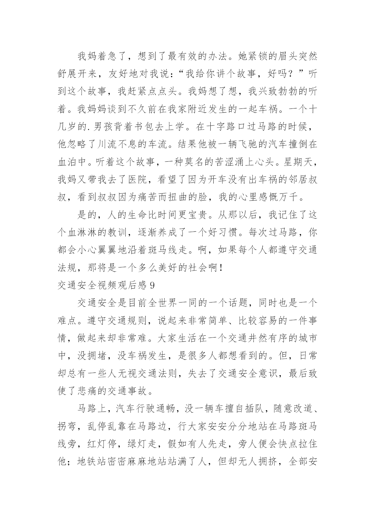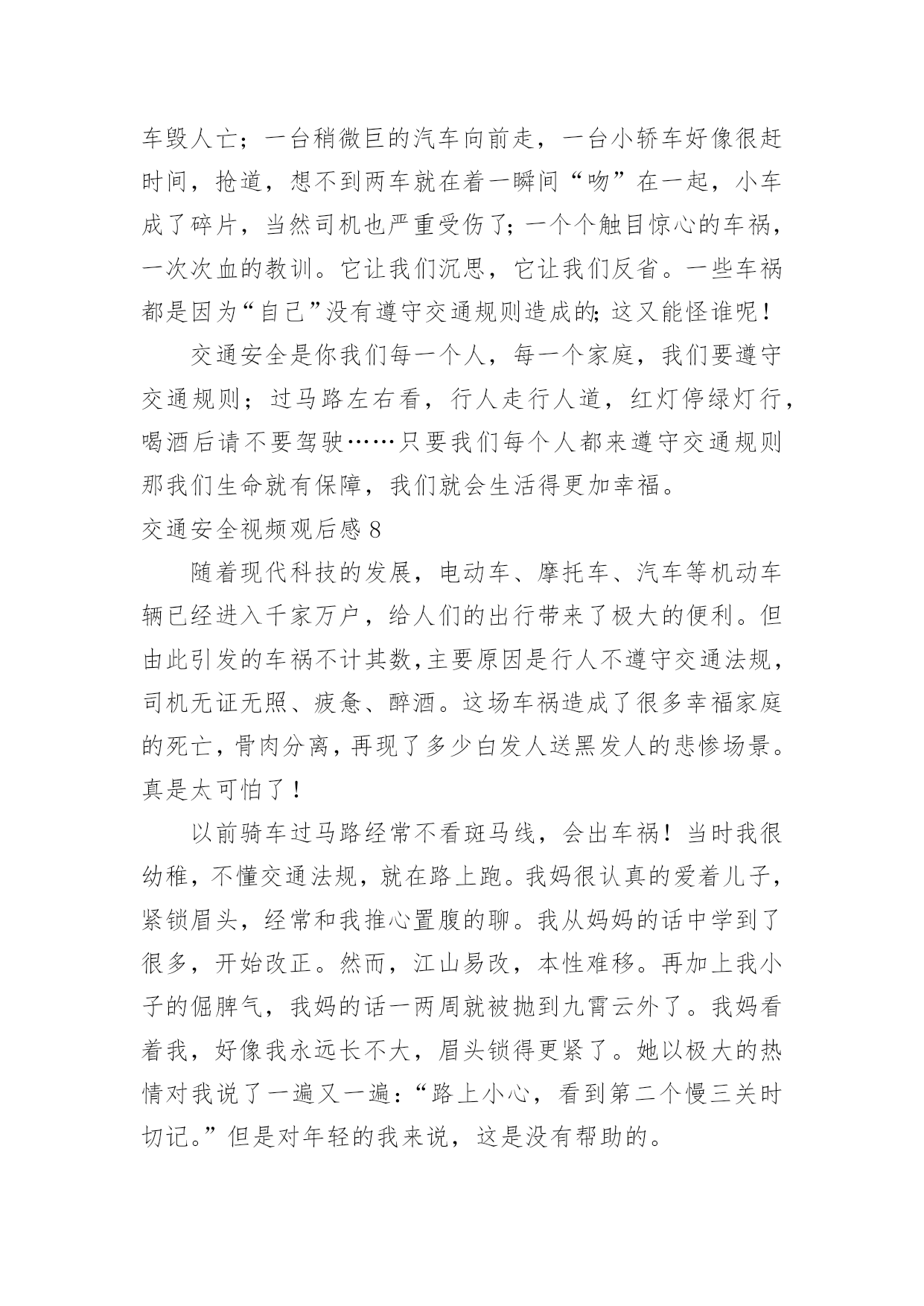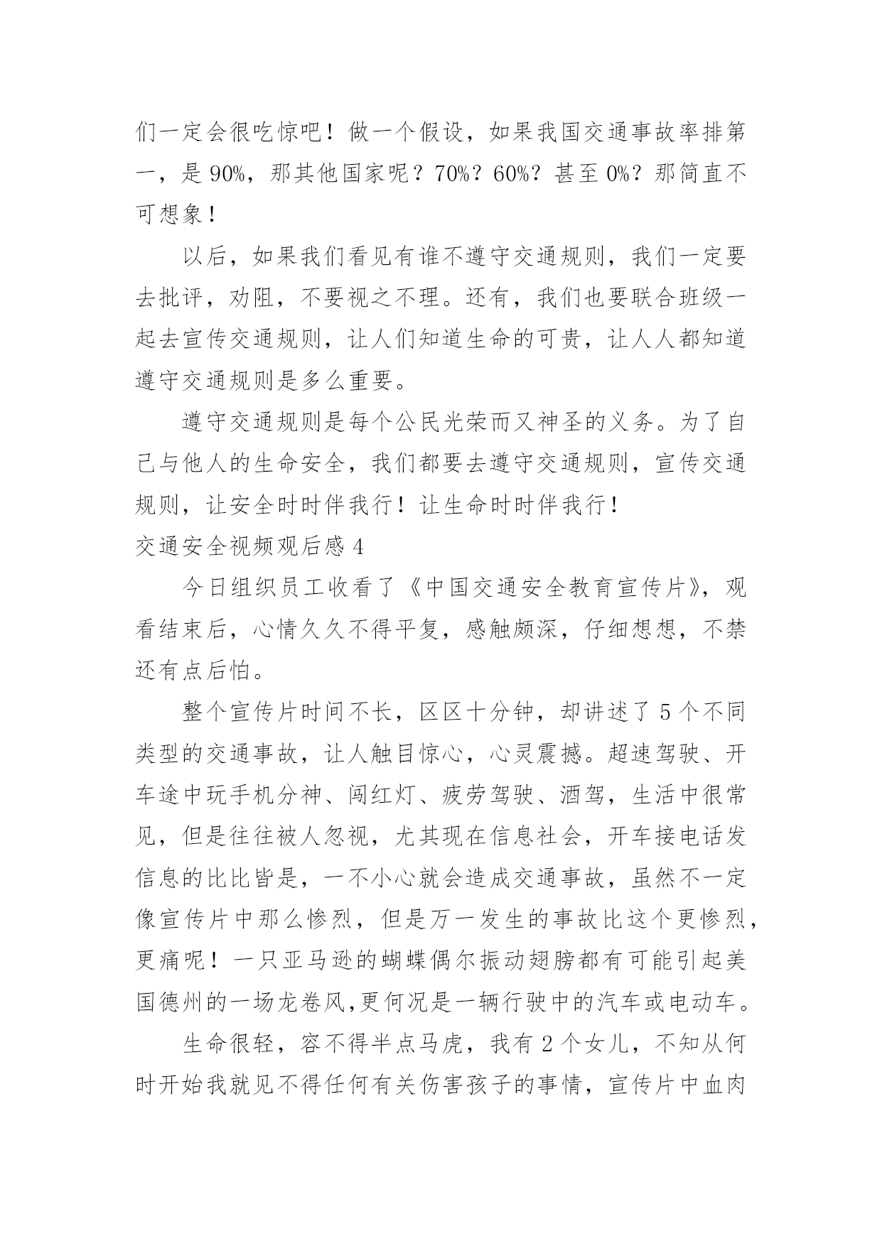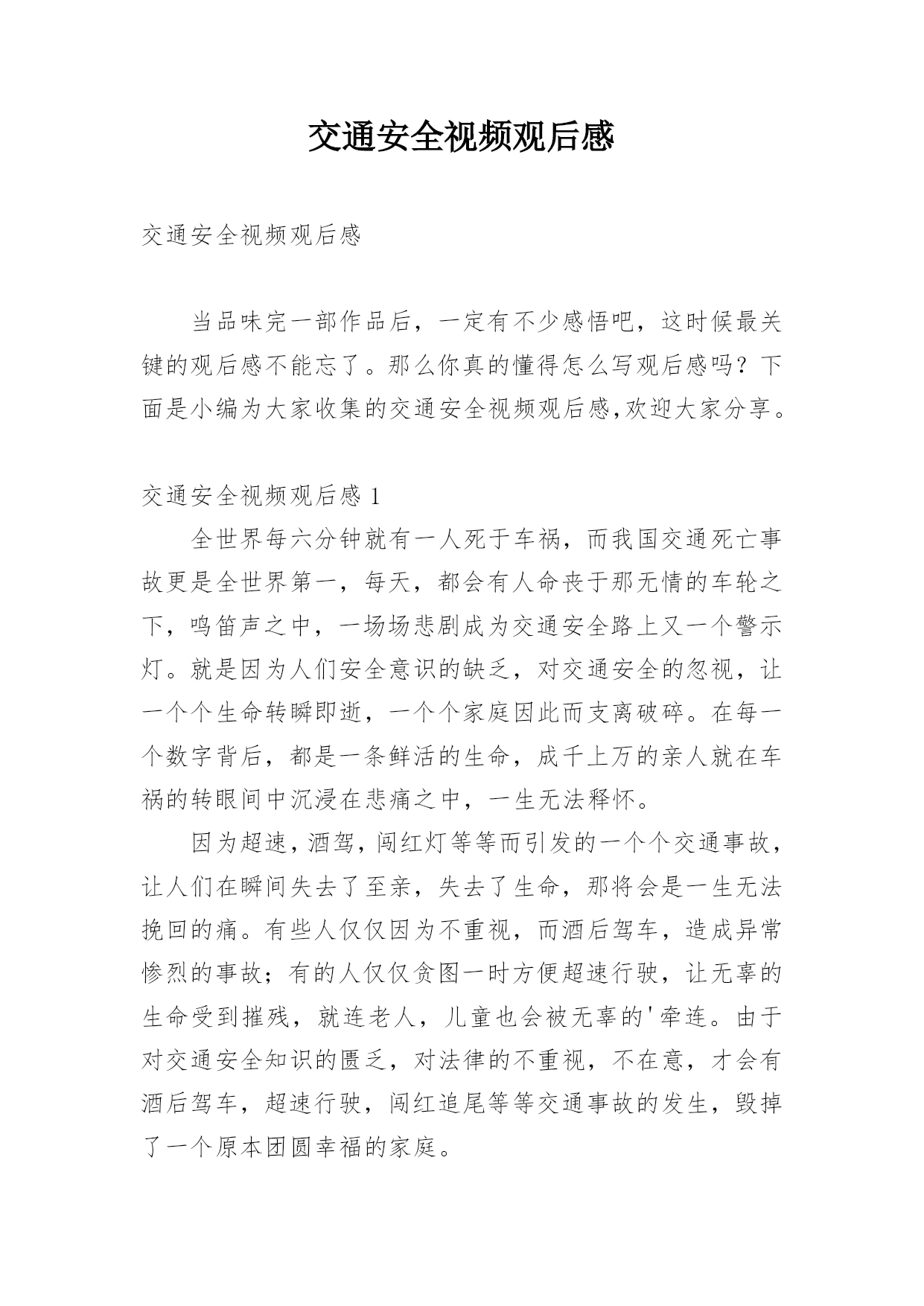 交通安全视频观后感交通安全视频观后感当品味完一部作品后,一定有不少感悟吧,这时候最关键的观后感不能忘了。那么你真的懂得怎么写观后感吗?下面是小编为大家收集的交通安全视频观后感,欢迎大家分享。交通安全视频观后感1全世界每六分钟就有一人死于车祸,而我国交通死亡事故更是全世界第一,每天,都会有人命丧于那无情的车轮之下,鸣笛声之中,一场场悲剧成为交通安全路上又一个警示灯。就是因为人们安全意识的缺乏,对交通安全的忽视,让一个个生命转瞬即逝,一个个家庭因此而支离破碎。在每一个数字背后,都是一条鲜活的生命,成千上万的亲人就在车祸的转眼间中沉浸在悲痛之中,一生无法释怀。因为超速,酒驾,闯红灯等等而引发的一个个交通事故,让人们在瞬间失去了至亲,失去了生命,那将会是一生无法挽回的痛。有些人仅仅因为不重视,而酒后驾车,造成异常惨烈的事故;有的人仅仅贪图一时方便超速行驶,让无辜的生命受到摧残,就连老人,儿童也会被无辜的'牵连。由于对交通安全知识的匮乏,对法律的不重视,不在意,才会有酒后驾车,超速行驶,闯红追尾等等交通事故的发生,毁掉了一个原本团圆幸福的家庭。一个又一个血的教训,让我们看见了生命是多么的脆弱,又是多么的可贵。多一份重视,多一份小心,悲剧就会被避免。我们应该从小事做起,严格遵守交通法规,认真学习交通知识,不忽视交通安全,珍爱生命,不要让生命轻易消散。我呼吁大家在路上行驶时时刻铭记交通安全,避免心存侥幸,不图一时之利,而给自己和他人留下终生的痛苦。遵守交通规则,珍爱保护生命,别让悲剧再次上演。交通安全视频观后感2生命,两个再熟知不过的字眼,它如夏花般绚丽。生命之花是刚强的,它被人思索,被人感受,被人倾听。只须有毅力,它能克服任何困难。然而,它又好似一棵弱不禁风的小草,那样脆弱,稍不注意,它便会从你手中悄悄溜走。记得那一次,我看了一部电视剧,剧中的'主人公是一个小孩子,他非常调皮。有一天,他和他的小伙伴,在路上玩耍,忽然,一辆自行车飞驰而来,撞倒了小孩子,不过受的伤比较轻,若是一辆汽车,后果不堪设想。20——年,不幸的事情第三发生。那是一个星期六,我和父亲、母亲一去白石公园,我看见一个两三岁的小孩子由于一个玩具小汽车掉到了马路中间,他去捡时,一辆载满了客人的108路汽车疾驰而来,司机还来不及刹车,小孩子的身影就永远的消失在汽车的车轮之下了。这个小孩子当场死亡,他的爸爸妈妈伤心欲绝,可是又有哪些用呢?没什么方法可以挽回他小孩的生命,所有晚矣。据资料统计,由于交通安全问题,全国近5年平均死10万人左右伤48万人直接经济损失平均28亿多元,多么触目惊心的数字啊,假如行人能注意遵守交通安全;假如司机能遵守交通规则,假如每个人都能增强交通意识,这部分惨剧都不会发生。有了安全,大家可以感受春光的灿烂,有了安全,大家享受夏日的阳光,有了安全,大家可以品尝秋季的果实,有了安全,大家可以体验冬季的快乐,遵守交通安全吧!由于生命只有一次!交通安全视频观后感3昨天中午,我们观看了关于交通安全的电视节目。每当看见一排排书写着悲惨事件的黑体字,同学们便皱起了双眉;每当看见电视中车轮底下的一滩鲜血,严肃的气氛仿佛把空气都凝结了;每当看到一列列数额庞大的遇难人数,恐惧便爬上了我们的心头。而这些事故的罪魁祸首无非是那些醉酒驾车、不眠驾车的司机。我不禁要问他们:为什么要知法犯法呢?为什么要让那么多无辜的'人惨死于你们的车轮之下呢?"安全出于警惕,事故出于麻痹""忍一时风平浪静,退一步海阔天空""虚线实线斑马线,都是生命安全线""。"这些都是我们再也熟悉不过的交通安全标语,但有多少人能保证自己一生一世都用不着它们的提醒呢?交通安全伴我行尽管现在交通事故率在下降,但并不表示没有。新浪网上说,我国交通事故死伤率居世界第一,看到这个信息,你们一定会很吃惊吧!做一个假设,如果我国交通事故率排第一,是90%,那其他国家呢?70%?60%?甚至0%?那简直不可想象!以后,如果我们看见有谁不遵守交通规则,我们一定要去批评,劝阻,不要视之不理。还有,我们也要联合班级一起去宣传交通规则,让人们知道生命的可贵,让人人都知道遵守交通规则是多么重要。遵守交通规则是每个公民光荣而又神圣的义务。为了自己与他人的生命安全,我们都要去遵守交通规则,宣传交通规则,让安全时时伴我行!让生命时时伴我行!交通安全视频观后感4今日组织员工收看了《中国交通安全教育宣传片》,观看结束后,心情久久不得平复,感触颇深,仔细想想,不禁还有点后怕。整个宣传片时间不长,区区十分钟,却讲述了5个不同类型的交通事故,让人触目惊心,心灵震撼。超速驾驶、开车途中玩手机分神、闯红灯、疲劳驾驶、酒驾,生活中很常见,但是往往被人忽视,尤其现在信息社会,开车接电话发信息的比比皆是,一不小心就会造成交通事故,虽然不一定像宣传片中那么惨烈,但是万一