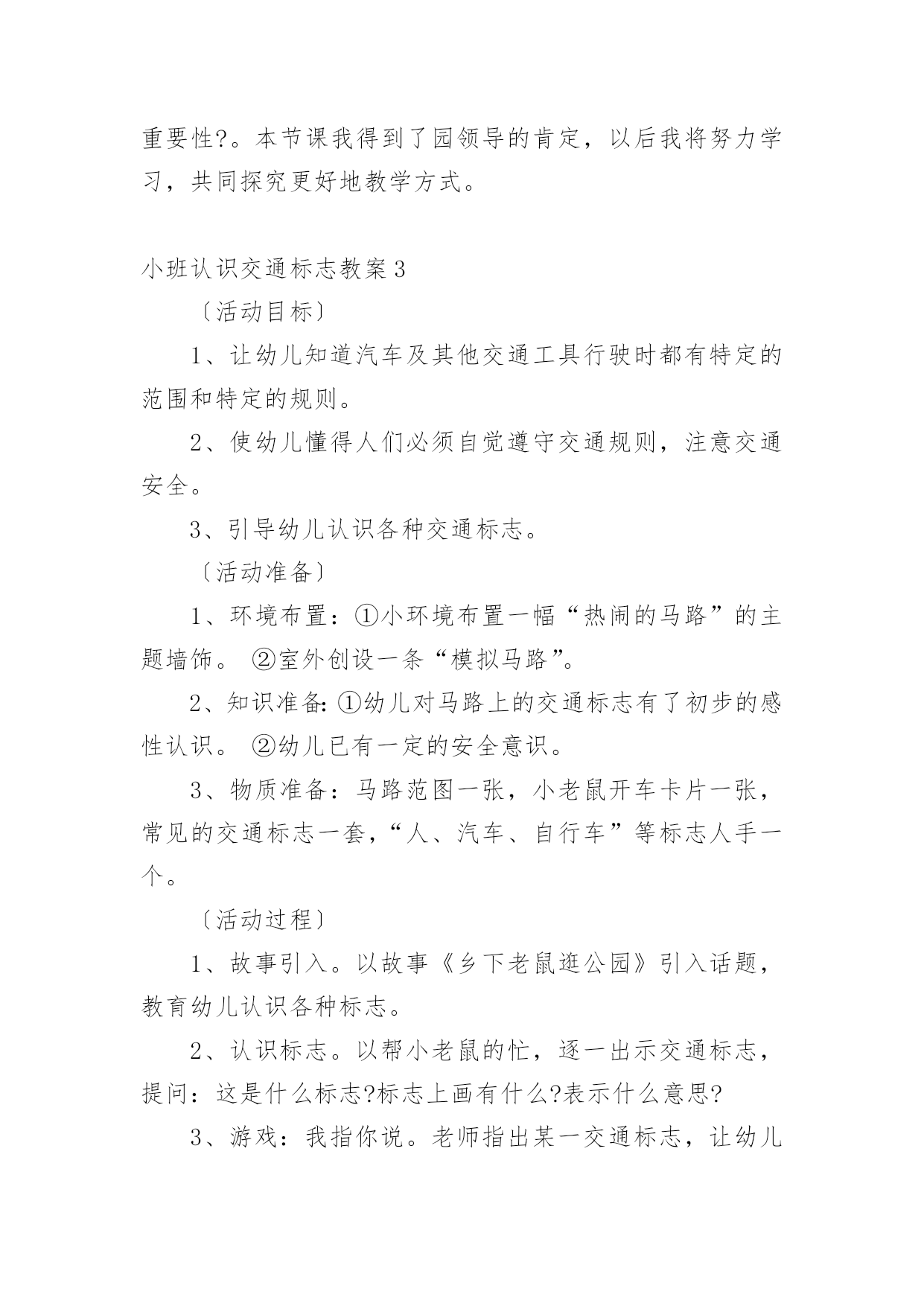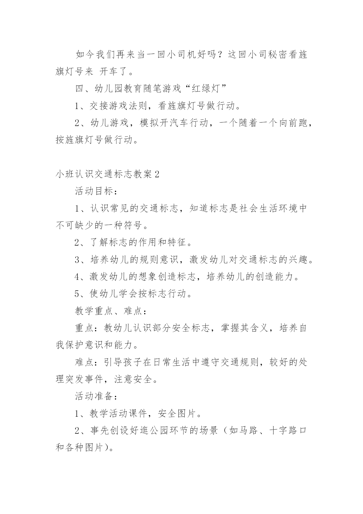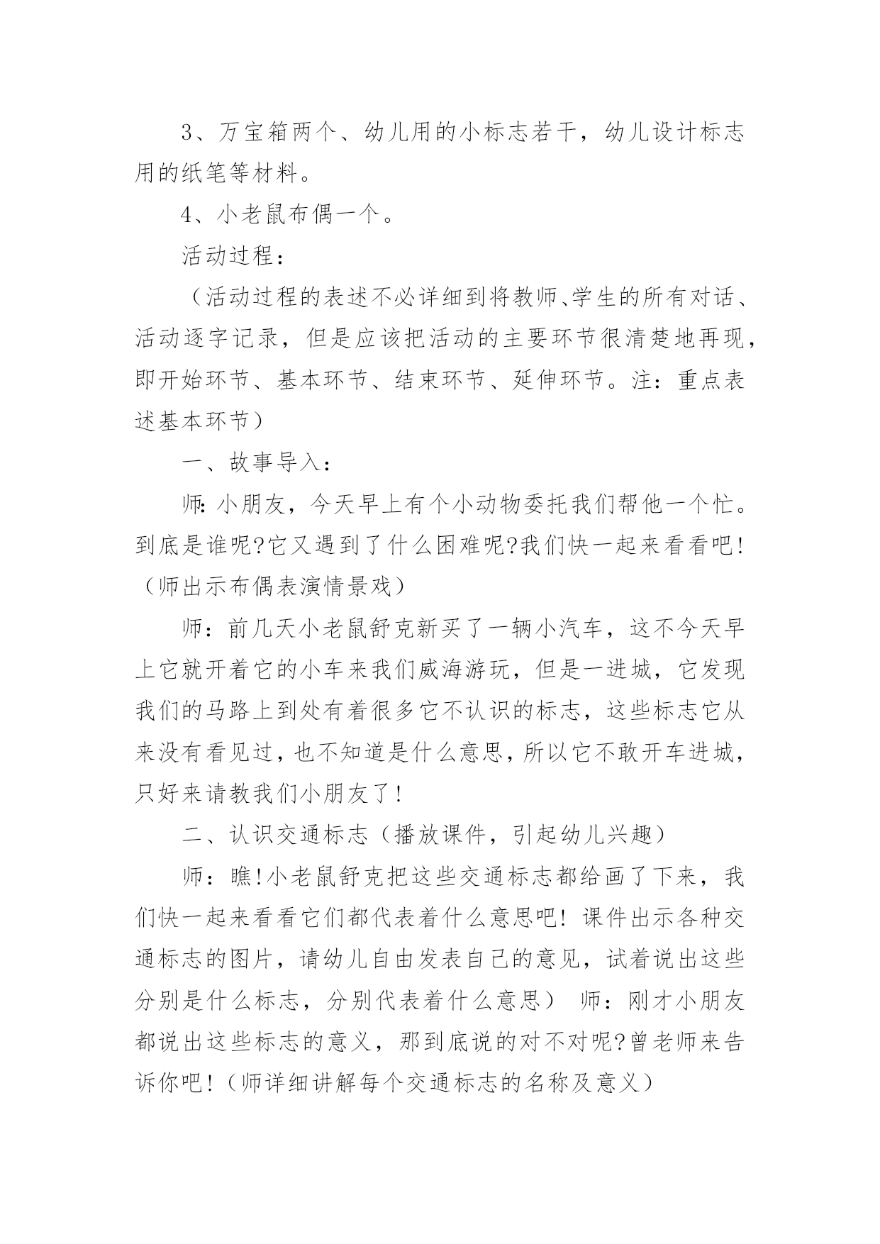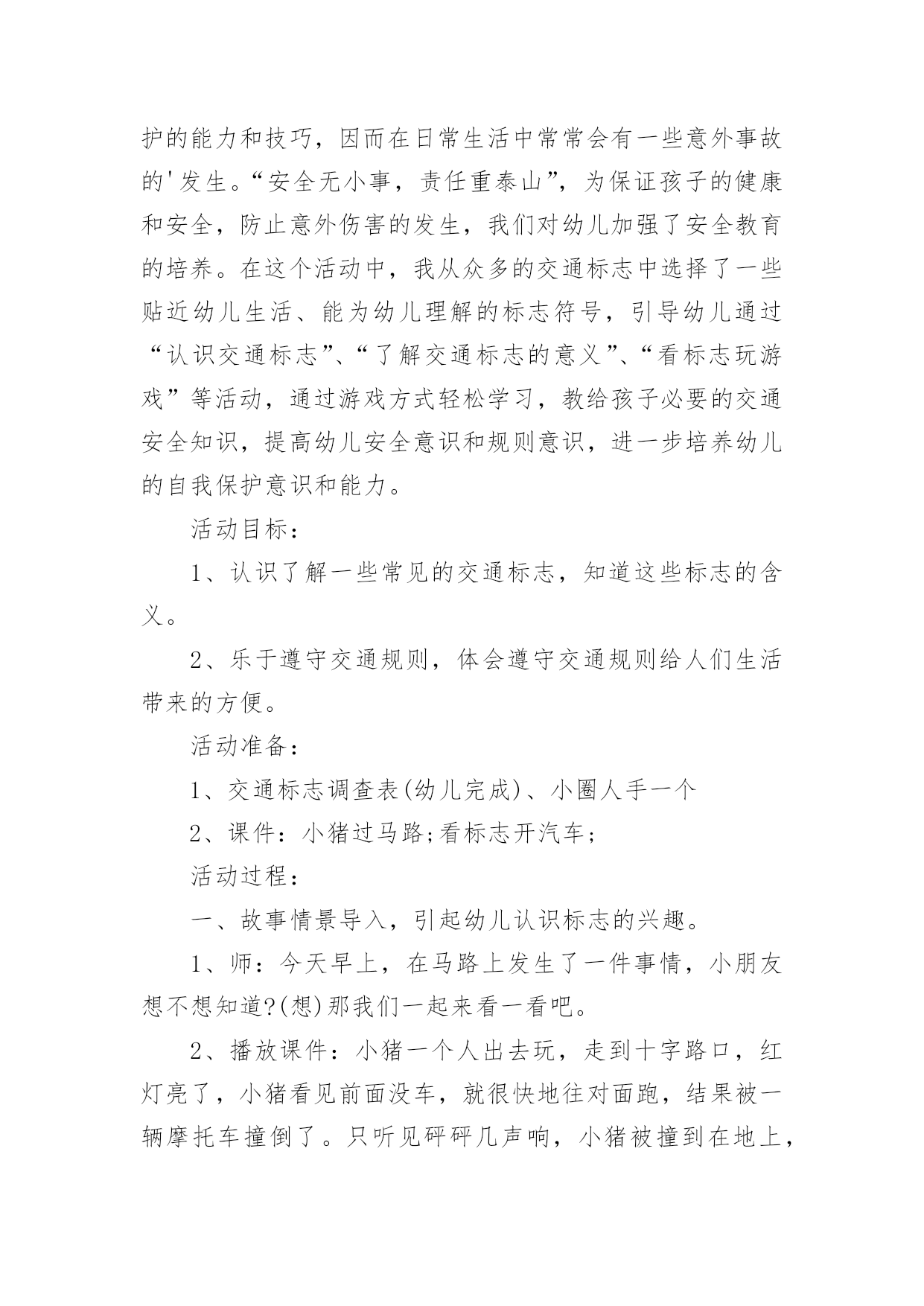 小班认识交通标志教案作为一位杰出的教职工,时常要开展教案准备工作,编写教案有利于我们科学、合理地支配课堂时间。那么教案应该怎么写才合适呢?以下是小编精心整理的小班认识交通标志教案,欢迎大家分享。小班认识交通标志教案1一、运动目的1、感知红、绿灯的特性、用处。2、开端实验用铰剪沿表面线剪,孕育发生敌手工运动的爱好。3、实验按旌旗灯号做行动,开端具有服从交通法则的意识。4、认读汉字“红灯”“绿灯”。运动预备配置马路(没有红绿灯)、红绿腊光、纸、胶水、抹布、牙膏盒、橡皮泥、音乐磁带、灌音机、红绿灯图片、字卡“红灯”、“绿灯”。运动过程:引起幼儿运动爱好师:“瞧,大马路上停着那么多玩具汽车,你们想玩吗?那我们来当小司机,把这些汽车开起来,好吗?开的时间要在马路上开”。幼儿自由玩汽车。(听音乐)师:“汽车累了,我们让他们苏息一下,我们也苏息一下吧。”二、感知红绿灯的特性、用处1、师:“适才,我们玩了开汽车游戏,开心吗?那你们在玩的时间有没有发明什么题目呢?幼儿园教案”(个体报告)“那我们奈何来办理这一题目呢?把你的设法主意和洽朋友说一说好吗?”幼儿相互交换。个体报告。师小结。“那你们知道红、绿灯是什么样子的吗?”(自由报告)2、观察察红、绿灯的特性。出示红绿灯图片。师:“这便是红绿灯。本日,先生还带来了红、绿灯灯的字宝宝。”(认读红绿灯)小结红绿灯的特性。“马路上有了红绿灯,汽车司机开车就平安多了。”“本日,我们就来给大马路装上红绿灯,好吗?”三、制造红绿灯1、提出请求:先生给小朋友预备了一些质料,请小朋友动动小头脑奈何用这些质料来制造红绿灯,先生还为小朋友预备了小铰剪,小朋友利用铰剪的时间要留意平安,剪的时间,沿表面线剪,用完今后把小铰剪的'嘴巴闭拢,轻轻放在箩筐里,剪下来的纸屑放在箩筐里,别的质料也要归放好。2、幼儿自选质料操纵,巡回引导。3、把幼儿的作品放在马路上。“我们小朋友真醒目,给马路装上了红绿灯。马路上有了红绿灯,汽车司机就可以看红绿灯来开车了。如今我们再来当一回小司机好吗?这回小司秘密看旌旗灯号来开车了。四、幼儿园教育随笔游戏“红绿灯”1、交接游戏法则,看旌旗灯号做行动。2、幼儿游戏,模拟开汽车行动,一个随着一个向前跑,按旌旗灯号做行动。小班认识交通标志教案2活动目标:1、认识常见的交通标志,知道标志是社会生活环境中不可缺少的一种符号。2、了解标志的作用和特征。3、培养幼儿的规则意识,激发幼儿对交通标志的兴趣。4、激发幼儿的想象创造标志,培养幼儿的创造能力。5、使幼儿学会按标志行动。教学重点、难点:重点:教幼儿认识部分安全标志,掌握其含义,培养自我保护意识和能力。难点:引导孩子在日常生活中遵守交通规则,较好的处理突发事件,注意安全。活动准备:1、教学活动课件,安全图片。2、事先创设好逛公园环节的场景(如马路、十字路口和各种图片)。3、万宝箱两个、幼儿用的小标志若干,幼儿设计标志用的纸笔等材料。4、小老鼠布偶一个。活动过程:(活动过程的表述不必详细到将教师、学生的所有对话、活动逐字记录,但是应该把活动的主要环节很清楚地再现,即开始环节、基本环节、结束环节、延伸环节。注:重点表述基本环节)一、故事导入:师:小朋友,今天早上有个小动物委托我们帮他一个忙。到底是谁呢?它又遇到了什么困难呢?我们快一起来看看吧!(师出示布偶表演情景戏)师:前几天小老鼠舒克新买了一辆小汽车,这不今天早上它就开着它的小车来我们威海游玩,但是一进城,它发现我们的马路上到处有着很多它不认识的标志,这些标志它从来没有看见过,也不知道是什么意思,所以它不敢开车进城,只好来请教我们小朋友了!二、认识交通标志(播放课件,引起幼儿兴趣)师:瞧!小老鼠舒克把这些交通标志都给画了下来,我们快一起来看看它们都代表着什么意思吧!课件出示各种交通标志的图片,请幼儿自由发表自己的意见,试着说出这些分别是什么标志,分别代表着什么意思)师:刚才小朋友都说出这些标志的意义,那到底说的对不对呢?曾老师来告诉你吧!(师详细讲解每个交通标志的名称及意义)游戏——我指你说:(教师可指出标志图片,让幼儿说出标志名称及含义,以让幼儿巩固复习)三、交通标志作用大师:现在我们都知道了很多交通工具的意义,那小朋友你们想象一下,如果我们生活中没有了这些交通标志,那会变成什么样子呢?(幼儿自由想象回答)师小结:交通标志在我们的生活中起着重要的作用,如果没有了交通标志,那马路上的车就会随意乱行,没有规则,互不谦让,很容易引起车祸;如果没有交通标志人们就不知道什么是停车场,那车辆就会随意停放,这对我们的行走和生活都会造成很大的影响;如果没有了交通工具,上班的时候马路就会混乱,这样会影响人们的工作的等等,所以我们可以看出交通标志是社会生活环境中不可缺少的一种符号;是缺一不可的,我们都应该认真的去执行这些交通