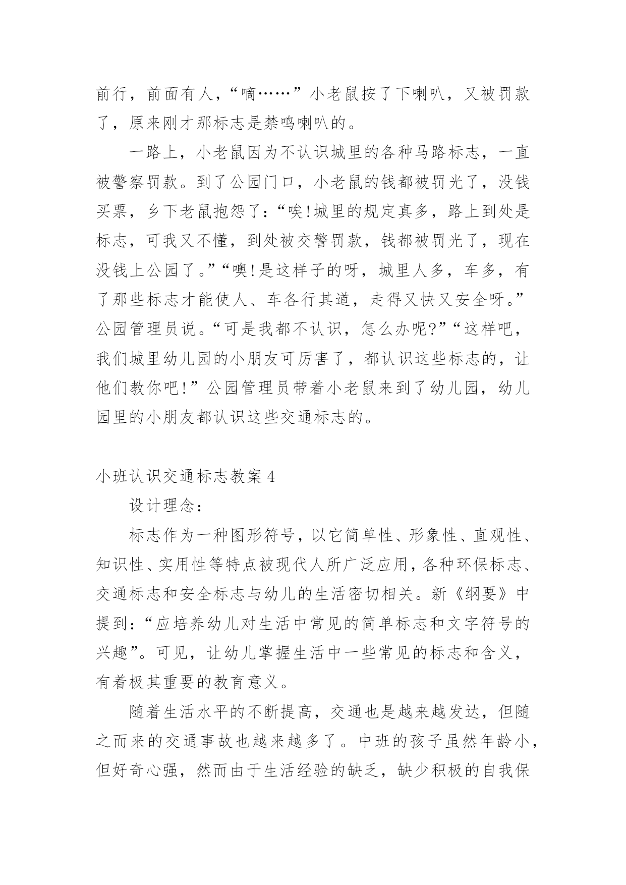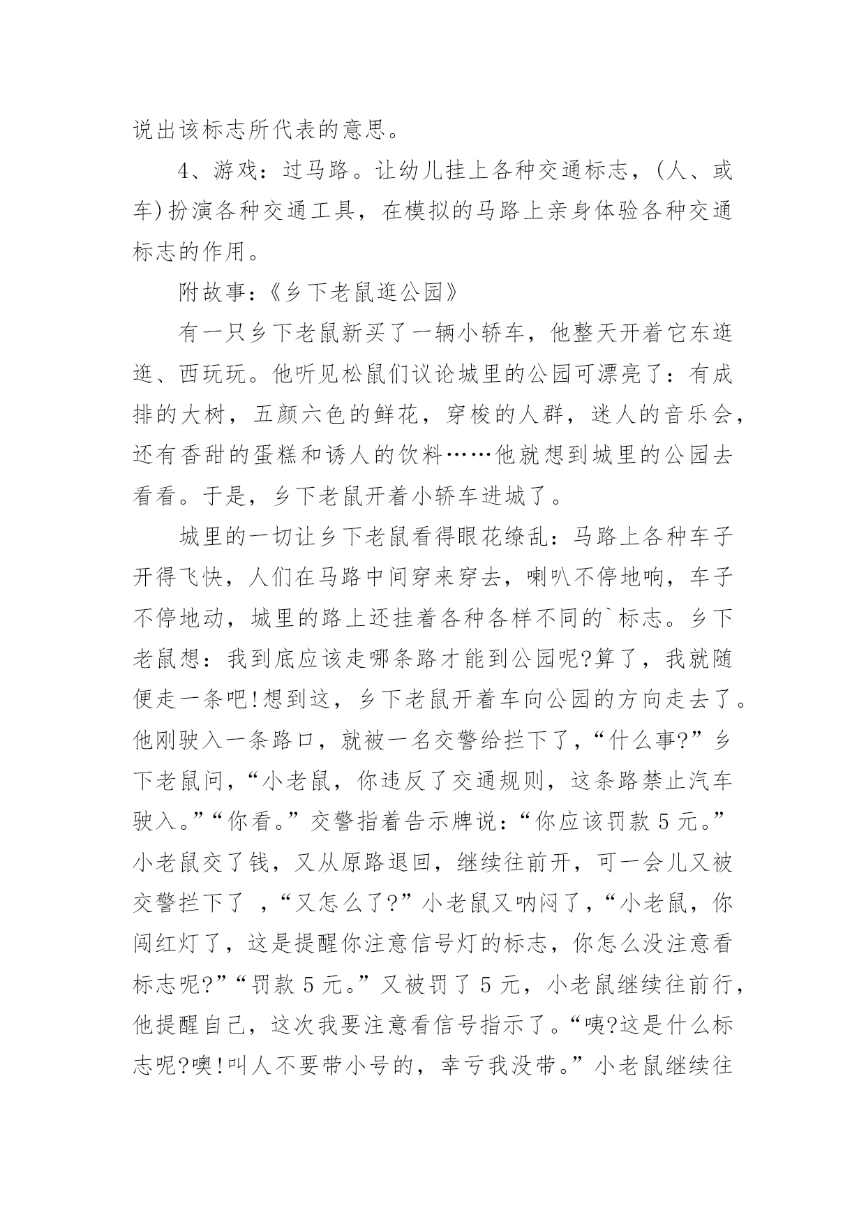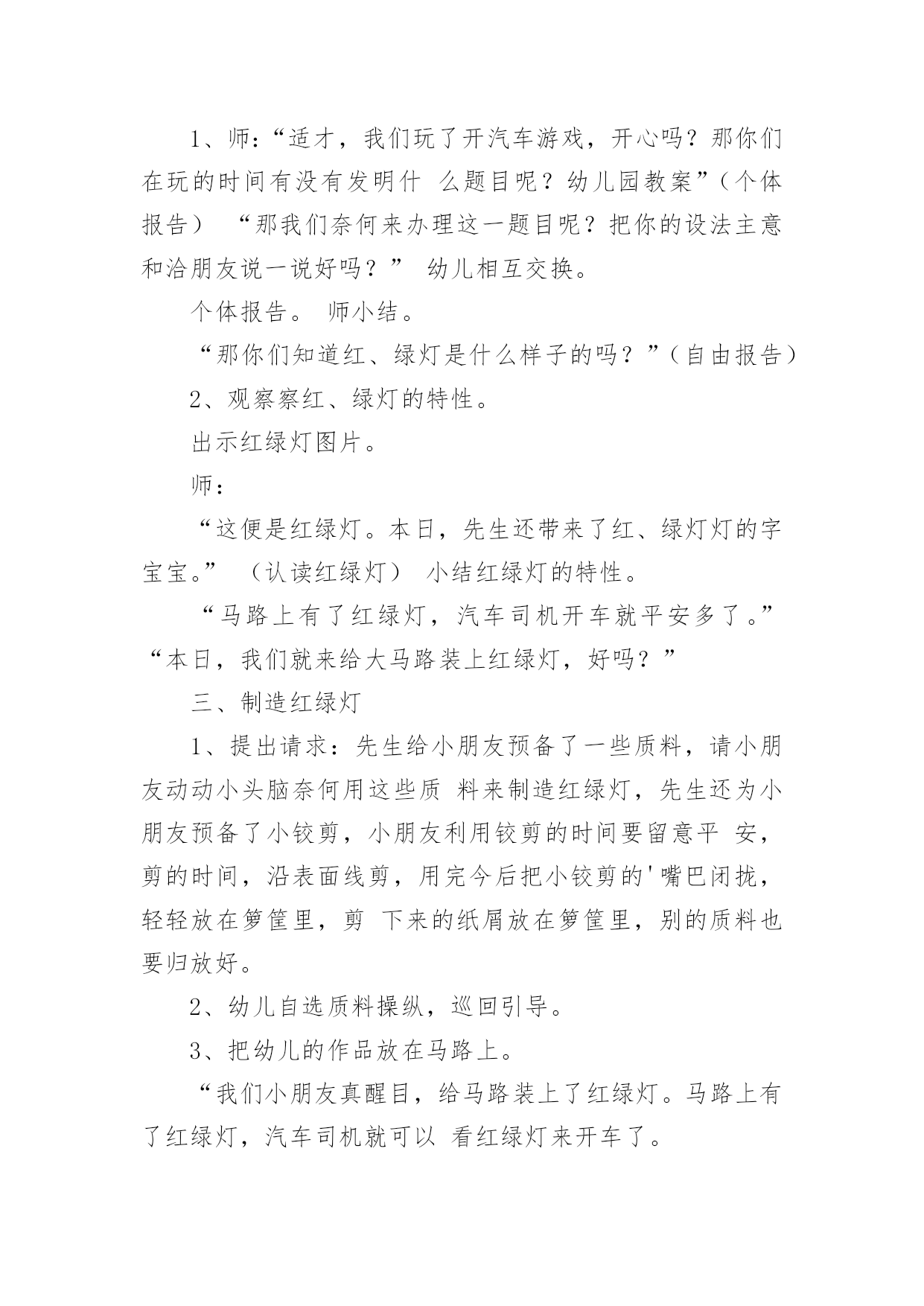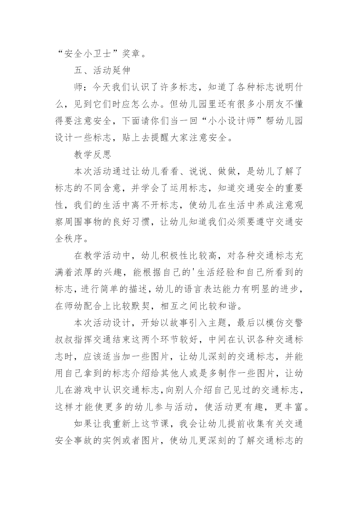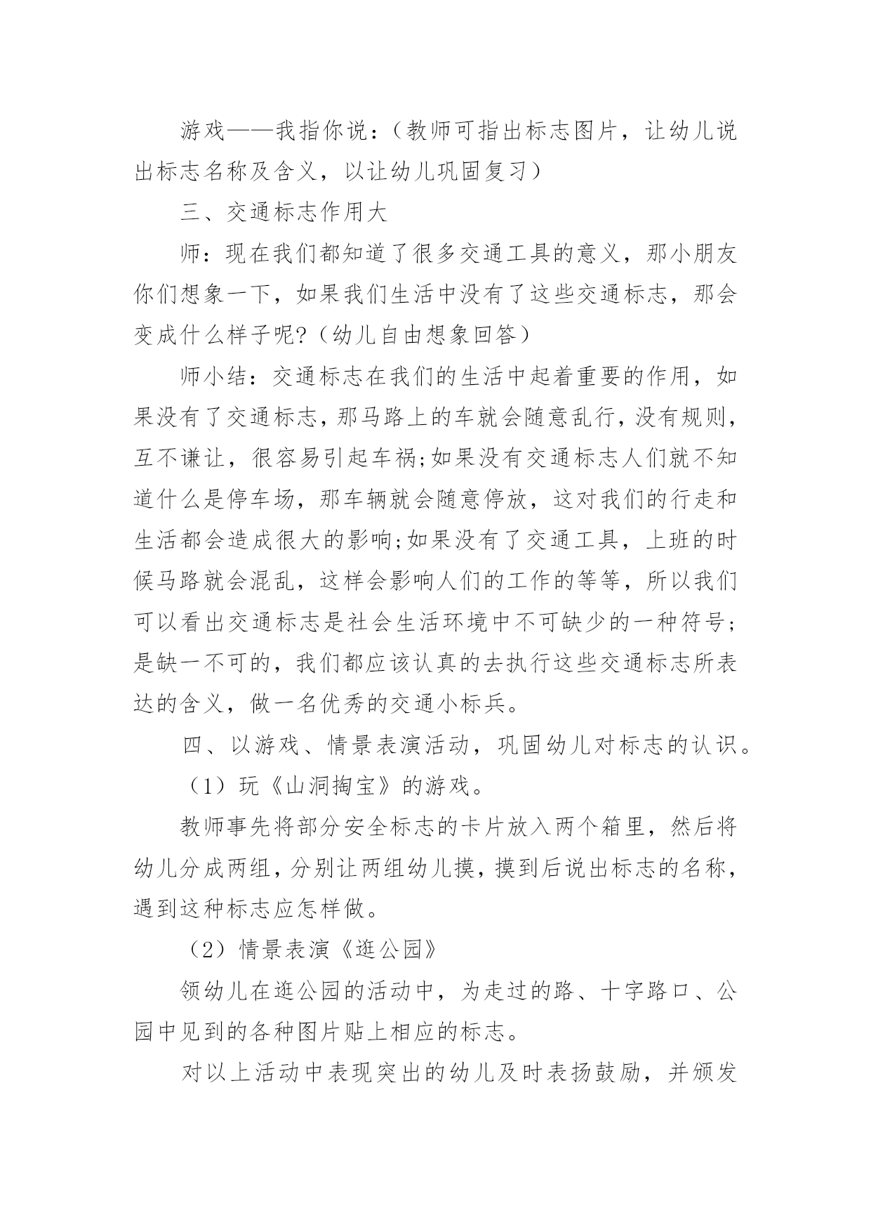 小班认识交通标志教案作为一位杰出的教职工,时常要开展教案准备工作,编写教案有利于我们科学、合理地支配课堂时间。那么教案应该怎么写才合适呢?以下是小编精心整理的小班认识交通标志教案,欢迎大家分享。小班认识交通标志教案1一、运动目的1、感知红、绿灯的特性、用处。2、开端实验用铰剪沿表面线剪,孕育发生敌手工运动的爱好。3、实验按旌旗灯号做行动,开端具有服从交通法则的意识。4、认读汉字“红灯”“绿灯”。运动预备配置马路(没有红绿灯)、红绿腊光、纸、胶水、抹布、牙膏盒、橡皮泥、音乐磁带、灌音机、红绿灯图片、字卡“红灯”、“绿灯”。运动过程:引起幼儿运动爱好师:“瞧,大马路上停着那么多玩具汽车,你们想玩吗?那我们来当小司机,把这些汽车开起来,好吗?开的时间要在马路上开”。幼儿自由玩汽车。(听音乐)师:“汽车累了,我们让他们苏息一下,我们也苏息一下吧。”二、感知红绿灯的特性、用处1、师:“适才,我们玩了开汽车游戏,开心吗?那你们在玩的时间有没有发明什么题目呢?幼儿园教案”(个体报告)“那我们奈何来办理这一题目呢?把你的设法主意和洽朋友说一说好吗?”幼儿相互交换。个体报告。师小结。“那你们知道红、绿灯是什么样子的吗?”(自由报告)2、观察察红、绿灯的特性。出示红绿灯图片。师:“这便是红绿灯。本日,先生还带来了红、绿灯灯的字宝宝。”(认读红绿灯)小结红绿灯的特性。“马路上有了红绿灯,汽车司机开车就平安多了。”“本日,我们就来给大马路装上红绿灯,好吗?”三、制造红绿灯1、提出请求:先生给小朋友预备了一些质料,请小朋友动动小头脑奈何用这些质料来制造红绿灯,先生还为小朋友预备了小铰剪,小朋友利用铰剪的时间要留意平安,剪的时间,沿表面线剪,用完今后把小铰剪的'嘴巴闭拢,轻轻放在箩筐里,剪下来的纸屑放在箩筐里,别的质料也要归放好。2、幼儿自选质料操纵,巡回引导。3、把幼儿的作品放在马路上。“我们小朋友真醒目,给马路装上了红绿灯。马路上有了红绿灯,汽车司机就可以看红绿灯来开车了。如今我们再来当一回小司机好吗?这回小司秘密看旌旗灯号来开车了。四、幼儿园教育随笔游戏“红绿灯”1、交接游戏法则,看旌旗灯号做行动。2、幼儿游戏,模拟开汽车行动,一个随着一个向前跑,按旌旗灯号做行动。小班认识交通标志教案2活动目标:1、认识常见的交通标志,知道标志是社会生活环境中不可缺少的一种符号。2、了解标志的作用和特征。3、培养幼儿的规则意识,激发幼儿对交通标志的兴趣。4、激发幼儿的想象创造标志,培养幼儿的创造能力。5、使幼儿学会按标志行动。教学重点、难点:重点:教幼儿认识部分安全标志,掌握其含义,培养自我保护意识和能力。难点:引导孩子在日常生活中遵守交通规则,较好的处理突发事件,注意安全。活动准备:1、教学活动课件,安全图片。2、事先创设好逛公园环节的场景(如马路、十字路口和各种图片)。3、万宝箱两个、幼儿用的小标志若干,幼儿设计标志用的纸笔等材料。4、小老鼠布偶一个。活动过程:(活动过程的表述不必详细到将教师、学生的所有对话、活动逐字记录,但是应该把活动的主要环节很清楚地再现,即开始环节、基本环节、结束环节、延伸环节。注:重点表述基本环节)一、故事导入:师:小朋友,今天早上有个小动物委托我们帮他一个忙。到底是谁呢?它又遇到了什么困难呢?我们快一起来看看吧!(师出示布偶表演情景戏)师:前几天小老鼠舒克新买了一辆小汽车,这不今天早上它就开着它的小车来我们威海游玩,但是一进城,它发现我们的马路上到处有着很多它不认识的标志,这些标志它从来没有看见过,也不知道是什么意思,所以它不敢开车进城,只好来请教我们小朋友了!二、认识交通标志(播放课件,引起幼儿兴趣)师:瞧!小老鼠舒克把这些交通标志都给画了下来,我们快一起来看看它们都代表着什么意思吧!课件出示各种交通标志的图片,请幼儿自由发表自己的意见,试着说出这些分别是什么标志,分别代表着什么意思)师:刚才小朋友都说出这些标志的意义,那到底说的对不对呢?曾老师来告诉你吧!(师详细讲解每个交通标志的名称及意义)游戏——我指你说:(教师可指出标志图片,让幼儿说出标志名称及含义,以让幼儿巩固复习)三、交通标志作用大师:现在我们都知道了很多交通工具的意义,那小朋友你们想象一下,如果我们生活中没有了这些交通标志,那会变成什么样子呢?(幼儿自由想象回答)师小结:交通标志在我们的生活中起着重要的作用,如果没有了交通标志,那马路上的车就会随意乱行,没有规则,互不谦让,很容易引起车祸;如果没有交通标志人们就不知道什么是停车场,那车辆就会随意停放,这对我们的行走和生活都会造成很大的影响;如果没有了交通工具,上班的时候马路就会混乱,这样会影响人们的工作的等等,所以我们可以看出交通标志是社会生活环境中不可缺少的一种符号;是缺一不可的,我们都应该认真的去执行这些交通