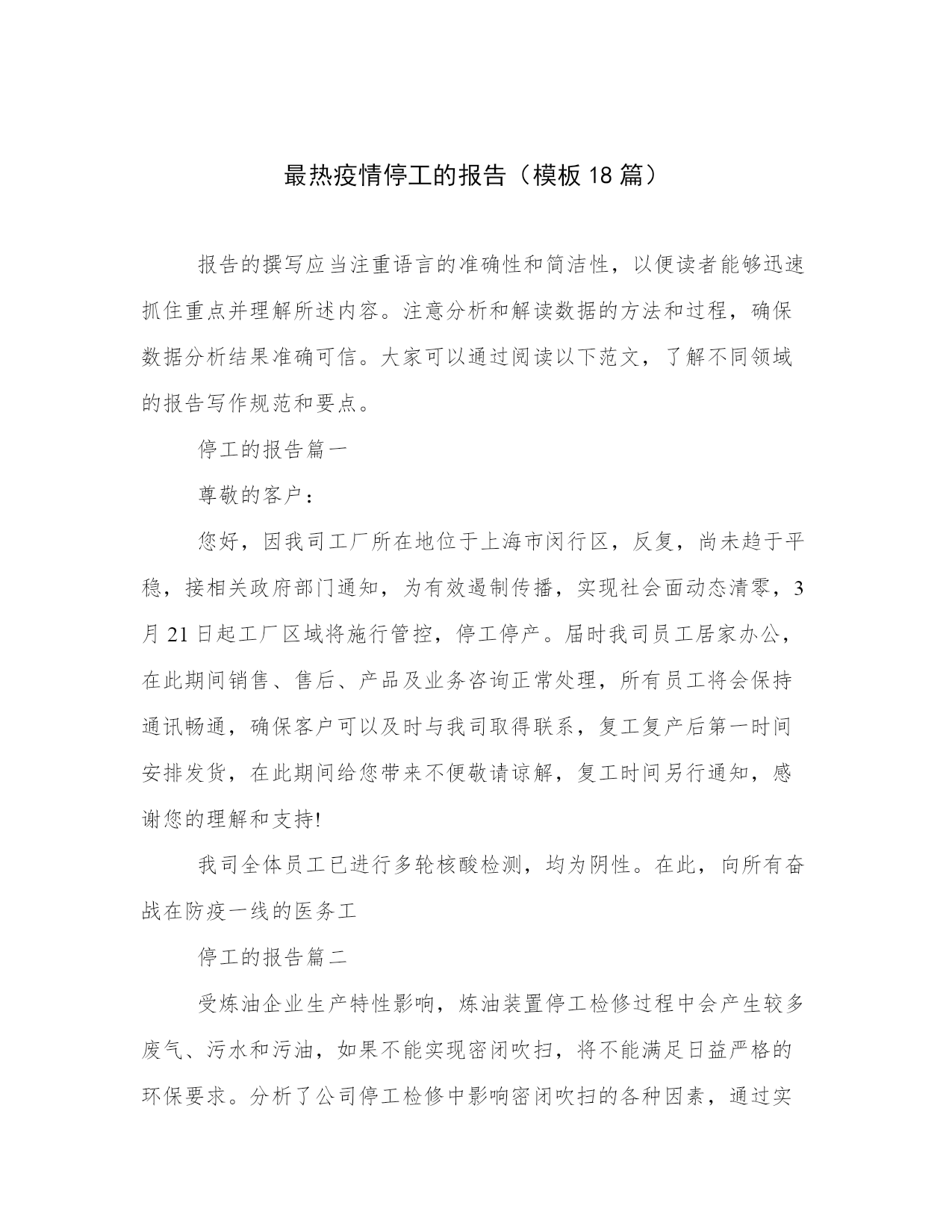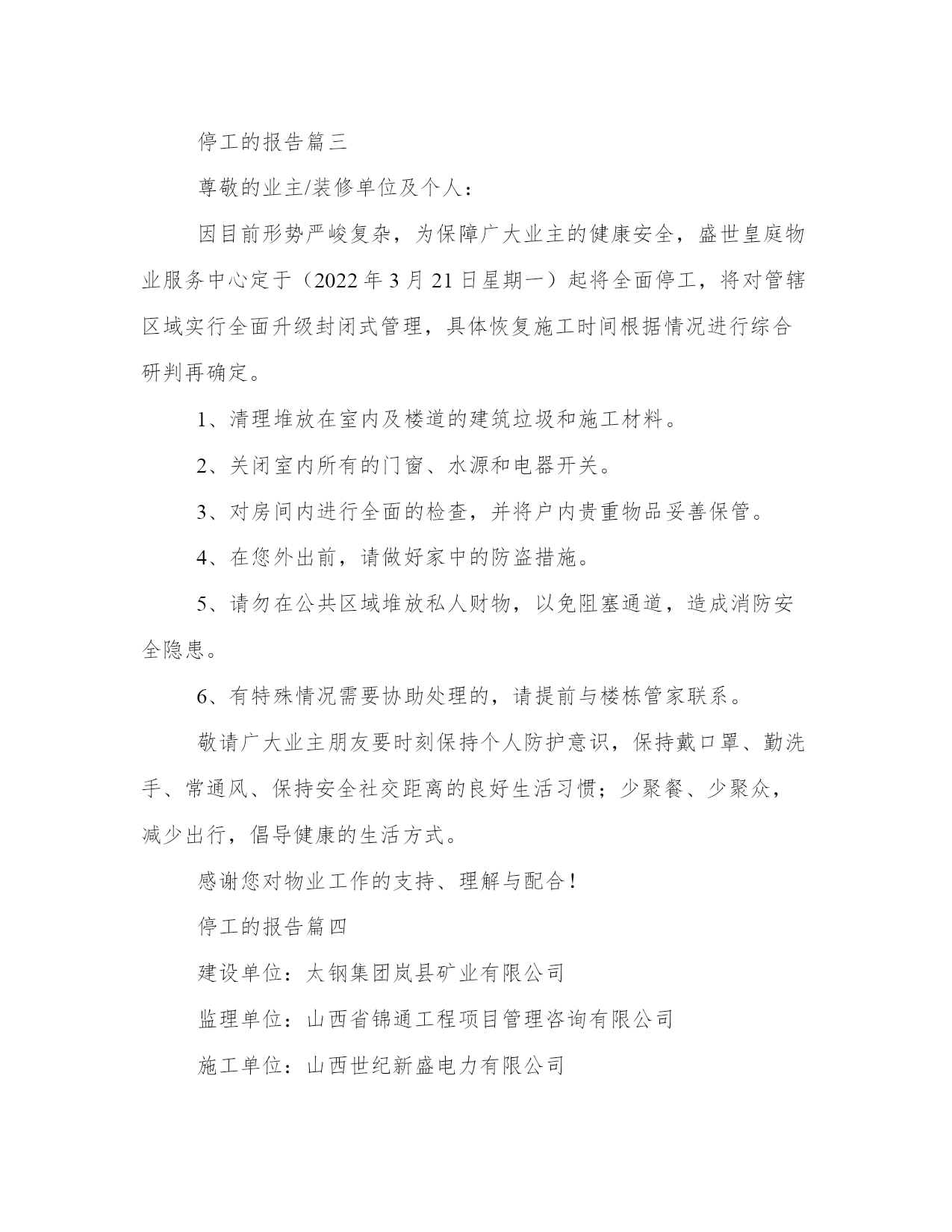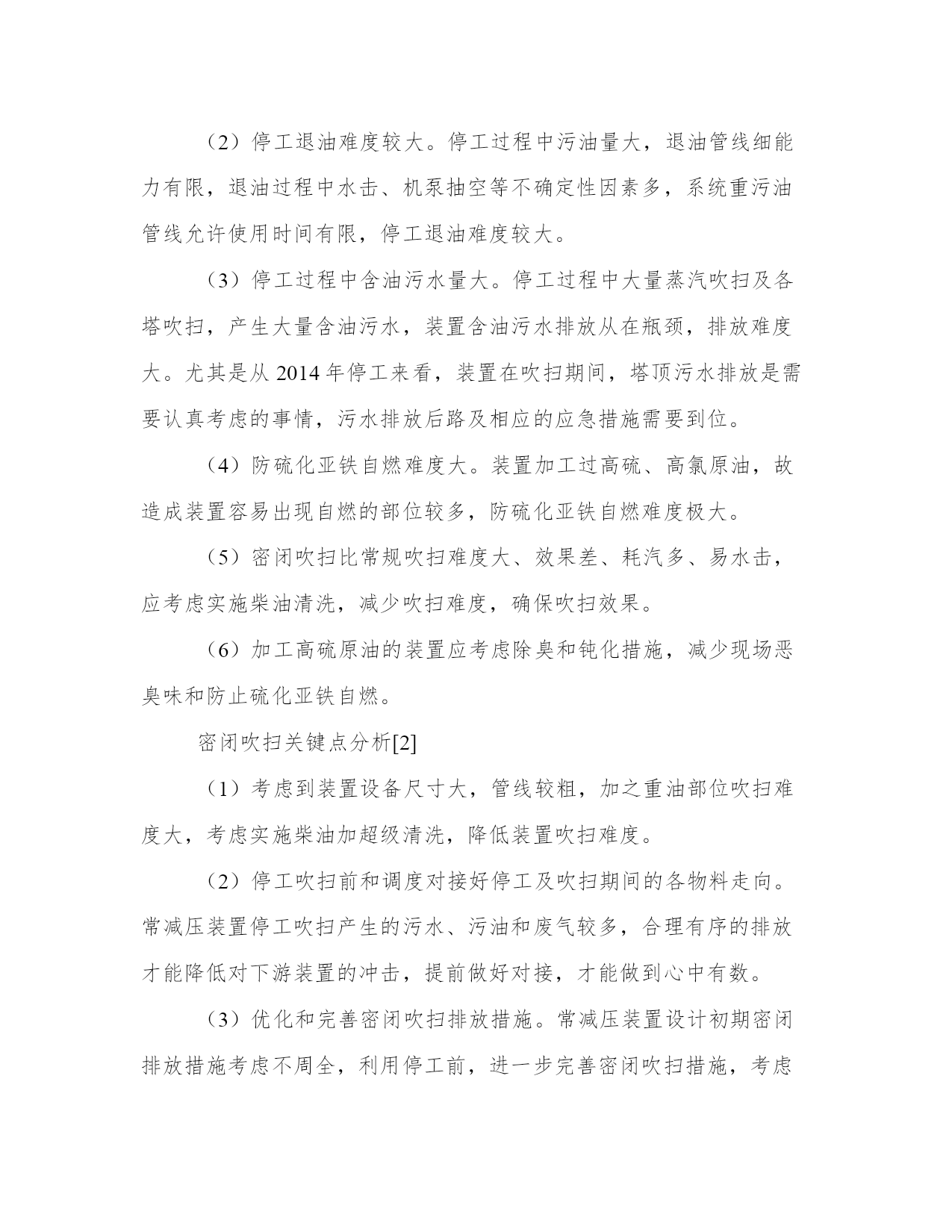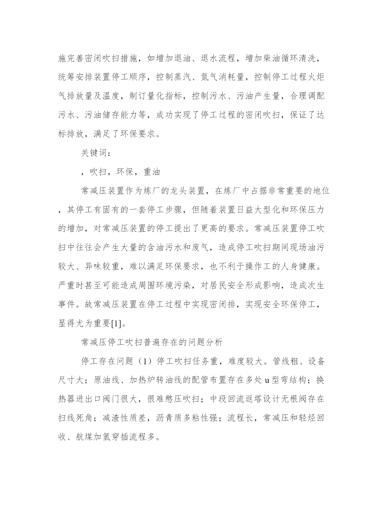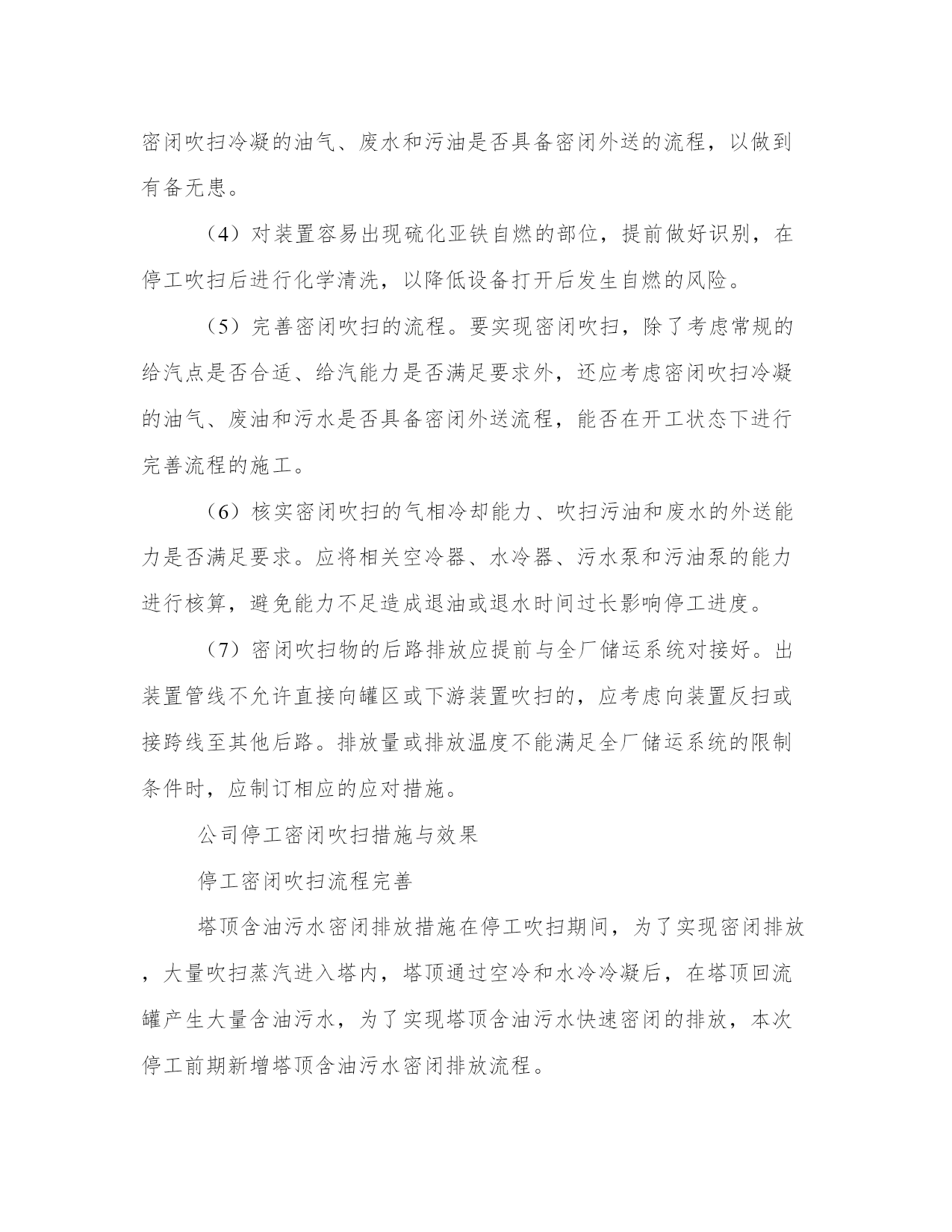 最热疫情停工的报告(模板18篇)报告的撰写应当注重语言的准确性和简洁性,以便读者能够迅速抓住重点并理解所述内容。注意分析和解读数据的方法和过程,确保数据分析结果准确可信。大家可以通过阅读以下范文,了解不同领域的报告写作规范和要点。停工的报告篇一尊敬的客户:您好,因我司工厂所在地位于上海市闵行区,反复,尚未趋于平稳,接相关政府部门通知,为有效遏制传播,实现社会面动态清零,3月21日起工厂区域将施行管控,停工停产。届时我司员工居家办公,在此期间销售、售后、产品及业务咨询正常处理,所有员工将会保持通讯畅通,确保客户可以及时与我司取得联系,复工复产后第一时间安排发货,在此期间给您带来不便敬请谅解,复工时间另行通知,感谢您的理解和支持!我司全体员工已进行多轮核酸检测,均为阴性。在此,向所有奋战在防疫一线的医务工停工的报告篇二受炼油企业生产特性影响,炼油装置停工检修过程中会产生较多废气、污水和污油,如果不能实现密闭吹扫,将不能满足日益严格的环保要求。分析了公司停工检修中影响密闭吹扫的各种因素,通过实施完善密闭吹扫措施,如增加退油、退水流程,增加柴油循环清洗,统筹安排装置停工顺序,控制蒸汽、氮气消耗量,控制停工过程火炬气排放量及温度,制订量化指标,控制污水、污油产生量,合理调配污水、污油储存能力等,成功实现了停工过程的密闭吹扫,保证了达标排放,满足了环保要求。关键词:,吹扫,环保,重油常减压装置作为炼厂的龙头装置,在炼厂中占据非常重要的地位,其停工有固有的一套停工步骤,但随着装置日益大型化和环保压力的增加,对常减压装置的停工提出了更高的要求。常减压装置停工吹扫中往往会产生大量的含油污水和废气,造成停工吹扫期间现场油污较大、异味较重,难以满足环保要求,也不利于操作工的人身健康。严重时甚至可能造成周围环境污染,对居民安全形成影响,造成次生事件。故常减压装置在停工过程中实现密闭排,实现安全环保停工,显得尤为重要[1]。常减压停工吹扫普遍存在的问题分析停工存在问题(1)停工吹扫任务重,难度较大。管线粗、设备尺寸大;原油线、加热炉转油线的配管布置存在多处u型弯结构;换热器进出口阀门很大,很难憋压吹扫;中段回流返塔设计无根阀存在扫线死角;减渣性质差,沥青质多粘性强;流程长,常减压和轻烃回收、航煤加氢穿插流程多。(2)停工退油难度较大。停工过程中污油量大,退油管线细能力有限,退油过程中水击、机泵抽空等不确定性因素多,系统重污油管线允许使用时间有限,停工退油难度较大。(3)停工过程中含油污水量大。停工过程中大量蒸汽吹扫及各塔吹扫,产生大量含油污水,装置含油污水排放从在瓶颈,排放难度大。尤其是从2014年停工来看,装置在吹扫期间,塔顶污水排放是需要认真考虑的事情,污水排放后路及相应的应急措施需要到位。(4)防硫化亚铁自燃难度大。装置加工过高硫、高氯原油,故造成装置容易出现自燃的部位较多,防硫化亚铁自燃难度极大。(5)密闭吹扫比常规吹扫难度大、效果差、耗汽多、易水击,应考虑实施柴油清洗,减少吹扫难度,确保吹扫效果。(6)加工高硫原油的装置应考虑除臭和钝化措施,减少现场恶臭味和防止硫化亚铁自燃。密闭吹扫关键点分析[2](1)考虑到装置设备尺寸大,管线较粗,加之重油部位吹扫难度大,考虑实施柴油加超级清洗,降低装置吹扫难度。(2)停工吹扫前和调度对接好停工及吹扫期间的各物料走向。常减压装置停工吹扫产生的污水、污油和废气较多,合理有序的排放才能降低对下游装置的冲击,提前做好对接,才能做到心中有数。(3)优化和完善密闭吹扫排放措施。常减压装置设计初期密闭排放措施考虑不周全,利用停工前,进一步完善密闭吹扫措施,考虑密闭吹扫冷凝的油气、废水和污油是否具备密闭外送的流程,以做到有备无患。(4)对装置容易出现硫化亚铁自燃的部位,提前做好识别,在停工吹扫后进行化学清洗,以降低设备打开后发生自燃的风险。(5)完善密闭吹扫的流程。要实现密闭吹扫,除了考虑常规的给汽点是否合适、给汽能力是否满足要求外,还应考虑密闭吹扫冷凝的油气、废油和污水是否具备密闭外送流程,能否在开工状态下进行完善流程的施工。(6)核实密闭吹扫的气相冷却能力、吹扫污油和废水的外送能力是否满足要求。应将相关空冷器、水冷器、污水泵和污油泵的能力进行核算,避免能力不足造成退油或退水时间过长影响停工进度。(7)密闭吹扫物的后路排放应提前与全厂储运系统对接好。出装置管线不允许直接向罐区或下游装置吹扫的,应考虑向装置反扫或接跨线至其他后路。排放量或排放温度不能满足全厂储运系统的限制条件时,应制订相应的应对措施。公司停工密闭吹扫措施与效果停工密闭吹扫流程完善塔顶含油污水密闭排放措施在停工吹扫期间,为了实现密闭排放,大量吹扫蒸汽进入塔内,塔顶通过空冷和水冷冷凝后,在塔顶回流罐