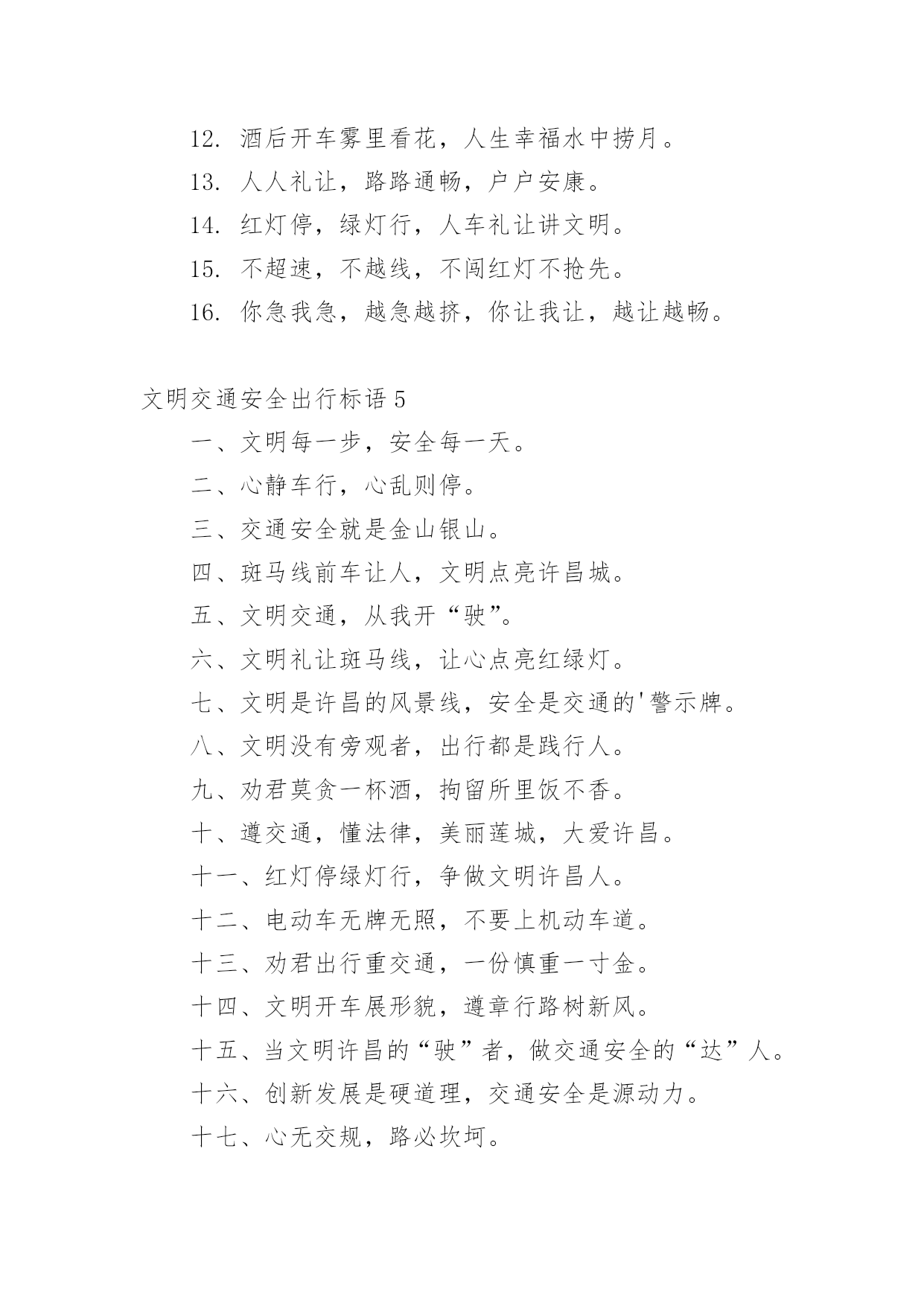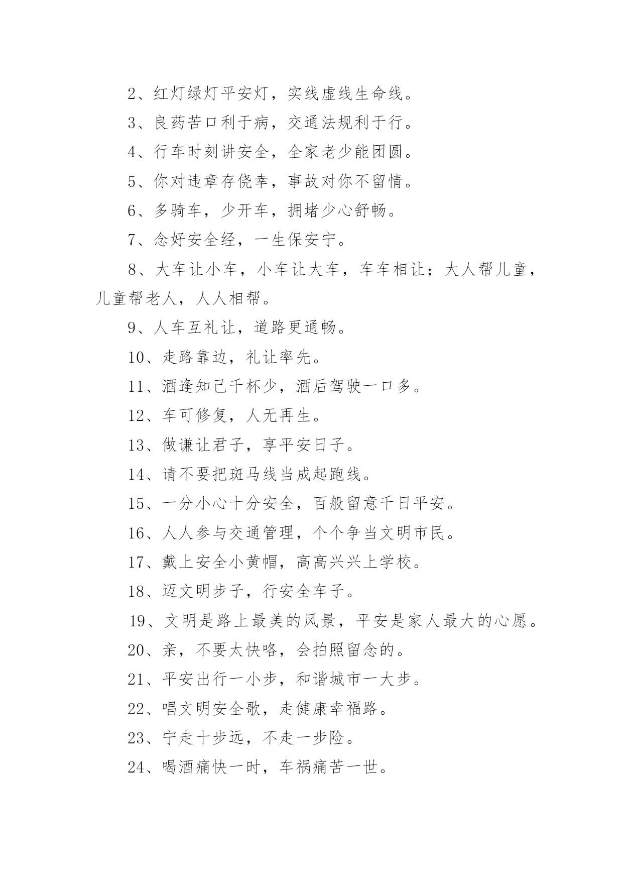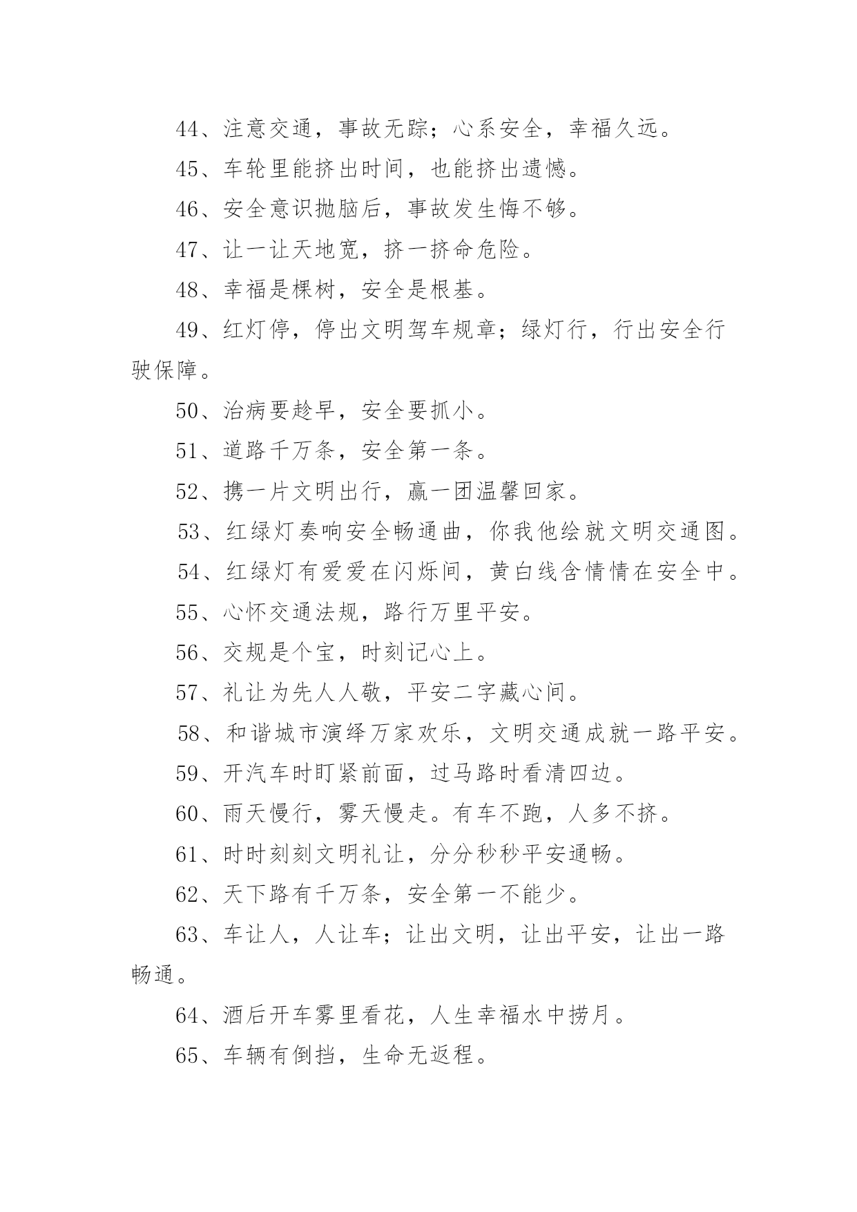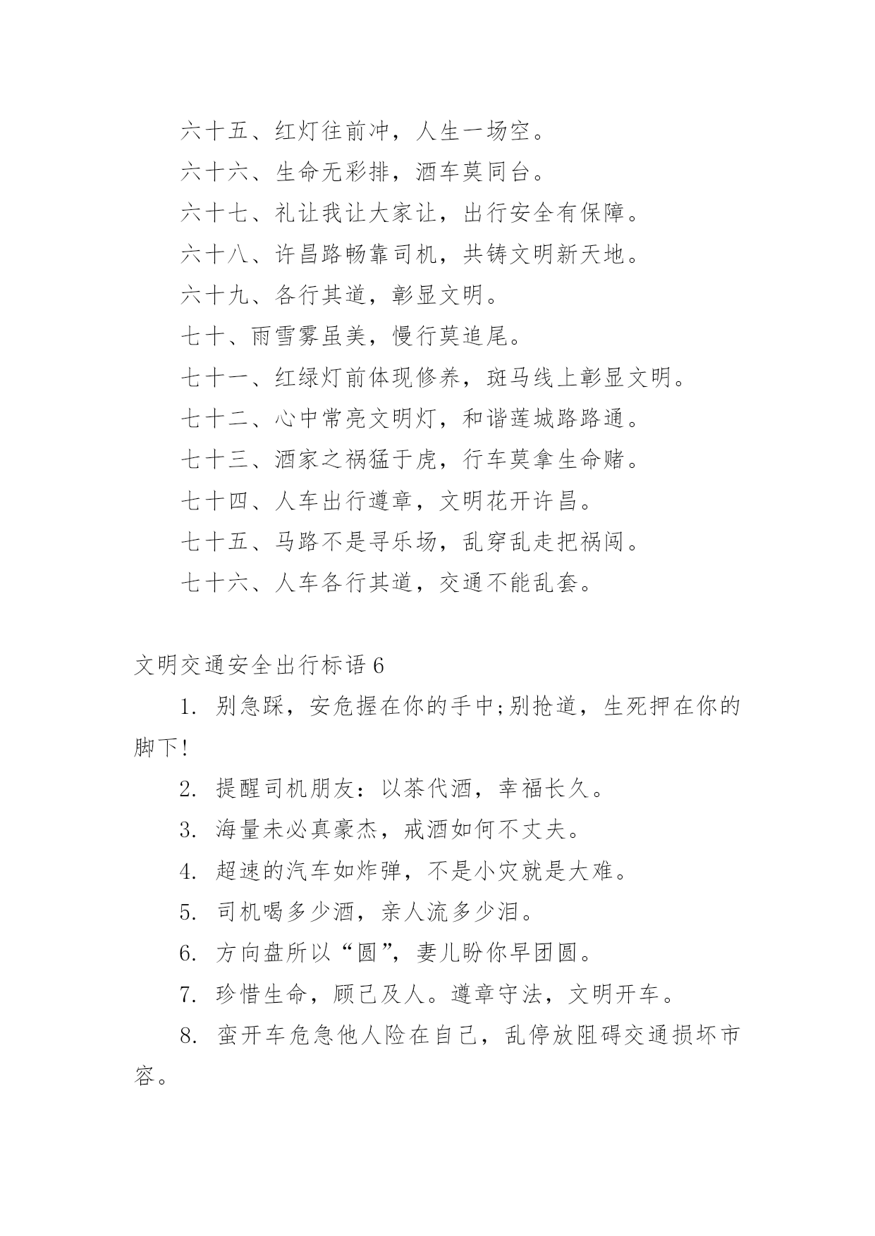 文明交通安全出行标语文明交通安全出行标语7篇在平日的学习、工作和生活里,大家都听说过或者使用过一些比较经典的标语吧,标语对人们的思维是有一定的感性作用的。标语的类型多样,你所见过的标语是什么样的呢?下面是小编精心整理的文明交通安全出行标语,欢迎大家借鉴与参考,希望对大家有所帮助。文明交通安全出行标语1一、酒驾猛于虎,莫拿生命赌。二、长线短线斑马线,线线连着生命线。三、你我的“行”相,柳州的形象。四、美丽柳州我的家,文明出行靠大家。五、谦让是一种心境,安全是一种责任。六、幸福柳州家园相守,交通文明邀您遵守。七、做文明人,开文明车,行平安路,回幸福家。八、有一种文明是交通礼让,有一种和谐是平安出行。九、出行尊重你我他,文明柳州靠大家。十、做幸福柳州市民,树文明交通形象。文明交通安全出行标语21、手牵手打造平安交通,心连心构建和谐城市。2、红灯绿灯平安灯,实线虚线生命线。3、良药苦口利于病,交通法规利于行。4、行车时刻讲安全,全家老少能团圆。5、你对违章存侥幸,事故对你不留情。6、多骑车,少开车,拥堵少心舒畅。7、念好安全经,一生保安宁。8、大车让小车,小车让大车,车车相让;大人帮儿童,儿童帮老人,人人相帮。9、人车互礼让,道路更通畅。10、走路靠边,礼让率先。11、酒逢知己千杯少,酒后驾驶一口多。12、车可修复,人无再生。13、做谦让君子,享平安日子。14、请不要把斑马线当成起跑线。15、一分小心十分安全,百般留意千日平安。16、人人参与交通管理,个个争当文明市民。17、戴上安全小黄帽,高高兴兴上学校。18、迈文明步子,行安全车子。19、文明是路上最美的风景,平安是家人最大的心愿。20、亲,不要太快咯,会拍照留念的。21、平安出行一小步,和谐城市一大步。22、唱文明安全歌,走健康幸福路。23、宁走十步远,不走一步险。24、喝酒痛快一时,车祸痛苦一世。25、抢一秒,悲伤痛苦少不了;慢一分,安全幸福伴终身。26、违章行驶悬崖边——危险;文明交通道路宽——平安。27、眼睛容不得一粒沙土,安全来不得半点马虎。28、多看一眼,安全保险;多防一步,不出事故。29、驰万里察交通,莫游戏须认真。30、步步走好,人生美好。31、倡导文明交通新风尚,争当平安出行守法人。32、让超载远离我们,让安全装上你车。33、走文明路,开文明车,做文明人。34、千里之行,“慎”于足下。35、分秒的等待,一路的平安。36、安全像张弓,不拉它就松,要想保安全,常把弓弦绷。37、安全是歌,谁唱谁清醒,谁听谁安宁;安全是钟,常鸣则耳聪,不鸣则耳聋。38、安全是朵幸福花,合家浇灌美如画。39、文明交通人人参与,和谐城市处处温馨。40、做人要大度,开车要小心。41、饮酒后驾车,独木桥上走。42、酒逢知己千杯少,酒驾上路事故多。43、疲劳酒后驾车险,转弯鸣号莫等闲;超车占道违了规,一场车祸真难免。44、注意交通,事故无踪;心系安全,幸福久远。45、车轮里能挤出时间,也能挤出遗憾。46、安全意识抛脑后,事故发生悔不够。47、让一让天地宽,挤一挤命危险。48、幸福是棵树,安全是根基。49、红灯停,停出文明驾车规章;绿灯行,行出安全行驶保障。50、治病要趁早,安全要抓小。51、道路千万条,安全第一条。52、携一片文明出行,赢一团温馨回家。53、红绿灯奏响安全畅通曲,你我他绘就文明交通图。54、红绿灯有爱爱在闪烁间,黄白线含情情在安全中。55、心怀交通法规,路行万里平安。56、交规是个宝,时刻记心上。57、礼让为先人人敬,平安二字藏心间。58、和谐城市演绎万家欢乐,文明交通成就一路平安。59、开汽车时盯紧前面,过马路时看清四边。60、雨天慢行,雾天慢走。有车不跑,人多不挤。61、时时刻刻文明礼让,分分秒秒平安通畅。62、天下路有千万条,安全第一不能少。63、车让人,人让车;让出文明,让出平安,让出一路畅通。64、酒后开车雾里看花,人生幸福水中捞月。65、车辆有倒挡,生命无返程。66、带一分小心出门,携万分安心回家。67、红绿灯前看文明,斑马线上显温馨。68、安全在我心,文明伴我行。69、绿灯可以再等,生命不能重来。70、谨慎为安全上保险,麻痹为事故埋地雷。71、大家小家都是家,交通法规靠万家。72、安全靠自己,行为要规范。73、遵章行驶从从容容,平安幸福实实在在。文明交通安全出行标语31.为你让路,显我风度。2.让一让,道路更通畅;忍一忍,安全有保证。3.黄绿红灯要遵守,马路当前勿逞雄;交通安全日日宣,哪天有志必达成。4.交通是大事,文明礼让是好事,确保安全不戳事,违规行驶要犯事!5.醉眼迷离,催生多少不平事;安全行车,留下几多温馨情。6.无秩不安,无序则乱,遵章行驶,安全出行。7.你守法,我守法,交通安全有章法;你文明,我文明,xx才能更文明。8.货车,轿车,摩托车,车车安全行驶