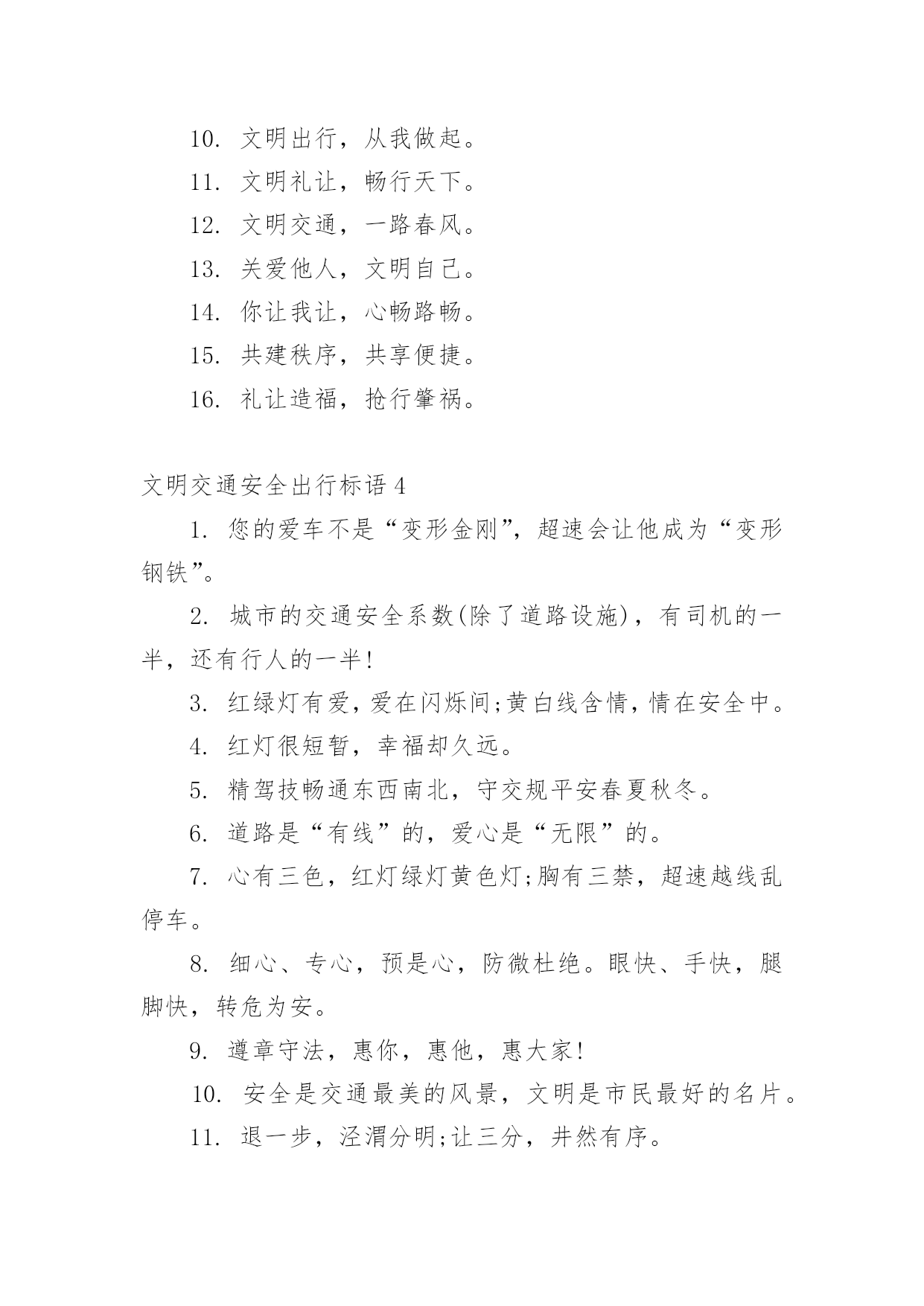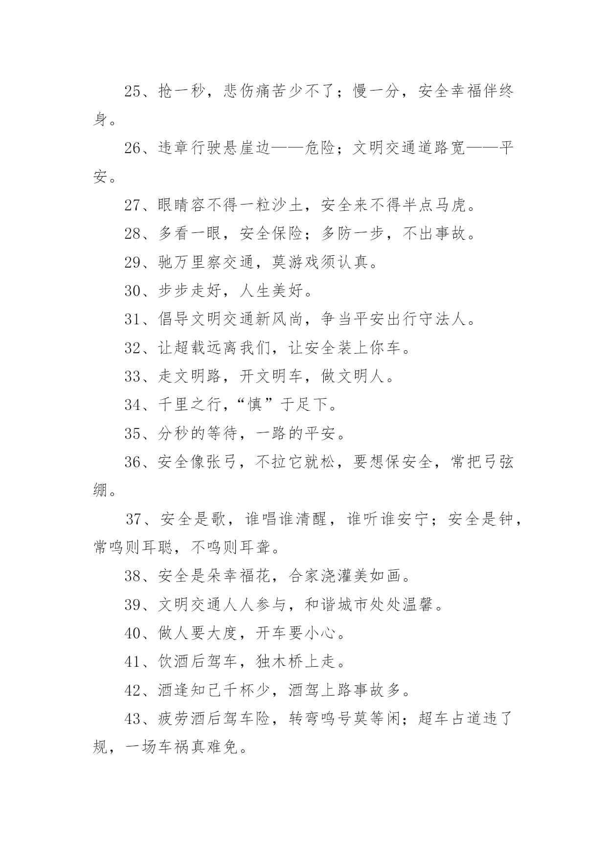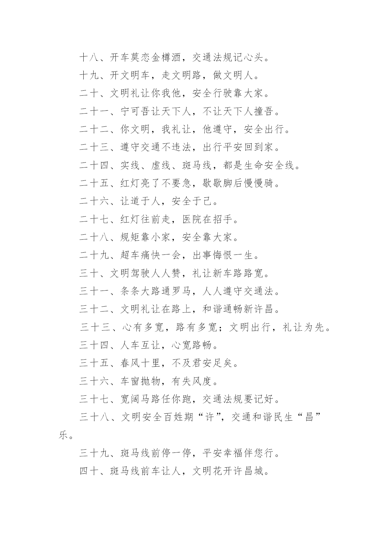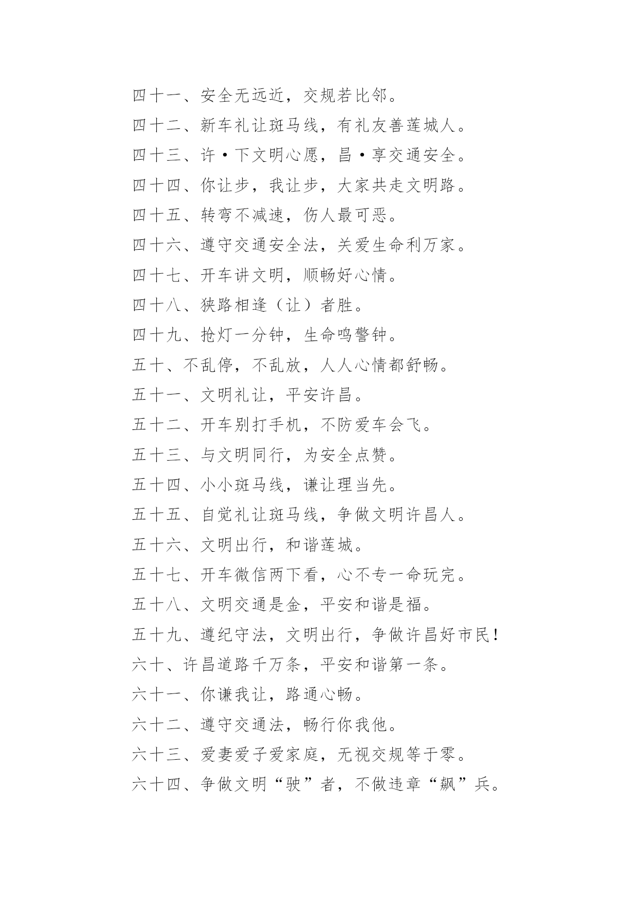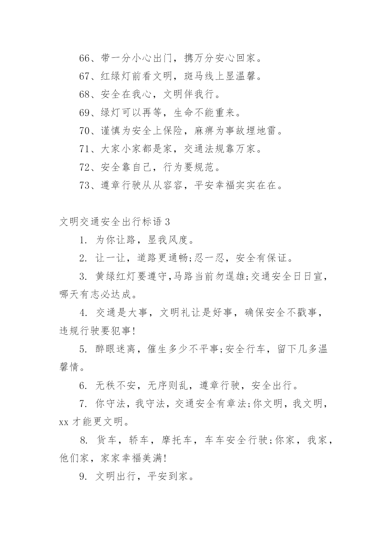 文明交通安全出行标语文明交通安全出行标语7篇在平日的学习、工作和生活里,大家都听说过或者使用过一些比较经典的标语吧,标语对人们的思维是有一定的感性作用的。标语的类型多样,你所见过的标语是什么样的呢?下面是小编精心整理的文明交通安全出行标语,欢迎大家借鉴与参考,希望对大家有所帮助。文明交通安全出行标语1一、酒驾猛于虎,莫拿生命赌。二、长线短线斑马线,线线连着生命线。三、你我的“行”相,柳州的形象。四、美丽柳州我的家,文明出行靠大家。五、谦让是一种心境,安全是一种责任。六、幸福柳州家园相守,交通文明邀您遵守。七、做文明人,开文明车,行平安路,回幸福家。八、有一种文明是交通礼让,有一种和谐是平安出行。九、出行尊重你我他,文明柳州靠大家。十、做幸福柳州市民,树文明交通形象。文明交通安全出行标语21、手牵手打造平安交通,心连心构建和谐城市。2、红灯绿灯平安灯,实线虚线生命线。3、良药苦口利于病,交通法规利于行。4、行车时刻讲安全,全家老少能团圆。5、你对违章存侥幸,事故对你不留情。6、多骑车,少开车,拥堵少心舒畅。7、念好安全经,一生保安宁。8、大车让小车,小车让大车,车车相让;大人帮儿童,儿童帮老人,人人相帮。9、人车互礼让,道路更通畅。10、走路靠边,礼让率先。11、酒逢知己千杯少,酒后驾驶一口多。12、车可修复,人无再生。13、做谦让君子,享平安日子。14、请不要把斑马线当成起跑线。15、一分小心十分安全,百般留意千日平安。16、人人参与交通管理,个个争当文明市民。17、戴上安全小黄帽,高高兴兴上学校。18、迈文明步子,行安全车子。19、文明是路上最美的风景,平安是家人最大的心愿。20、亲,不要太快咯,会拍照留念的。21、平安出行一小步,和谐城市一大步。22、唱文明安全歌,走健康幸福路。23、宁走十步远,不走一步险。24、喝酒痛快一时,车祸痛苦一世。25、抢一秒,悲伤痛苦少不了;慢一分,安全幸福伴终身。26、违章行驶悬崖边——危险;文明交通道路宽——平安。27、眼睛容不得一粒沙土,安全来不得半点马虎。28、多看一眼,安全保险;多防一步,不出事故。29、驰万里察交通,莫游戏须认真。30、步步走好,人生美好。31、倡导文明交通新风尚,争当平安出行守法人。32、让超载远离我们,让安全装上你车。33、走文明路,开文明车,做文明人。34、千里之行,“慎”于足下。35、分秒的等待,一路的平安。36、安全像张弓,不拉它就松,要想保安全,常把弓弦绷。37、安全是歌,谁唱谁清醒,谁听谁安宁;安全是钟,常鸣则耳聪,不鸣则耳聋。38、安全是朵幸福花,合家浇灌美如画。39、文明交通人人参与,和谐城市处处温馨。40、做人要大度,开车要小心。41、饮酒后驾车,独木桥上走。42、酒逢知己千杯少,酒驾上路事故多。43、疲劳酒后驾车险,转弯鸣号莫等闲;超车占道违了规,一场车祸真难免。44、注意交通,事故无踪;心系安全,幸福久远。45、车轮里能挤出时间,也能挤出遗憾。46、安全意识抛脑后,事故发生悔不够。47、让一让天地宽,挤一挤命危险。48、幸福是棵树,安全是根基。49、红灯停,停出文明驾车规章;绿灯行,行出安全行驶保障。50、治病要趁早,安全要抓小。51、道路千万条,安全第一条。52、携一片文明出行,赢一团温馨回家。53、红绿灯奏响安全畅通曲,你我他绘就文明交通图。54、红绿灯有爱爱在闪烁间,黄白线含情情在安全中。55、心怀交通法规,路行万里平安。56、交规是个宝,时刻记心上。57、礼让为先人人敬,平安二字藏心间。58、和谐城市演绎万家欢乐,文明交通成就一路平安。59、开汽车时盯紧前面,过马路时看清四边。60、雨天慢行,雾天慢走。有车不跑,人多不挤。61、时时刻刻文明礼让,分分秒秒平安通畅。62、天下路有千万条,安全第一不能少。63、车让人,人让车;让出文明,让出平安,让出一路畅通。64、酒后开车雾里看花,人生幸福水中捞月。65、车辆有倒挡,生命无返程。66、带一分小心出门,携万分安心回家。67、红绿灯前看文明,斑马线上显温馨。68、安全在我心,文明伴我行。69、绿灯可以再等,生命不能重来。70、谨慎为安全上保险,麻痹为事故埋地雷。71、大家小家都是家,交通法规靠万家。72、安全靠自己,行为要规范。73、遵章行驶从从容容,平安幸福实实在在。文明交通安全出行标语31.为你让路,显我风度。2.让一让,道路更通畅;忍一忍,安全有保证。3.黄绿红灯要遵守,马路当前勿逞雄;交通安全日日宣,哪天有志必达成。4.交通是大事,文明礼让是好事,确保安全不戳事,违规行驶要犯事!5.醉眼迷离,催生多少不平事;安全行车,留下几多温馨情。6.无秩不安,无序则乱,遵章行驶,安全出行。7.你守法,我守法,交通安全有章法;你文明,我文明,xx才能更文明。8.货车,轿车,摩托车,车车安全行驶
