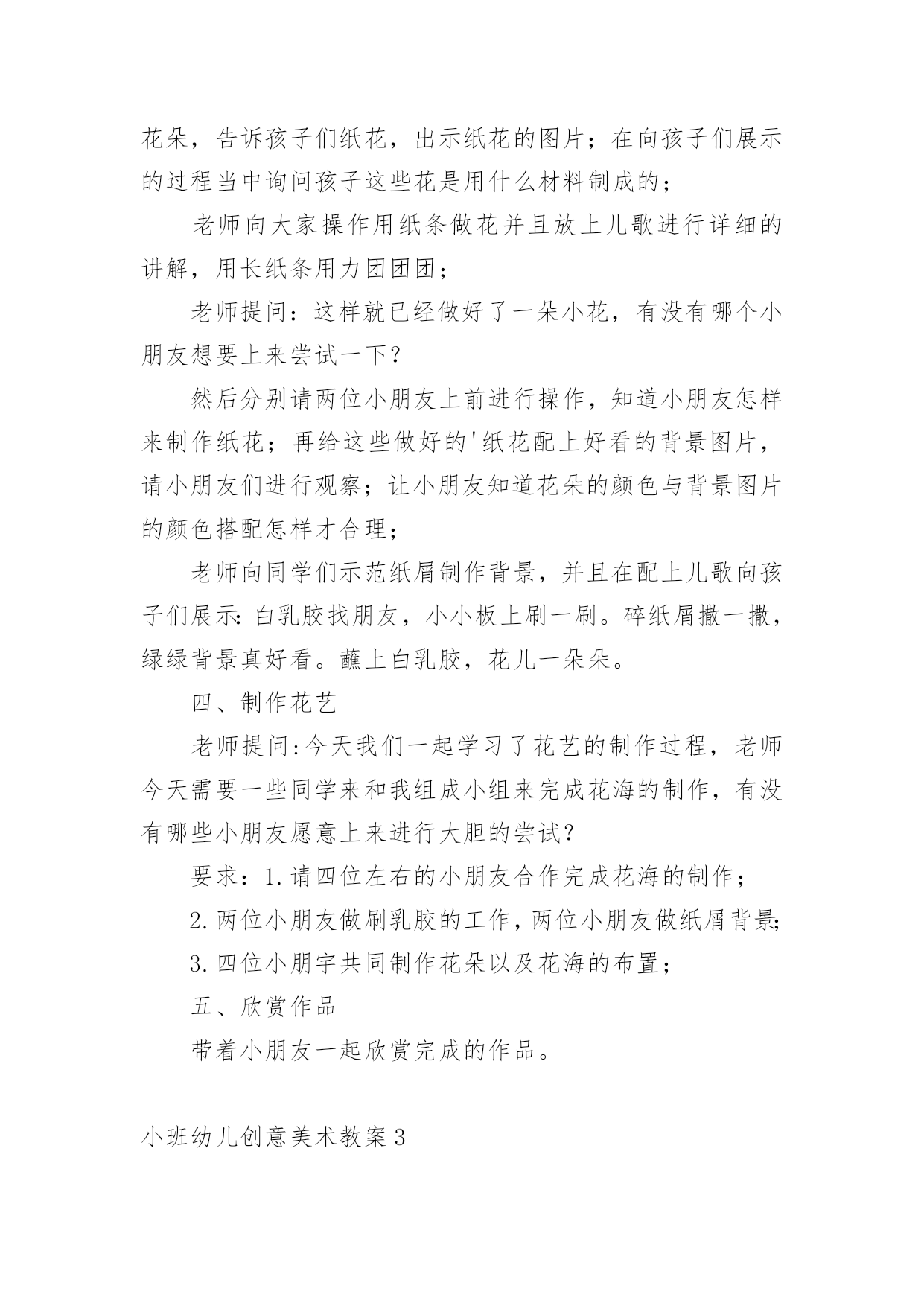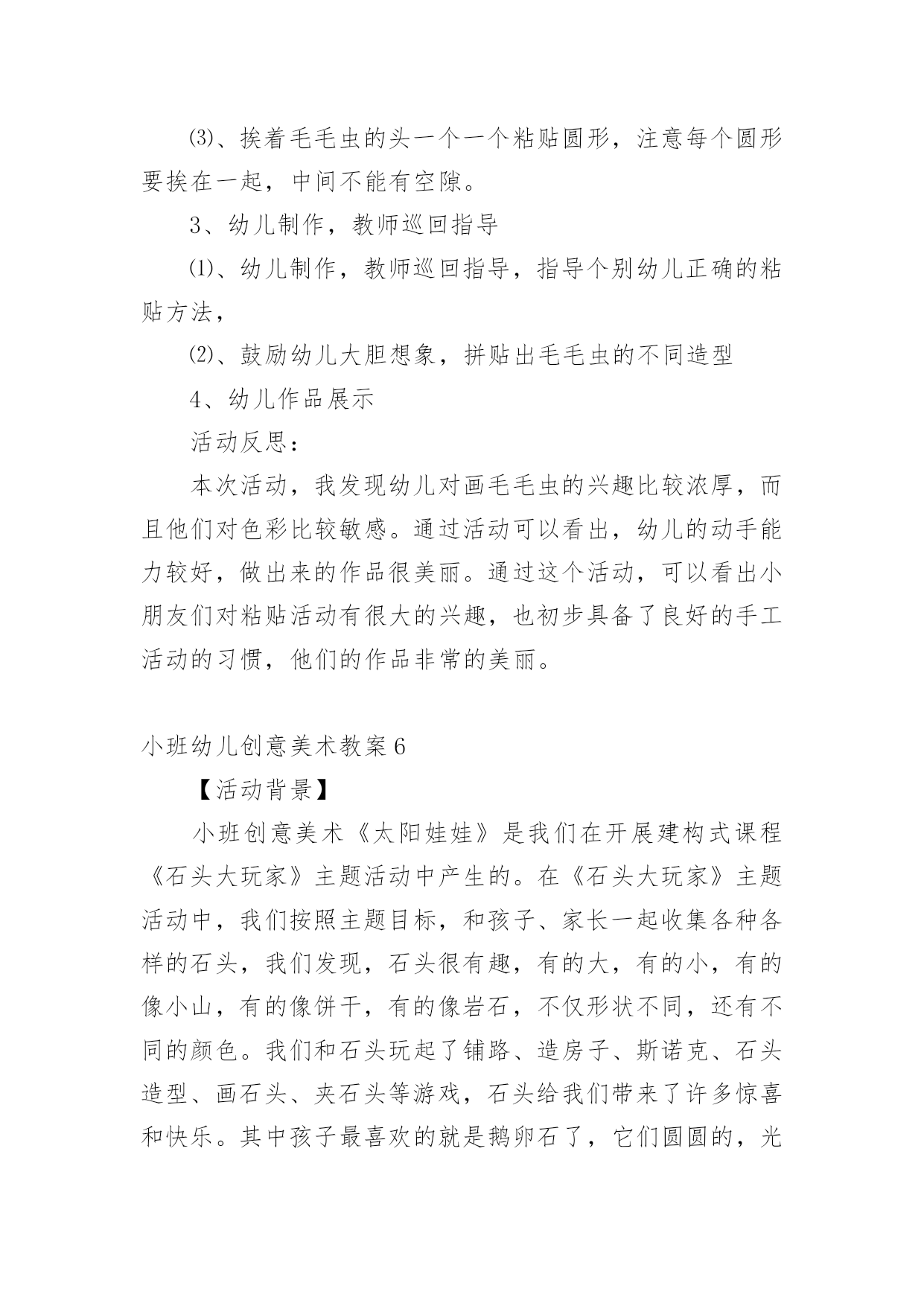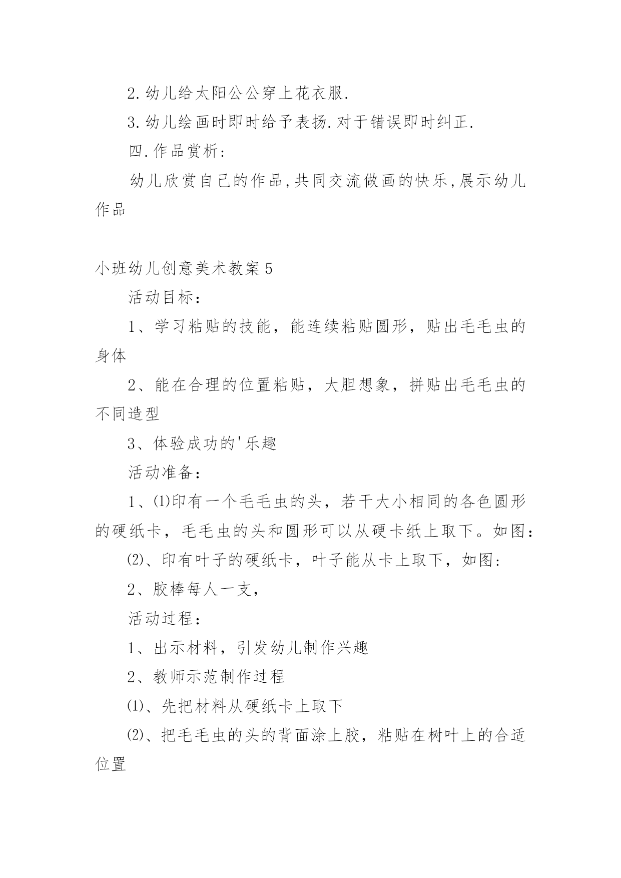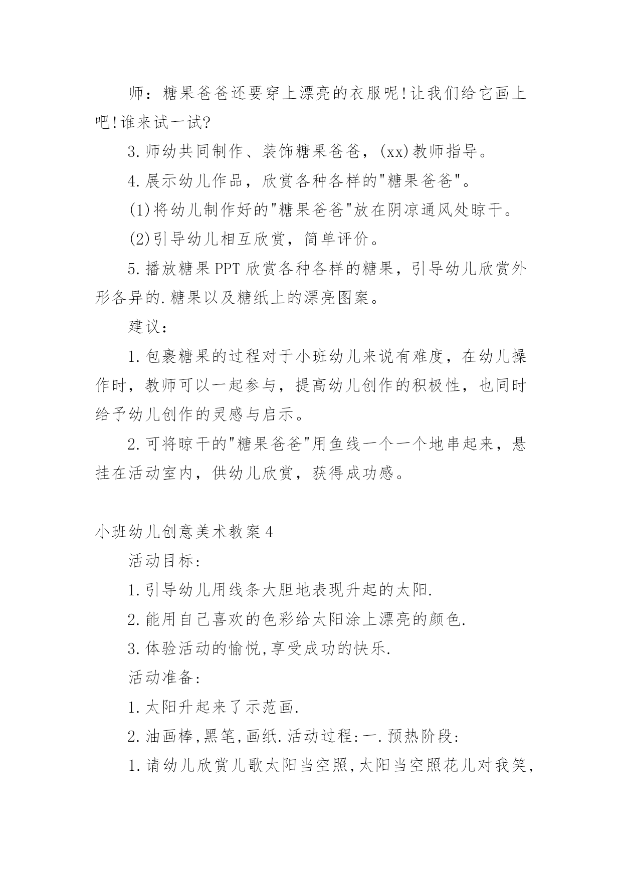 小班幼儿创意美术教案作为一名教职工,时常会需要准备好教案,编写教案有利于我们准确把握教材的重点与难点,进而选择恰当的教学方法。那么应当如何写教案呢?下面是小编精心整理的小班幼儿创意美术教案,希望对大家有所帮助。小班幼儿创意美术教案1活动目标:1、通过瓶盖拓印使幼儿初步萌发艺术创作欲望。2、初步培养幼儿构图能力,及想象添画能力。3、练习用大小不同的瓶盖印染出不同的圆或圆圈,并添画出有情节的画面。活动准备:课件“小瓶盖变魔术”;大小不同的瓶盖;颜料、纸、画笔。活动过程:一、让全体幼儿在一张大纸上随意印染瓶盖,然后请幼儿观察讨论所印染的瓶盖象什么。二、请幼儿根据讨论结果自由在大纸上进行添画,看看所印染的瓶盖变成了什么。三、幼儿根据所添画的.印染的瓶盖互相讨论如何将他们组成一幅美丽的画,然后教师根据幼儿的表述,进行课件操作,让幼儿直观的看到自己表述的结果。四、幼儿根据想象进行制作添画,教师巡回指导。指导要点:1、幼儿能否充分发挥想象进行添画。2、画面构图是否合理。活动延伸:幼儿互相参观作品,布置展板。小班幼儿创意美术教案2一、活动目标通过让宝宝进行大胆的观察会激发宝宝想象能力,让宝宝了解花艺;宝宝在活动过程当中更愿意进行大胆的尝试,运用撒、团等手法制作花海;愿意与同伴进行合作分享,懂得团队的重要性;二、活动准备1.美术作品鲜花、纸花艺图片、背景音乐;2.颜色不同的纸张、纸屑、纸条;3.排笔、篮子、乳胶、花盆、盘子;三、活动过程1.欣赏花艺作品——鲜花老师一边展示美术作品一边向孩子们进行讲解,告诉孩子在我们的周围有各种各样的花问小朋友最喜欢什么样的花,可以从颜色、大小、形状等方面进行描述;2.欣赏美术作品——纸花艺老师向孩子们展示自己带来的一朵用特殊材料制成的花朵,告诉孩子们纸花,出示纸花的图片;在向孩子们展示的过程当中询问孩子这些花是用什么材料制成的;老师向大家操作用纸条做花并且放上儿歌进行详细的讲解,用长纸条用力团团团;老师提问:这样就已经做好了一朵小花,有没有哪个小朋友想要上来尝试一下?然后分别请两位小朋友上前进行操作,知道小朋友怎样来制作纸花;再给这些做好的'纸花配上好看的背景图片,请小朋友们进行观察;让小朋友知道花朵的颜色与背景图片的颜色搭配怎样才合理;老师向同学们示范纸屑制作背景,并且在配上儿歌向孩子们展示:白乳胶找朋友,小小板上刷一刷。碎纸屑撒一撒,绿绿背景真好看。蘸上白乳胶,花儿一朵朵。四、制作花艺老师提问:今天我们一起学习了花艺的制作过程,老师今天需要一些同学来和我组成小组来完成花海的制作,有没有哪些小朋友愿意上来进行大胆的尝试?要求:1.请四位左右的小朋友合作完成花海的制作;2.两位小朋友做刷乳胶的工作,两位小朋友做纸屑背景;3.四位小朋宇共同制作花朵以及花海的布置;五、欣赏作品带着小朋友一起欣赏完成的作品。小班幼儿创意美术教案3活动目标:1.尝试用报纸包废旧纸盒、易拉罐等变出大糖果,并用手指点印画的方式装饰糖果。2.了解废旧物品可以制成美丽的物品,有初步的环保意识。3.体验制作大糖果的乐趣。活动准备:1.经验准备:幼儿在区域里用小糖纸包过糖果。2.糖果实物若干、糖果图片PPT、背景音乐。3.幼儿收集做糖果用的易拉罐,足够的废报纸、颜料、抹布等。4.用来挂糖果的绳子、夹子。活动过程:一、魔术盒变出糖果宝宝,引起幼儿对糖果的兴趣。师:小糖果们想要有个糖果爸爸,这个糖果爸爸比别的糖果都要大,都要精神,我们一起来做超级大的糖果爸爸吧!2.出示装饰材料,探索制作糖果爸爸的方法。(1)介绍报纸、易拉罐等,引起幼儿包裹的兴趣。(2)启发幼儿探索将"糖果"(罐子)包入"糖纸"(报纸),握紧中间,两头拧紧的方法。(3)请个别幼儿示范操作,教师讲解包装的要点。大报纸,放放平,大糖果,放一边,向前卷,向前卷,左拧拧,右拧拧,大唐果,做好了。(4)出示颜料,引导幼儿用手指点画的方式装饰。师:糖果爸爸还要穿上漂亮的衣服呢!让我们给它画上吧!谁来试一试?3.师幼共同制作、装饰糖果爸爸,(xx)教师指导。4.展示幼儿作品,欣赏各种各样的"糖果爸爸"。(1)将幼儿制作好的"糖果爸爸"放在阴凉通风处晾干。(2)引导幼儿相互欣赏,简单评价。5.播放糖果PPT欣赏各种各样的糖果,引导幼儿欣赏外形各异的.糖果以及糖纸上的漂亮图案。建议:1.包裹糖果的过程对于小班幼儿来说有难度,在幼儿操作时,教师可以一起参与,提高幼儿创作的积极性,也同时给予幼儿创作的灵感与启示。2.可将晾干的"糖果爸爸"用鱼线一个一个地串起来,悬挂在活动室内,供幼儿欣赏,获得成功感。小班幼儿创意美术教案4活动目标:1.引导幼儿用线条大胆地表现升起的太阳.2.能用自己喜欢的色彩给太阳涂上漂亮的颜色.3.体验活动的愉悦,享受成功的快乐.活动准备:1.太阳升起来了示范画.2.油画棒,黑笔,
