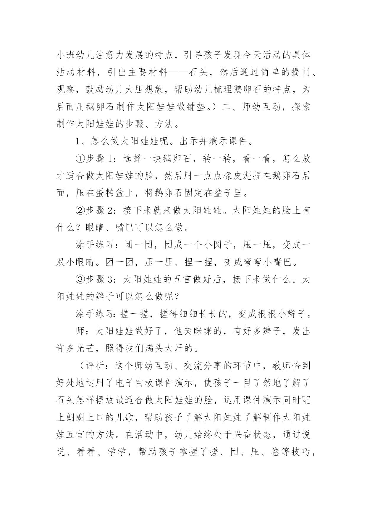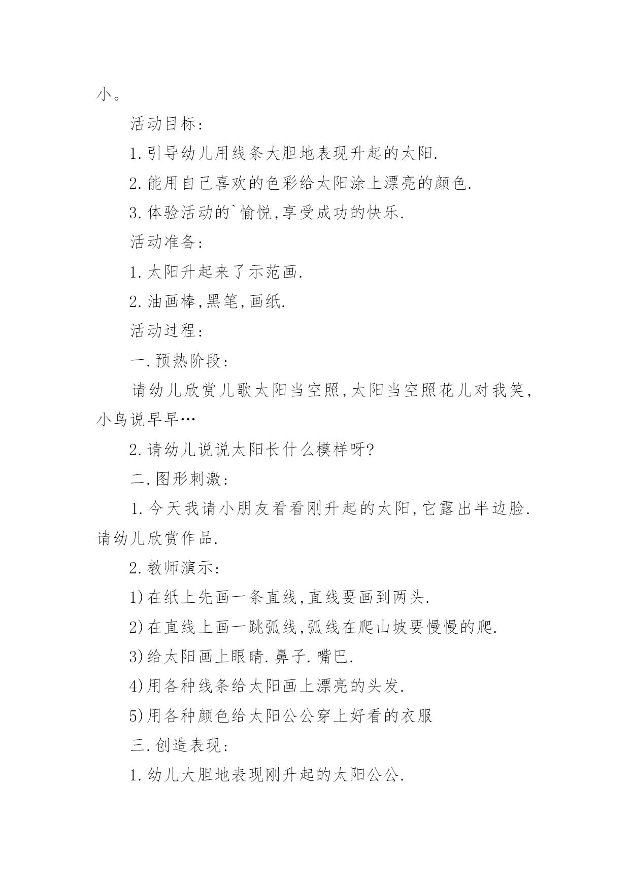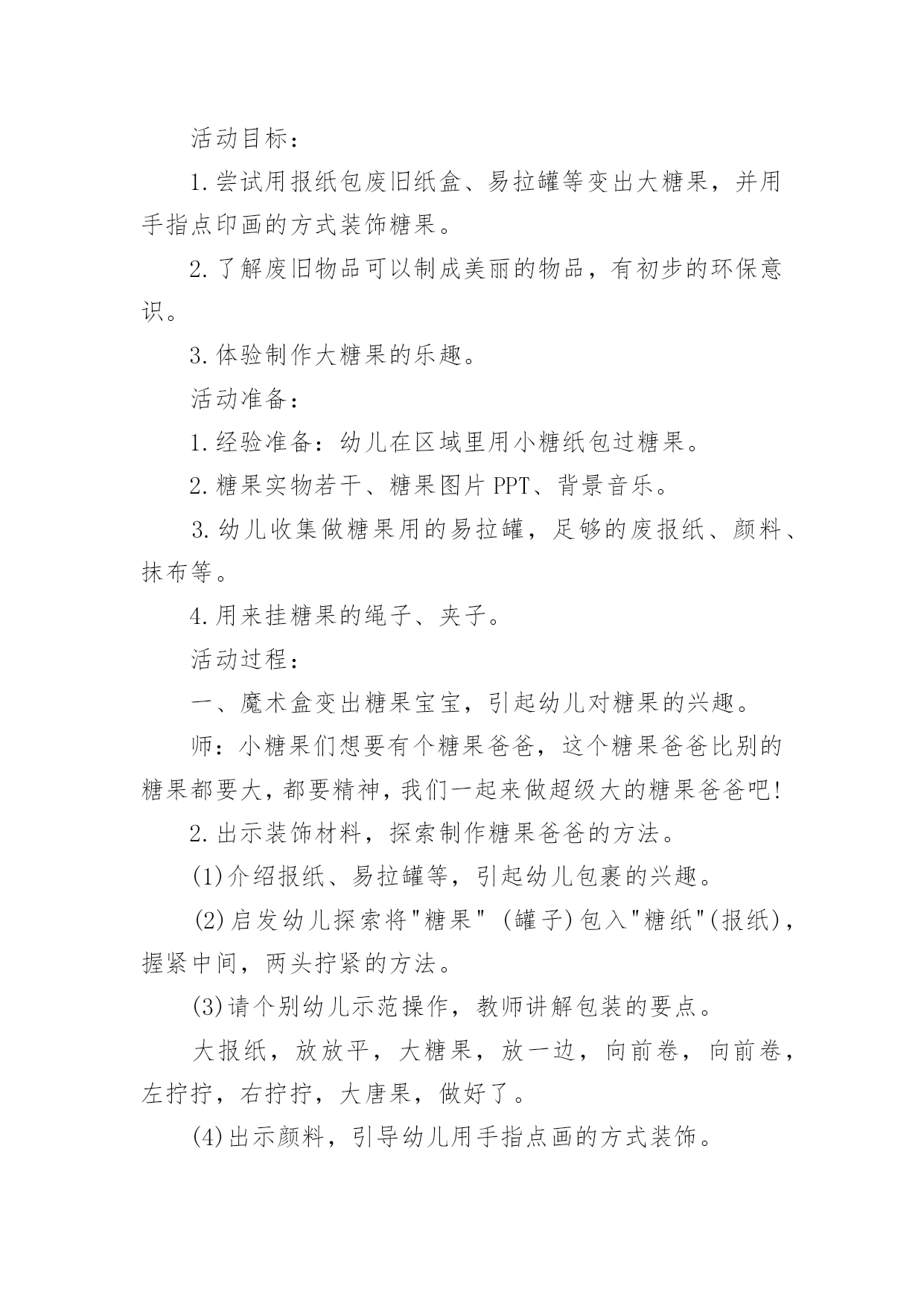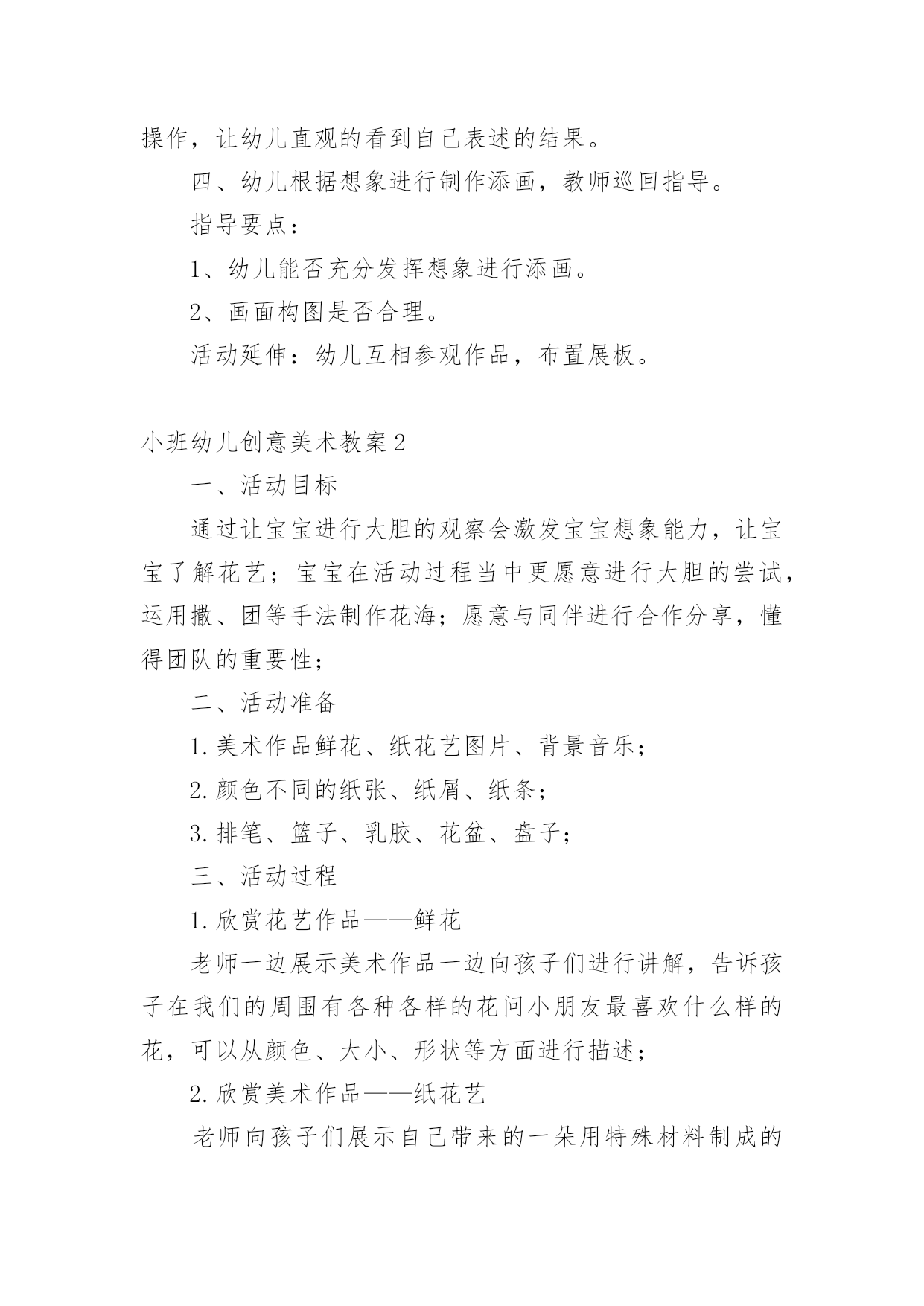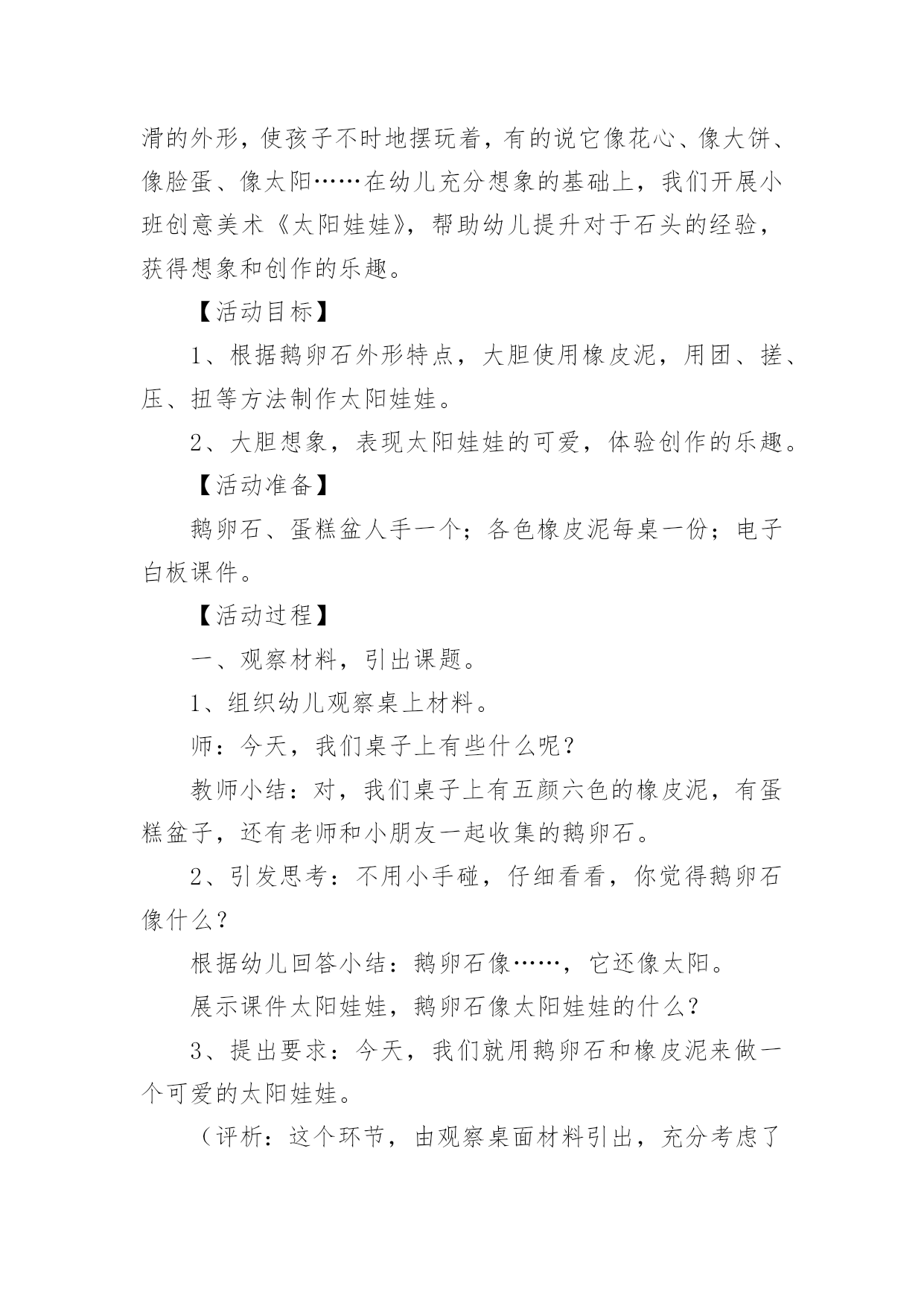 小班幼儿创意美术教案作为一名教职工,时常会需要准备好教案,编写教案有利于我们准确把握教材的重点与难点,进而选择恰当的教学方法。那么应当如何写教案呢?下面是小编精心整理的小班幼儿创意美术教案,希望对大家有所帮助。小班幼儿创意美术教案1活动目标:1、通过瓶盖拓印使幼儿初步萌发艺术创作欲望。2、初步培养幼儿构图能力,及想象添画能力。3、练习用大小不同的瓶盖印染出不同的圆或圆圈,并添画出有情节的画面。活动准备:课件“小瓶盖变魔术”;大小不同的瓶盖;颜料、纸、画笔。活动过程:一、让全体幼儿在一张大纸上随意印染瓶盖,然后请幼儿观察讨论所印染的瓶盖象什么。二、请幼儿根据讨论结果自由在大纸上进行添画,看看所印染的瓶盖变成了什么。三、幼儿根据所添画的.印染的瓶盖互相讨论如何将他们组成一幅美丽的画,然后教师根据幼儿的表述,进行课件操作,让幼儿直观的看到自己表述的结果。四、幼儿根据想象进行制作添画,教师巡回指导。指导要点:1、幼儿能否充分发挥想象进行添画。2、画面构图是否合理。活动延伸:幼儿互相参观作品,布置展板。小班幼儿创意美术教案2一、活动目标通过让宝宝进行大胆的观察会激发宝宝想象能力,让宝宝了解花艺;宝宝在活动过程当中更愿意进行大胆的尝试,运用撒、团等手法制作花海;愿意与同伴进行合作分享,懂得团队的重要性;二、活动准备1.美术作品鲜花、纸花艺图片、背景音乐;2.颜色不同的纸张、纸屑、纸条;3.排笔、篮子、乳胶、花盆、盘子;三、活动过程1.欣赏花艺作品——鲜花老师一边展示美术作品一边向孩子们进行讲解,告诉孩子在我们的周围有各种各样的花问小朋友最喜欢什么样的花,可以从颜色、大小、形状等方面进行描述;2.欣赏美术作品——纸花艺老师向孩子们展示自己带来的一朵用特殊材料制成的花朵,告诉孩子们纸花,出示纸花的图片;在向孩子们展示的过程当中询问孩子这些花是用什么材料制成的;老师向大家操作用纸条做花并且放上儿歌进行详细的讲解,用长纸条用力团团团;老师提问:这样就已经做好了一朵小花,有没有哪个小朋友想要上来尝试一下?然后分别请两位小朋友上前进行操作,知道小朋友怎样来制作纸花;再给这些做好的'纸花配上好看的背景图片,请小朋友们进行观察;让小朋友知道花朵的颜色与背景图片的颜色搭配怎样才合理;老师向同学们示范纸屑制作背景,并且在配上儿歌向孩子们展示:白乳胶找朋友,小小板上刷一刷。碎纸屑撒一撒,绿绿背景真好看。蘸上白乳胶,花儿一朵朵。四、制作花艺老师提问:今天我们一起学习了花艺的制作过程,老师今天需要一些同学来和我组成小组来完成花海的制作,有没有哪些小朋友愿意上来进行大胆的尝试?要求:1.请四位左右的小朋友合作完成花海的制作;2.两位小朋友做刷乳胶的工作,两位小朋友做纸屑背景;3.四位小朋宇共同制作花朵以及花海的布置;五、欣赏作品带着小朋友一起欣赏完成的作品。小班幼儿创意美术教案3活动目标:1.尝试用报纸包废旧纸盒、易拉罐等变出大糖果,并用手指点印画的方式装饰糖果。2.了解废旧物品可以制成美丽的物品,有初步的环保意识。3.体验制作大糖果的乐趣。活动准备:1.经验准备:幼儿在区域里用小糖纸包过糖果。2.糖果实物若干、糖果图片PPT、背景音乐。3.幼儿收集做糖果用的易拉罐,足够的废报纸、颜料、抹布等。4.用来挂糖果的绳子、夹子。活动过程:一、魔术盒变出糖果宝宝,引起幼儿对糖果的兴趣。师:小糖果们想要有个糖果爸爸,这个糖果爸爸比别的糖果都要大,都要精神,我们一起来做超级大的糖果爸爸吧!2.出示装饰材料,探索制作糖果爸爸的方法。(1)介绍报纸、易拉罐等,引起幼儿包裹的兴趣。(2)启发幼儿探索将"糖果"(罐子)包入"糖纸"(报纸),握紧中间,两头拧紧的方法。(3)请个别幼儿示范操作,教师讲解包装的要点。大报纸,放放平,大糖果,放一边,向前卷,向前卷,左拧拧,右拧拧,大唐果,做好了。(4)出示颜料,引导幼儿用手指点画的方式装饰。师:糖果爸爸还要穿上漂亮的衣服呢!让我们给它画上吧!谁来试一试?3.师幼共同制作、装饰糖果爸爸,(xx)教师指导。4.展示幼儿作品,欣赏各种各样的"糖果爸爸"。(1)将幼儿制作好的"糖果爸爸"放在阴凉通风处晾干。(2)引导幼儿相互欣赏,简单评价。5.播放糖果PPT欣赏各种各样的糖果,引导幼儿欣赏外形各异的.糖果以及糖纸上的漂亮图案。建议:1.包裹糖果的过程对于小班幼儿来说有难度,在幼儿操作时,教师可以一起参与,提高幼儿创作的积极性,也同时给予幼儿创作的灵感与启示。2.可将晾干的"糖果爸爸"用鱼线一个一个地串起来,悬挂在活动室内,供幼儿欣赏,获得成功感。小班幼儿创意美术教案4活动目标:1.引导幼儿用线条大胆地表现升起的太阳.2.能用自己喜欢的色彩给太阳涂上漂亮的颜色.3.体验活动的愉悦,享受成功的快乐.活动准备:1.太阳升起来了示范画.2.油画棒,黑笔,