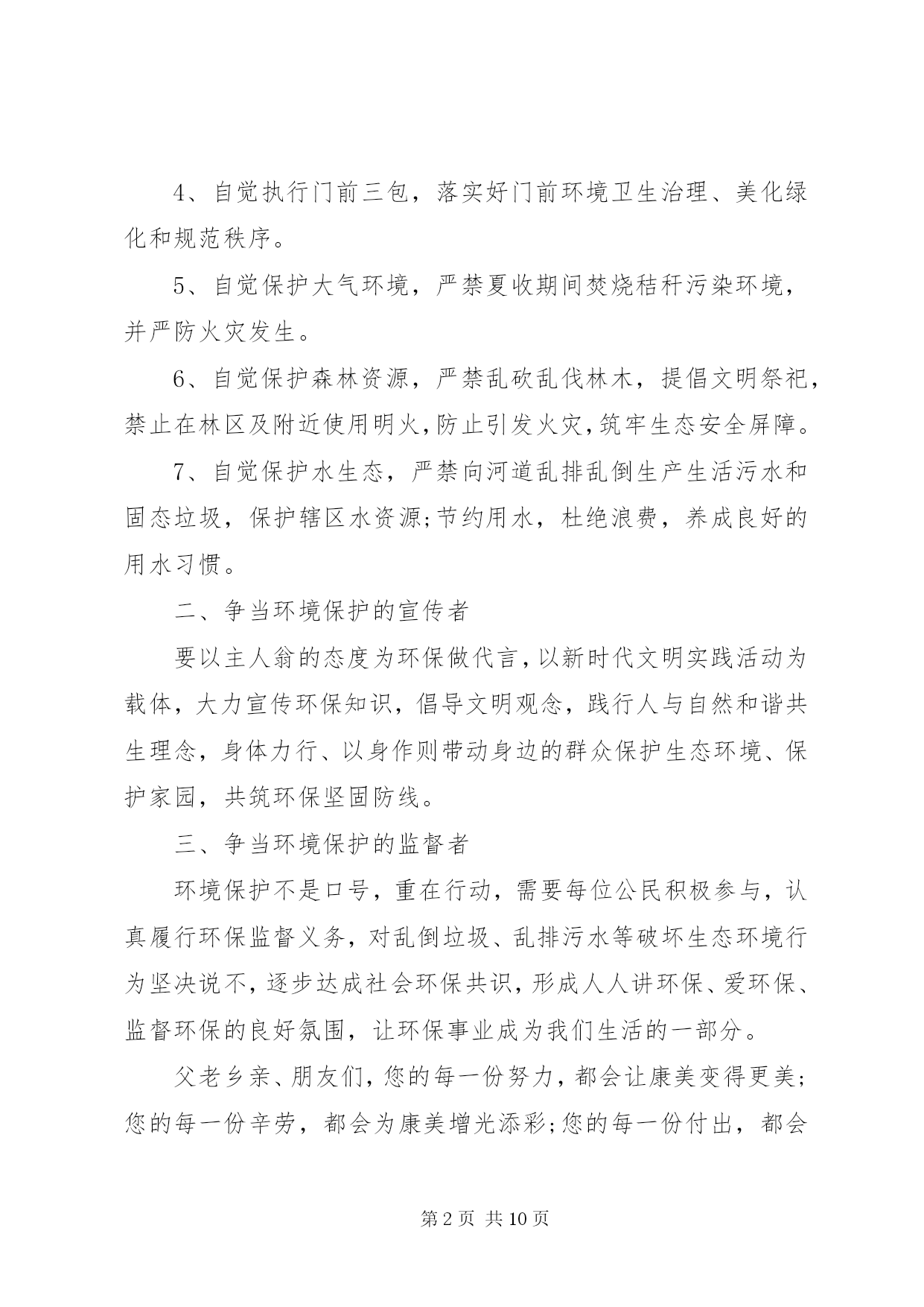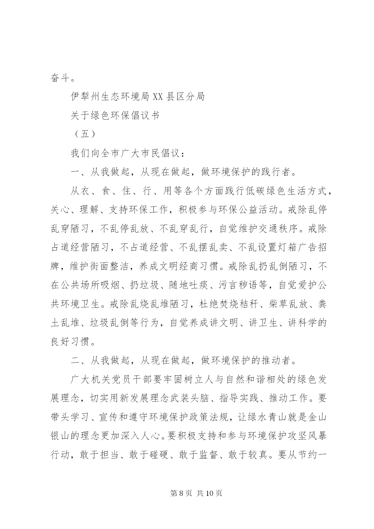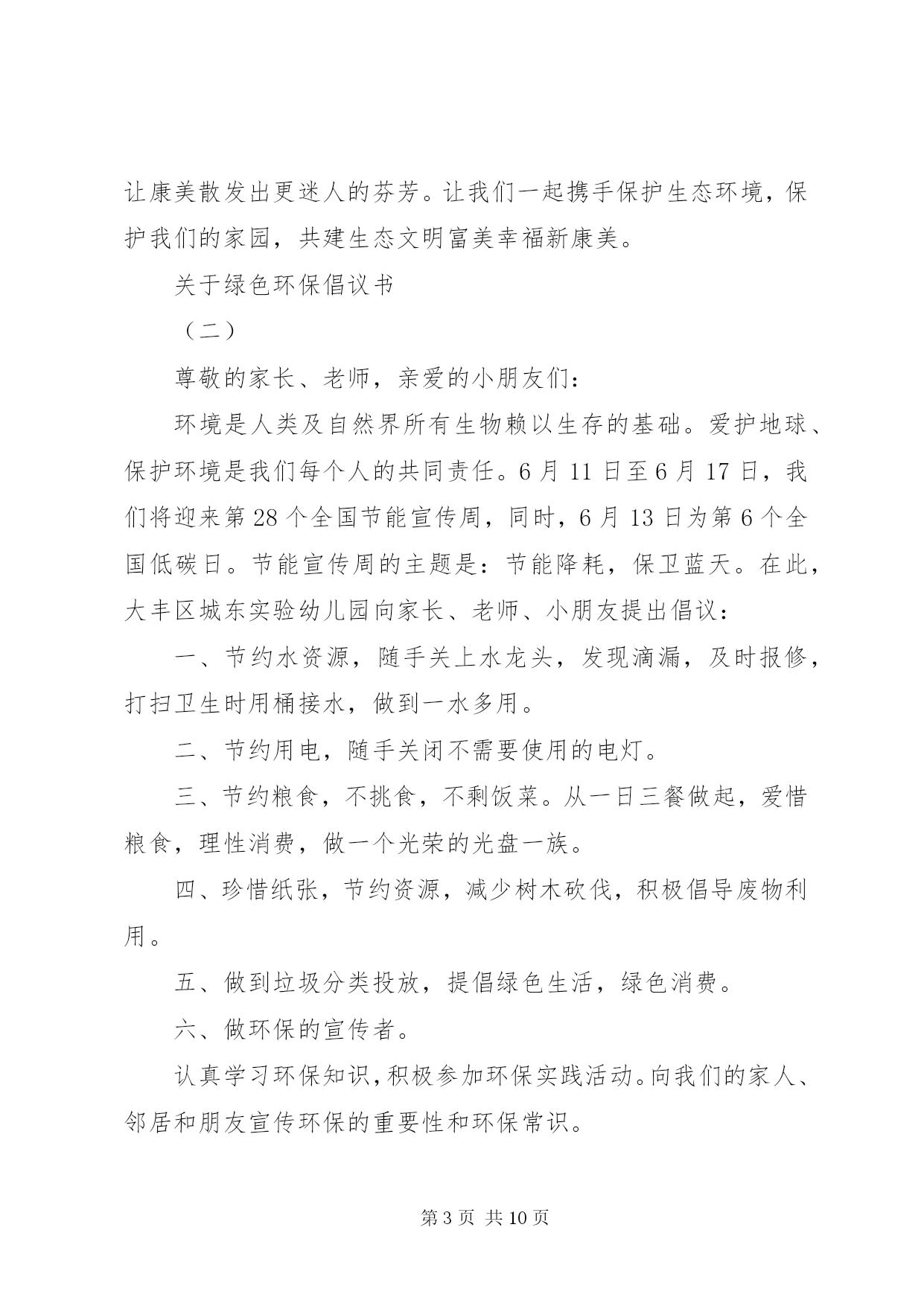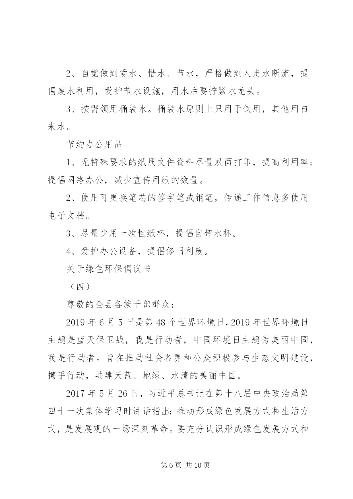 第PAGE\*Arabic\*MERGEFORMAT10页共NUMPAGES\*MERGEFORMAT10页关于绿色环保倡议书关于绿色环保倡议书(一)康美父老乡亲、朋友们:生态环境,是人类赖以生存的必要条件,保护环境就是保护我们自己。环境质量影响着我们的生活质量,与我们密切相关。每个人都应树立主人翁意识,从自身出发,从小事着手,争做环境保护的践行者、宣传者、监督者,以实际行动共建美丽康美。在此特向大家发出如下倡议:一、争当环境保护的践行者要树立家园意识,培育文明新风,自觉摒弃不文明、不卫生行为,养成文明健康的生活方式。1、自觉遵守卫生公德,不乱倒垃圾,不乱扔杂物,及时将垃圾杂物入箱、入桶、入池或清运到指导垃圾点,维护公共区域环境整洁。2、自觉美化绿化,鼓励因地制宜种花种草,合理绿化布局,建造小花园、小景观,创造优美环境。3、自觉爱护公共卫生,杜绝车窗抛物,不随意乱扔乱丢垃圾杂物,不乱贴乱画,不随地吐痰,不践踏花木草坪,不破坏公共设施;鼓励使用再生材料制成的、可多次长期使用的商品,减少使用塑料袋。4、自觉执行门前三包,落实好门前环境卫生治理、美化绿化和规范秩序。5、自觉保护大气环境,严禁夏收期间焚烧秸秆污染环境,并严防火灾发生。6、自觉保护森林资源,严禁乱砍乱伐林木,提倡文明祭祀,禁止在林区及附近使用明火,防止引发火灾,筑牢生态安全屏障。7、自觉保护水生态,严禁向河道乱排乱倒生产生活污水和固态垃圾,保护辖区水资源;节约用水,杜绝浪费,养成良好的用水习惯。二、争当环境保护的宣传者要以主人翁的态度为环保做代言,以新时代文明实践活动为载体,大力宣传环保知识,倡导文明观念,践行人与自然和谐共生理念,身体力行、以身作则带动身边的群众保护生态环境、保护家园,共筑环保坚固防线。三、争当环境保护的监督者环境保护不是口号,重在行动,需要每位公民积极参与,认真履行环保监督义务,对乱倒垃圾、乱排污水等破坏生态环境行为坚决说不,逐步达成社会环保共识,形成人人讲环保、爱环保、监督环保的良好氛围,让环保事业成为我们生活的一部分。父老乡亲、朋友们,您的每一份努力,都会让康美变得更美;您的每一份辛劳,都会为康美增光添彩;您的每一份付出,都会让康美散发出更迷人的芬芳。让我们一起携手保护生态环境,保护我们的家园,共建生态文明富美幸福新康美。关于绿色环保倡议书(二)尊敬的家长、老师,亲爱的小朋友们:环境是人类及自然界所有生物赖以生存的基础。爱护地球、保护环境是我们每个人的共同责任。6月11日至6月17日,我们将迎来第28个全国节能宣传周,同时,6月13日为第6个全国低碳日。节能宣传周的主题是:节能降耗,保卫蓝天。在此,大丰区城东实验幼儿园向家长、老师、小朋友提出倡议:一、节约水资源,随手关上水龙头,发现滴漏,及时报修,打扫卫生时用桶接水,做到一水多用。二、节约用电,随手关闭不需要使用的电灯。三、节约粮食,不挑食,不剩饭菜。从一日三餐做起,爱惜粮食,理性消费,做一个光荣的光盘一族。四、珍惜纸张,节约资源,减少树木砍伐,积极倡导废物利用。五、做到垃圾分类投放,提倡绿色生活,绿色消费。六、做环保的宣传者。认真学习环保知识,积极参加环保实践活动。向我们的家人、邻居和朋友宣传环保的重要性和环保常识。七、做环保的执行者。从我做起,从现在做起,从身边做起,从点滴小事做起。积极、认真搞好校园以及居住社区、公共场所的绿化、美化、净化,清除工作,控制日常生活中产生的污染。八、做环保的小卫士。我们不但要宣传环保,在以身作则,保护环境的基础上,我们还要对周围的环境进行监督,坚决制止破坏环境的坏人坏事。每一滴水都孕育着生命,每一口空气都充斥着力量,每一片绿地都充满了希望。诚心的希望家长朋友们能积极地参与到我们的环保行动中来,和孩子们一起为了我们的家园做出努力。关于绿色环保倡议书(三)倡议书今年6月5日世界环境日的主题为蓝天保卫战,我是行动者,本周是全国节能宣传周,主题为绿色发展,节能先行,6月19日全国低碳日活动主题为低碳行动,保卫蓝天。为此,我们向全体职工同志倡议:做行为节约绿色办公的自觉者。珍惜每一度电、每一滴水、每一张纸、每一件办公用品,以绿色发展理念为指导、以节约适度为原则,控制每一个能源资源使用行为,将生态文明理念内化于心、外化于行,长期坚持、久久为功。做行为节约绿色办公的先行者。认真学习节约能源资源知识与要求,带头实施节约能源资源行为,带头分享节约能源资源经验,带头传播生态文明思想,以做好身边事,示范引领身边人,形成绿色办公群体效应。做行为节约绿色办公的创新者。创新节约能源资源的途径和方法,创新节约习惯的养成方法,以创新促进简约适度、绿色低碳的工作方式。让我们携起手来,用智慧践行绿色办公,用毅力养成节约习惯,用热情传播生态文明理念,用勇气阻止能源资源浪费