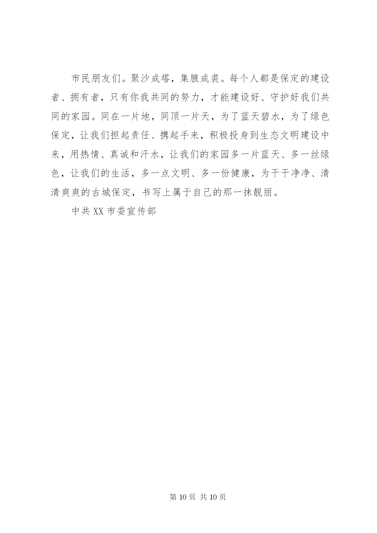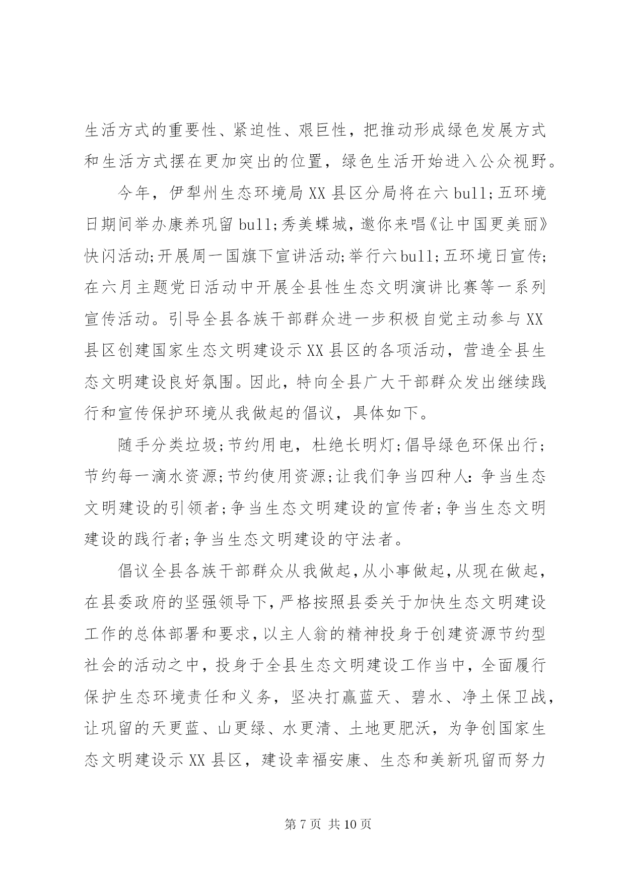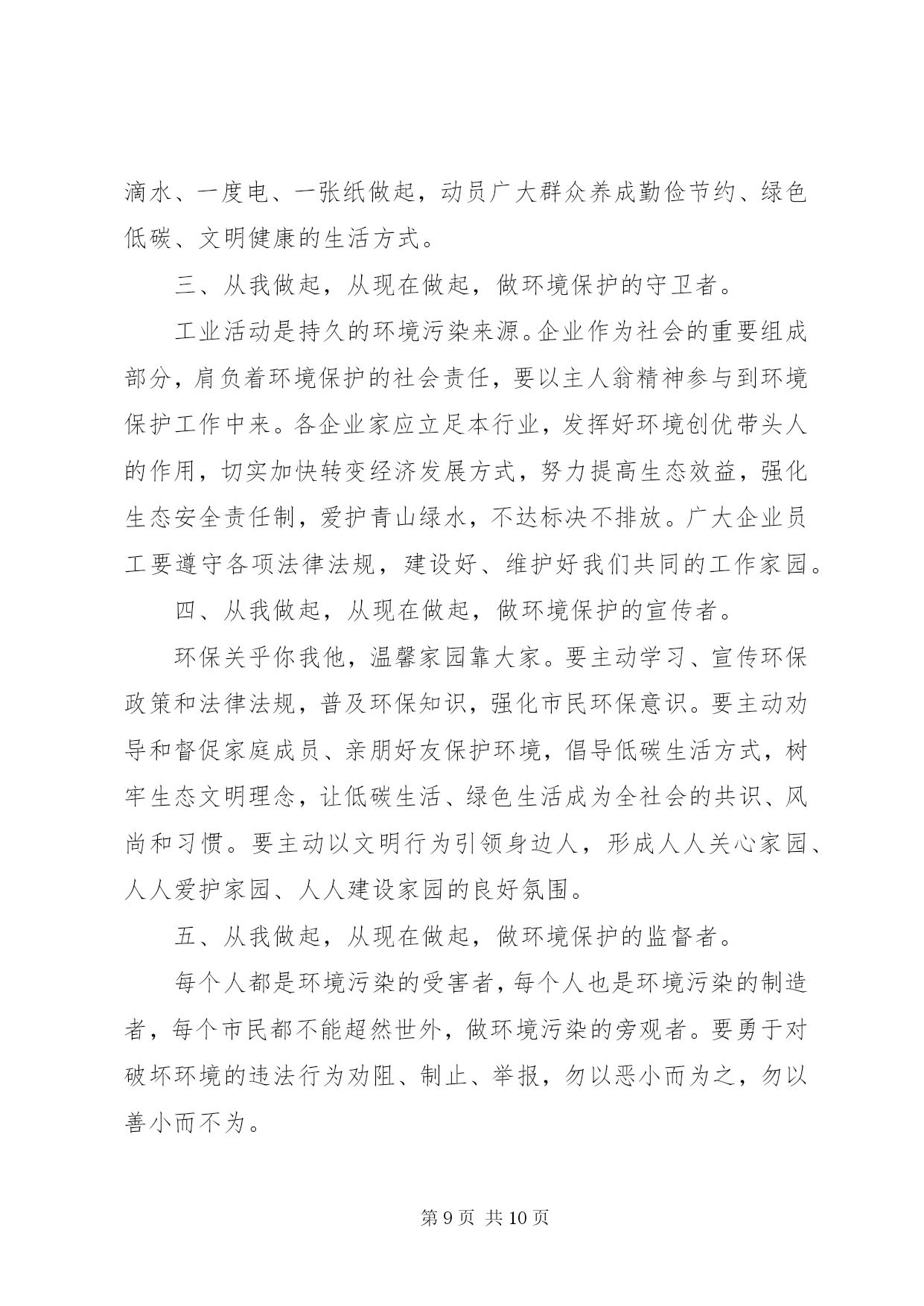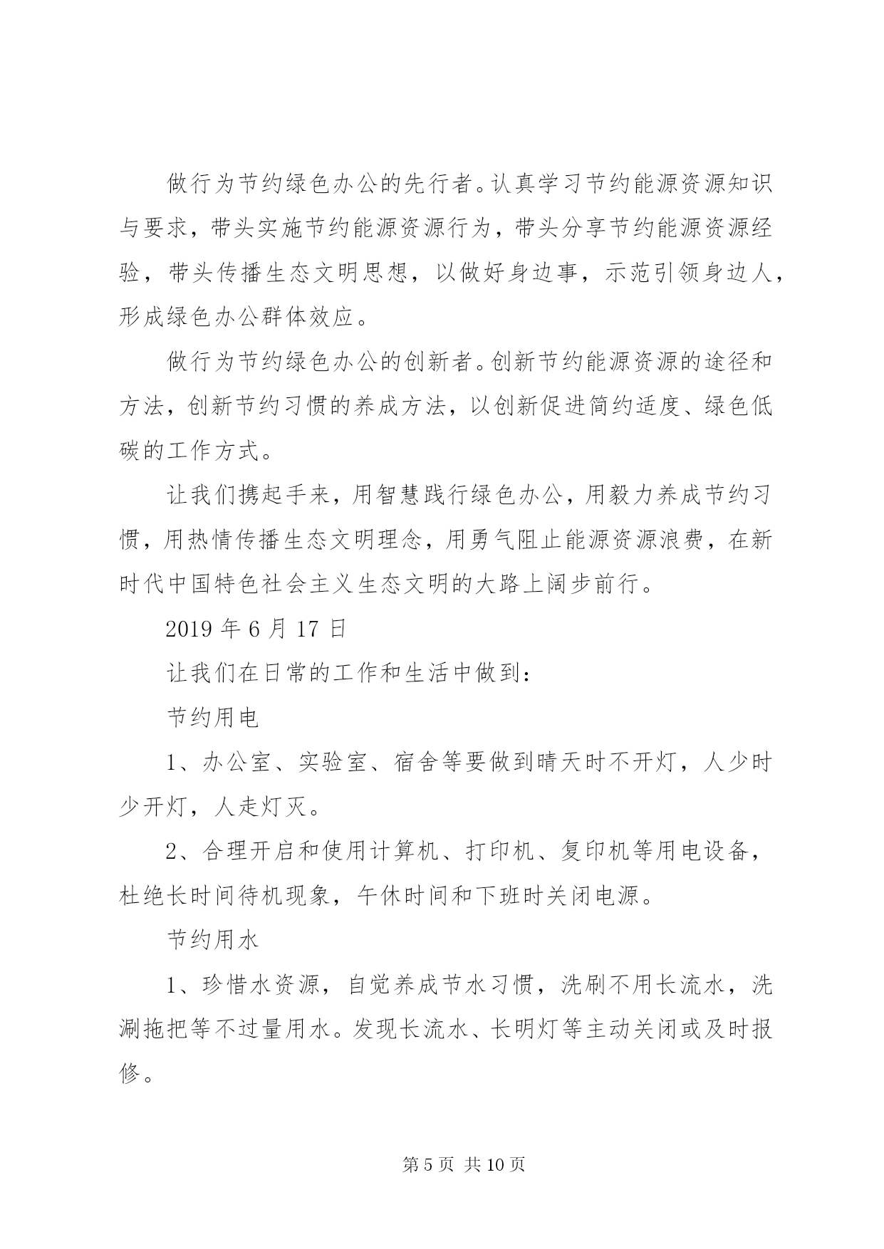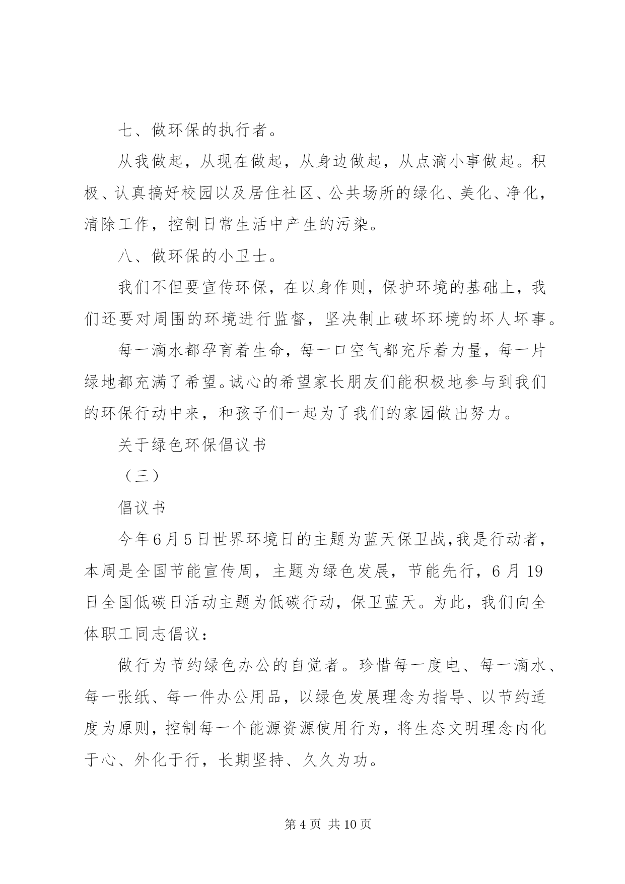 第PAGE\*Arabic\*MERGEFORMAT10页共NUMPAGES\*MERGEFORMAT10页关于绿色环保倡议书关于绿色环保倡议书(一)康美父老乡亲、朋友们:生态环境,是人类赖以生存的必要条件,保护环境就是保护我们自己。环境质量影响着我们的生活质量,与我们密切相关。每个人都应树立主人翁意识,从自身出发,从小事着手,争做环境保护的践行者、宣传者、监督者,以实际行动共建美丽康美。在此特向大家发出如下倡议:一、争当环境保护的践行者要树立家园意识,培育文明新风,自觉摒弃不文明、不卫生行为,养成文明健康的生活方式。1、自觉遵守卫生公德,不乱倒垃圾,不乱扔杂物,及时将垃圾杂物入箱、入桶、入池或清运到指导垃圾点,维护公共区域环境整洁。2、自觉美化绿化,鼓励因地制宜种花种草,合理绿化布局,建造小花园、小景观,创造优美环境。3、自觉爱护公共卫生,杜绝车窗抛物,不随意乱扔乱丢垃圾杂物,不乱贴乱画,不随地吐痰,不践踏花木草坪,不破坏公共设施;鼓励使用再生材料制成的、可多次长期使用的商品,减少使用塑料袋。4、自觉执行门前三包,落实好门前环境卫生治理、美化绿化和规范秩序。5、自觉保护大气环境,严禁夏收期间焚烧秸秆污染环境,并严防火灾发生。6、自觉保护森林资源,严禁乱砍乱伐林木,提倡文明祭祀,禁止在林区及附近使用明火,防止引发火灾,筑牢生态安全屏障。7、自觉保护水生态,严禁向河道乱排乱倒生产生活污水和固态垃圾,保护辖区水资源;节约用水,杜绝浪费,养成良好的用水习惯。二、争当环境保护的宣传者要以主人翁的态度为环保做代言,以新时代文明实践活动为载体,大力宣传环保知识,倡导文明观念,践行人与自然和谐共生理念,身体力行、以身作则带动身边的群众保护生态环境、保护家园,共筑环保坚固防线。三、争当环境保护的监督者环境保护不是口号,重在行动,需要每位公民积极参与,认真履行环保监督义务,对乱倒垃圾、乱排污水等破坏生态环境行为坚决说不,逐步达成社会环保共识,形成人人讲环保、爱环保、监督环保的良好氛围,让环保事业成为我们生活的一部分。父老乡亲、朋友们,您的每一份努力,都会让康美变得更美;您的每一份辛劳,都会为康美增光添彩;您的每一份付出,都会让康美散发出更迷人的芬芳。让我们一起携手保护生态环境,保护我们的家园,共建生态文明富美幸福新康美。关于绿色环保倡议书(二)尊敬的家长、老师,亲爱的小朋友们:环境是人类及自然界所有生物赖以生存的基础。爱护地球、保护环境是我们每个人的共同责任。6月11日至6月17日,我们将迎来第28个全国节能宣传周,同时,6月13日为第6个全国低碳日。节能宣传周的主题是:节能降耗,保卫蓝天。在此,大丰区城东实验幼儿园向家长、老师、小朋友提出倡议:一、节约水资源,随手关上水龙头,发现滴漏,及时报修,打扫卫生时用桶接水,做到一水多用。二、节约用电,随手关闭不需要使用的电灯。三、节约粮食,不挑食,不剩饭菜。从一日三餐做起,爱惜粮食,理性消费,做一个光荣的光盘一族。四、珍惜纸张,节约资源,减少树木砍伐,积极倡导废物利用。五、做到垃圾分类投放,提倡绿色生活,绿色消费。六、做环保的宣传者。认真学习环保知识,积极参加环保实践活动。向我们的家人、邻居和朋友宣传环保的重要性和环保常识。七、做环保的执行者。从我做起,从现在做起,从身边做起,从点滴小事做起。积极、认真搞好校园以及居住社区、公共场所的绿化、美化、净化,清除工作,控制日常生活中产生的污染。八、做环保的小卫士。我们不但要宣传环保,在以身作则,保护环境的基础上,我们还要对周围的环境进行监督,坚决制止破坏环境的坏人坏事。每一滴水都孕育着生命,每一口空气都充斥着力量,每一片绿地都充满了希望。诚心的希望家长朋友们能积极地参与到我们的环保行动中来,和孩子们一起为了我们的家园做出努力。关于绿色环保倡议书(三)倡议书今年6月5日世界环境日的主题为蓝天保卫战,我是行动者,本周是全国节能宣传周,主题为绿色发展,节能先行,6月19日全国低碳日活动主题为低碳行动,保卫蓝天。为此,我们向全体职工同志倡议:做行为节约绿色办公的自觉者。珍惜每一度电、每一滴水、每一张纸、每一件办公用品,以绿色发展理念为指导、以节约适度为原则,控制每一个能源资源使用行为,将生态文明理念内化于心、外化于行,长期坚持、久久为功。做行为节约绿色办公的先行者。认真学习节约能源资源知识与要求,带头实施节约能源资源行为,带头分享节约能源资源经验,带头传播生态文明思想,以做好身边事,示范引领身边人,形成绿色办公群体效应。做行为节约绿色办公的创新者。创新节约能源资源的途径和方法,创新节约习惯的养成方法,以创新促进简约适度、绿色低碳的工作方式。让我们携起手来,用智慧践行绿色办公,用毅力养成节约习惯,用热情传播生态文明理念,用勇气阻止能源资源浪费