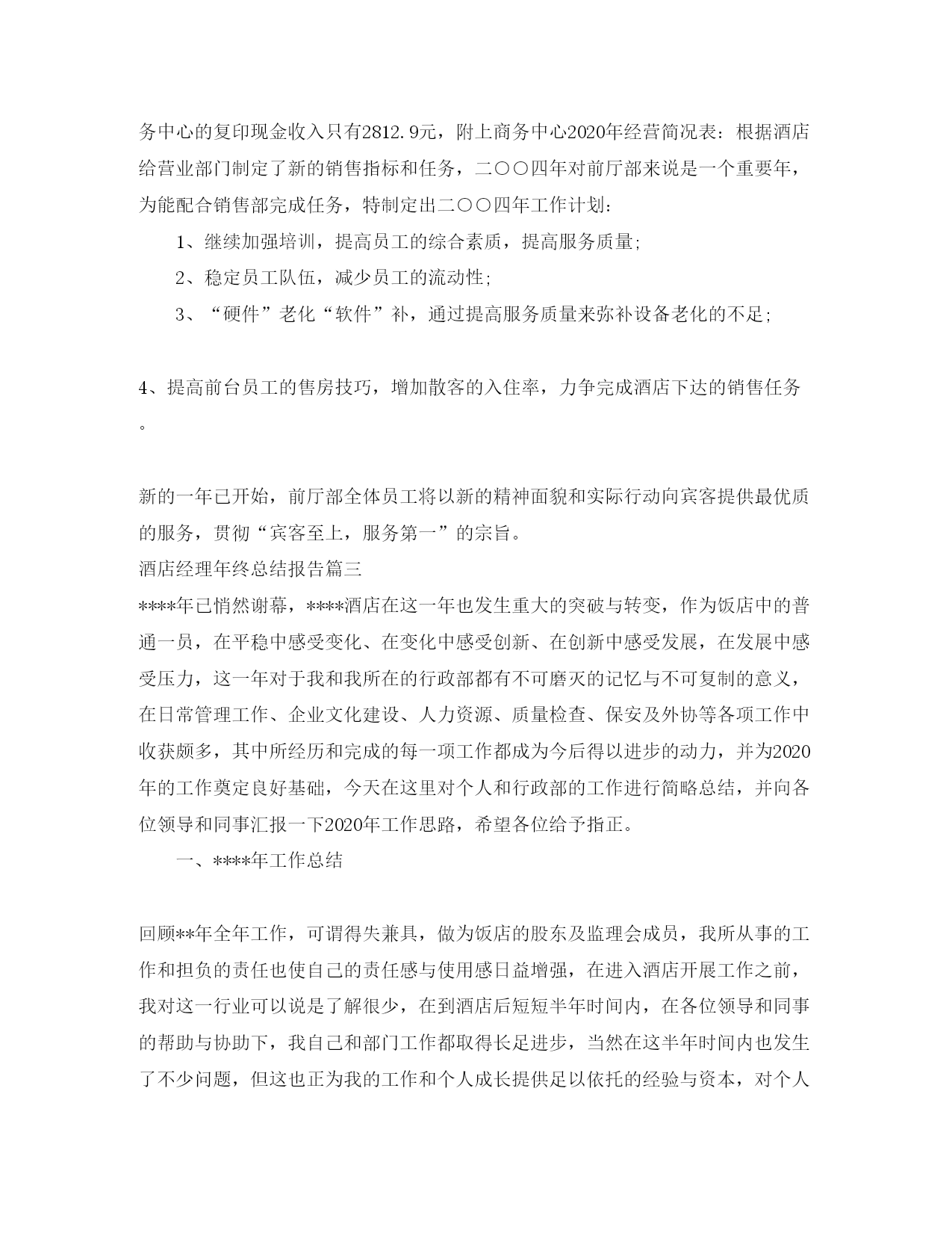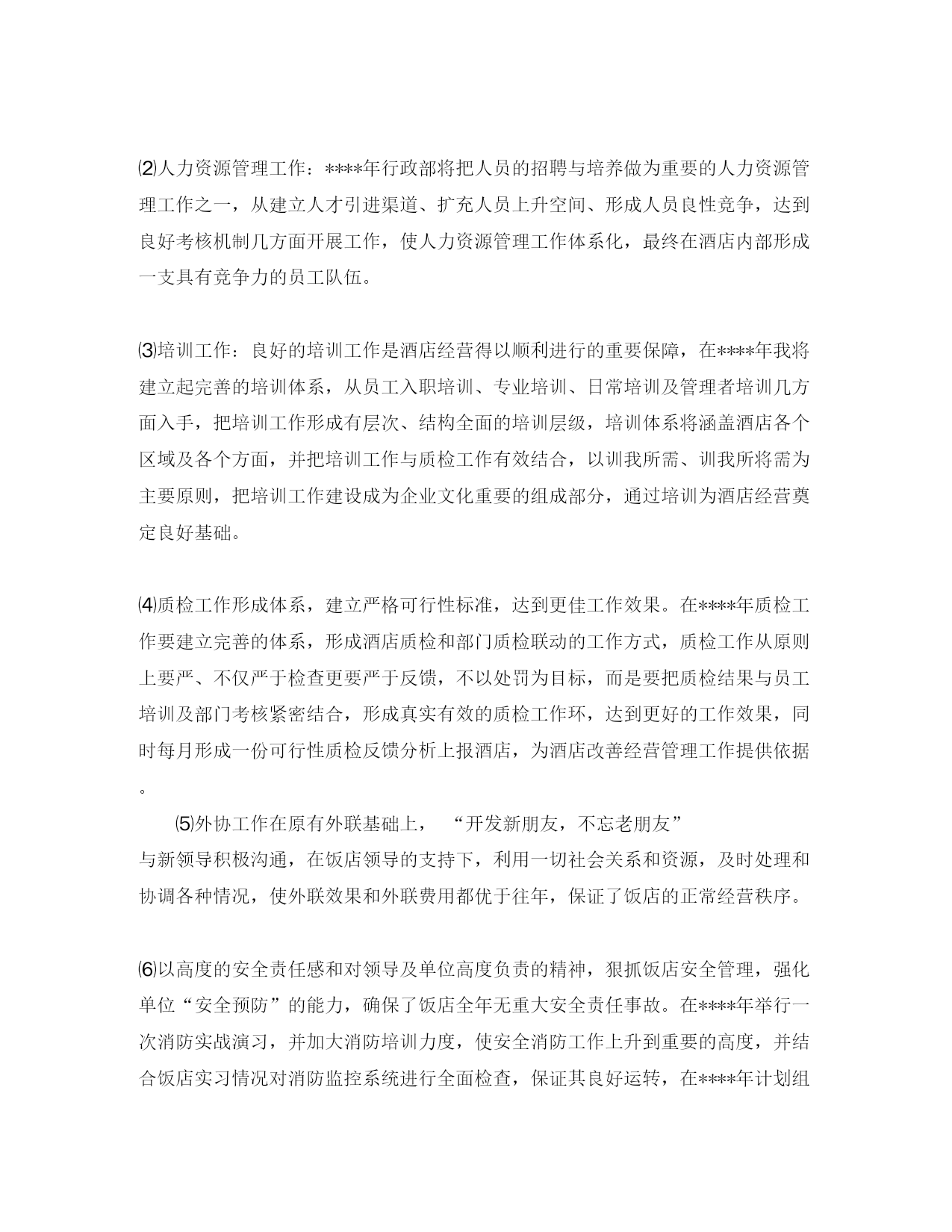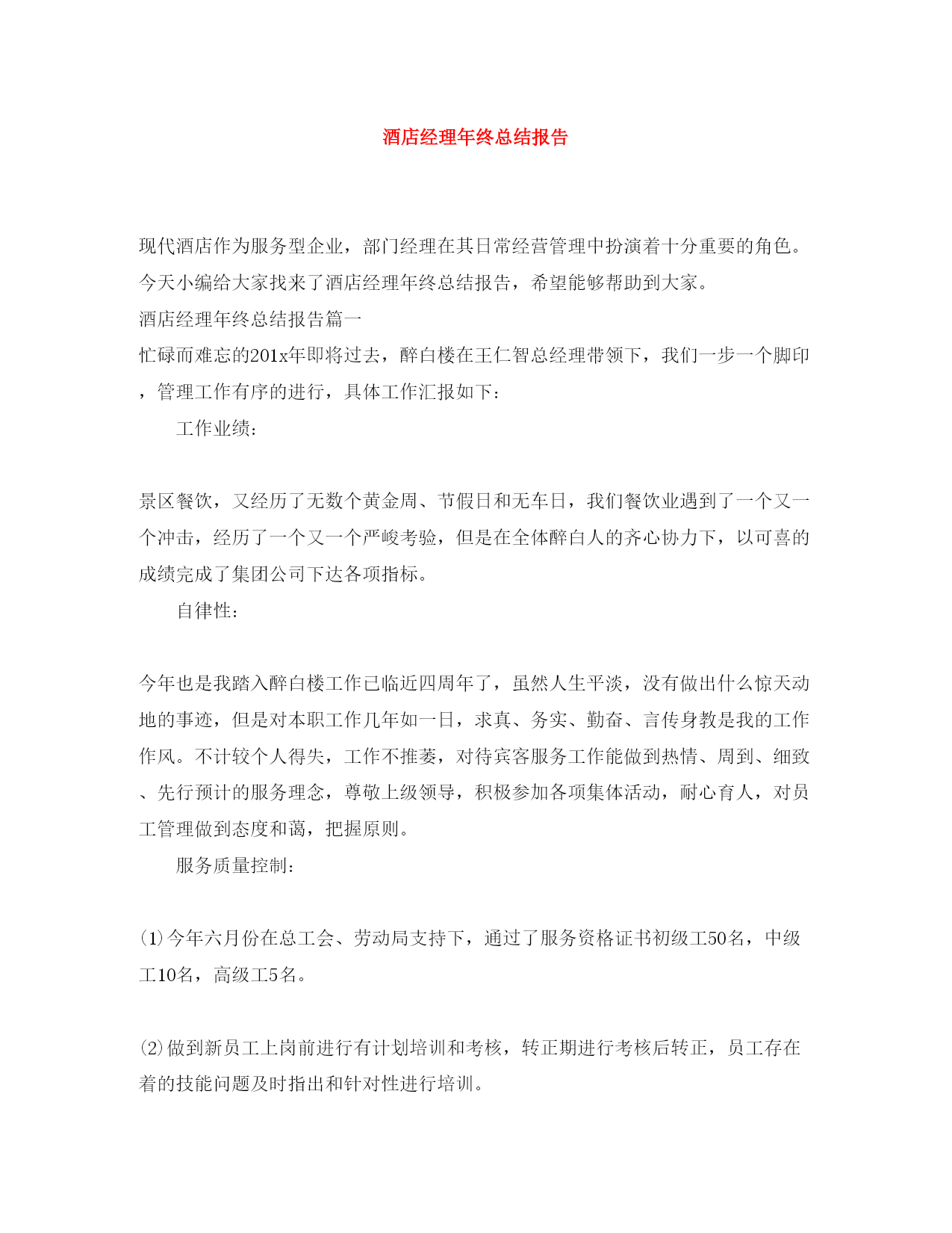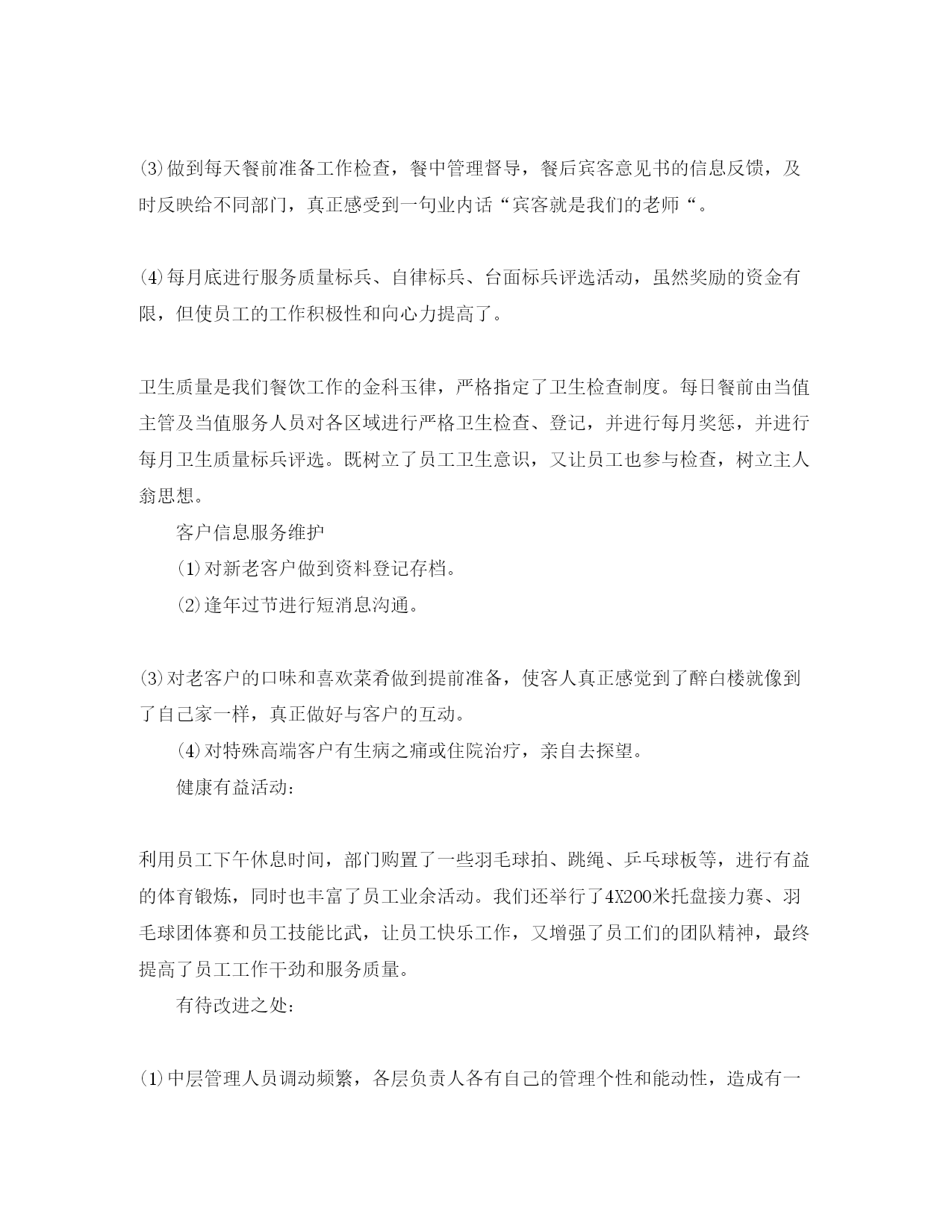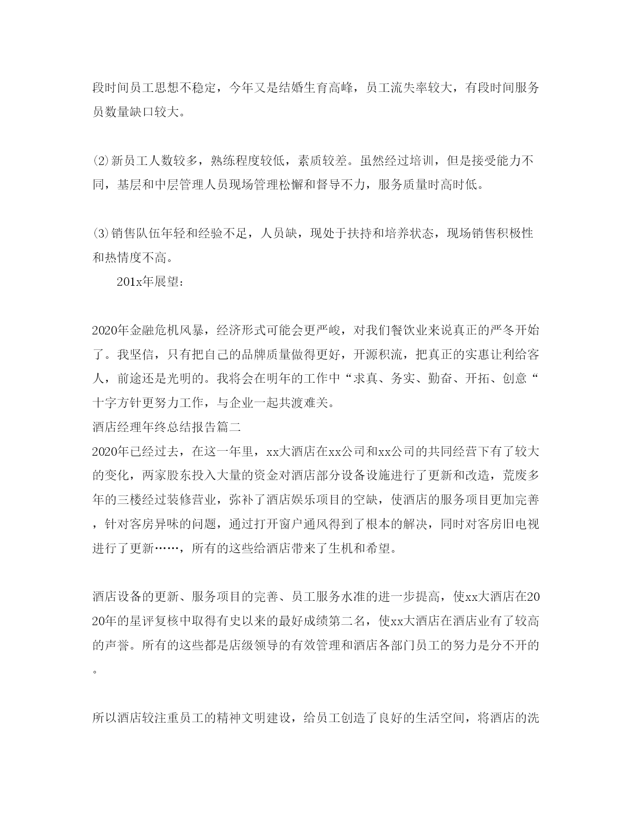 此资料由网络收集而来,如有侵权请告知上传者立即删除。资料共分享,我们负责传递知识。酒店经理年终总结报告现代酒店作为服务型企业,部门经理在其日常经营管理中扮演着十分重要的角色。今天小编给大家找来了酒店经理年终总结报告,希望能够帮助到大家。酒店经理年终总结报告篇一忙碌而难忘的201x年即将过去,醉白楼在王仁智总经理带领下,我们一步一个脚印,管理工作有序的进行,具体工作汇报如下:工作业绩:景区餐饮,又经历了无数个黄金周、节假日和无车日,我们餐饮业遇到了一个又一个冲击,经历了一个又一个严峻考验,但是在全体醉白人的齐心协力下,以可喜的成绩完成了集团公司下达各项指标。自律性:今年也是我踏入醉白楼工作已临近四周年了,虽然人生平淡,没有做出什么惊天动地的事迹,但是对本职工作几年如一日,求真、务实、勤奋、言传身教是我的工作作风。不计较个人得失,工作不推萎,对待宾客服务工作能做到热情、周到、细致、先行预计的服务理念,尊敬上级领导,积极参加各项集体活动,耐心育人,对员工管理做到态度和蔼,把握原则。服务质量控制:(1)今年六月份在总工会、劳动局支持下,通过了服务资格证书初级工50名,中级工10名,高级工5名。(2)做到新员工上岗前进行有计划培训和考核,转正期进行考核后转正,员工存在着的技能问题及时指出和针对性进行培训。(3)做到每天餐前准备工作检查,餐中管理督导,餐后宾客意见书的信息反馈,及时反映给不同部门,真正感受到一句业内话“宾客就是我们的老师“。(4)每月底进行服务质量标兵、自律标兵、台面标兵评选活动,虽然奖励的资金有限,但使员工的工作积极性和向心力提高了。卫生质量是我们餐饮工作的金科玉律,严格指定了卫生检查制度。每日餐前由当值主管及当值服务人员对各区域进行严格卫生检查、登记,并进行每月奖惩,并进行每月卫生质量标兵评选。既树立了员工卫生意识,又让员工也参与检查,树立主人翁思想。客户信息服务维护(1)对新老客户做到资料登记存档。(2)逢年过节进行短消息沟通。(3)对老客户的口味和喜欢菜肴做到提前准备,使客人真正感觉到了醉白楼就像到了自己家一样,真正做好与客户的互动。(4)对特殊高端客户有生病之痛或住院治疗,亲自去探望。健康有益活动:利用员工下午休息时间,部门购置了一些羽毛球拍、跳绳、乒乓球板等,进行有益的体育锻炼,同时也丰富了员工业余活动。我们还举行了4X200米托盘接力赛、羽毛球团体赛和员工技能比武,让员工快乐工作,又增强了员工们的团队精神,最终提高了员工工作干劲和服务质量。有待改进之处:(1)中层管理人员调动频繁,各层负责人各有自己的管理个性和能动性,造成有一段时间员工思想不稳定,今年又是结婚生育高峰,员工流失率较大,有段时间服务员数量缺口较大。(2)新员工人数较多,熟练程度较低,素质较差。虽然经过培训,但是接受能力不同,基层和中层管理人员现场管理松懈和督导不力,服务质量时高时低。(3)销售队伍年轻和经验不足,人员缺,现处于扶持和培养状态,现场销售积极性和热情度不高。201x年展望:2020年金融危机风暴,经济形式可能会更严峻,对我们餐饮业来说真正的严冬开始了。我坚信,只有把自己的品牌质量做得更好,开源积流,把真正的实惠让利给客人,前途还是光明的。我将会在明年的工作中“求真、务实、勤奋、开拓、创意“十字方针更努力工作,与企业一起共渡难关。酒店经理年终总结报告篇二2020年已经过去,在这一年里,xx大酒店在xx公司和xx公司的共同经营下有了较大的变化,两家股东投入大量的资金对酒店部分设备设施进行了更新和改造,荒废多年的三楼经过装修营业,弥补了酒店娱乐项目的空缺,使酒店的服务项目更加完善,针对客房异味的问题,通过打开窗户通风得到了根本的解决,同时对客房旧电视进行了更新……,所有的这些给酒店带来了生机和希望。酒店设备的更新、服务项目的完善、员工服务水准的进一步提高,使xx大酒店在2020年的星评复核中取得有史以来的最好成绩第二名,使xx大酒店在酒店业有了较高的声誉。所有的这些都是店级领导的有效管理和酒店各部门员工的努力是分不开的。所以酒店较注重员工的精神文明建设,给员工创造了良好的生活空间,将酒店的洗衣房改造成一个宽敞的员工餐厅和员工活动的两用室,并添置了桌球、乒乓球桌、棋牌等娱乐项目,并多次开展各项比赛,即增强了员工的体质又丰富了员工的业余生活,酒店还将太阳能热水安装到了员工宿舍,解决了员工冬天洗澡的问题。所有的这些员工只能通过认真工作来回报酒店。今年来前厅部在人员不断更换的情况下,所有的员工仍然能够克服困难、团结进取,圆满的完成酒店交给的各项接待任务,全年共接待了VIP团四个,会议无数次,在整个接待过程中受到客人的好评,一年来前厅部做好了以下几项工作:一、加强业务培训,提高员工素质