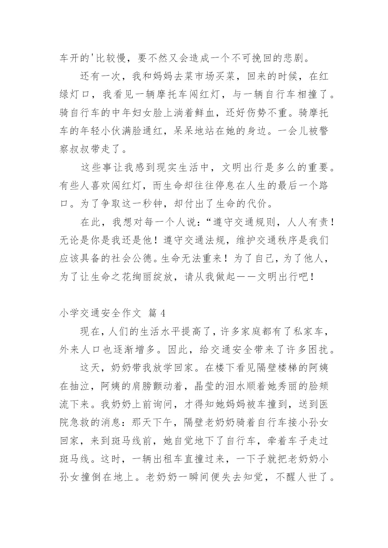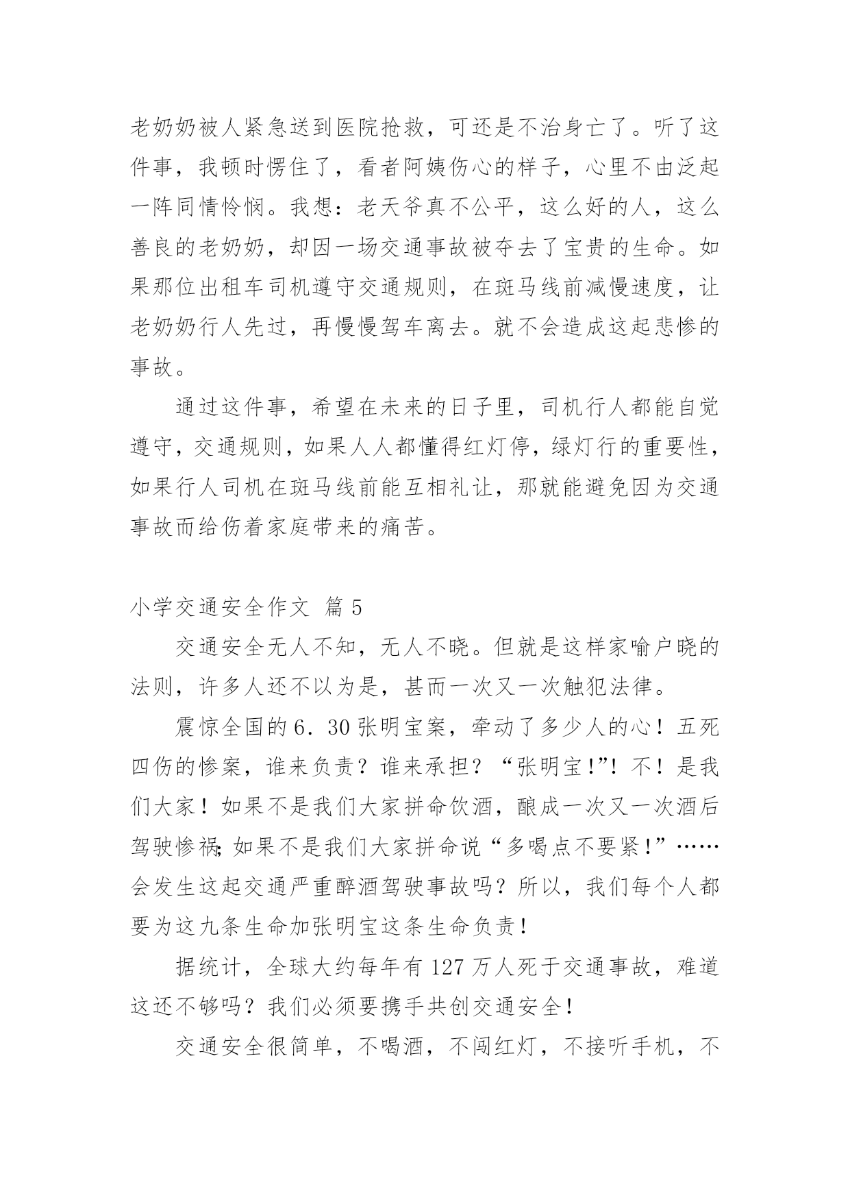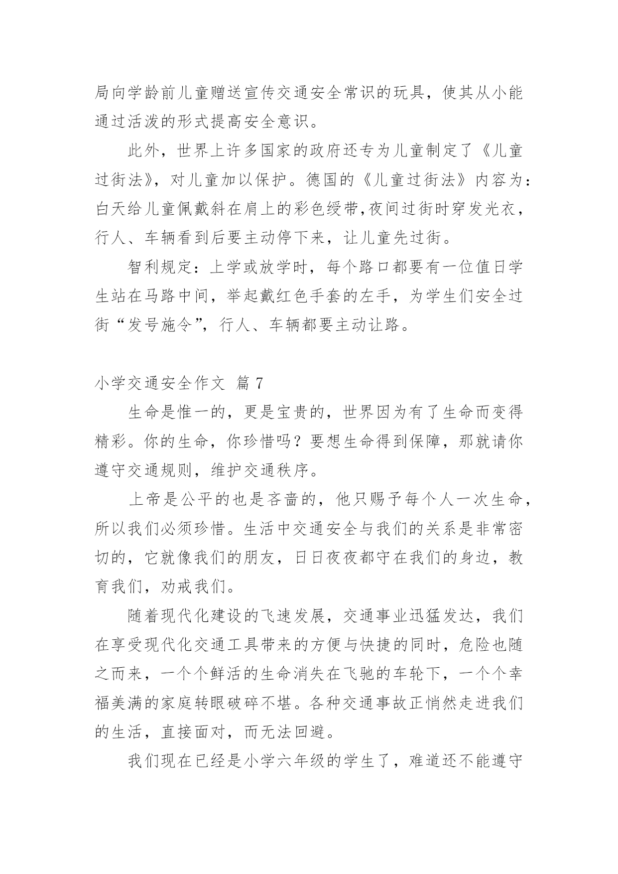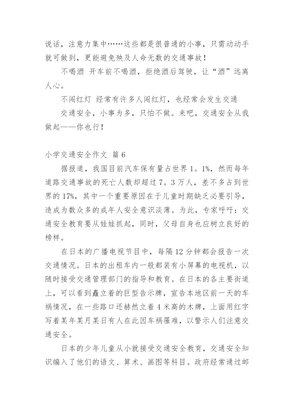 小学交通安全作文实用的小学交通安全作文合集八篇在日复一日的学习、工作或生活中,许多人都有过写作文的经历,对作文都不陌生吧,借助作文人们可以实现文化交流的目的。为了让您在写作文时更加简单方便,下面是小编为大家整理的小学交通安全作文9篇,希望能够帮助到大家。小学交通安全作文篇1现在,人们的生活水平提高了,许多家庭都有了私家车,外来人口也逐渐增多,因此,给交通安全带来了许多困扰。这天,奶奶带我放学回家。在楼下看见隔壁楼梯的阿姨在抽泣,阿姨的肩膀颤动着,晶莹的泪水顺着她秀丽的脸颊流下来。我和奶奶上前询问,才得知她妈妈被车撞到,送到医院急救的消息:那天下午,隔壁老奶奶骑着自行车接小孙女回家,来到斑马线前,她自觉地下了自行车,牵着车子走过斑马线。这时,一辆出租车直撞过来,一下子就把老奶奶和小孙女撞倒在地上。老奶奶一瞬间便失去知觉,不醒人世了。老奶奶被人紧急送到医院抢救,可还是不治身亡了。听了这件事,我顿时愣住了,看者阿姨伤心的样子,心里不由泛起一阵同情和怜悯。我想:老天爷真不公平,这么好的人,这么善良的老奶奶,却因一场交通事故被夺去了宝贵的生命。如果那位出租车司机遵守交通规则,在斑马线前减慢速度,让老奶奶和行人先过,再慢慢驾车离去。就不会造成这起悲惨的事故。通过这件事,希望在未来的日子里,司机和行人都能自觉遵守,交通规则,如果人人都懂得红灯停,绿灯行的重要性,如果行人和司机在斑马线前能互相礼让,那就能避免因为交通事故而给伤着家庭带来的痛苦。小学交通安全作文篇2此刻社会发展越来越快,我们的生活也一天比一天好。美丽的城市中,一座座高楼大厦令人目不暇接。宽广的公路上,数不清的汽车正疾速行驶着。这一切是多么完美啊!但是,这天当我聆听了交警叔叔的讲座时,内心真是震惊不小啊。自从1886年,德国人,奔驰发明了汽车后,全球因交通事故而死亡的人数高达4000万人。这可比第一次世界大战和第二次世界大战加起来死的人还要多。想到这,我又记起那一桩桩让人毛骨悚然,寒毛直竖地交通人命案。据计算,20xx年~20xx年公发生交通事故219万起。那么,能够说在中国每6分钟就有一个人因交通事故而死亡,每一分钟就有一个人因交通事故而受伤。这是多么可怕的数字啊!今年前一个星期,两个小学生骑车到一个村子时,由于速度过猛一头撞在了大货车上。结果两个人的头都被撞碎了。同学们,大家冷静想一想,儿童是祖国的未来,明天的建设者。但是,就是不留意使他们断送了性命。这件事难道还不足以证明交通安全的重要性吗?一次特大交通事故使12人死亡,5人受伤。死者的家属,亲戚悲痛欲绝,围着死者抱头痛哭。这其中有新婚夫妇,有失去父亲的女儿!我不忍再说下去,想到那一堆堆雪血淋淋的尸体,我的心也跟着一颤。同学们,要珍惜生命,遵守法则,交通安全,是不容忽视的!永远把交通安全放在第一位。小学交通安全作文篇3假如有一天,一个人问你,世界上什么最珍贵,你会怎样回答?是时间?是金钱?是知识?是道德…….而我则会说,生命最珍贵!生命是珍贵的,我们就应该珍爱生命!在这经济繁荣的社会中,街上的车辆逐渐增多,交通安全问题接踵而至,一直困扰着我们。尽管到处都张贴了交通规则宣传标语,但生活中还是会出现一些不文明、不道德的现象,仍然有不少行人藐视交通规则,擅自闯红灯、乱穿马路、逆向行驶、互相飙车……这些行为又将带给我们什么后果呢?答案令人悚然。在我的身边也就发生过类似的事:在一个阳光明媚的下午,同学们都高高兴兴地往学校走。学校的门口人多车也多。突然,一阵刺耳的刹车声回荡在我的耳边。我回头一看,一辆小轿车停在马路中间,而我们的一位男同学像树桩一样呆呆地坐在小轿车的前面。原来,那位男同学横冲马路,刚好有一辆小轿车缓缓地开过,他真是福大命大,幸好那辆小轿车开的'比较慢,要不然又会造成一个不可挽回的悲剧。还有一次,我和妈妈去菜市场买菜,回来的时候,在红绿灯口,我看见一辆摩托车闯红灯,与一辆自行车相撞了。骑自行车的中年妇女脸上淌着鲜血,还好伤势不重。骑摩托车的年轻小伙满脸通红,呆呆地站在她的身边。一会儿被警察叔叔带走了。这些事让我感到现实生活中,文明出行是多么的重要。有些人喜欢闯红灯,而生命却往往停息在人生的最后一个路口。为了争取这一秒钟,却付出了生命的代价。在此,我想对每一个人说:“遵守交通规则,人人有责!无论是你是我还是他!遵守交通法规,维护交通秩序是我们应该具备的社会公德。生命无法重来!为了自己,为了他人,为了让生命之花绚丽绽放,请从我做起――文明出行吧!小学交通安全作文篇4现在,人们的生活水平提高了,许多家庭都有了私家车,外来人口也逐渐增多。因此,给交通安全带来了许多困扰。这天,奶奶带我放学回家。在楼下看见隔壁楼梯的阿姨在抽泣,阿姨的肩膀颤动着,晶莹的泪水顺着她秀丽的脸颊流下来。我奶奶上前询问,才得知她妈妈被车撞到,送到医院急救的
