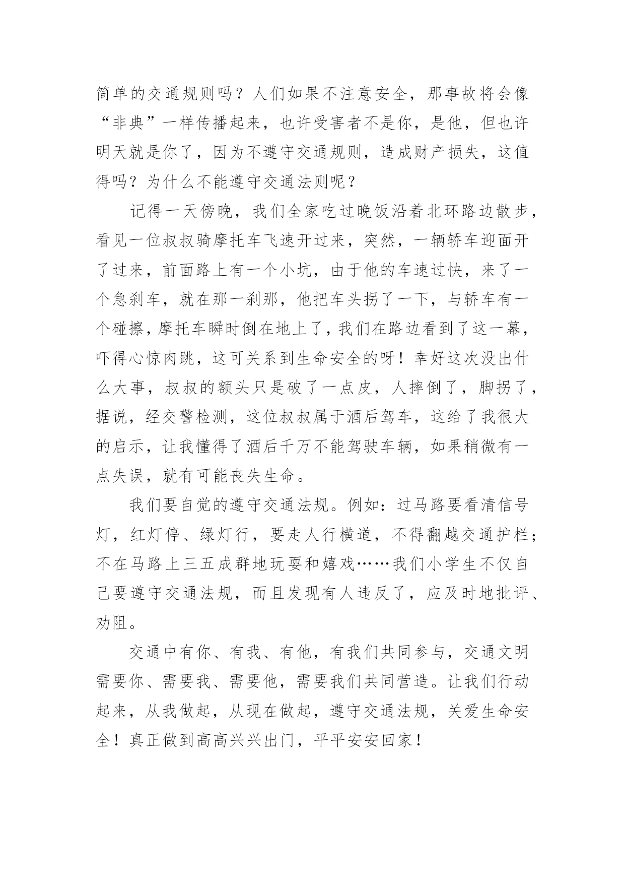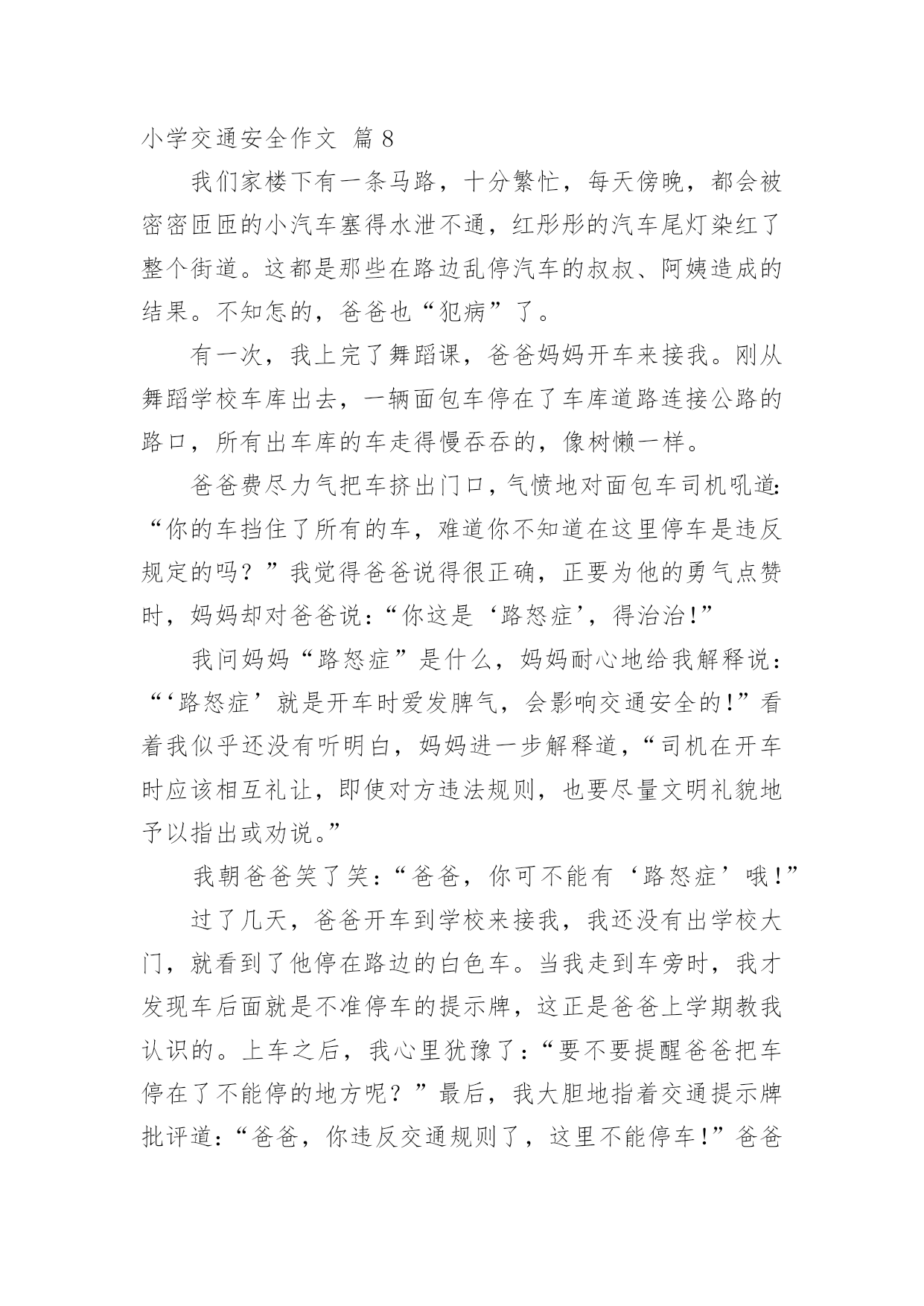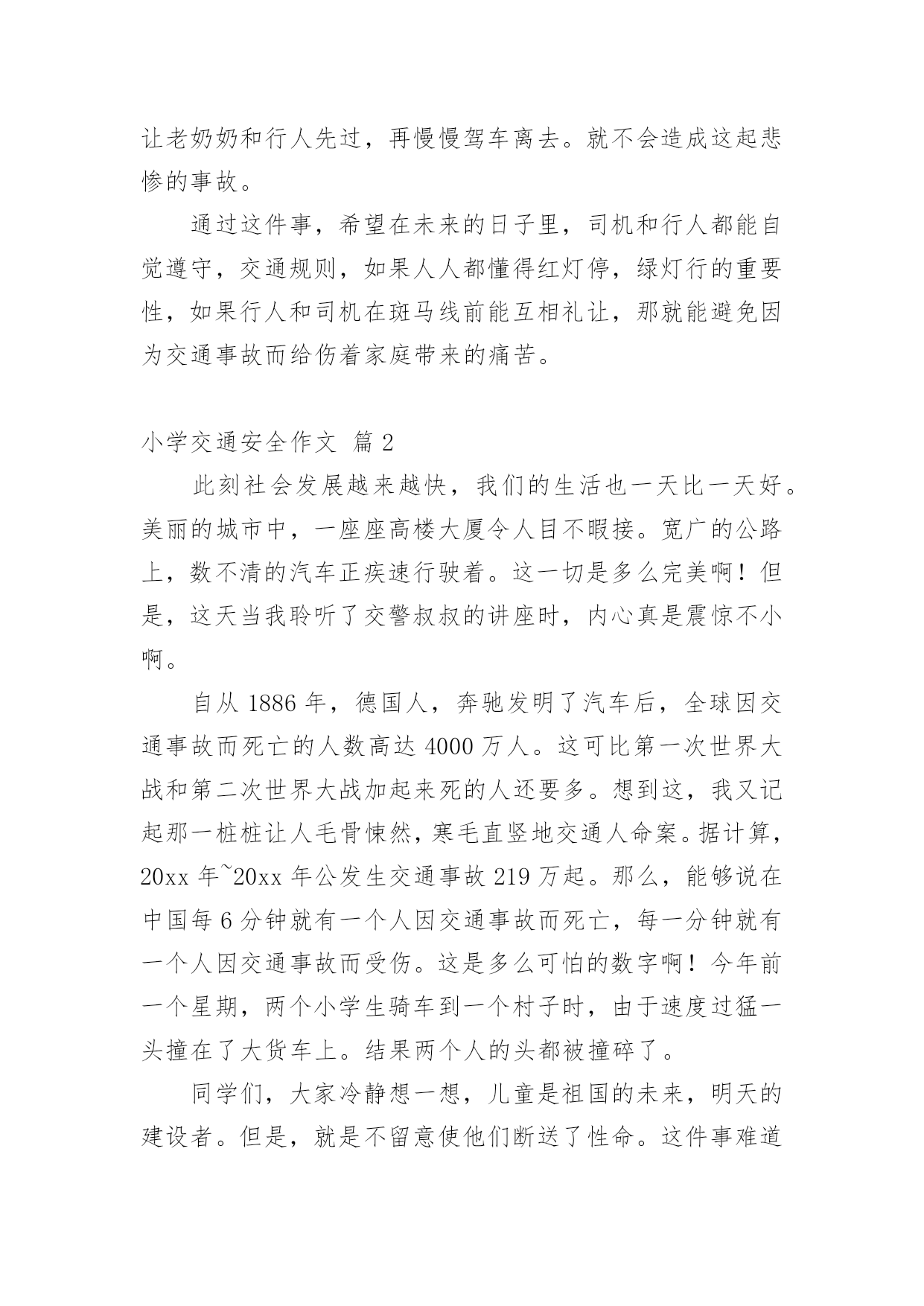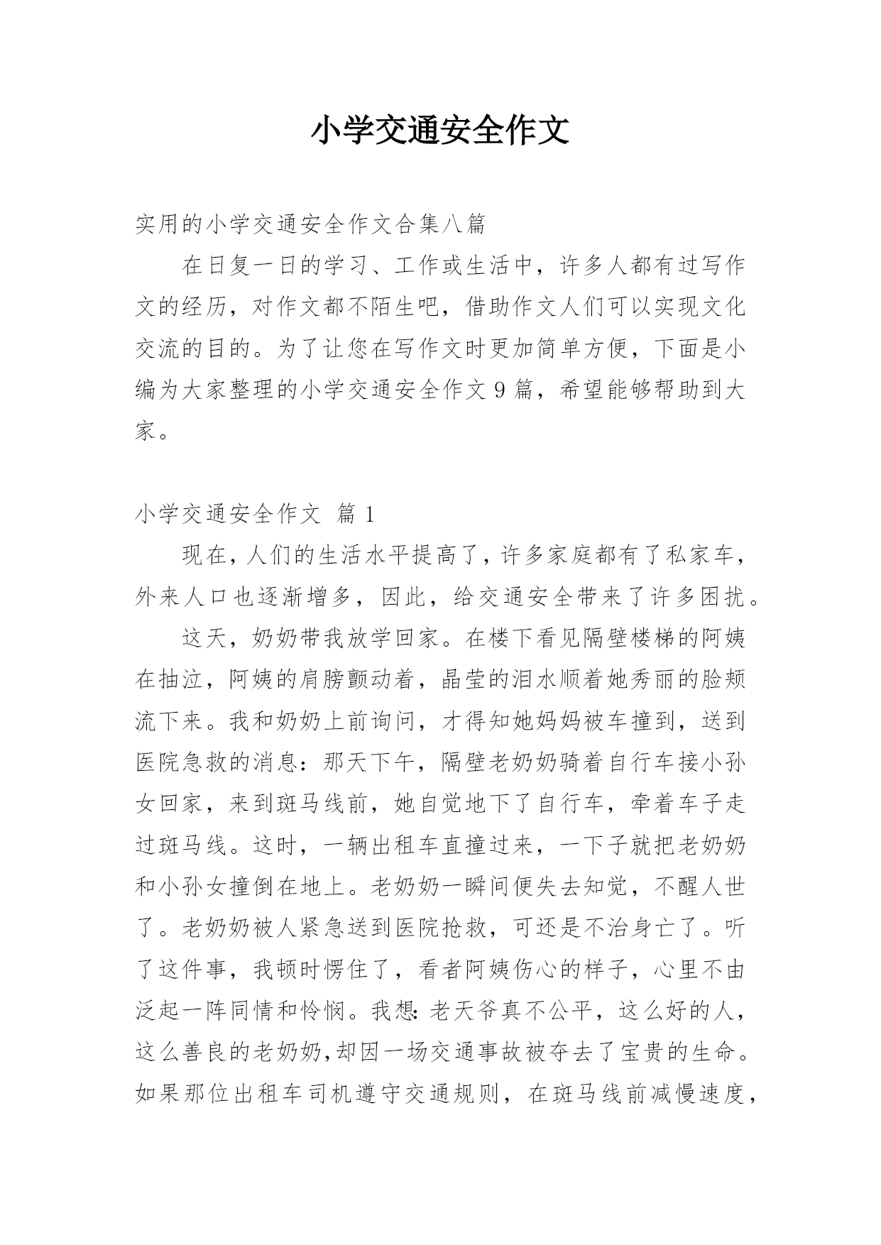 小学交通安全作文实用的小学交通安全作文合集八篇在日复一日的学习、工作或生活中,许多人都有过写作文的经历,对作文都不陌生吧,借助作文人们可以实现文化交流的目的。为了让您在写作文时更加简单方便,下面是小编为大家整理的小学交通安全作文9篇,希望能够帮助到大家。小学交通安全作文篇1现在,人们的生活水平提高了,许多家庭都有了私家车,外来人口也逐渐增多,因此,给交通安全带来了许多困扰。这天,奶奶带我放学回家。在楼下看见隔壁楼梯的阿姨在抽泣,阿姨的肩膀颤动着,晶莹的泪水顺着她秀丽的脸颊流下来。我和奶奶上前询问,才得知她妈妈被车撞到,送到医院急救的消息:那天下午,隔壁老奶奶骑着自行车接小孙女回家,来到斑马线前,她自觉地下了自行车,牵着车子走过斑马线。这时,一辆出租车直撞过来,一下子就把老奶奶和小孙女撞倒在地上。老奶奶一瞬间便失去知觉,不醒人世了。老奶奶被人紧急送到医院抢救,可还是不治身亡了。听了这件事,我顿时愣住了,看者阿姨伤心的样子,心里不由泛起一阵同情和怜悯。我想:老天爷真不公平,这么好的人,这么善良的老奶奶,却因一场交通事故被夺去了宝贵的生命。如果那位出租车司机遵守交通规则,在斑马线前减慢速度,让老奶奶和行人先过,再慢慢驾车离去。就不会造成这起悲惨的事故。通过这件事,希望在未来的日子里,司机和行人都能自觉遵守,交通规则,如果人人都懂得红灯停,绿灯行的重要性,如果行人和司机在斑马线前能互相礼让,那就能避免因为交通事故而给伤着家庭带来的痛苦。小学交通安全作文篇2此刻社会发展越来越快,我们的生活也一天比一天好。美丽的城市中,一座座高楼大厦令人目不暇接。宽广的公路上,数不清的汽车正疾速行驶着。这一切是多么完美啊!但是,这天当我聆听了交警叔叔的讲座时,内心真是震惊不小啊。自从1886年,德国人,奔驰发明了汽车后,全球因交通事故而死亡的人数高达4000万人。这可比第一次世界大战和第二次世界大战加起来死的人还要多。想到这,我又记起那一桩桩让人毛骨悚然,寒毛直竖地交通人命案。据计算,20xx年~20xx年公发生交通事故219万起。那么,能够说在中国每6分钟就有一个人因交通事故而死亡,每一分钟就有一个人因交通事故而受伤。这是多么可怕的数字啊!今年前一个星期,两个小学生骑车到一个村子时,由于速度过猛一头撞在了大货车上。结果两个人的头都被撞碎了。同学们,大家冷静想一想,儿童是祖国的未来,明天的建设者。但是,就是不留意使他们断送了性命。这件事难道还不足以证明交通安全的重要性吗?一次特大交通事故使12人死亡,5人受伤。死者的家属,亲戚悲痛欲绝,围着死者抱头痛哭。这其中有新婚夫妇,有失去父亲的女儿!我不忍再说下去,想到那一堆堆雪血淋淋的尸体,我的心也跟着一颤。同学们,要珍惜生命,遵守法则,交通安全,是不容忽视的!永远把交通安全放在第一位。小学交通安全作文篇3假如有一天,一个人问你,世界上什么最珍贵,你会怎样回答?是时间?是金钱?是知识?是道德…….而我则会说,生命最珍贵!生命是珍贵的,我们就应该珍爱生命!在这经济繁荣的社会中,街上的车辆逐渐增多,交通安全问题接踵而至,一直困扰着我们。尽管到处都张贴了交通规则宣传标语,但生活中还是会出现一些不文明、不道德的现象,仍然有不少行人藐视交通规则,擅自闯红灯、乱穿马路、逆向行驶、互相飙车……这些行为又将带给我们什么后果呢?答案令人悚然。在我的身边也就发生过类似的事:在一个阳光明媚的下午,同学们都高高兴兴地往学校走。学校的门口人多车也多。突然,一阵刺耳的刹车声回荡在我的耳边。我回头一看,一辆小轿车停在马路中间,而我们的一位男同学像树桩一样呆呆地坐在小轿车的前面。原来,那位男同学横冲马路,刚好有一辆小轿车缓缓地开过,他真是福大命大,幸好那辆小轿车开的'比较慢,要不然又会造成一个不可挽回的悲剧。还有一次,我和妈妈去菜市场买菜,回来的时候,在红绿灯口,我看见一辆摩托车闯红灯,与一辆自行车相撞了。骑自行车的中年妇女脸上淌着鲜血,还好伤势不重。骑摩托车的年轻小伙满脸通红,呆呆地站在她的身边。一会儿被警察叔叔带走了。这些事让我感到现实生活中,文明出行是多么的重要。有些人喜欢闯红灯,而生命却往往停息在人生的最后一个路口。为了争取这一秒钟,却付出了生命的代价。在此,我想对每一个人说:“遵守交通规则,人人有责!无论是你是我还是他!遵守交通法规,维护交通秩序是我们应该具备的社会公德。生命无法重来!为了自己,为了他人,为了让生命之花绚丽绽放,请从我做起――文明出行吧!小学交通安全作文篇4现在,人们的生活水平提高了,许多家庭都有了私家车,外来人口也逐渐增多。因此,给交通安全带来了许多困扰。这天,奶奶带我放学回家。在楼下看见隔壁楼梯的阿姨在抽泣,阿姨的肩膀颤动着,晶莹的泪水顺着她秀丽的脸颊流下来。我奶奶上前询问,才得知她妈妈被车撞到,送到医院急救的