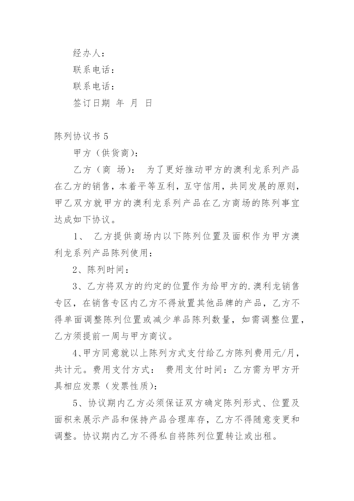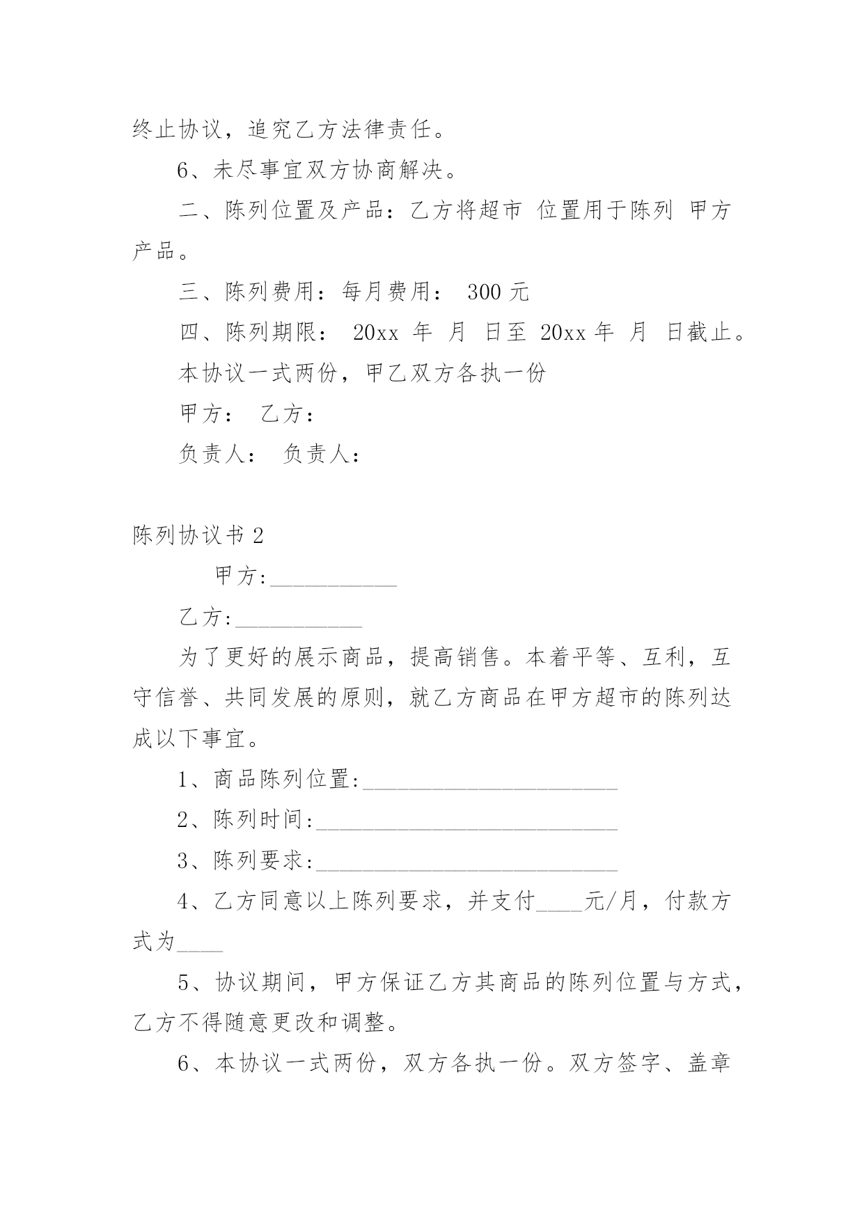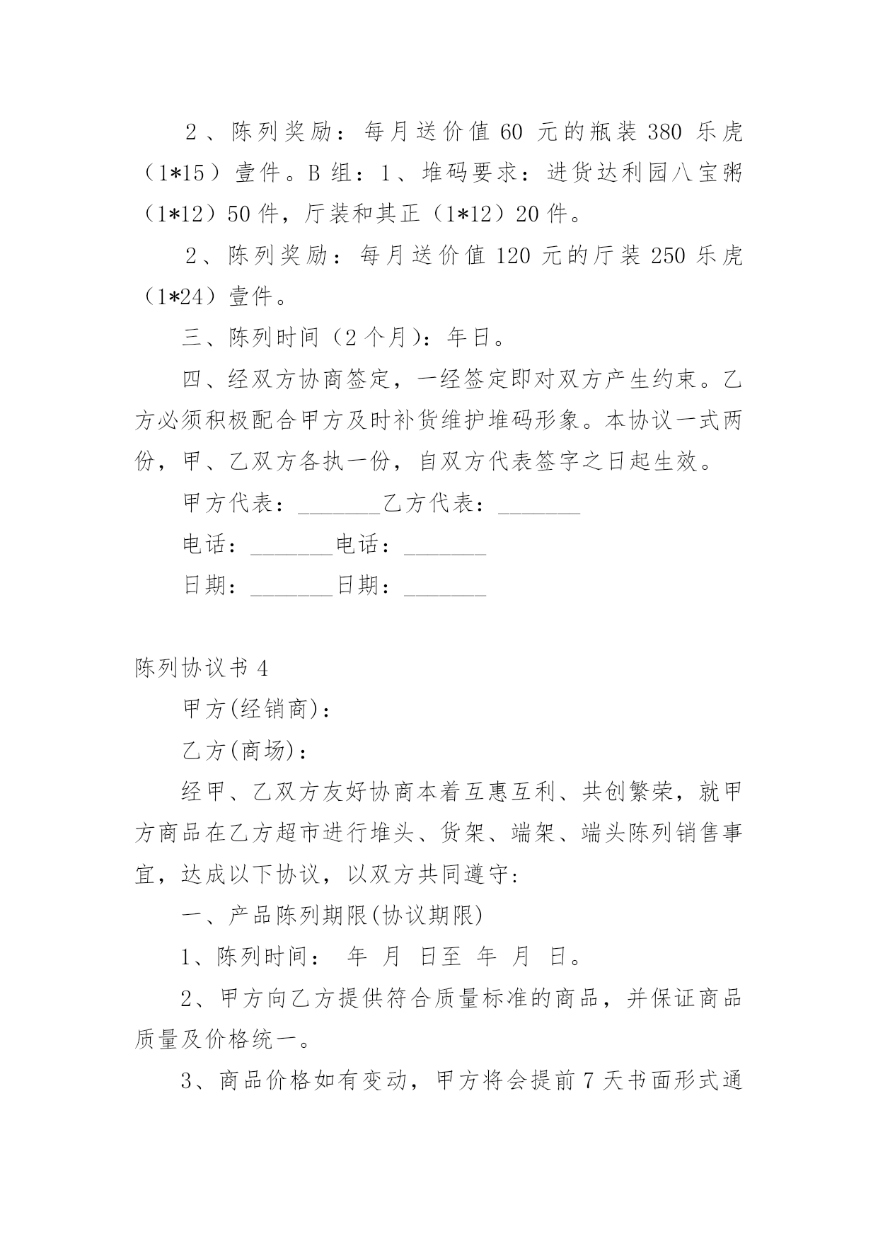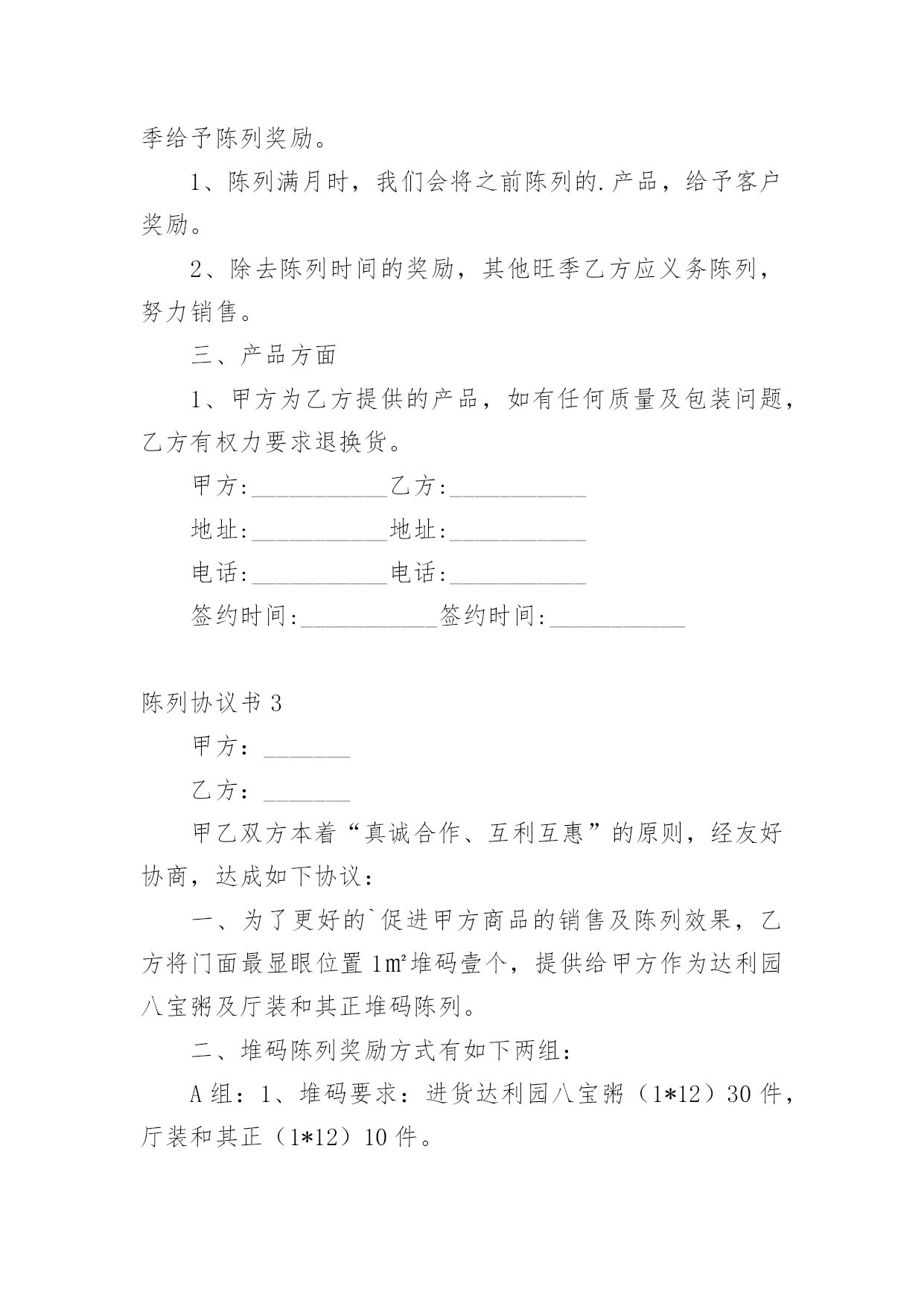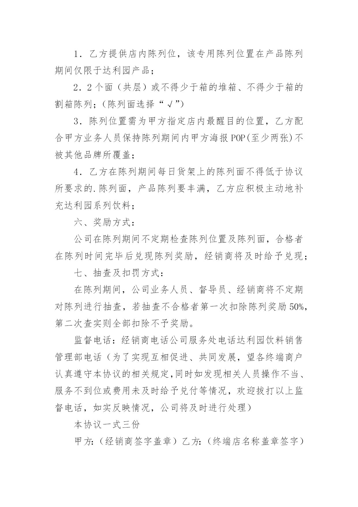 陈列协议书在日常生活和工作中,协议的使用频率呈上升趋势,协议具有法律效力,确立某种法律关系。我们该怎么拟定协议呢?下面是小编收集整理的陈列协议书,仅供参考,大家一起来看看吧。陈列协议书1甲方:天津市蒙牛乳业销售有限公司(以下简称“甲方”)乙方:(以下简称“乙方”)为达到甲、乙双方共赢的目的,提高蒙牛产品在天津市的'品牌形象,双方本着互惠互利的原则,经协商达成如下陈列事宜:一、相关事宜:1、甲方为乙方提供蒙牛奶系列产品,堆头、宣传画、海报、DM单、价签及有关促销物料。每月给乙方交纳堆头费。2、乙方必须在店内经营蒙牛系列液体奶产品,达到甲方的陈列要求,保持蒙牛产品系列及陈列物的清洁、整洁、美观。3、乙方须随时接受蒙牛公司有关人员的监督及拜访。4、乙方不许低于公司订价销售,不得私自截留赠品。不许经营窜货。5、甲方将不定期检查,以双方书面确认为凭据,若在检查过程中乙方未按协议要求进行陈列,甲方将有权单方面终止协议,追究乙方法律责任。6、未尽事宜双方协商解决。二、陈列位置及产品:乙方将超市位置用于陈列甲方产品。三、陈列费用:每月费用:300元四、陈列期限:20xx年月日至20xx年月日截止。本协议一式两份,甲乙双方各执一份甲方:乙方:负责人:负责人:陈列协议书2甲方:___________乙方:___________为了更好的展示商品,提高销售。本着平等、互利,互守信誉、共同发展的原则,就乙方商品在甲方超市的陈列达成以下事宜。1、商品陈列位置:______________________2、陈列时间:__________________________3、陈列要求:__________________________4、乙方同意以上陈列要求,并支付____元/月,付款方式为____5、协议期间,甲方保证乙方其商品的陈列位置与方式,乙方不得随意更改和调整。6、本协议一式两份,双方各执一份。双方签字、盖章后生效,未尽事宜,双方另议。7、补充内容__________________________________________________________________________________________________甲方(盖章):___________乙方(盖章)::___________代表(签字):___________代表(签字):___________联系方式:___________联系方式:___________日期:___________日期:___________甲方:___________乙方:___________四川剑特酒业为回馈广大客户对剑特酒业的支持,特在绵阳市场各大餐饮终端网点全面开展陈列赠酒活动,本着甲乙双方平等互利,诚实守信的原则,现就陈列赠酒相关活动事宜达成以下协议:一、陈列位置1、乙方须给甲方提供桌面陈列的位置,并陈列系列产品。2、陈列时间为___________年___________月___________日至___________年___________月___________日止。3、在协议期间,乙方不得以任何理由更换或撤销甲方的陈列位置。二、赠送政策为了提高乙方对产品陈列和销售的积极性,特在销售淡季给予陈列奖励。1、陈列满月时,我们会将之前陈列的.产品,给予客户奖励。2、除去陈列时间的奖励,其他旺季乙方应义务陈列,努力销售。三、产品方面1、甲方为乙方提供的产品,如有任何质量及包装问题,乙方有权力要求退换货。甲方:___________乙方:___________地址:___________地址:___________电话:___________电话:___________签约时间:___________签约时间:___________陈列协议书3甲方:_______乙方:_______甲乙双方本着“真诚合作、互利互惠”的原则,经友好协商,达成如下协议:一、为了更好的`促进甲方商品的销售及陈列效果,乙方将门面最显眼位置1㎡堆码壹个,提供给甲方作为达利园八宝粥及厅装和其正堆码陈列。二、堆码陈列奖励方式有如下两组:A组:1、堆码要求:进货达利园八宝粥(1*12)30件,厅装和其正(1*12)10件。2、陈列奖励:每月送价值60元的瓶装380乐虎(1*15)壹件。B组:1、堆码要求:进货达利园八宝粥(1*12)50件,厅装和其正(1*12)20件。2、陈列奖励:每月送价值120元的厅装250乐虎(1*24)壹件。三、陈列时间(2个月):年日。四、经双方协商签定,一经签定即对双方产生约束。乙方必须积极配合甲方及时补货维护堆码形象。本协议一式两份,甲、乙双方各执一份,自双方代表签字之日起生效。甲方代表:_______乙方代表:_______电话:_______电话:_______日期: