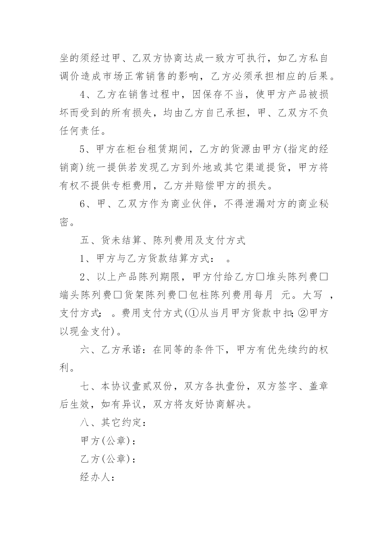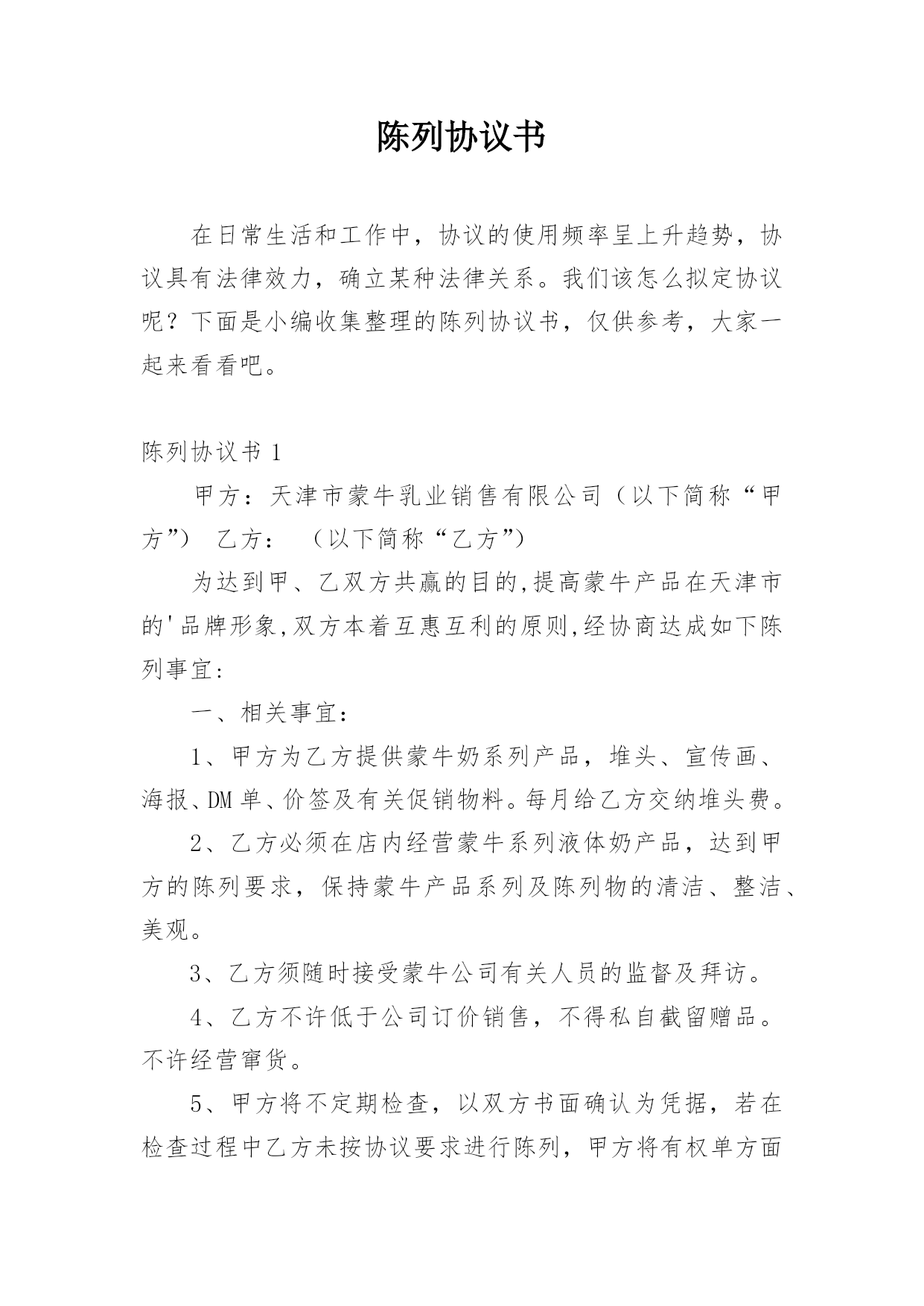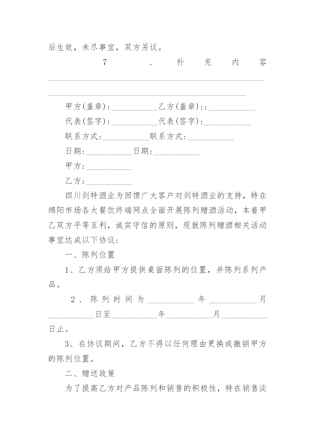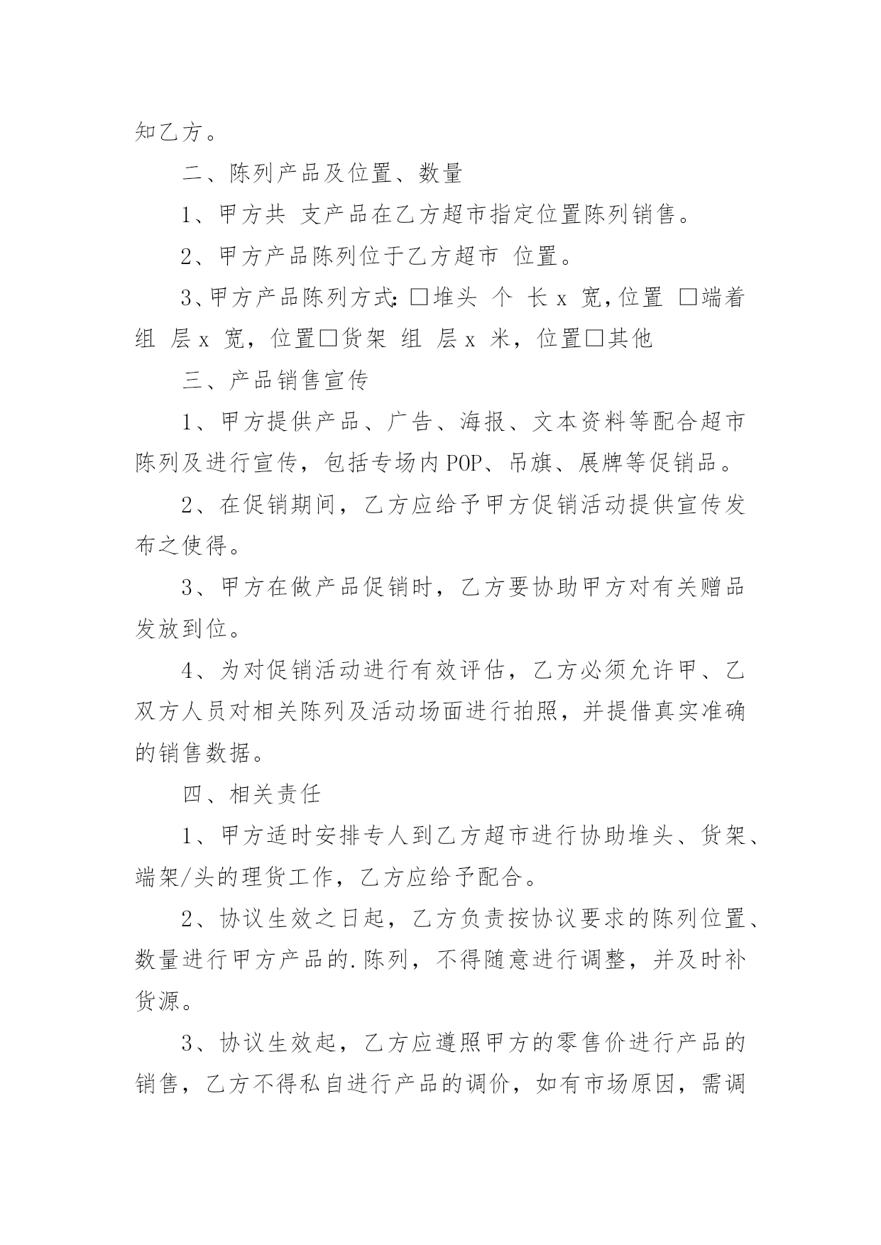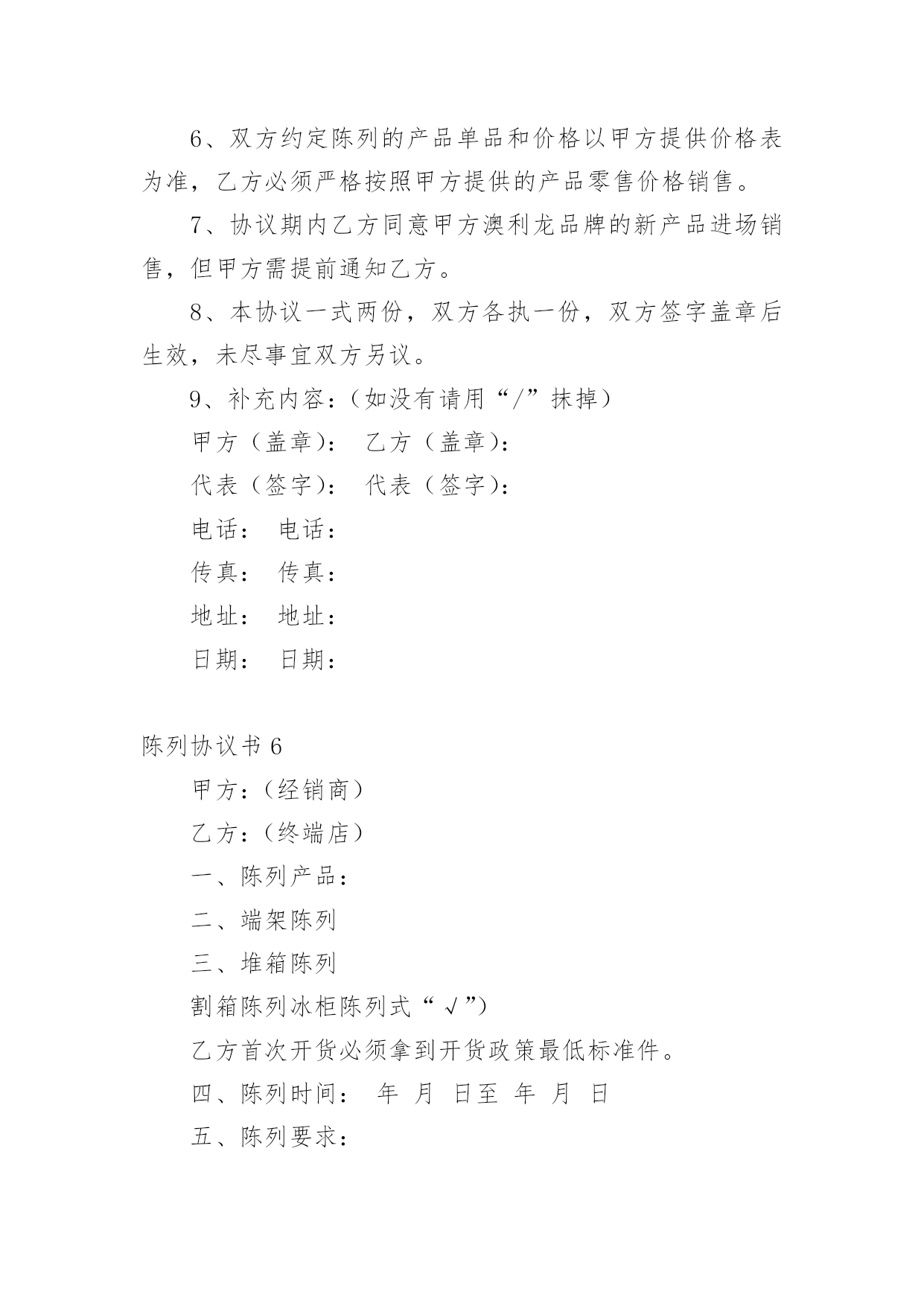 陈列协议书在日常生活和工作中,协议的使用频率呈上升趋势,协议具有法律效力,确立某种法律关系。我们该怎么拟定协议呢?下面是小编收集整理的陈列协议书,仅供参考,大家一起来看看吧。陈列协议书1甲方:天津市蒙牛乳业销售有限公司(以下简称“甲方”)乙方:(以下简称“乙方”)为达到甲、乙双方共赢的目的,提高蒙牛产品在天津市的'品牌形象,双方本着互惠互利的原则,经协商达成如下陈列事宜:一、相关事宜:1、甲方为乙方提供蒙牛奶系列产品,堆头、宣传画、海报、DM单、价签及有关促销物料。每月给乙方交纳堆头费。2、乙方必须在店内经营蒙牛系列液体奶产品,达到甲方的陈列要求,保持蒙牛产品系列及陈列物的清洁、整洁、美观。3、乙方须随时接受蒙牛公司有关人员的监督及拜访。4、乙方不许低于公司订价销售,不得私自截留赠品。不许经营窜货。5、甲方将不定期检查,以双方书面确认为凭据,若在检查过程中乙方未按协议要求进行陈列,甲方将有权单方面终止协议,追究乙方法律责任。6、未尽事宜双方协商解决。二、陈列位置及产品:乙方将超市位置用于陈列甲方产品。三、陈列费用:每月费用:300元四、陈列期限:20xx年月日至20xx年月日截止。本协议一式两份,甲乙双方各执一份甲方:乙方:负责人:负责人:陈列协议书2甲方:___________乙方:___________为了更好的展示商品,提高销售。本着平等、互利,互守信誉、共同发展的原则,就乙方商品在甲方超市的陈列达成以下事宜。1、商品陈列位置:______________________2、陈列时间:__________________________3、陈列要求:__________________________4、乙方同意以上陈列要求,并支付____元/月,付款方式为____5、协议期间,甲方保证乙方其商品的陈列位置与方式,乙方不得随意更改和调整。6、本协议一式两份,双方各执一份。双方签字、盖章后生效,未尽事宜,双方另议。7、补充内容__________________________________________________________________________________________________甲方(盖章):___________乙方(盖章)::___________代表(签字):___________代表(签字):___________联系方式:___________联系方式:___________日期:___________日期:___________甲方:___________乙方:___________四川剑特酒业为回馈广大客户对剑特酒业的支持,特在绵阳市场各大餐饮终端网点全面开展陈列赠酒活动,本着甲乙双方平等互利,诚实守信的原则,现就陈列赠酒相关活动事宜达成以下协议:一、陈列位置1、乙方须给甲方提供桌面陈列的位置,并陈列系列产品。2、陈列时间为___________年___________月___________日至___________年___________月___________日止。3、在协议期间,乙方不得以任何理由更换或撤销甲方的陈列位置。二、赠送政策为了提高乙方对产品陈列和销售的积极性,特在销售淡季给予陈列奖励。1、陈列满月时,我们会将之前陈列的.产品,给予客户奖励。2、除去陈列时间的奖励,其他旺季乙方应义务陈列,努力销售。三、产品方面1、甲方为乙方提供的产品,如有任何质量及包装问题,乙方有权力要求退换货。甲方:___________乙方:___________地址:___________地址:___________电话:___________电话:___________签约时间:___________签约时间:___________陈列协议书3甲方:_______乙方:_______甲乙双方本着“真诚合作、互利互惠”的原则,经友好协商,达成如下协议:一、为了更好的`促进甲方商品的销售及陈列效果,乙方将门面最显眼位置1㎡堆码壹个,提供给甲方作为达利园八宝粥及厅装和其正堆码陈列。二、堆码陈列奖励方式有如下两组:A组:1、堆码要求:进货达利园八宝粥(1*12)30件,厅装和其正(1*12)10件。2、陈列奖励:每月送价值60元的瓶装380乐虎(1*15)壹件。B组:1、堆码要求:进货达利园八宝粥(1*12)50件,厅装和其正(1*12)20件。2、陈列奖励:每月送价值120元的厅装250乐虎(1*24)壹件。三、陈列时间(2个月):年日。四、经双方协商签定,一经签定即对双方产生约束。乙方必须积极配合甲方及时补货维护堆码形象。本协议一式两份,甲、乙双方各执一份,自双方代表签字之日起生效。甲方代表:_______乙方代表:_______电话:_______电话:_______日期: