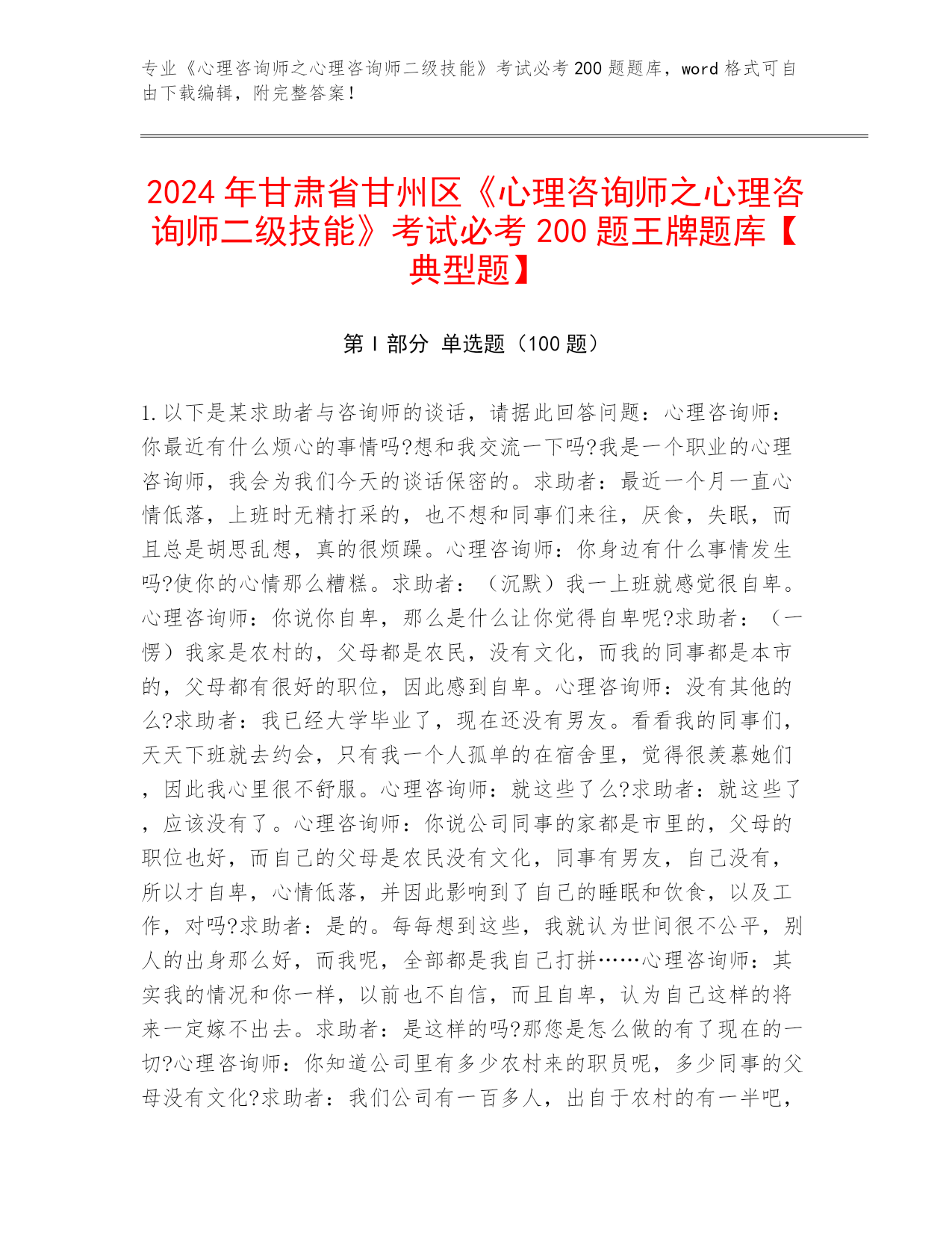 2024年甘肃省甘州区《心理咨询师之心理咨询师二级技能》考试必考200题王牌题库【典型题】